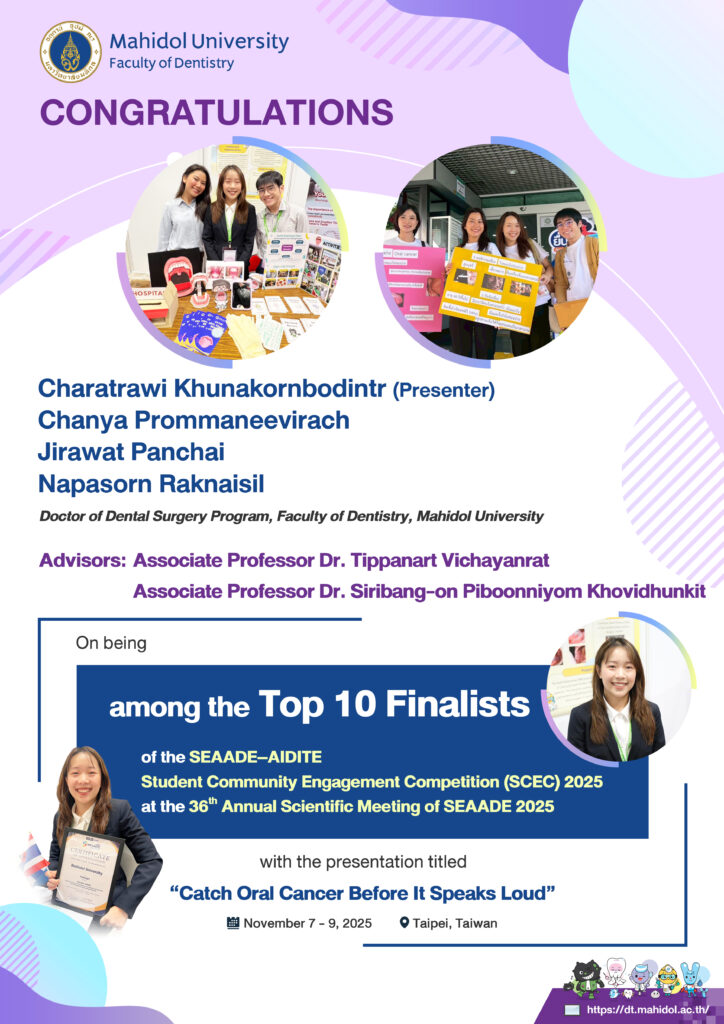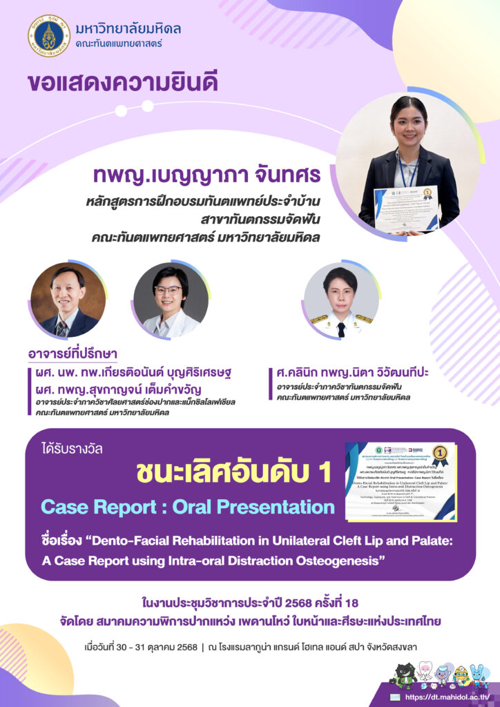 ขอร่วมแสดงความยินดี ทันตแพทย์ศักดิ์ดา วงศ์หินกอง หลักสูตรการฝึกอบรมทันตแพทย์ประจำบ้าน สาขาทันตกรรมจัดฟัน ได้รับรางวัลชนะเลิศ ประเภท Research Oral Presentation