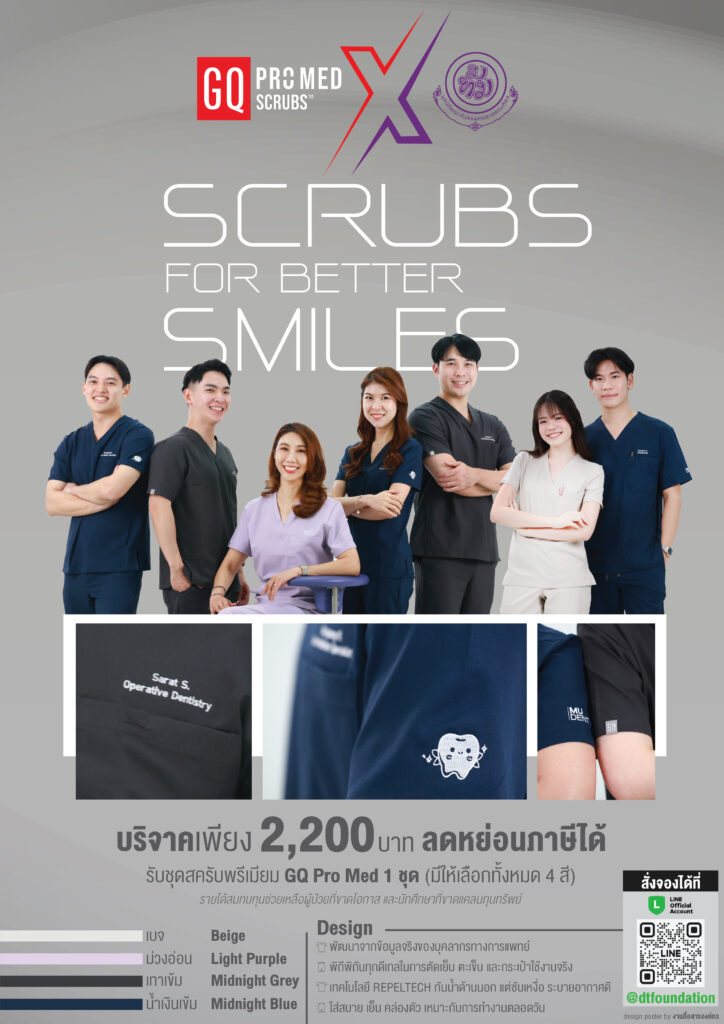 โครงการ “Scrubs for Better Smiles – เพื่อรอยยิ้มของทุกคน” โดยมูลนิธิคณะทันตแพทยศาสตร์ มหาวิทยาลัยมหิดล ร่วมบริจาคเพียง 2,200 บาท รับชุดสครับพรีเมียม GQ Pro Med 1 ชุด (มีให้เลือกทั้งหมด 4 สี) รายได้หลังหักค่าใช้จ่ายจะนำไปช่วยเหลือผู้ป่วยที่ขาดโอกาส และนักศึกษาที่ขาดแคลนทุนทรัพย์