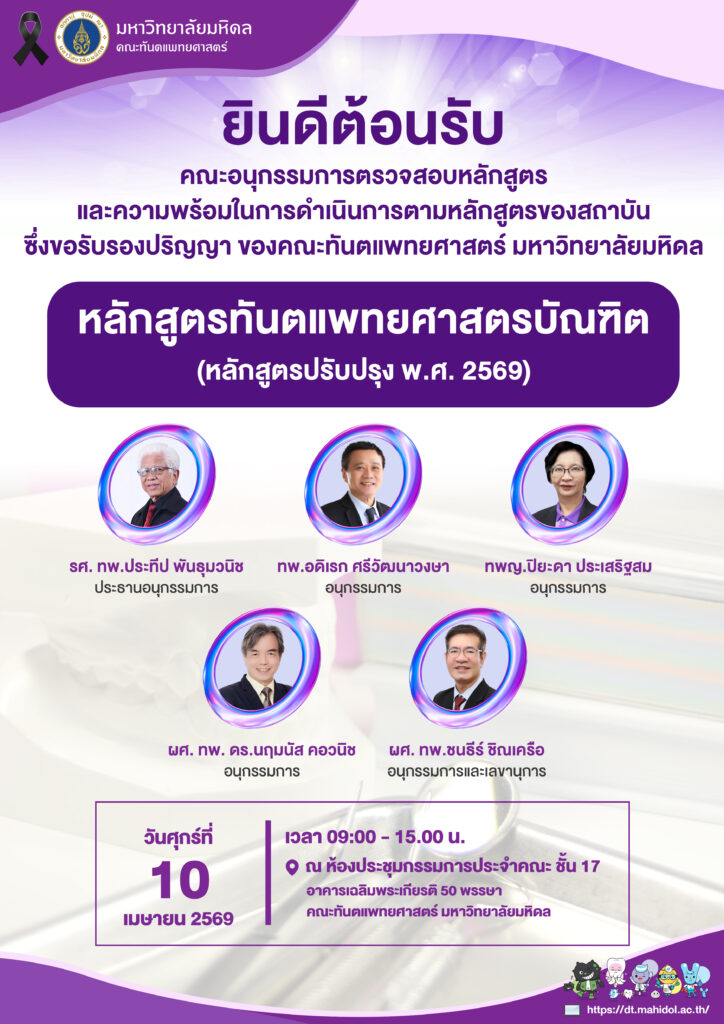 ยินดีต้อนรับ คณะอนุกรรมการตรวจสอบหลักสูตร และความพร้อมในการดำเนินการตามหลักสูตรของสถาบัน ซึ่งขอรับรองปริญญา ของคณะทันตแพทยศาสตร์ มหาวิทยาลัยมหิดล หลักสูตรทันตแพทยศาสตรบัณฑิต (หลักสูตรปรับปรุง พ.ศ. 2569)
