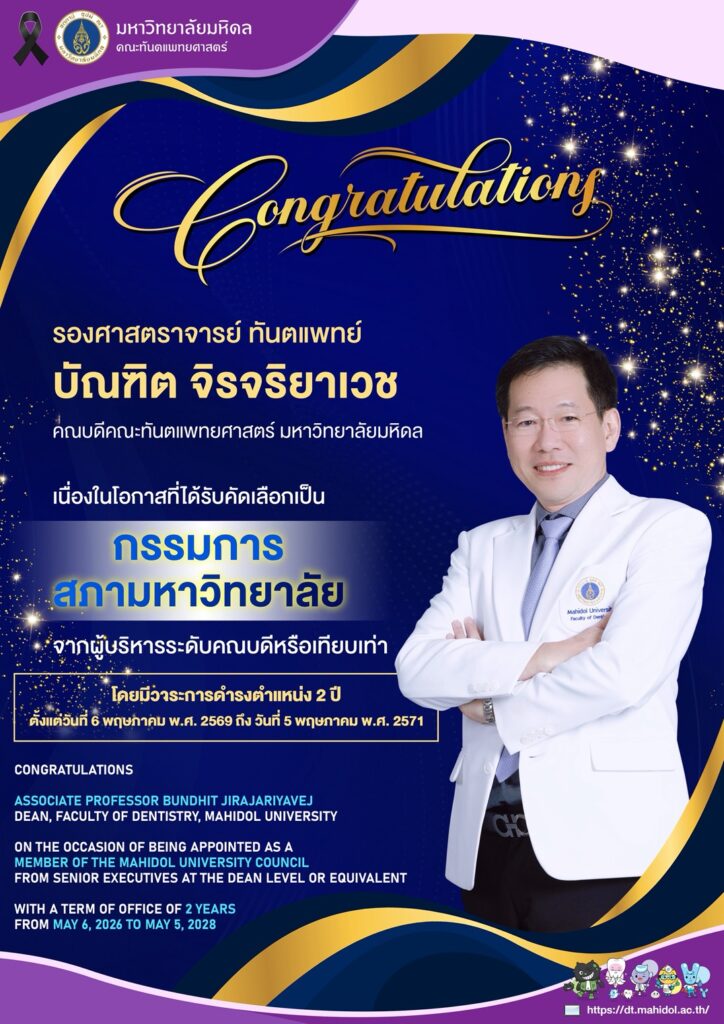 ขอร่วมแสดงความยินดี รองศาสตราจารย์ ทันตแพทย์บัณฑิต จิรจริยาเวช คณบดีคณะทันตแพทยศาสตร์ มหาวิทยาลัยมหิดล เนื่องในโอกาสที่ได้รับคัดเลือกเป็น กรรมการสภามหาวิทยาลัย จากผู้บริหารระดับคณบดีหรือเทียบเท่า โดยมีวาระการดำรงตำแหน่ง 2 ปี ตั้งแต่วันที่ 6 พฤษภาคม พ.ศ. 2569 ถึง วันที่ 5 พฤษภาคม พ.ศ. 2571