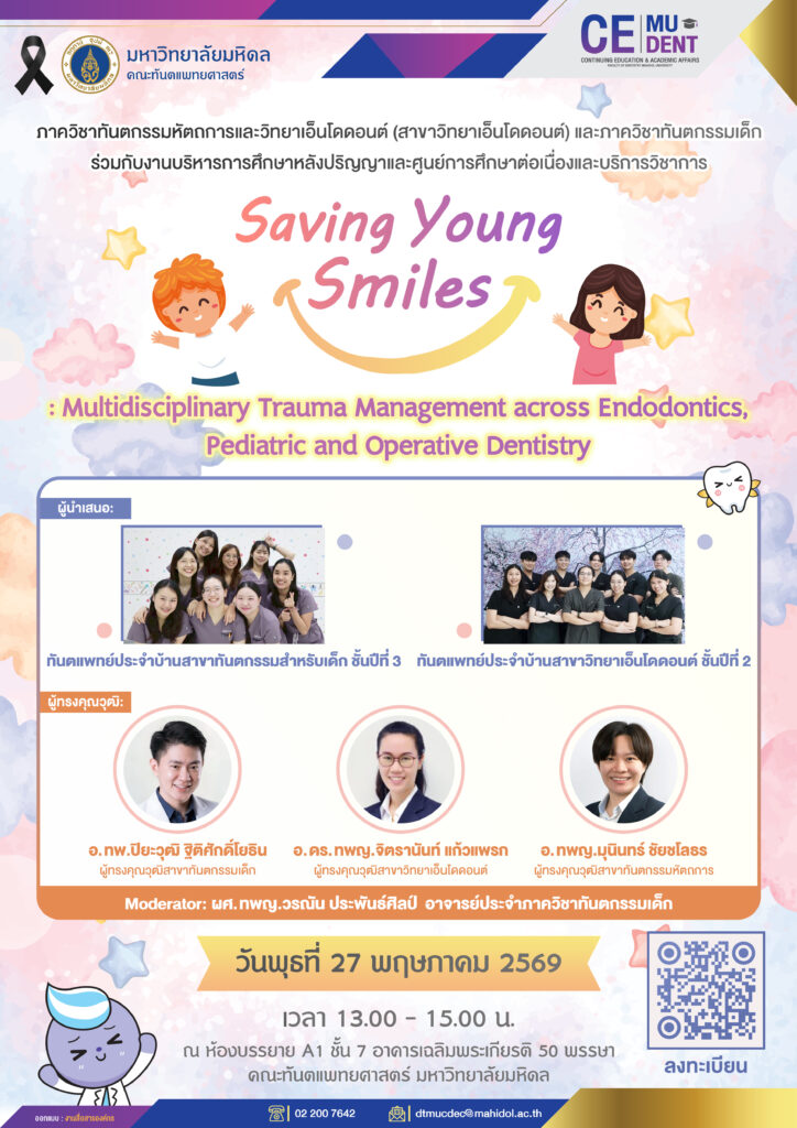 ขยายเวลา Early-bird ถึง 30 เมษายน 2569 ขอเชิญร่วมงานประชุมวิชาการ เรื่อง “From womb to tomb : prevention shapes our lives” ภาควิชาทันตกรรมชุมชน ร่วมกับ ศูนย์การศึกษาต่อเนื่องและบริการวิชาการ คณะทันตแพทยศาสตร์ มหาวิทยาลัยมหิดล จัดเต็มความรู้การป้องกันดูแลสุขภาพช่องปากครอบคลุมทุกช่วงวัย ตั้งแต่ครรภ์มารดาจนถึงการดูแลแบบประคับประคอง