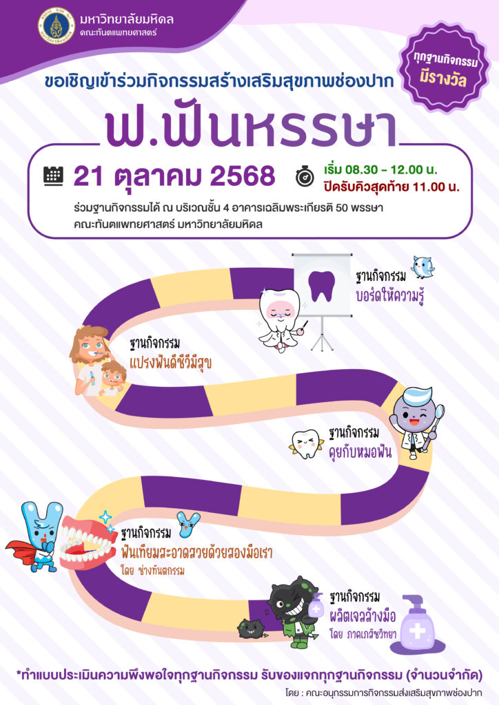 ขอเชิญเข้าร่วมกิจกรรมสร้างเสริมสุขภาพช่องปาก ฟ.ฟันหรรษา ทุกฐานกิจกรรม มีรางวัล