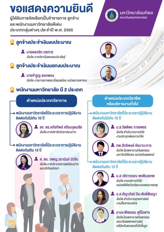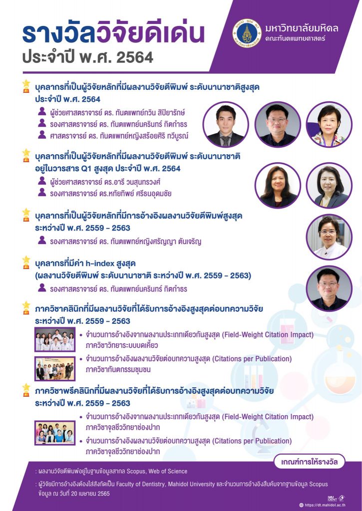 เมื่อวันที่ 7 มิถุนายน 2565 รองศาสตราจารย์ ทพ.ยสวิมล คูผาสุข รองคณบดีฝ่ายทรัพยากรบุคคล คณะทันตแพทยศาสตร์ มหาวิทยาลัยมหิดล กล่าวรายงานการจัดงานพิธีมอบรางวัลข้าราชการ ลูกจ้าง และพนักงานมหาวิทยาลัยดีเด่นระดับคณะ ประจำปี 2565 และ รางวัลวิจัยดีเด่น ประจำปี 2564 เนื่องในวันคล้ายวันสถาปนาคณะทันตแพทยศาสตร์ มหาวิทยาลัยมหิดล ครบรอบ 54 ปี โดยได้รับเกียรติจาก รองศาสตราจารย์ ดร. นพ. ทพ.ศิริชัย เกียรติถาวรเจริญ คณบดี ให้เกียรติเป็นประธานมอบรางวัลแก่ผู้ได้รับรางวัล โดยมีวัตถุประสงค์ในการจัดงานเพื่อเป็นการยกย่องผู้ที่มีความประพฤติดีปฏิบัติตนเป็นแบบอย่างที่ดี ส่งเสริมสนับสนุนและยกย่องนักวิจัยที่สร้างผลงานวิจัย อันนำมาซึ่งชื่อเสียงแก่สถาบัน และเพื่อเป็นการเสริมสร้างขวัญกำลังใจแก่บุคลากร ณ ห้องประชุมเทพรัตนทันตกิจสโมสร ชั้น 4 อาคารเฉลิมพระเกียรติ 50 พรรษา (ส่วนหลัง)