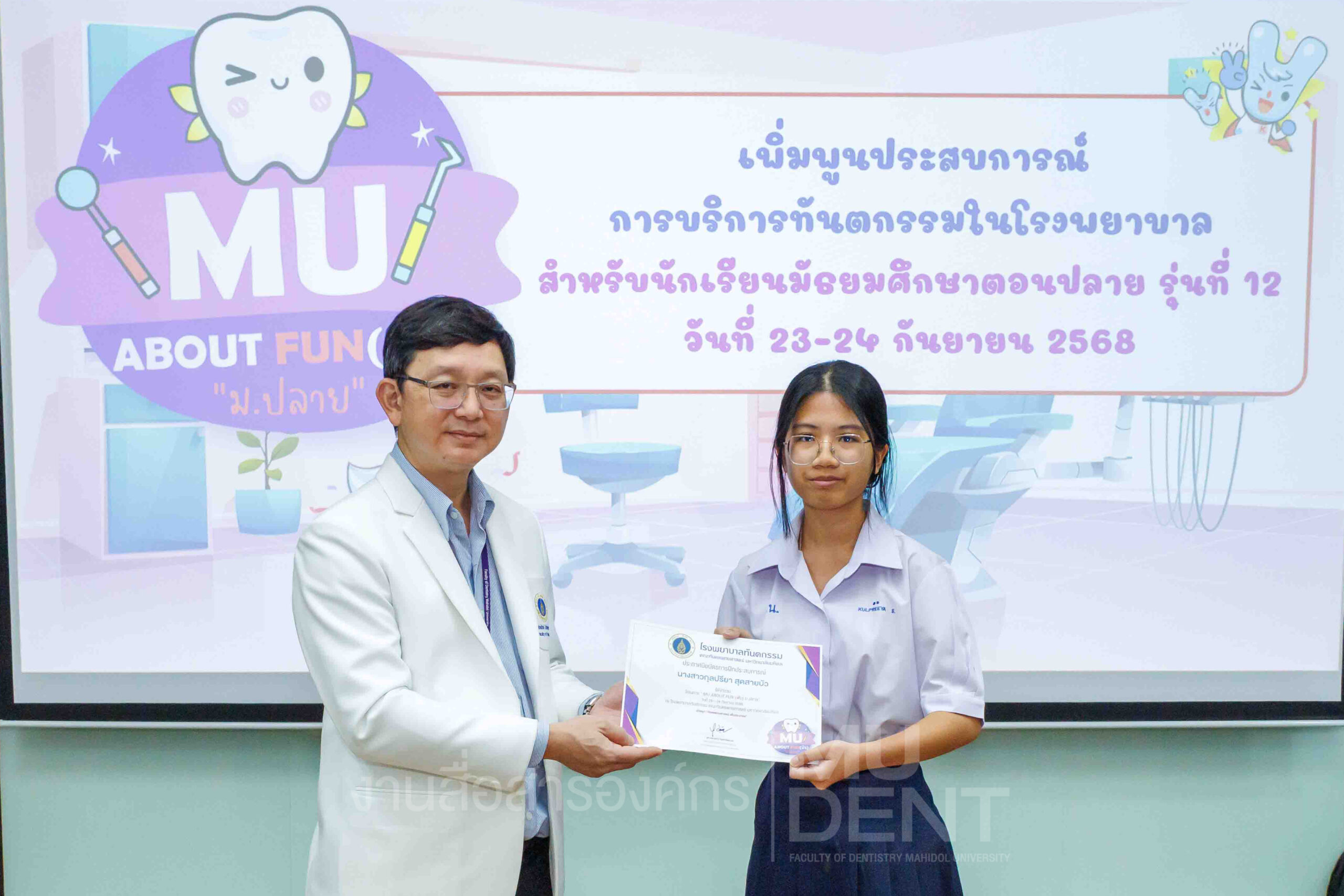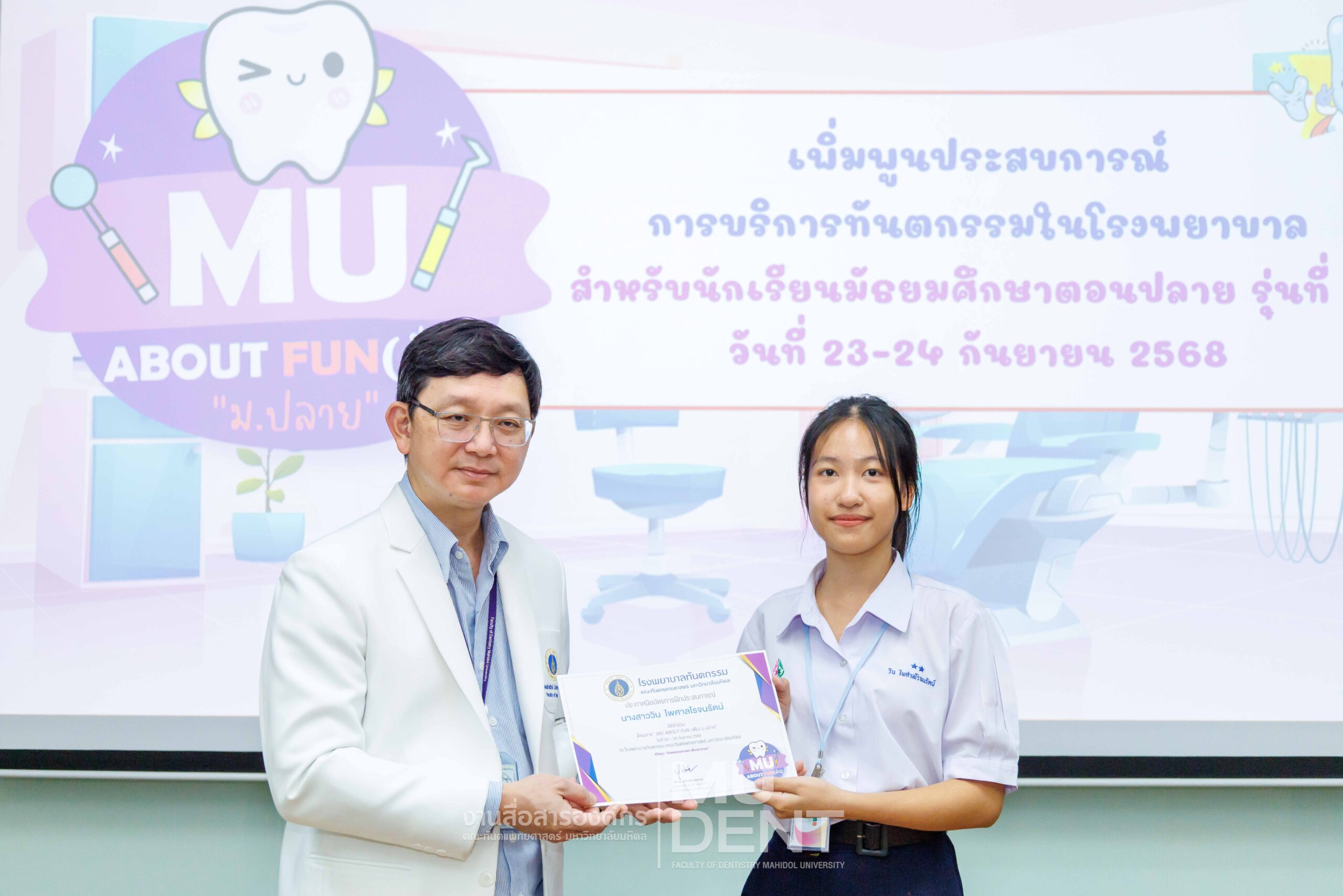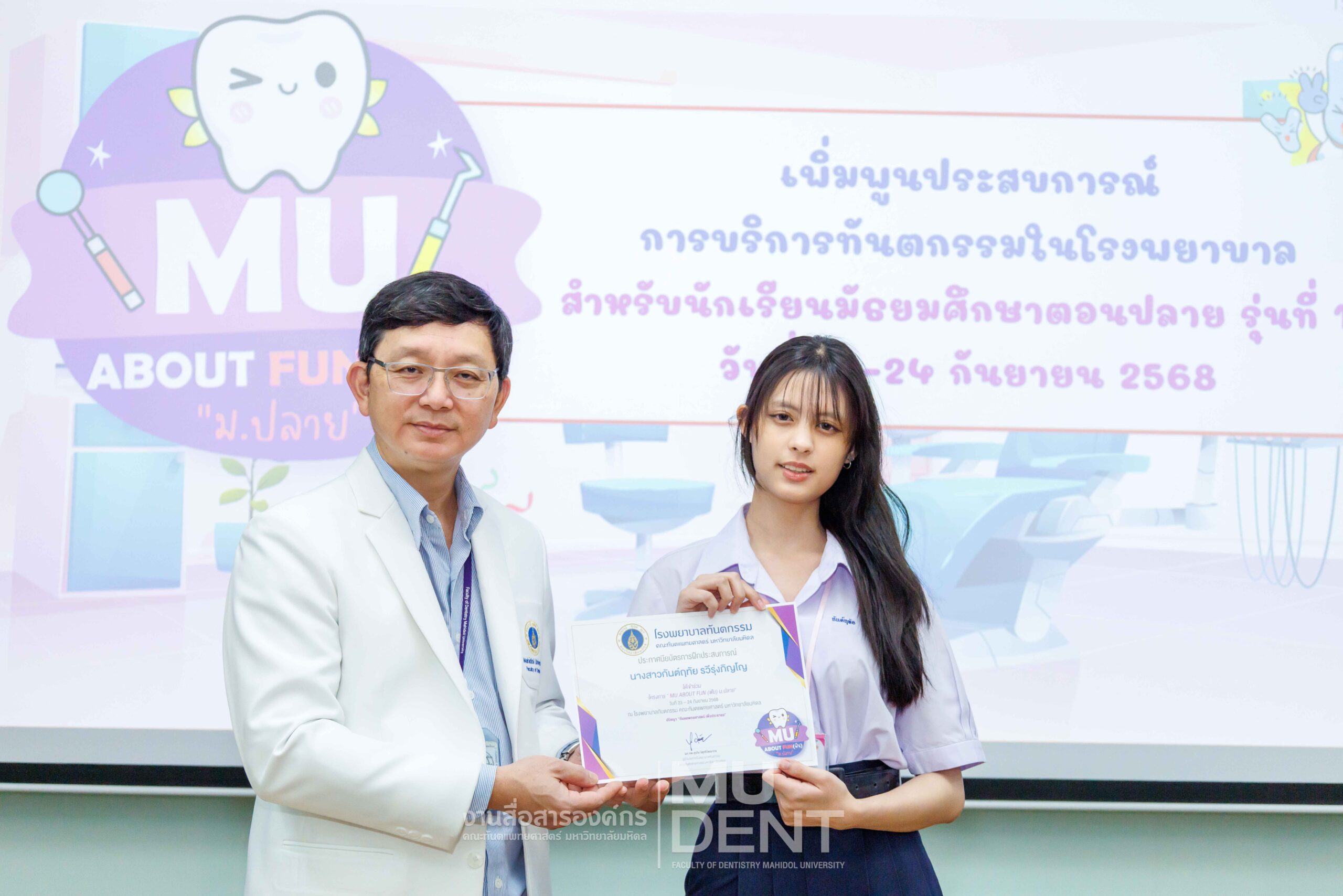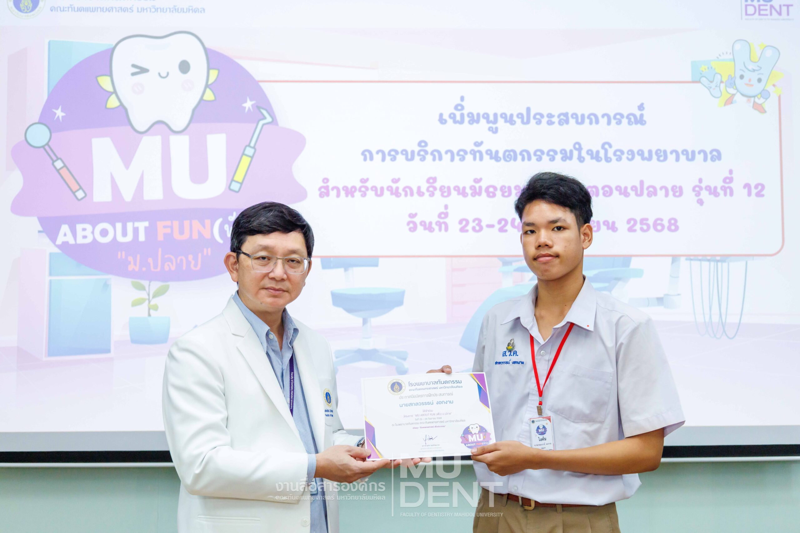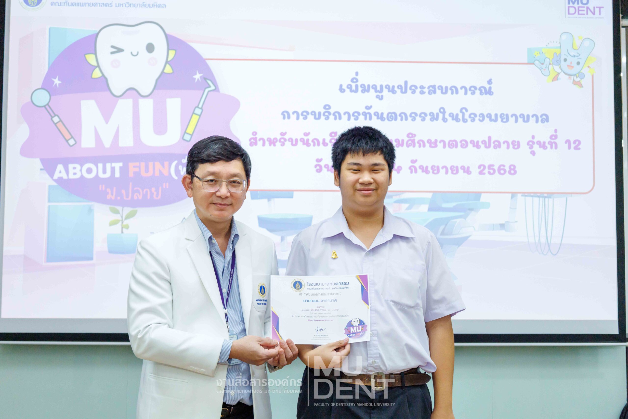 เมื่อวันที่ 23 กันยายน 2568 ผู้ช่วยศาสตราจารย์ ทันตแพทย์สุรกิจ วิสุทธิวัฒนากร ผู้อำนวยการโรงพยาบาลทันตกรรม คณะทันตแพทยศาสตร์ มหาวิทยาลัยมหิดล ให้เกียรติเป็นประธานในพิธีเปิดโครงการ “MU ABOUT FUN (ฟัน)” สำหรับนักเรียนมัธยมศึกษาตอนปลาย รุ่นที่ 12 ปีงบประมาณ 2568 โดยมีหัวหน้าคลินิก หัวหน้าศูนย์ หัวหน้าหน่วย เข้าร่วมเป็นเกียรติ ณ ห้องประชุม 304 -305 ชั้น 3 อาคารเฉลิมพระเกียรติ 50 พรรษา ซึ่งโครงการดังกล่าว มีนักเรียนมัธยมศึกษาตอนปลายเข้าร่วมโครงการฯ จำนวน 50 ราย จัดขึ้นระหว่างวันที่ 23 – 24 กันยายน 2568 เป็นการแบ่งกลุ่มนักเรียนที่เข้าร่วมโครงการฯ ให้เข้ารับการฝึกปฏิบัติตามฐานกิจกรรม ภายในคลินิกทันตกรรม ของโรงพยาบาลทันตกรรม คณะทันตแพทยศาสตร์ มหาวิทยาลัยมหิดล จำนวน 6 ฐาน ได้แก่ คลินิกศัลยกรรมช่องปากและใบหน้าขากรรไกร คลินิกรังสีวิทยาช่องปากและใบหน้าขากรรไกร คลินิกประดิษฐ์ใบหน้าขากรรไกร คลินิกทันตกรรมจัดฟัน คลินิกวิทยาเอ็นโดดอนต์ และศูนย์ส่งเสริมและพัฒนาคุณภาพชีวิตผู้สูงอายุ โดยเมื่อวันที่ 24 กันยายน 2568 ผู้ช่วยศาสตราจารย์ ทันตแพทย์สุรกิจ วิสุทธิวัฒนากร ผู้อำนวยการโรงพยาบาลทันตกรรม คณะทันตแพทยศาสตร์ มหาวิทยาลัยมหิดล ให้เกียรติเป็นประธานในพิธีปิด และมอบประกาศนียบัตรแก่นักเรียนที่เข้าร่วมโครงการฯ ณ ห้องประชุม 304 – 305 ชั้น 3 อาคารเฉลิมพระเกียรติ 50 พรรษา คณะทันตแพทยศาสตร์ มหาวิทยาลัยมหิดล