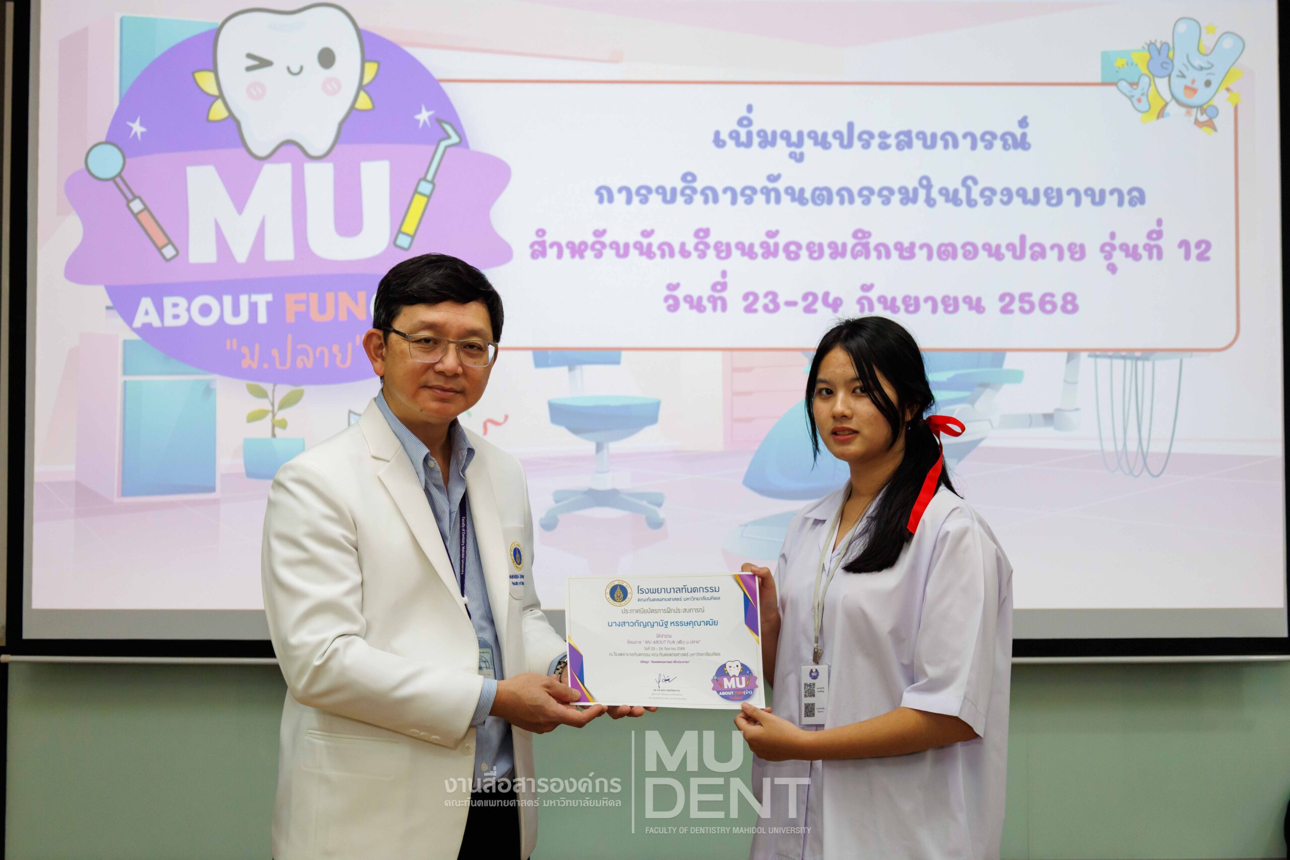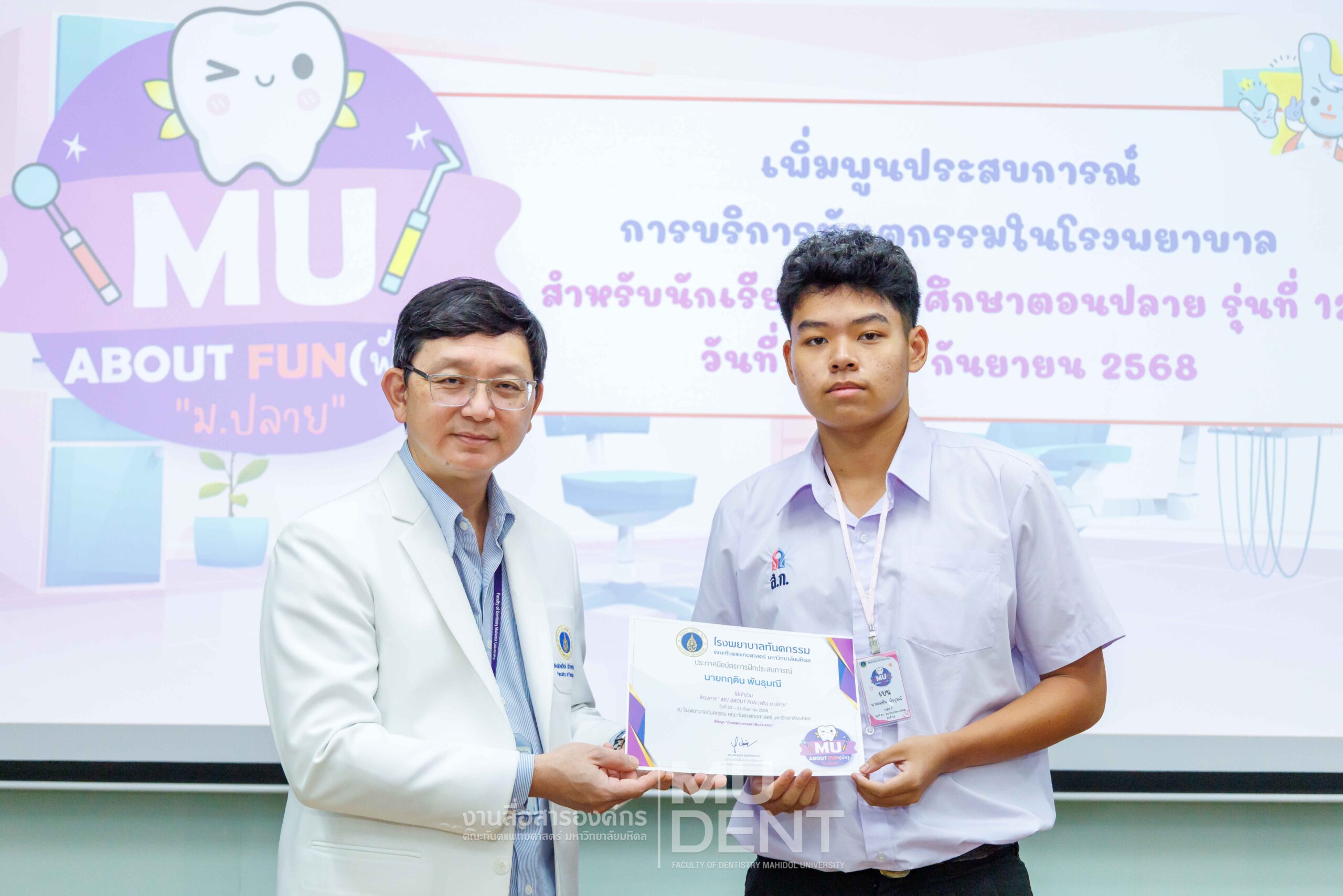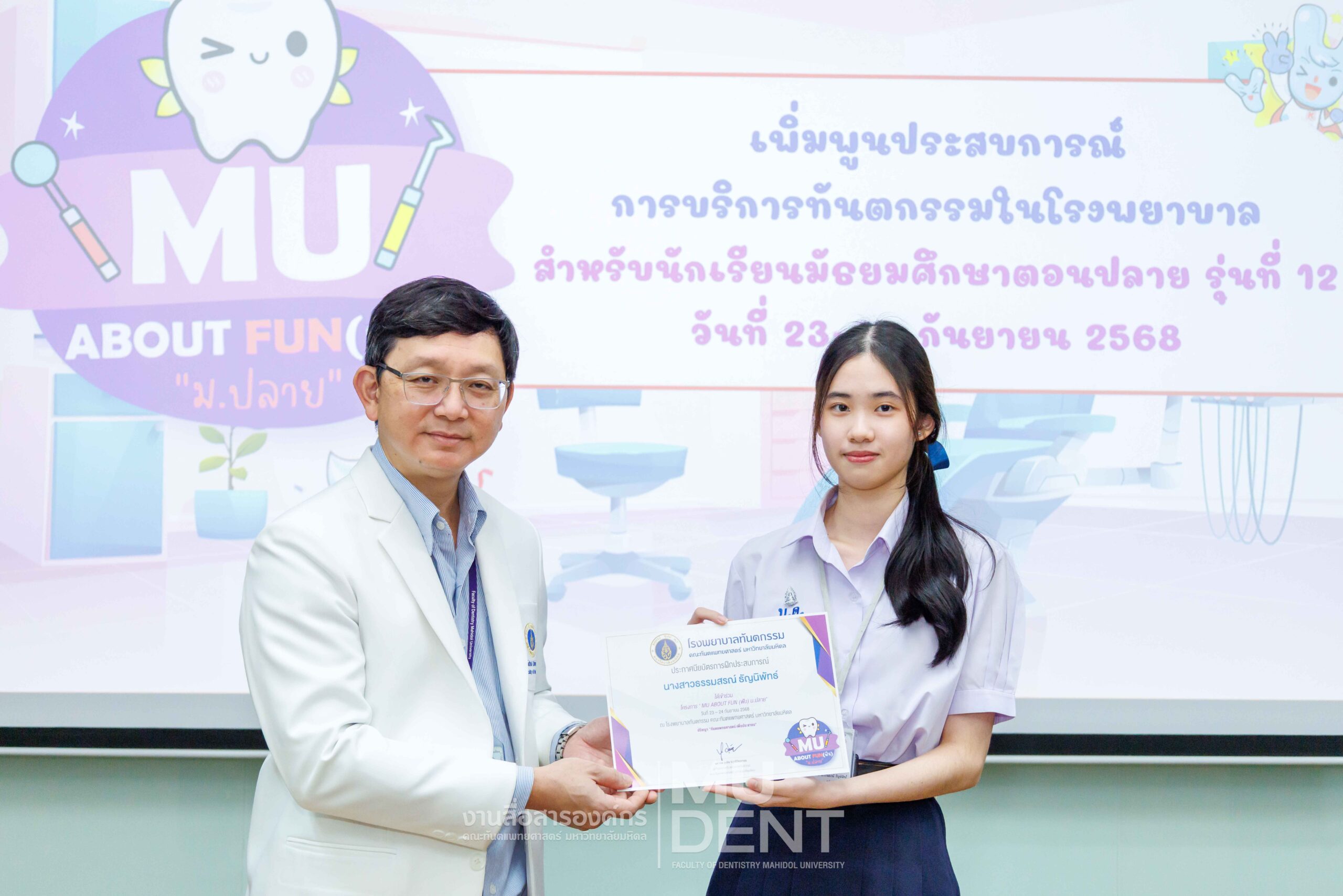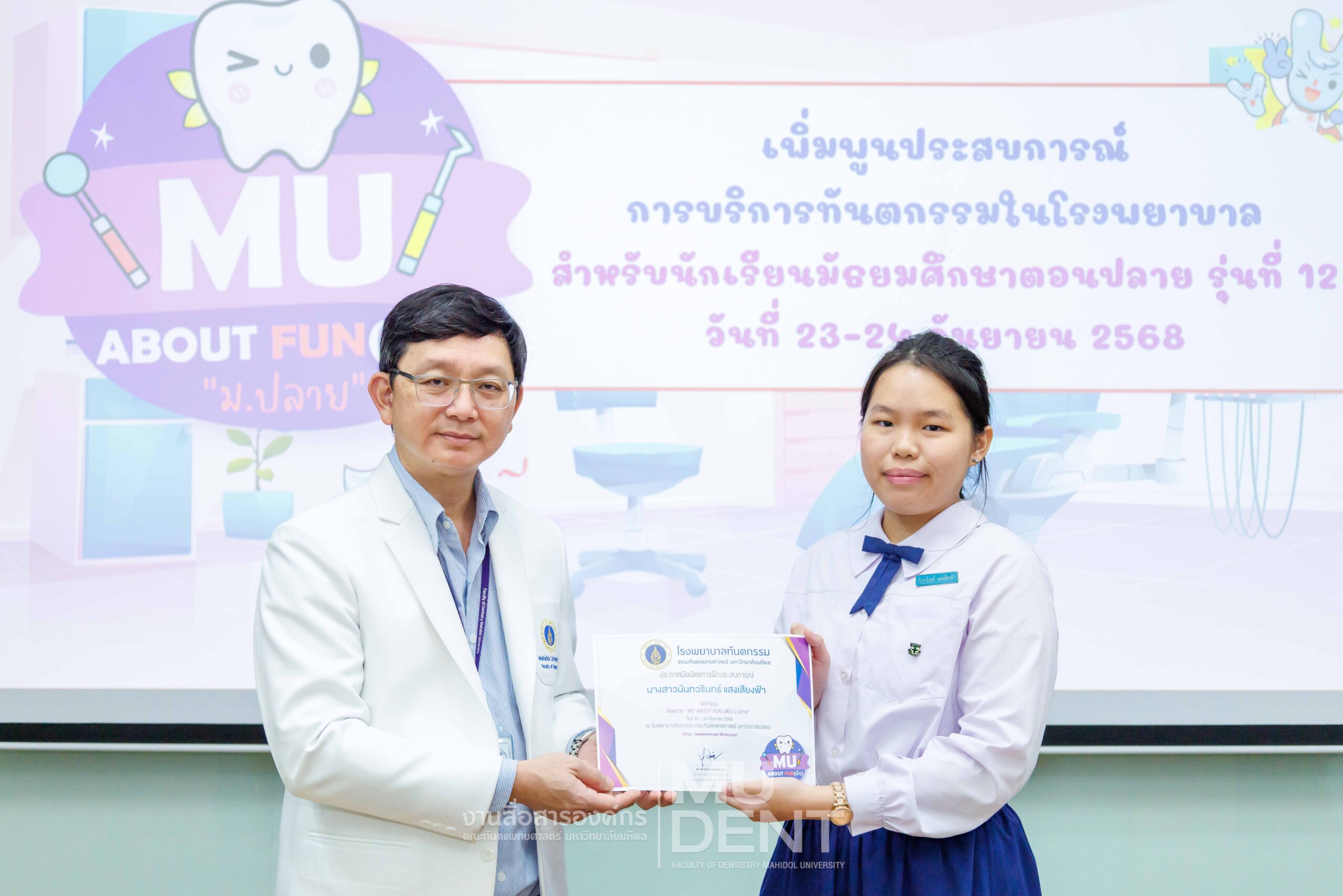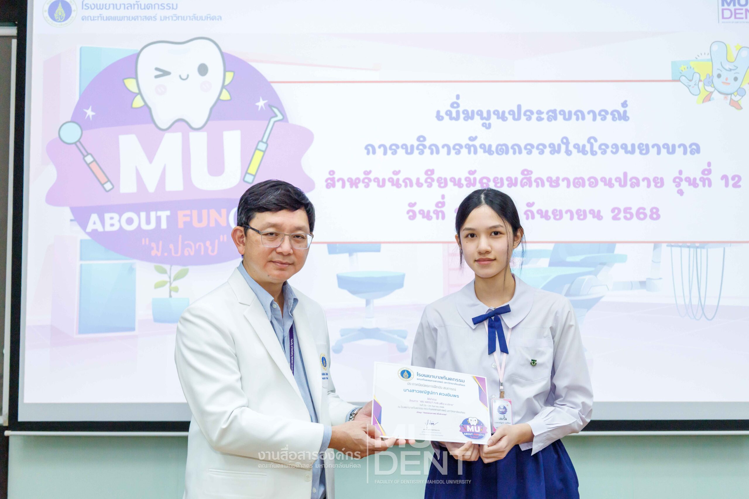 เมื่อวันที่ 23 กันยายน 2568 ผู้ช่วยศาสตราจารย์ ทันตแพทย์สุรกิจ วิสุทธิวัฒนากร ผู้อำนวยการโรงพยาบาลทันตกรรม คณะทันตแพทยศาสตร์ มหาวิทยาลัยมหิดล ให้เกียรติเป็นประธานในพิธีเปิดโครงการ “MU ABOUT FUN (ฟัน)” สำหรับนักเรียนมัธยมศึกษาตอนปลาย รุ่นที่ 12 ปีงบประมาณ 2568 โดยมีหัวหน้าคลินิก หัวหน้าศูนย์ หัวหน้าหน่วย เข้าร่วมเป็นเกียรติ ณ ห้องประชุม 304 -305 ชั้น 3 อาคารเฉลิมพระเกียรติ 50 พรรษา ซึ่งโครงการดังกล่าว มีนักเรียนมัธยมศึกษาตอนปลายเข้าร่วมโครงการฯ จำนวน 50 ราย จัดขึ้นระหว่างวันที่ 23 – 24 กันยายน 2568 เป็นการแบ่งกลุ่มนักเรียนที่เข้าร่วมโครงการฯ ให้เข้ารับการฝึกปฏิบัติตามฐานกิจกรรม ภายในคลินิกทันตกรรม ของโรงพยาบาลทันตกรรม คณะทันตแพทยศาสตร์ มหาวิทยาลัยมหิดล จำนวน 6 ฐาน ได้แก่ คลินิกศัลยกรรมช่องปากและใบหน้าขากรรไกร คลินิกรังสีวิทยาช่องปากและใบหน้าขากรรไกร คลินิกประดิษฐ์ใบหน้าขากรรไกร คลินิกทันตกรรมจัดฟัน คลินิกวิทยาเอ็นโดดอนต์ และศูนย์ส่งเสริมและพัฒนาคุณภาพชีวิตผู้สูงอายุ โดยเมื่อวันที่ 24 กันยายน 2568 ผู้ช่วยศาสตราจารย์ ทันตแพทย์สุรกิจ วิสุทธิวัฒนากร ผู้อำนวยการโรงพยาบาลทันตกรรม คณะทันตแพทยศาสตร์ มหาวิทยาลัยมหิดล ให้เกียรติเป็นประธานในพิธีปิด และมอบประกาศนียบัตรแก่นักเรียนที่เข้าร่วมโครงการฯ ณ ห้องประชุม 304 – 305 ชั้น 3 อาคารเฉลิมพระเกียรติ 50 พรรษา คณะทันตแพทยศาสตร์ มหาวิทยาลัยมหิดล