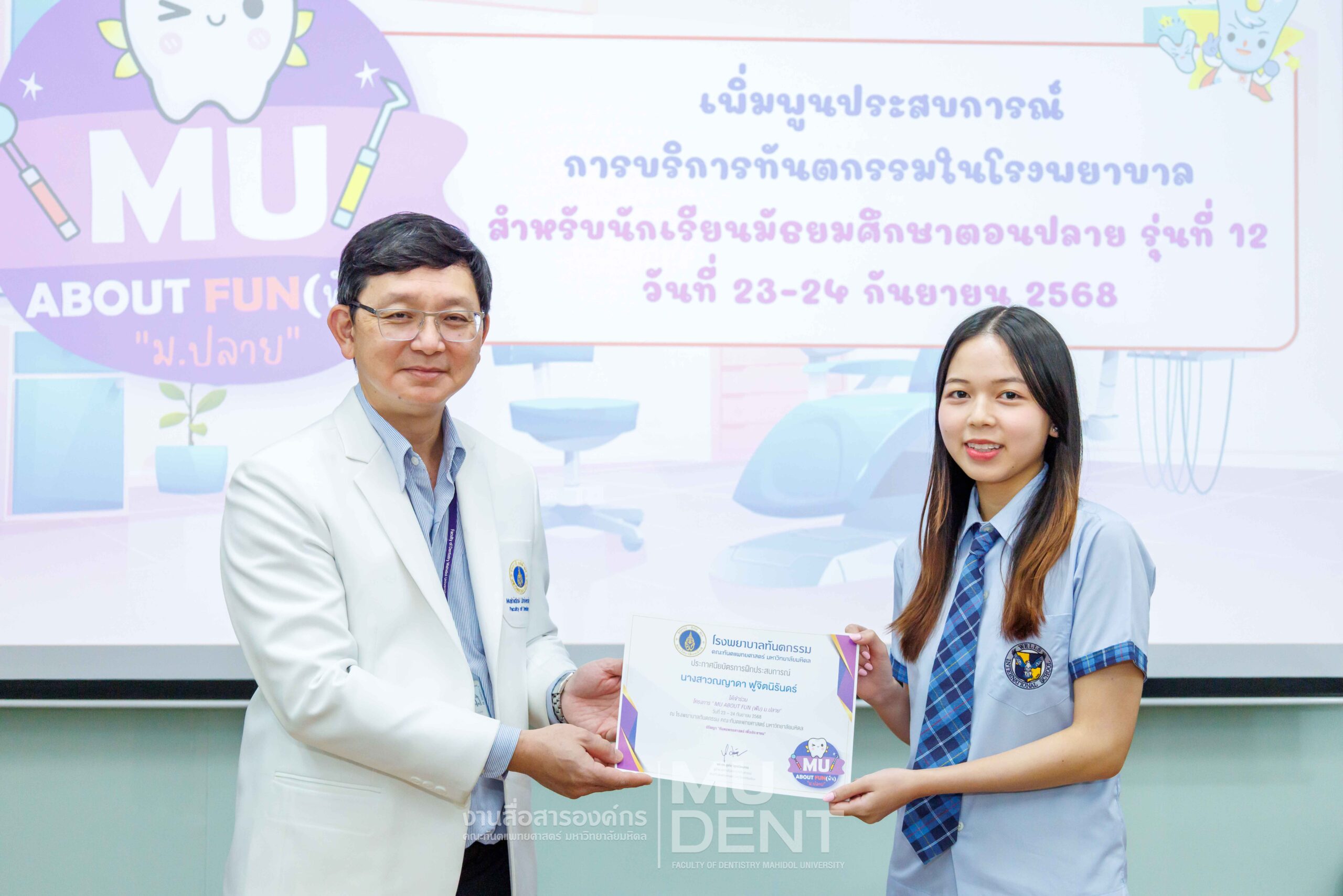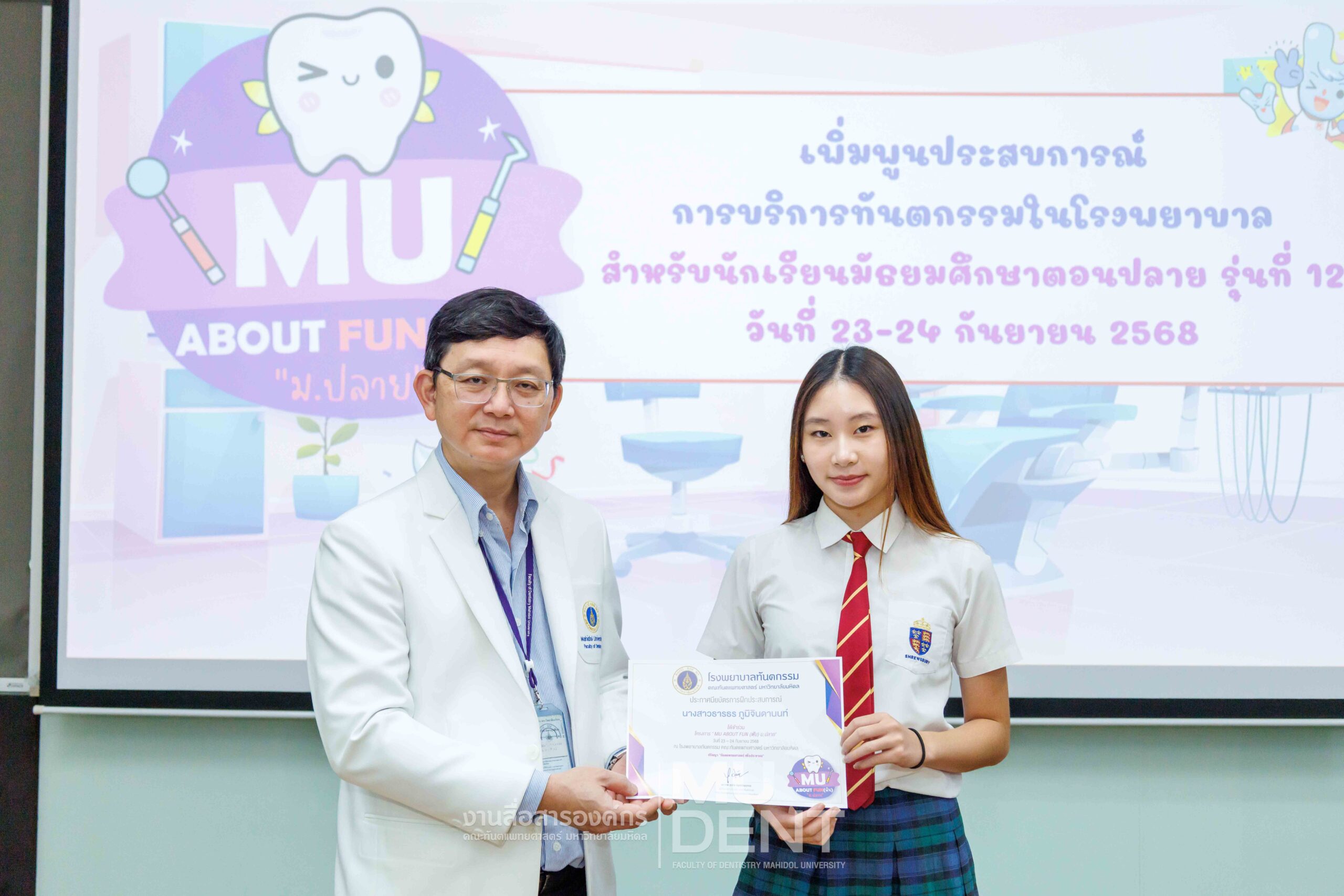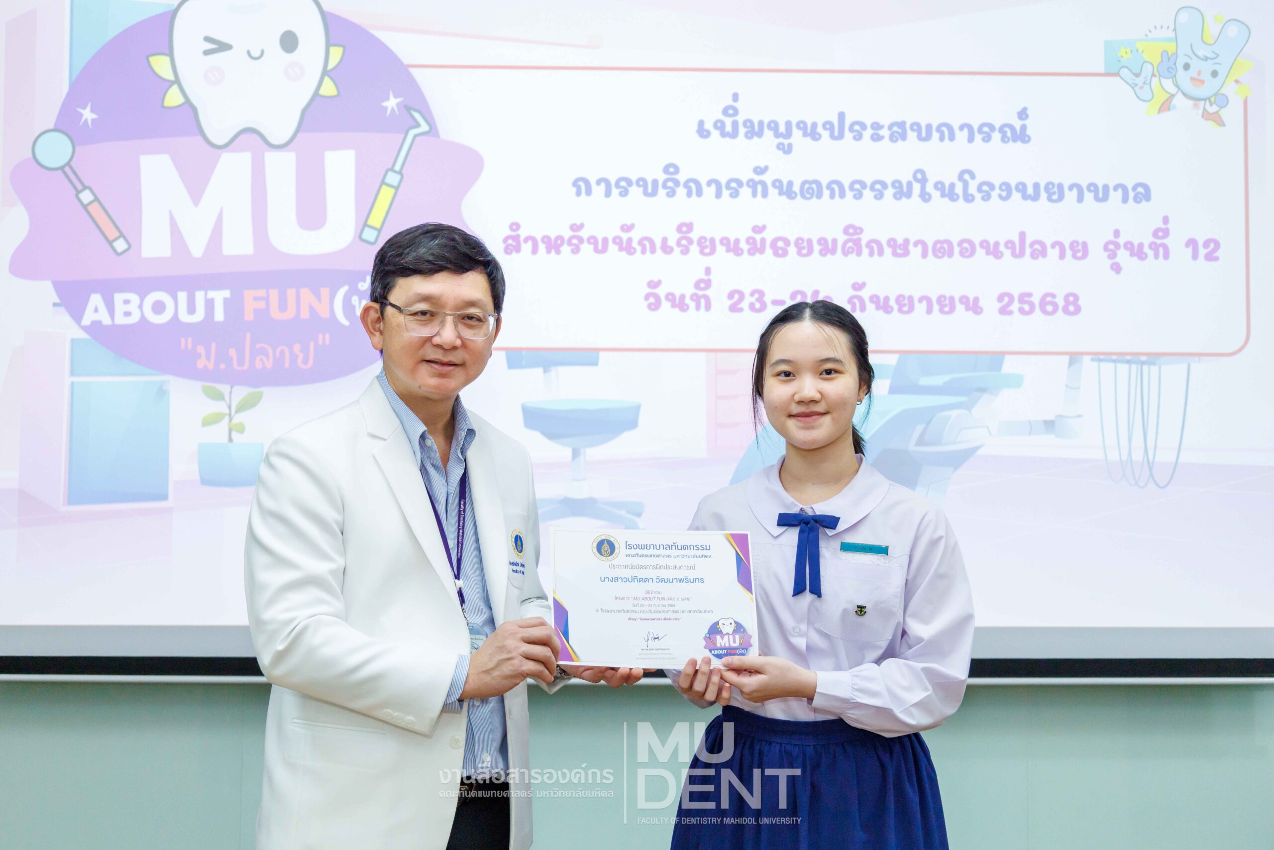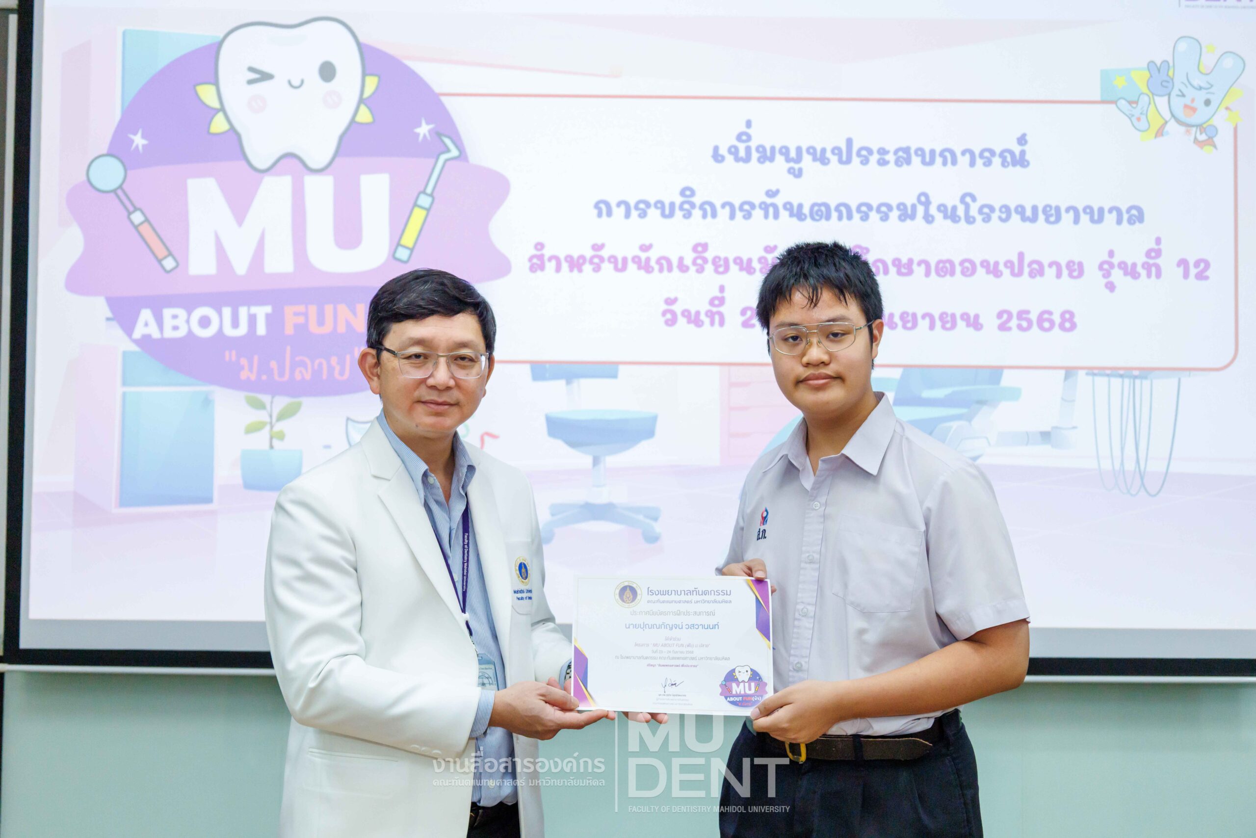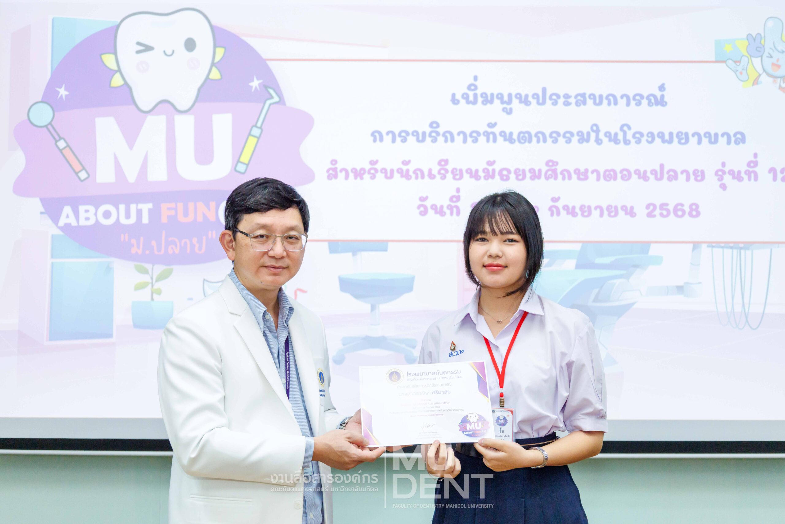 เมื่อวันที่ 23 กันยายน 2568 ผู้ช่วยศาสตราจารย์ ทันตแพทย์สุรกิจ วิสุทธิวัฒนากร ผู้อำนวยการโรงพยาบาลทันตกรรม คณะทันตแพทยศาสตร์ มหาวิทยาลัยมหิดล ให้เกียรติเป็นประธานในพิธีเปิดโครงการ “MU ABOUT FUN (ฟัน)” สำหรับนักเรียนมัธยมศึกษาตอนปลาย รุ่นที่ 12 ปีงบประมาณ 2568 โดยมีหัวหน้าคลินิก หัวหน้าศูนย์ หัวหน้าหน่วย เข้าร่วมเป็นเกียรติ ณ ห้องประชุม 304 -305 ชั้น 3 อาคารเฉลิมพระเกียรติ 50 พรรษา ซึ่งโครงการดังกล่าว มีนักเรียนมัธยมศึกษาตอนปลายเข้าร่วมโครงการฯ จำนวน 50 ราย จัดขึ้นระหว่างวันที่ 23 – 24 กันยายน 2568 เป็นการแบ่งกลุ่มนักเรียนที่เข้าร่วมโครงการฯ ให้เข้ารับการฝึกปฏิบัติตามฐานกิจกรรม ภายในคลินิกทันตกรรม ของโรงพยาบาลทันตกรรม คณะทันตแพทยศาสตร์ มหาวิทยาลัยมหิดล จำนวน 6 ฐาน ได้แก่ คลินิกศัลยกรรมช่องปากและใบหน้าขากรรไกร คลินิกรังสีวิทยาช่องปากและใบหน้าขากรรไกร คลินิกประดิษฐ์ใบหน้าขากรรไกร คลินิกทันตกรรมจัดฟัน คลินิกวิทยาเอ็นโดดอนต์ และศูนย์ส่งเสริมและพัฒนาคุณภาพชีวิตผู้สูงอายุ โดยเมื่อวันที่ 24 กันยายน 2568 ผู้ช่วยศาสตราจารย์ ทันตแพทย์สุรกิจ วิสุทธิวัฒนากร ผู้อำนวยการโรงพยาบาลทันตกรรม คณะทันตแพทยศาสตร์ มหาวิทยาลัยมหิดล ให้เกียรติเป็นประธานในพิธีปิด และมอบประกาศนียบัตรแก่นักเรียนที่เข้าร่วมโครงการฯ ณ ห้องประชุม 304 – 305 ชั้น 3 อาคารเฉลิมพระเกียรติ 50 พรรษา คณะทันตแพทยศาสตร์ มหาวิทยาลัยมหิดล