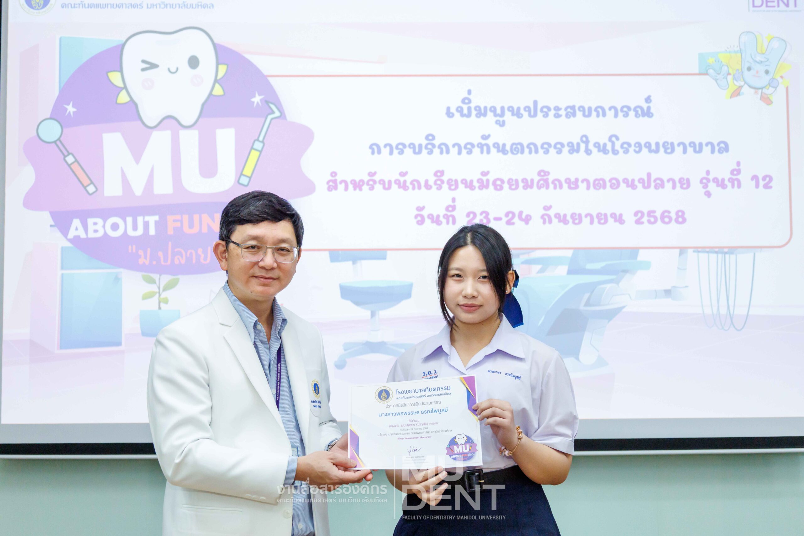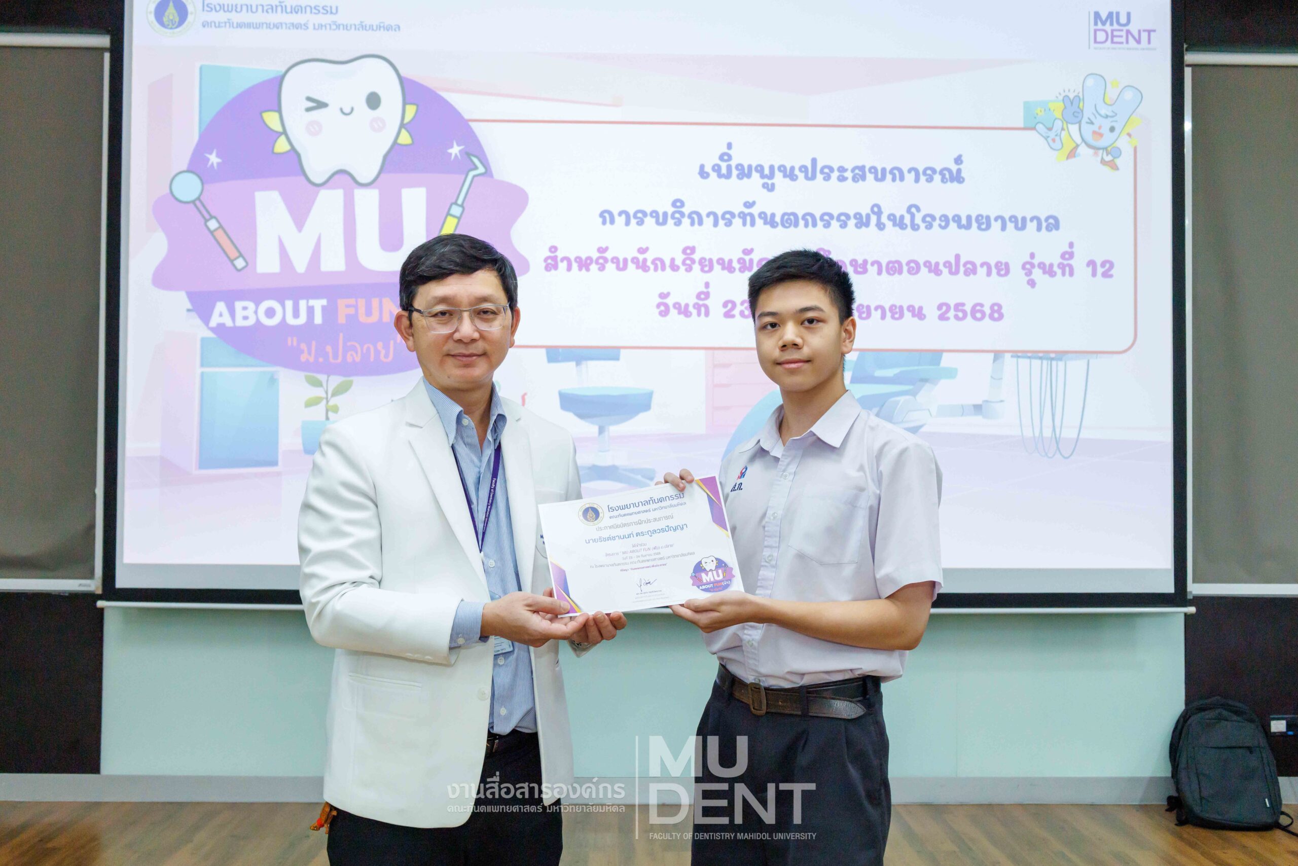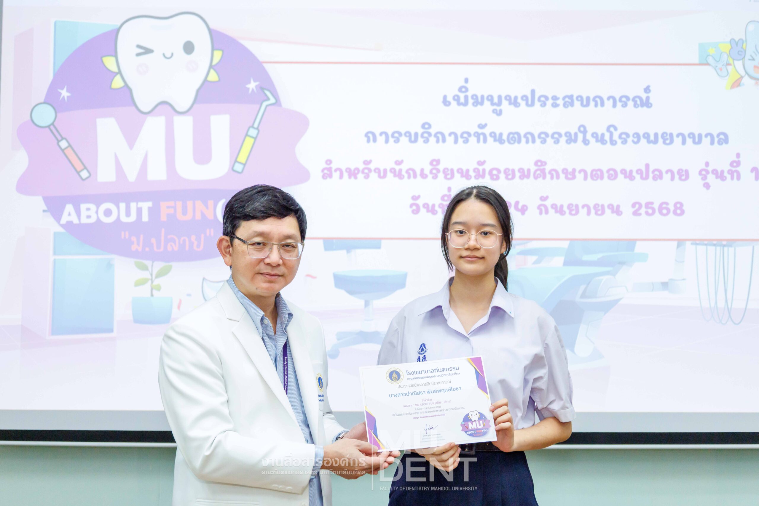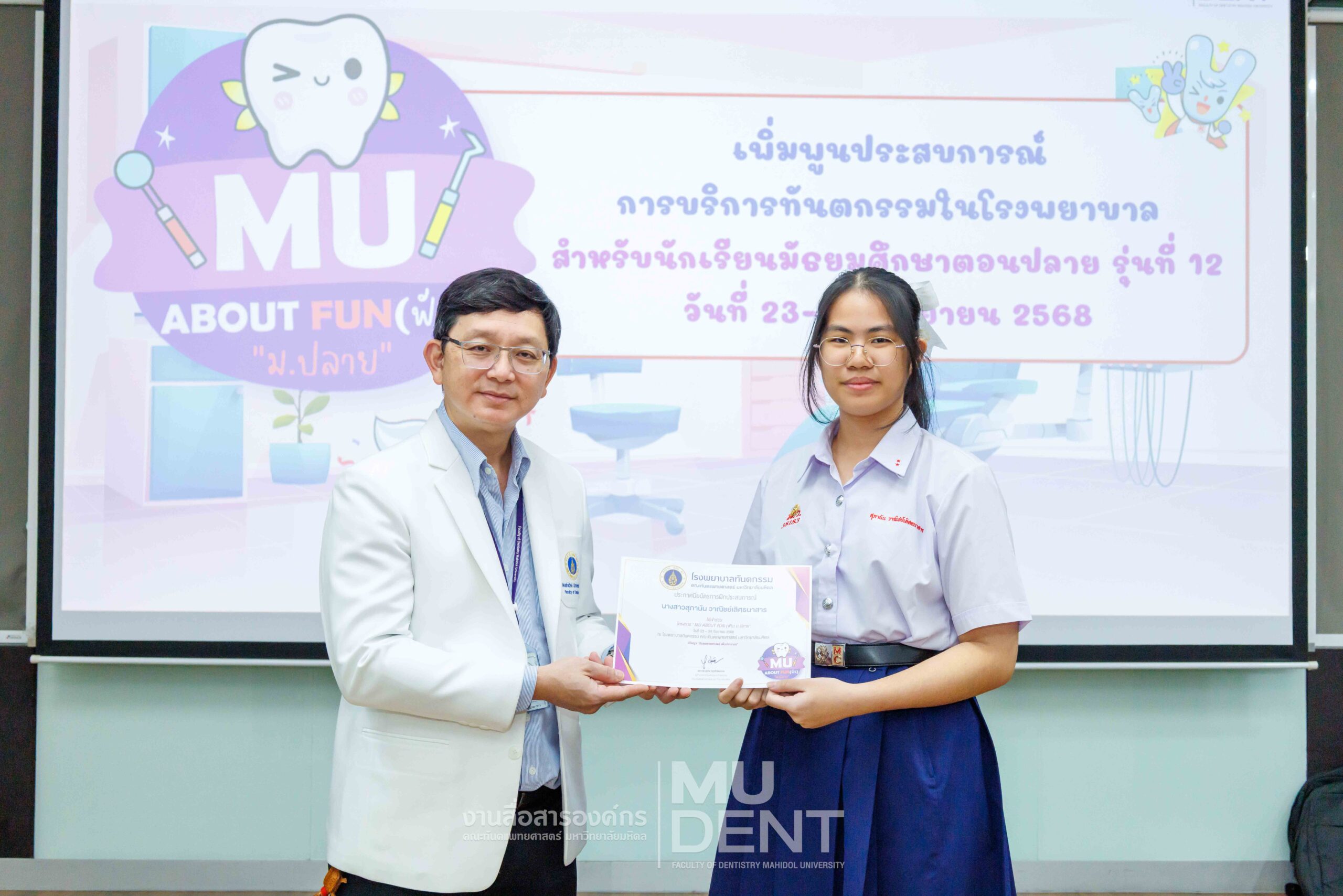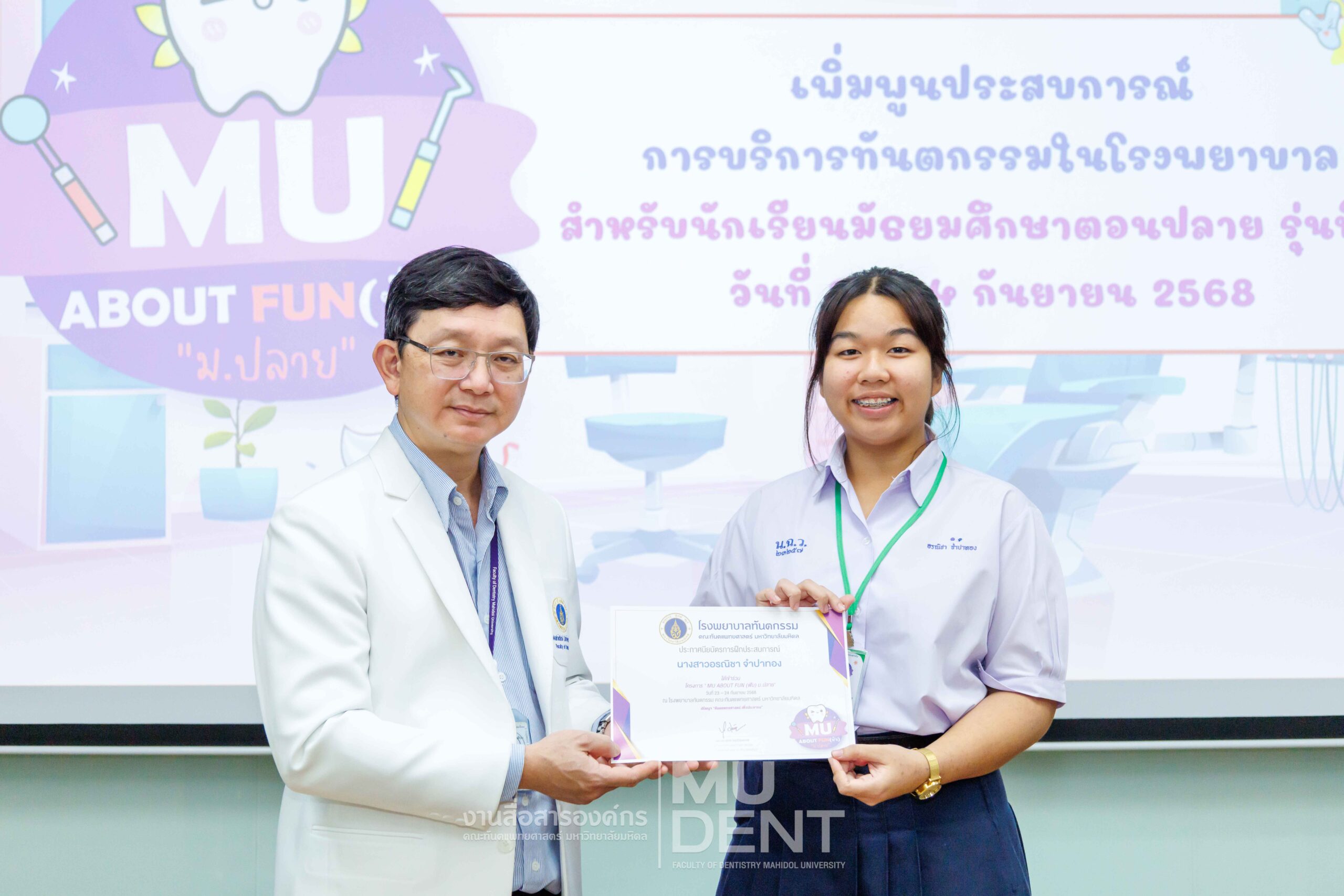 เมื่อวันที่ 23 กันยายน 2568 ผู้ช่วยศาสตราจารย์ ทันตแพทย์สุรกิจ วิสุทธิวัฒนากร ผู้อำนวยการโรงพยาบาลทันตกรรม คณะทันตแพทยศาสตร์ มหาวิทยาลัยมหิดล ให้เกียรติเป็นประธานในพิธีเปิดโครงการ “MU ABOUT FUN (ฟัน)” สำหรับนักเรียนมัธยมศึกษาตอนปลาย รุ่นที่ 12 ปีงบประมาณ 2568 โดยมีหัวหน้าคลินิก หัวหน้าศูนย์ หัวหน้าหน่วย เข้าร่วมเป็นเกียรติ ณ ห้องประชุม 304 -305 ชั้น 3 อาคารเฉลิมพระเกียรติ 50 พรรษา ซึ่งโครงการดังกล่าว มีนักเรียนมัธยมศึกษาตอนปลายเข้าร่วมโครงการฯ จำนวน 50 ราย จัดขึ้นระหว่างวันที่ 23 – 24 กันยายน 2568 เป็นการแบ่งกลุ่มนักเรียนที่เข้าร่วมโครงการฯ ให้เข้ารับการฝึกปฏิบัติตามฐานกิจกรรม ภายในคลินิกทันตกรรม ของโรงพยาบาลทันตกรรม คณะทันตแพทยศาสตร์ มหาวิทยาลัยมหิดล จำนวน 6 ฐาน ได้แก่ คลินิกศัลยกรรมช่องปากและใบหน้าขากรรไกร คลินิกรังสีวิทยาช่องปากและใบหน้าขากรรไกร คลินิกประดิษฐ์ใบหน้าขากรรไกร คลินิกทันตกรรมจัดฟัน คลินิกวิทยาเอ็นโดดอนต์ และศูนย์ส่งเสริมและพัฒนาคุณภาพชีวิตผู้สูงอายุ โดยเมื่อวันที่ 24 กันยายน 2568 ผู้ช่วยศาสตราจารย์ ทันตแพทย์สุรกิจ วิสุทธิวัฒนากร ผู้อำนวยการโรงพยาบาลทันตกรรม คณะทันตแพทยศาสตร์ มหาวิทยาลัยมหิดล ให้เกียรติเป็นประธานในพิธีปิด และมอบประกาศนียบัตรแก่นักเรียนที่เข้าร่วมโครงการฯ ณ ห้องประชุม 304 – 305 ชั้น 3 อาคารเฉลิมพระเกียรติ 50 พรรษา คณะทันตแพทยศาสตร์ มหาวิทยาลัยมหิดล