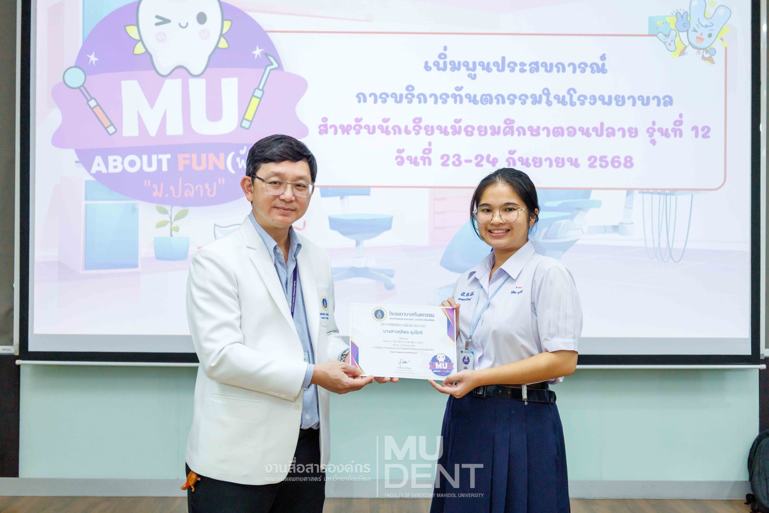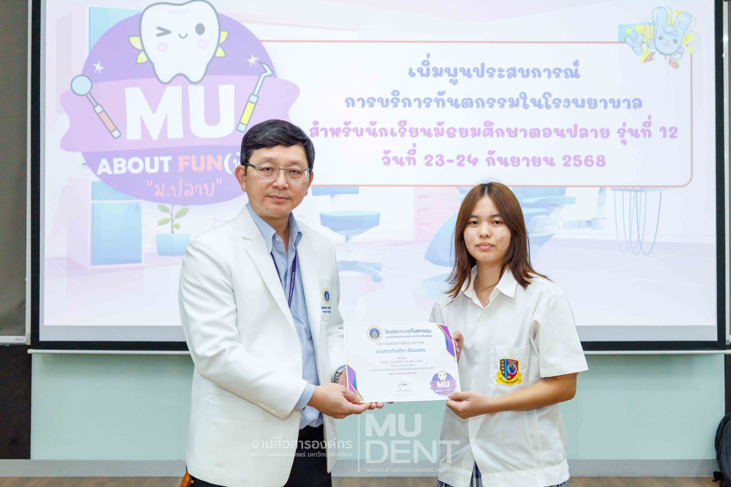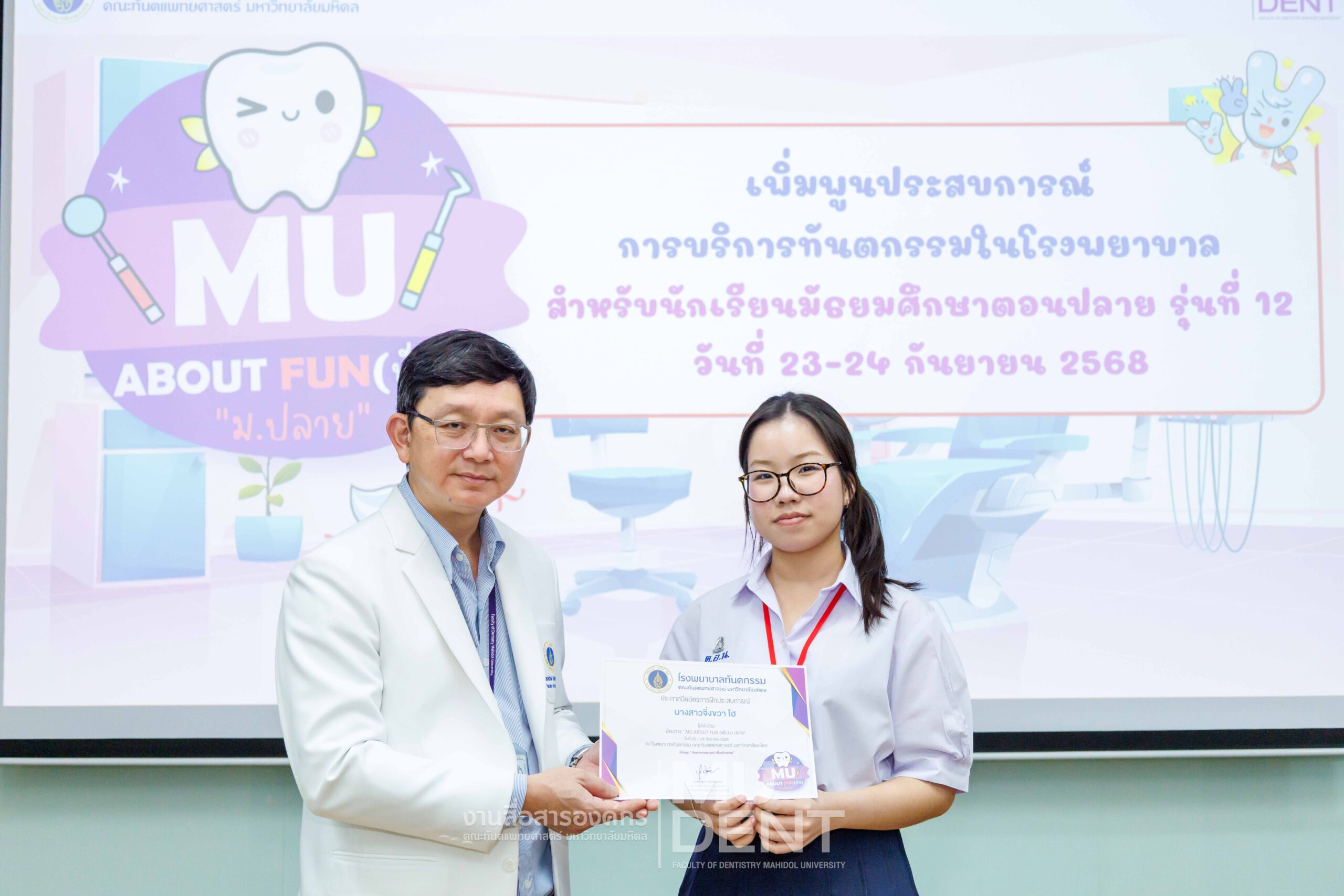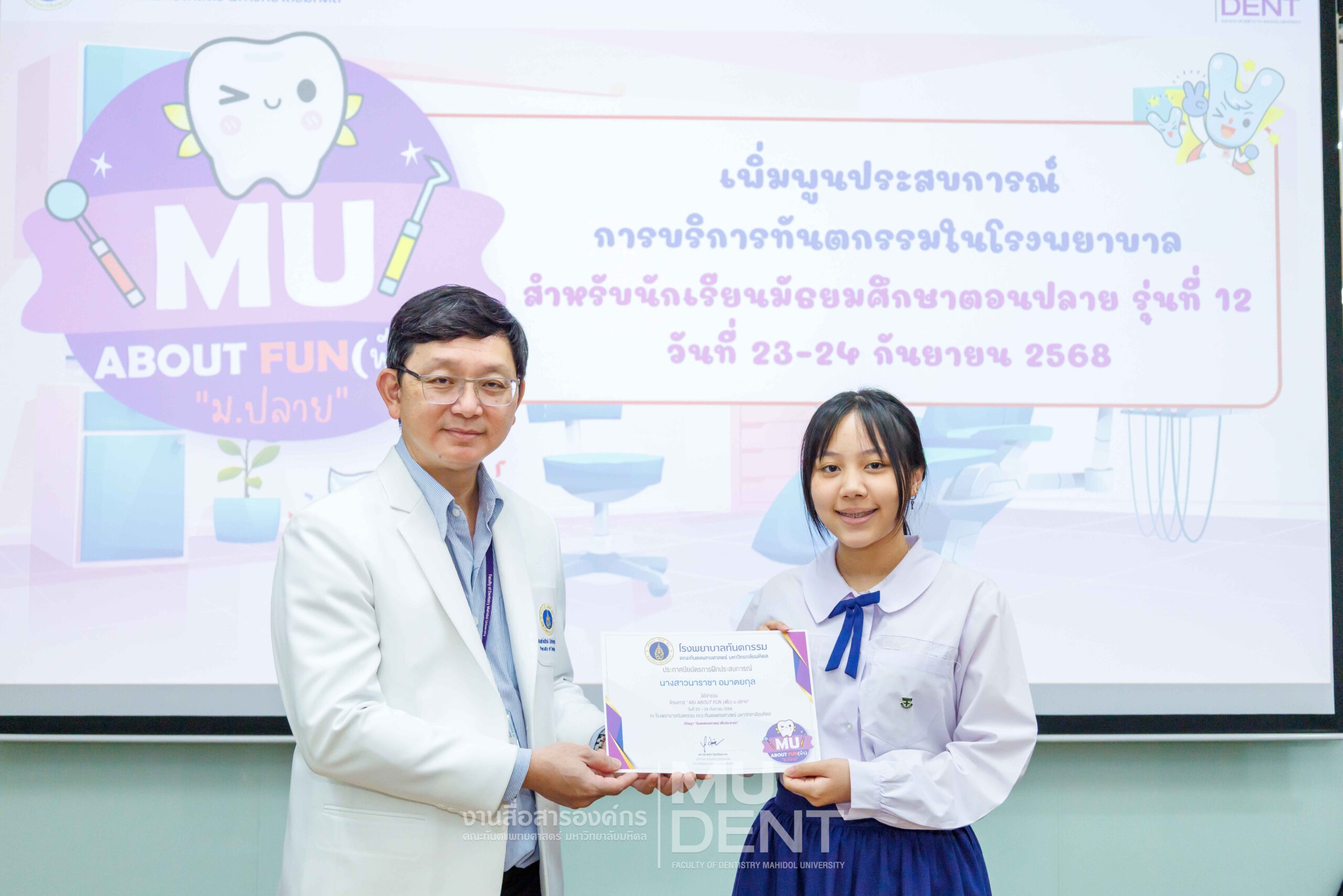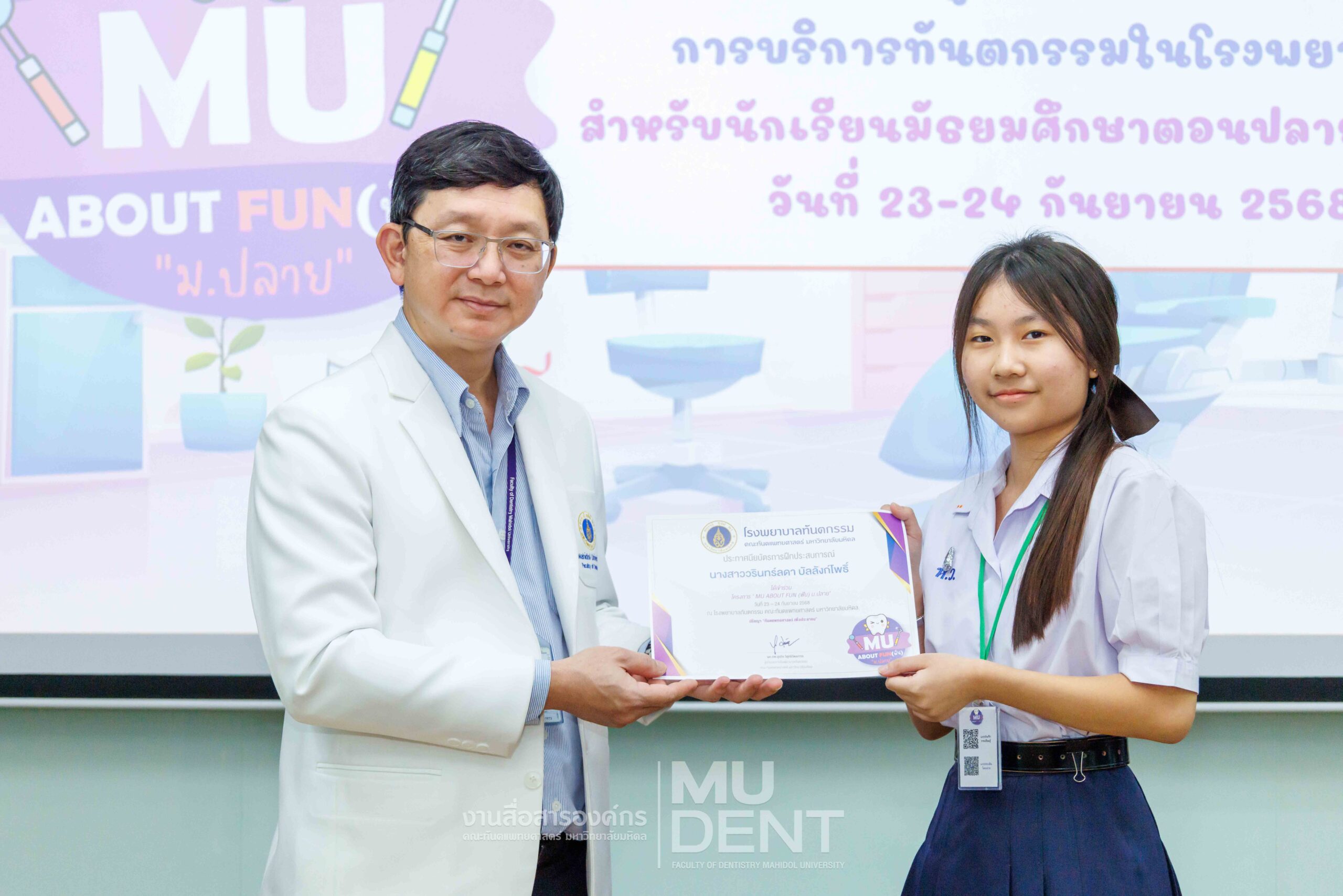 เมื่อวันที่ 23 กันยายน 2568 ผู้ช่วยศาสตราจารย์ ทันตแพทย์สุรกิจ วิสุทธิวัฒนากร ผู้อำนวยการโรงพยาบาลทันตกรรม คณะทันตแพทยศาสตร์ มหาวิทยาลัยมหิดล ให้เกียรติเป็นประธานในพิธีเปิดโครงการ “MU ABOUT FUN (ฟัน)” สำหรับนักเรียนมัธยมศึกษาตอนปลาย รุ่นที่ 12 ปีงบประมาณ 2568 โดยมีหัวหน้าคลินิก หัวหน้าศูนย์ หัวหน้าหน่วย เข้าร่วมเป็นเกียรติ ณ ห้องประชุม 304 -305 ชั้น 3 อาคารเฉลิมพระเกียรติ 50 พรรษา ซึ่งโครงการดังกล่าว มีนักเรียนมัธยมศึกษาตอนปลายเข้าร่วมโครงการฯ จำนวน 50 ราย จัดขึ้นระหว่างวันที่ 23 – 24 กันยายน 2568 เป็นการแบ่งกลุ่มนักเรียนที่เข้าร่วมโครงการฯ ให้เข้ารับการฝึกปฏิบัติตามฐานกิจกรรม ภายในคลินิกทันตกรรม ของโรงพยาบาลทันตกรรม คณะทันตแพทยศาสตร์ มหาวิทยาลัยมหิดล จำนวน 6 ฐาน ได้แก่ คลินิกศัลยกรรมช่องปากและใบหน้าขากรรไกร คลินิกรังสีวิทยาช่องปากและใบหน้าขากรรไกร คลินิกประดิษฐ์ใบหน้าขากรรไกร คลินิกทันตกรรมจัดฟัน คลินิกวิทยาเอ็นโดดอนต์ และศูนย์ส่งเสริมและพัฒนาคุณภาพชีวิตผู้สูงอายุ โดยเมื่อวันที่ 24 กันยายน 2568 ผู้ช่วยศาสตราจารย์ ทันตแพทย์สุรกิจ วิสุทธิวัฒนากร ผู้อำนวยการโรงพยาบาลทันตกรรม คณะทันตแพทยศาสตร์ มหาวิทยาลัยมหิดล ให้เกียรติเป็นประธานในพิธีปิด และมอบประกาศนียบัตรแก่นักเรียนที่เข้าร่วมโครงการฯ ณ ห้องประชุม 304 – 305 ชั้น 3 อาคารเฉลิมพระเกียรติ 50 พรรษา คณะทันตแพทยศาสตร์ มหาวิทยาลัยมหิดล