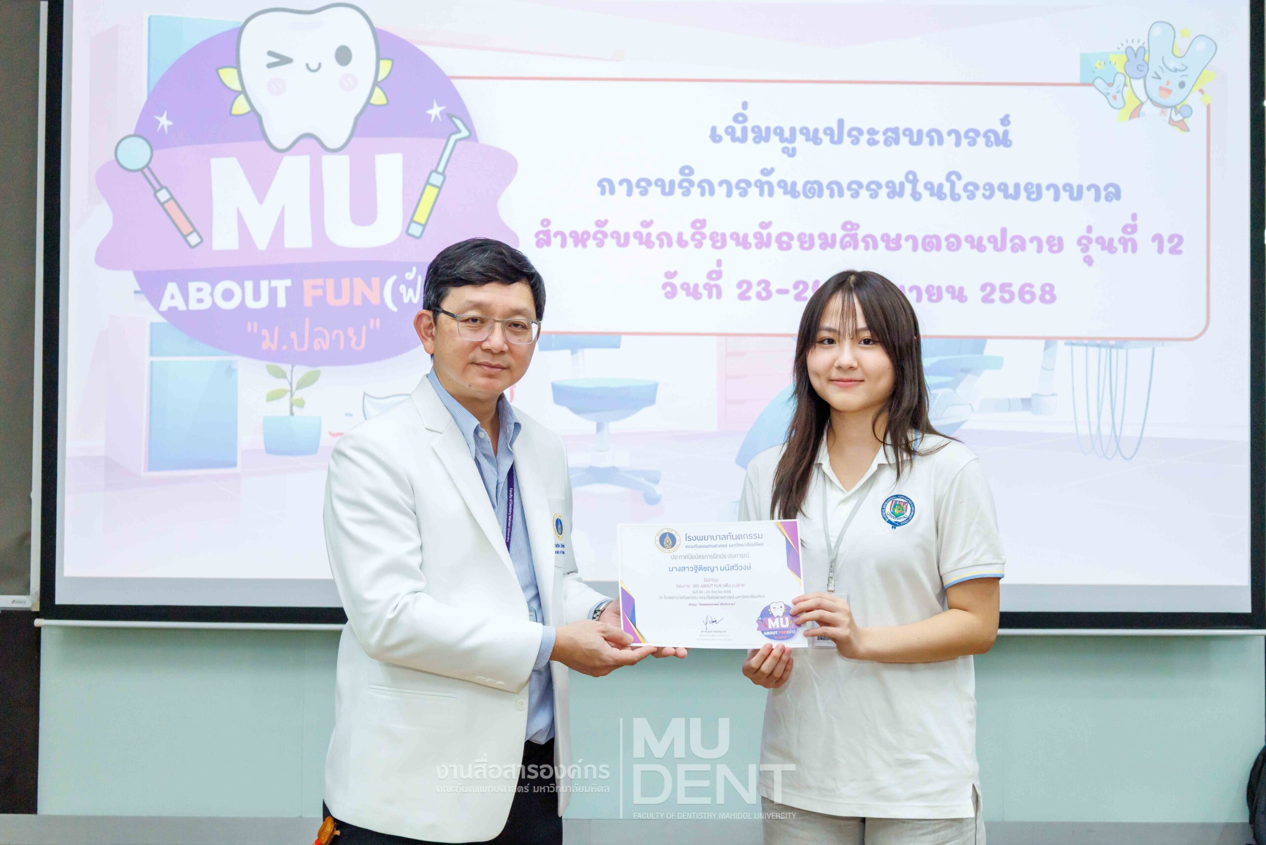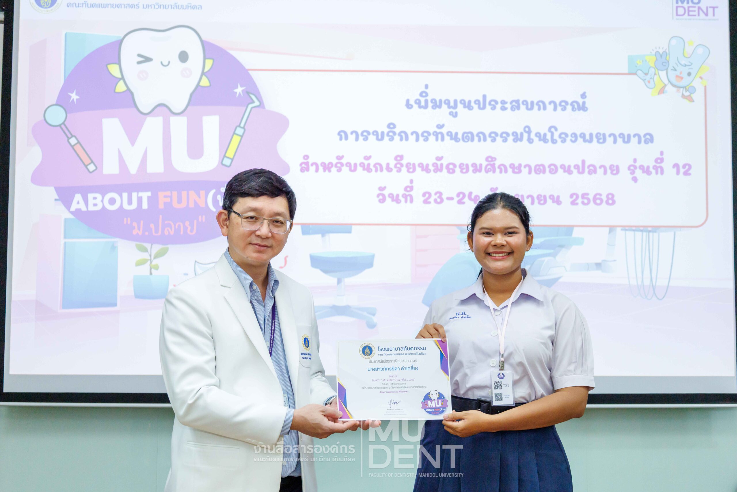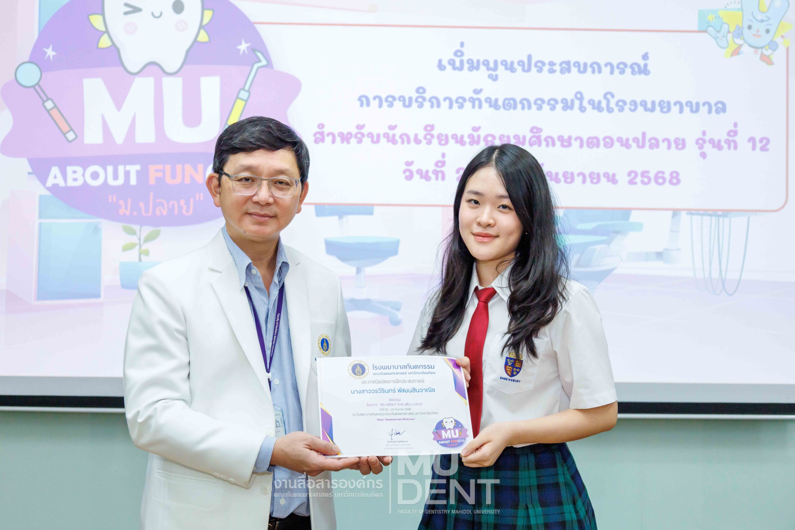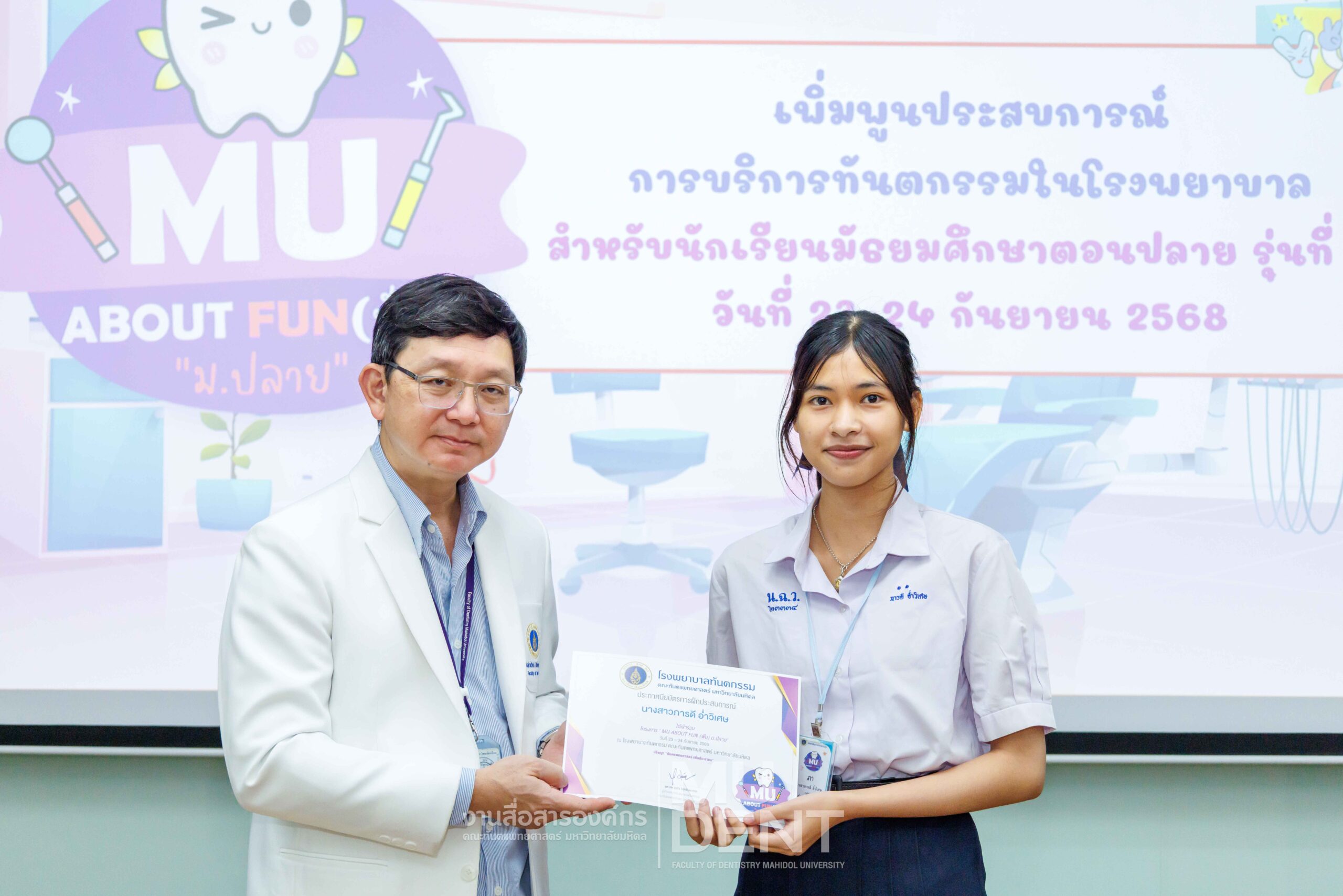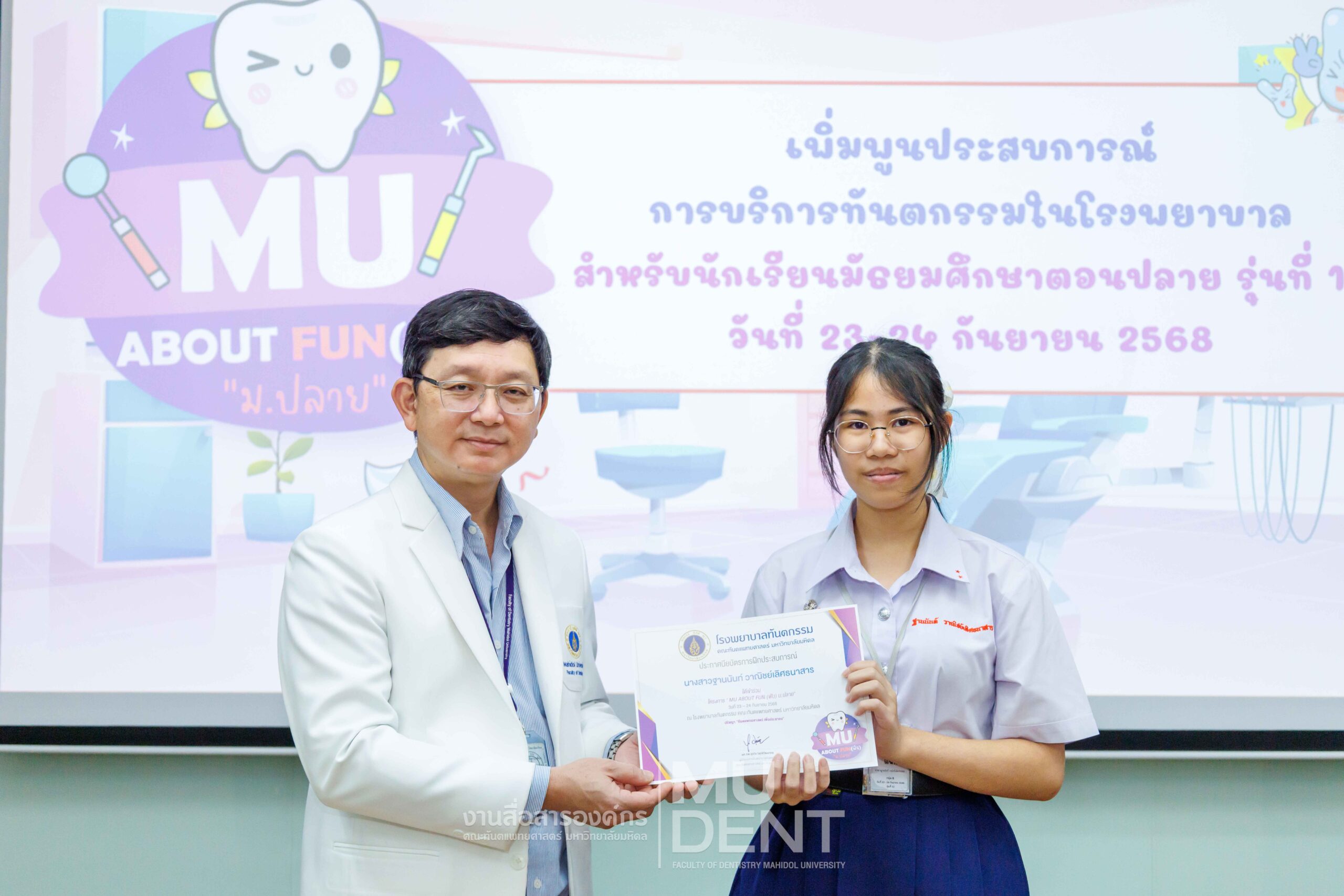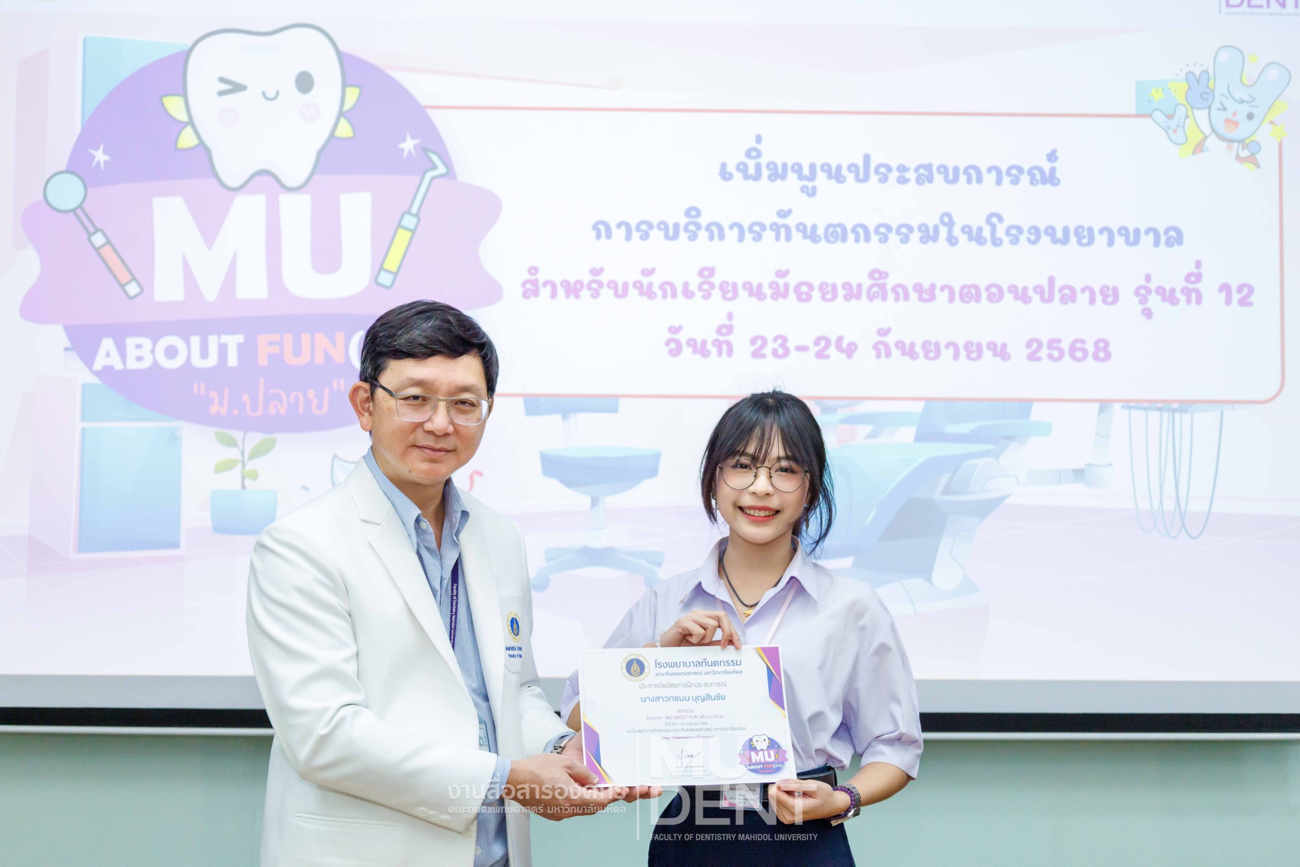 เมื่อวันที่ 23 กันยายน 2568 ผู้ช่วยศาสตราจารย์ ทันตแพทย์สุรกิจ วิสุทธิวัฒนากร ผู้อำนวยการโรงพยาบาลทันตกรรม คณะทันตแพทยศาสตร์ มหาวิทยาลัยมหิดล ให้เกียรติเป็นประธานในพิธีเปิดโครงการ “MU ABOUT FUN (ฟัน)” สำหรับนักเรียนมัธยมศึกษาตอนปลาย รุ่นที่ 12 ปีงบประมาณ 2568 โดยมีหัวหน้าคลินิก หัวหน้าศูนย์ หัวหน้าหน่วย เข้าร่วมเป็นเกียรติ ณ ห้องประชุม 304 -305 ชั้น 3 อาคารเฉลิมพระเกียรติ 50 พรรษา ซึ่งโครงการดังกล่าว มีนักเรียนมัธยมศึกษาตอนปลายเข้าร่วมโครงการฯ จำนวน 50 ราย จัดขึ้นระหว่างวันที่ 23 – 24 กันยายน 2568 เป็นการแบ่งกลุ่มนักเรียนที่เข้าร่วมโครงการฯ ให้เข้ารับการฝึกปฏิบัติตามฐานกิจกรรม ภายในคลินิกทันตกรรม ของโรงพยาบาลทันตกรรม คณะทันตแพทยศาสตร์ มหาวิทยาลัยมหิดล จำนวน 6 ฐาน ได้แก่ คลินิกศัลยกรรมช่องปากและใบหน้าขากรรไกร คลินิกรังสีวิทยาช่องปากและใบหน้าขากรรไกร คลินิกประดิษฐ์ใบหน้าขากรรไกร คลินิกทันตกรรมจัดฟัน คลินิกวิทยาเอ็นโดดอนต์ และศูนย์ส่งเสริมและพัฒนาคุณภาพชีวิตผู้สูงอายุ โดยเมื่อวันที่ 24 กันยายน 2568 ผู้ช่วยศาสตราจารย์ ทันตแพทย์สุรกิจ วิสุทธิวัฒนากร ผู้อำนวยการโรงพยาบาลทันตกรรม คณะทันตแพทยศาสตร์ มหาวิทยาลัยมหิดล ให้เกียรติเป็นประธานในพิธีปิด และมอบประกาศนียบัตรแก่นักเรียนที่เข้าร่วมโครงการฯ ณ ห้องประชุม 304 – 305 ชั้น 3 อาคารเฉลิมพระเกียรติ 50 พรรษา คณะทันตแพทยศาสตร์ มหาวิทยาลัยมหิดล