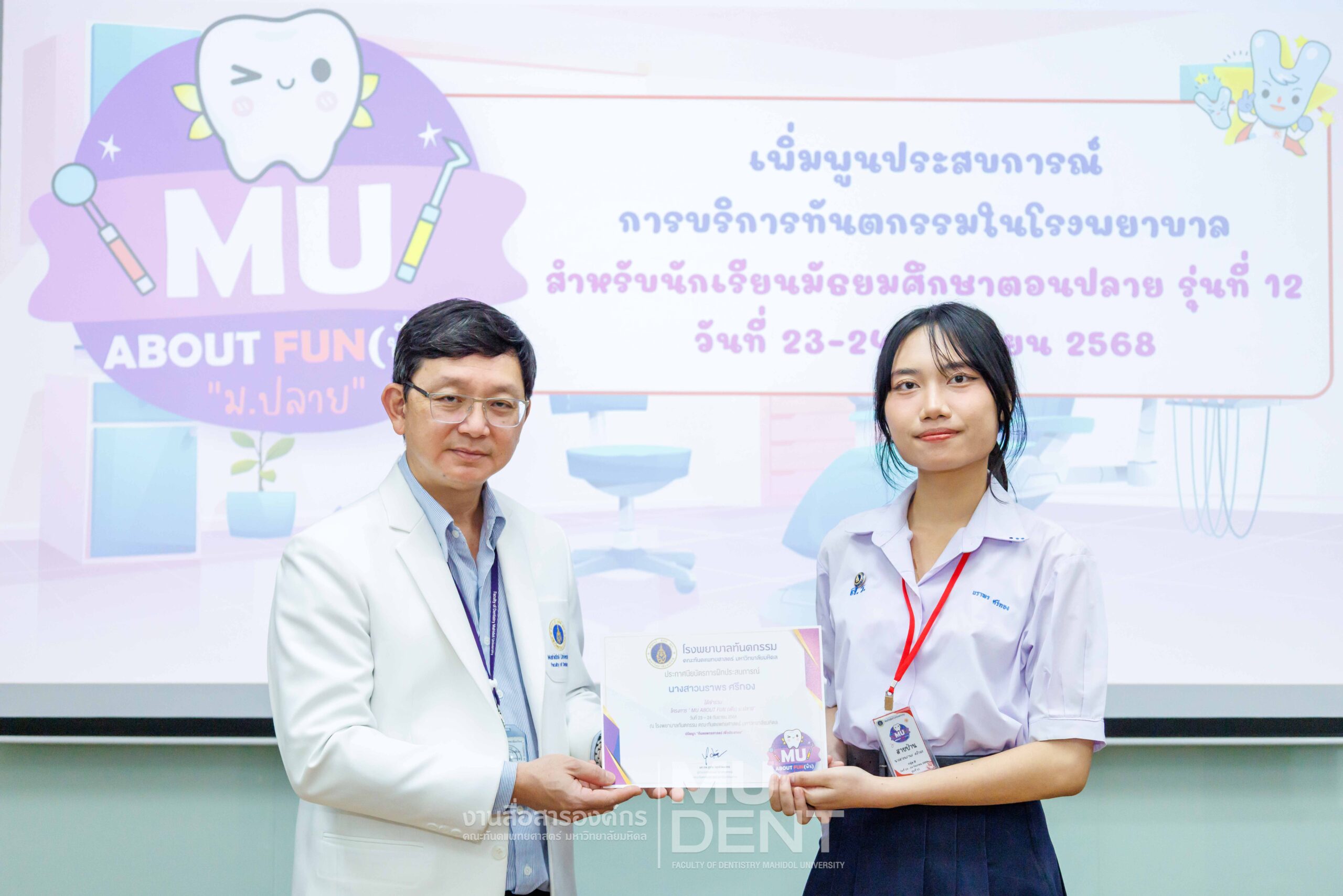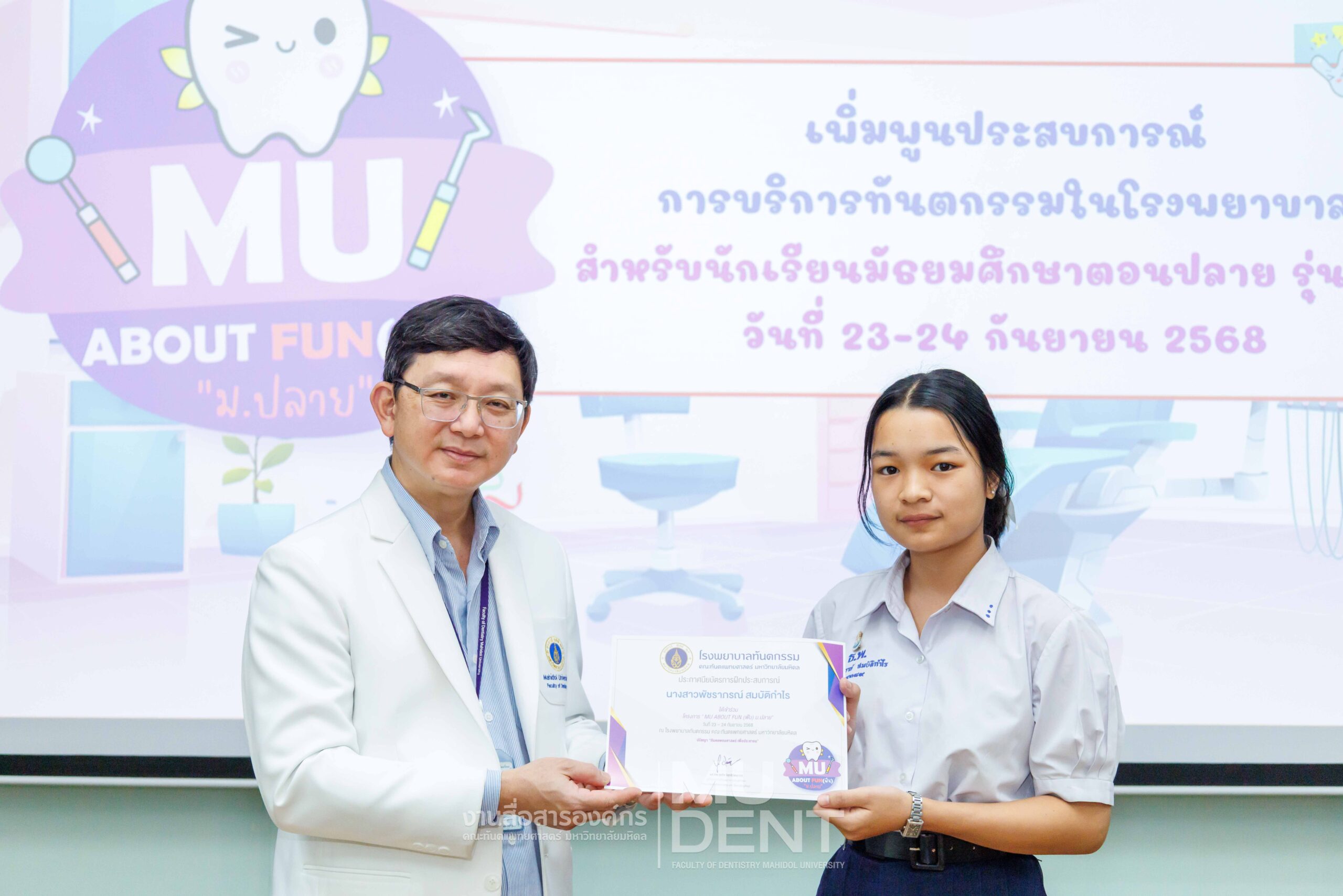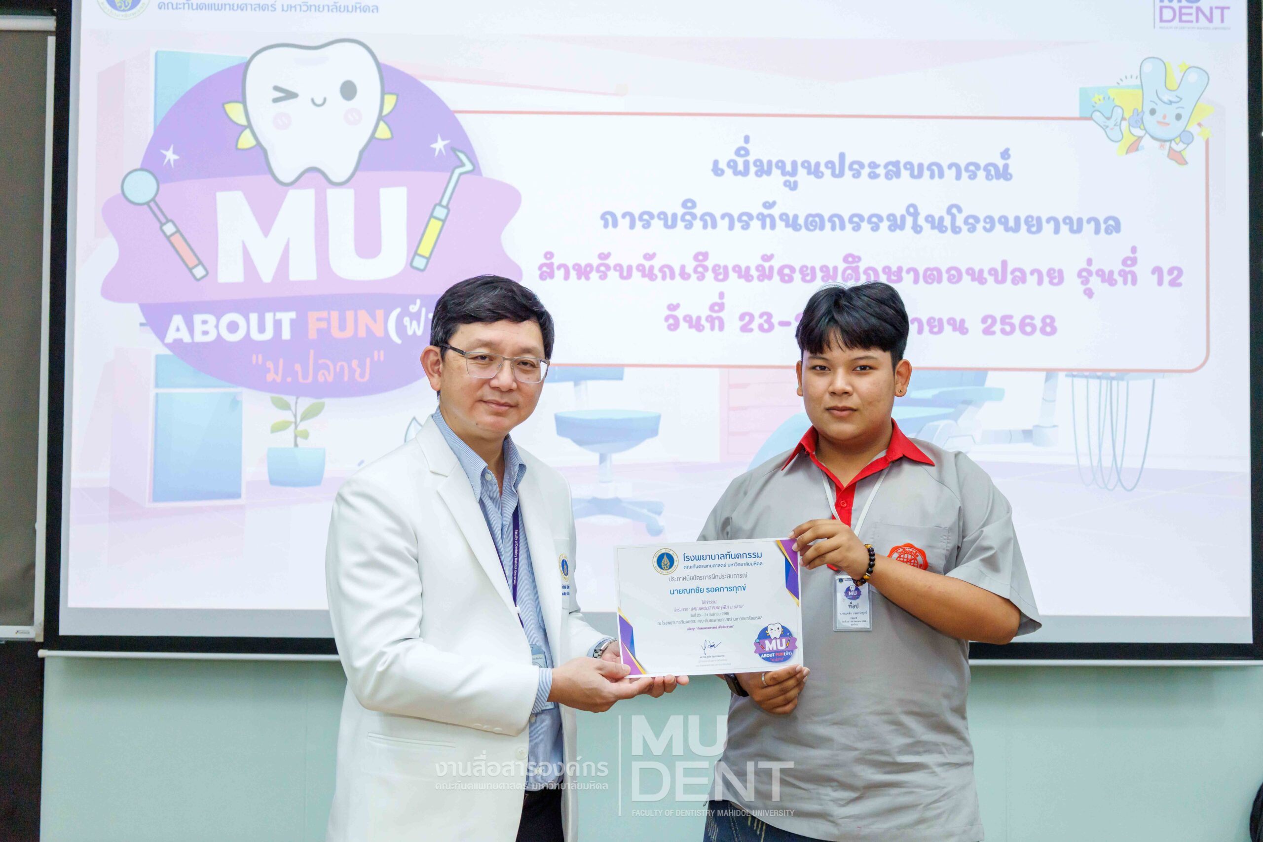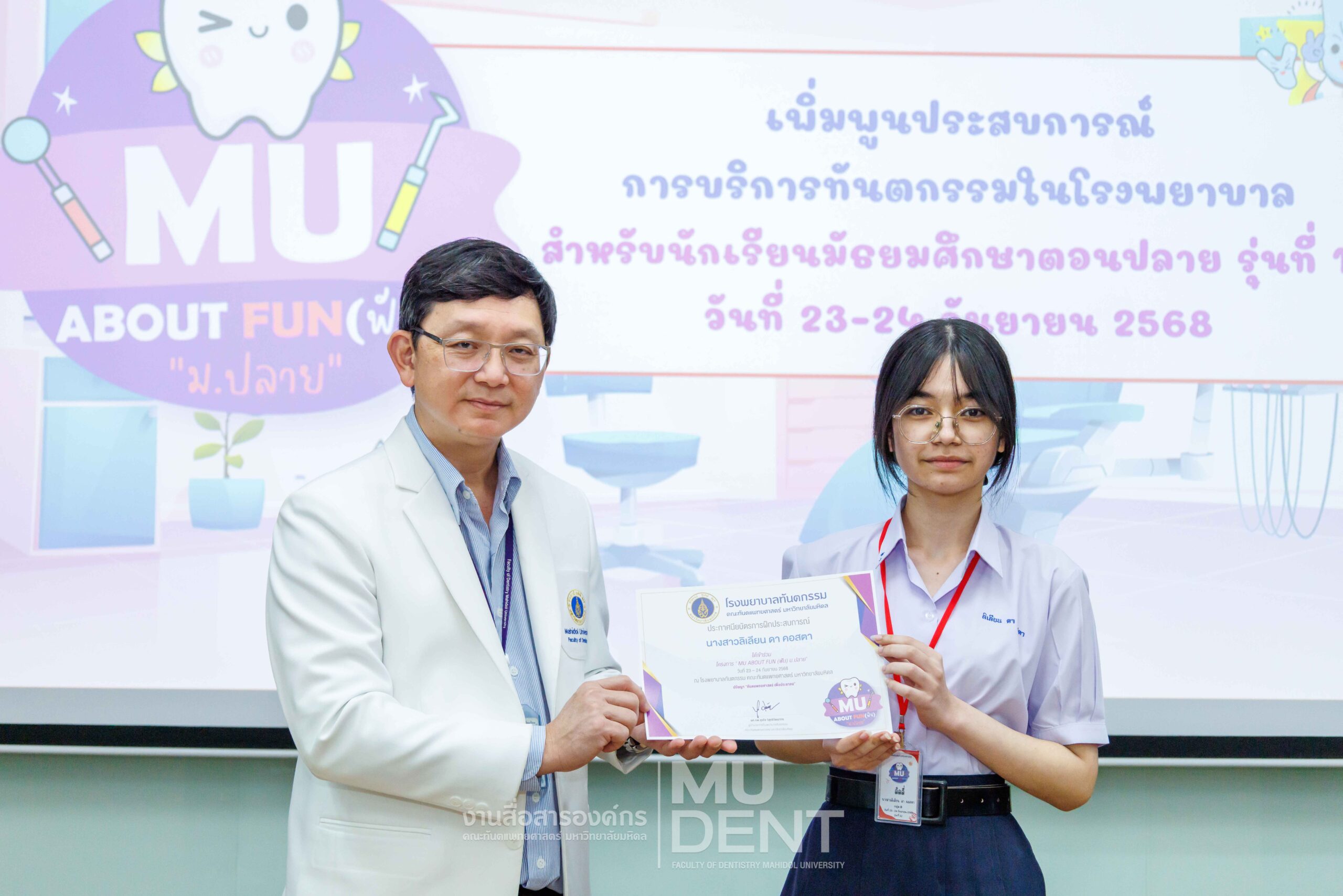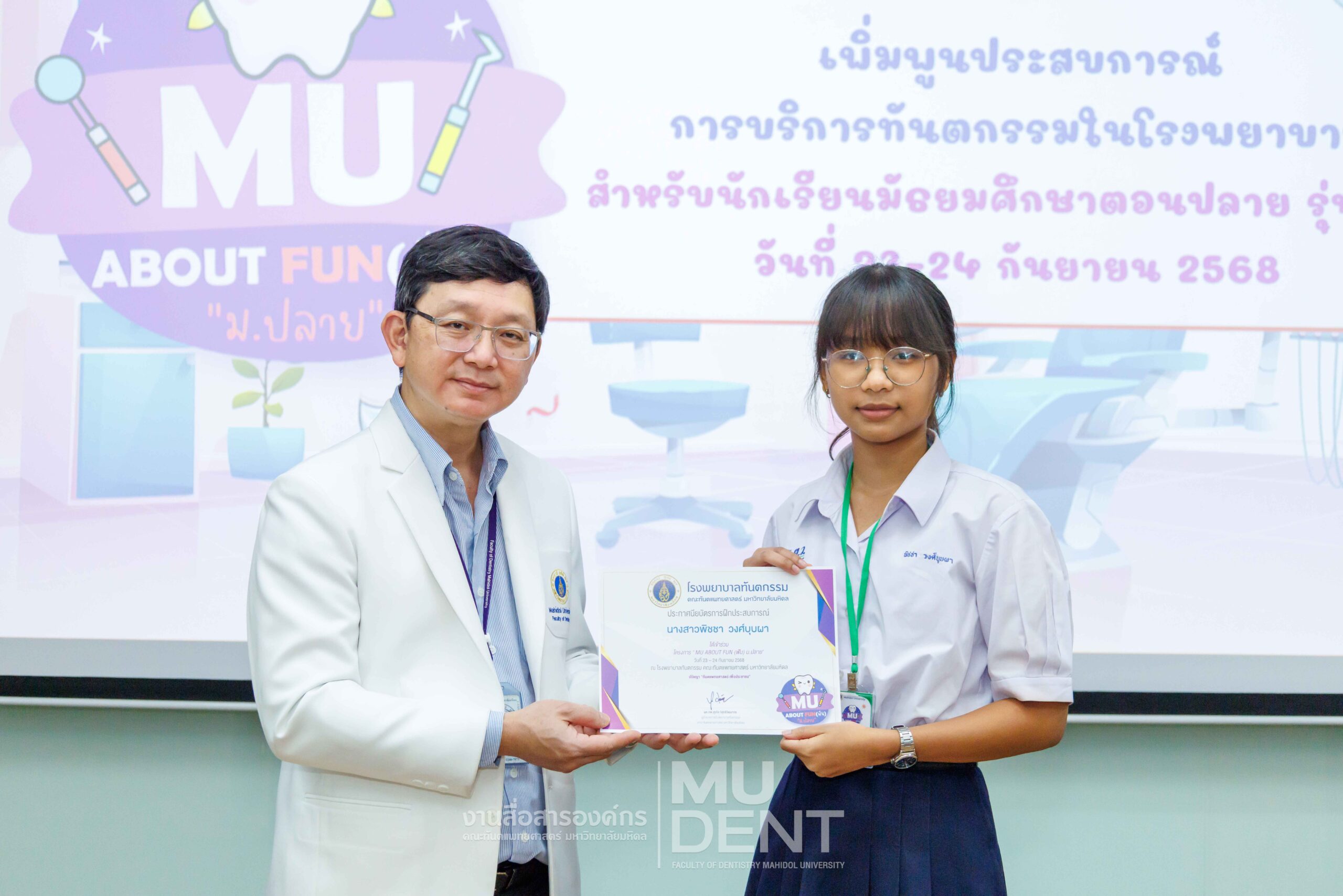 เมื่อวันที่ 23 กันยายน 2568 ผู้ช่วยศาสตราจารย์ ทันตแพทย์สุรกิจ วิสุทธิวัฒนากร ผู้อำนวยการโรงพยาบาลทันตกรรม คณะทันตแพทยศาสตร์ มหาวิทยาลัยมหิดล ให้เกียรติเป็นประธานในพิธีเปิดโครงการ “MU ABOUT FUN (ฟัน)” สำหรับนักเรียนมัธยมศึกษาตอนปลาย รุ่นที่ 12 ปีงบประมาณ 2568 โดยมีหัวหน้าคลินิก หัวหน้าศูนย์ หัวหน้าหน่วย เข้าร่วมเป็นเกียรติ ณ ห้องประชุม 304 -305 ชั้น 3 อาคารเฉลิมพระเกียรติ 50 พรรษา ซึ่งโครงการดังกล่าว มีนักเรียนมัธยมศึกษาตอนปลายเข้าร่วมโครงการฯ จำนวน 50 ราย จัดขึ้นระหว่างวันที่ 23 – 24 กันยายน 2568 เป็นการแบ่งกลุ่มนักเรียนที่เข้าร่วมโครงการฯ ให้เข้ารับการฝึกปฏิบัติตามฐานกิจกรรม ภายในคลินิกทันตกรรม ของโรงพยาบาลทันตกรรม คณะทันตแพทยศาสตร์ มหาวิทยาลัยมหิดล จำนวน 6 ฐาน ได้แก่ คลินิกศัลยกรรมช่องปากและใบหน้าขากรรไกร คลินิกรังสีวิทยาช่องปากและใบหน้าขากรรไกร คลินิกประดิษฐ์ใบหน้าขากรรไกร คลินิกทันตกรรมจัดฟัน คลินิกวิทยาเอ็นโดดอนต์ และศูนย์ส่งเสริมและพัฒนาคุณภาพชีวิตผู้สูงอายุ โดยเมื่อวันที่ 24 กันยายน 2568 ผู้ช่วยศาสตราจารย์ ทันตแพทย์สุรกิจ วิสุทธิวัฒนากร ผู้อำนวยการโรงพยาบาลทันตกรรม คณะทันตแพทยศาสตร์ มหาวิทยาลัยมหิดล ให้เกียรติเป็นประธานในพิธีปิด และมอบประกาศนียบัตรแก่นักเรียนที่เข้าร่วมโครงการฯ ณ ห้องประชุม 304 – 305 ชั้น 3 อาคารเฉลิมพระเกียรติ 50 พรรษา คณะทันตแพทยศาสตร์ มหาวิทยาลัยมหิดล
