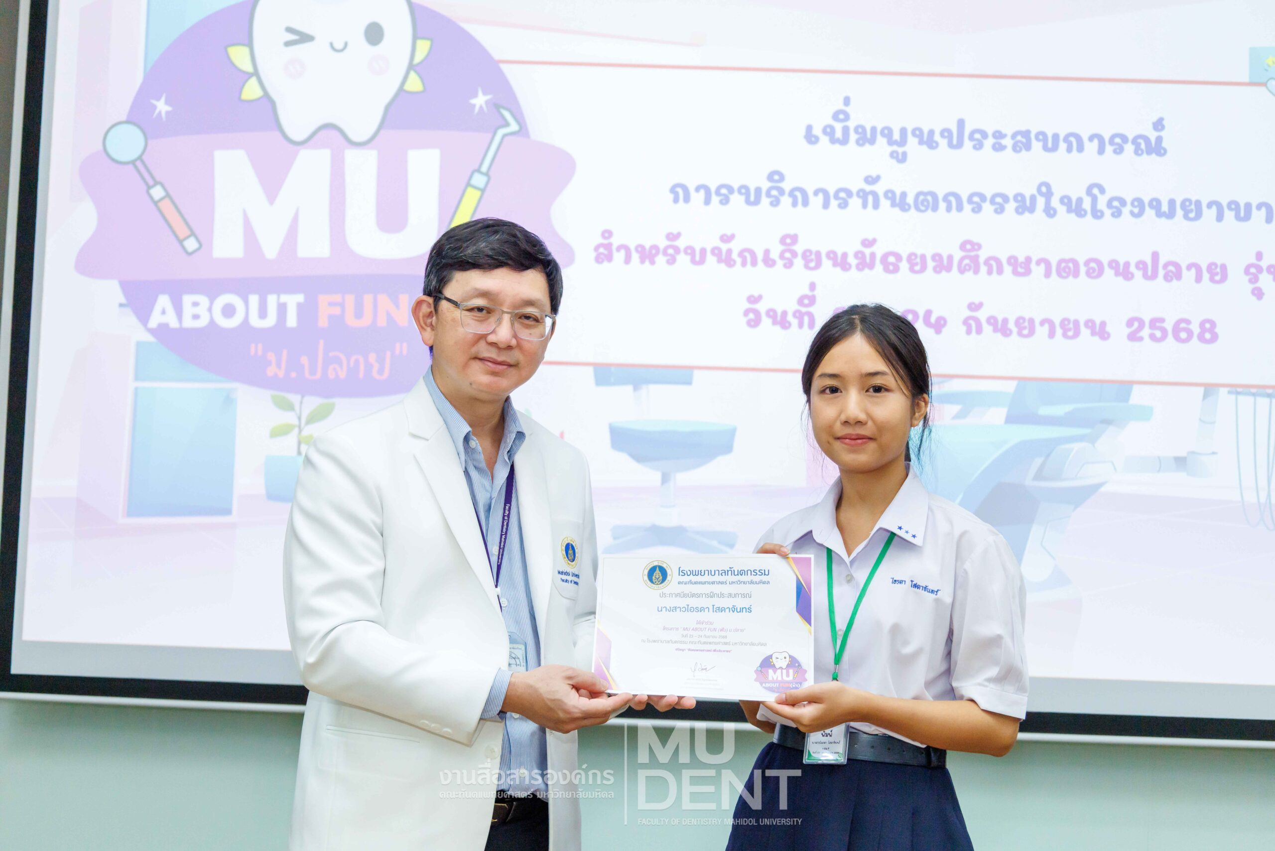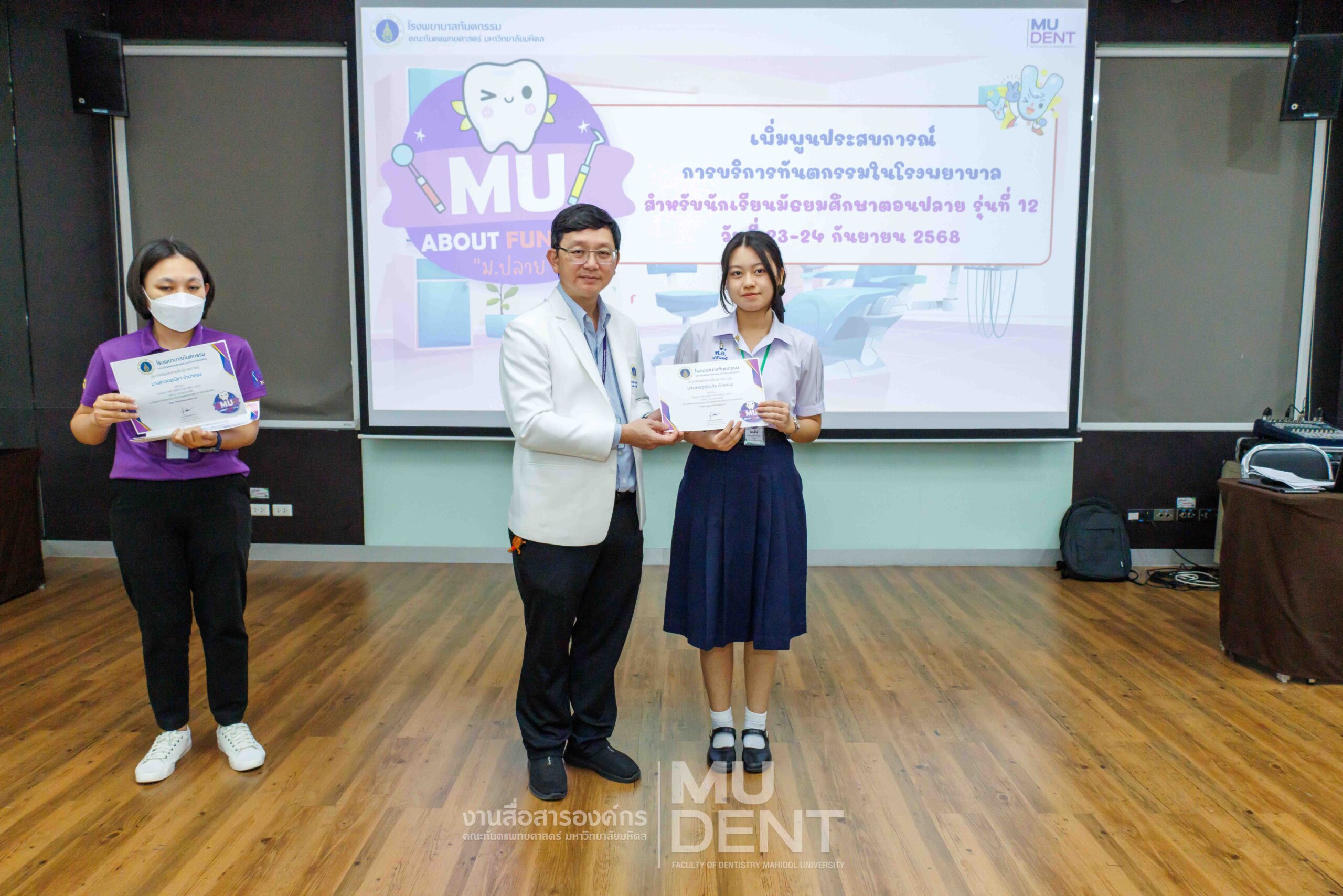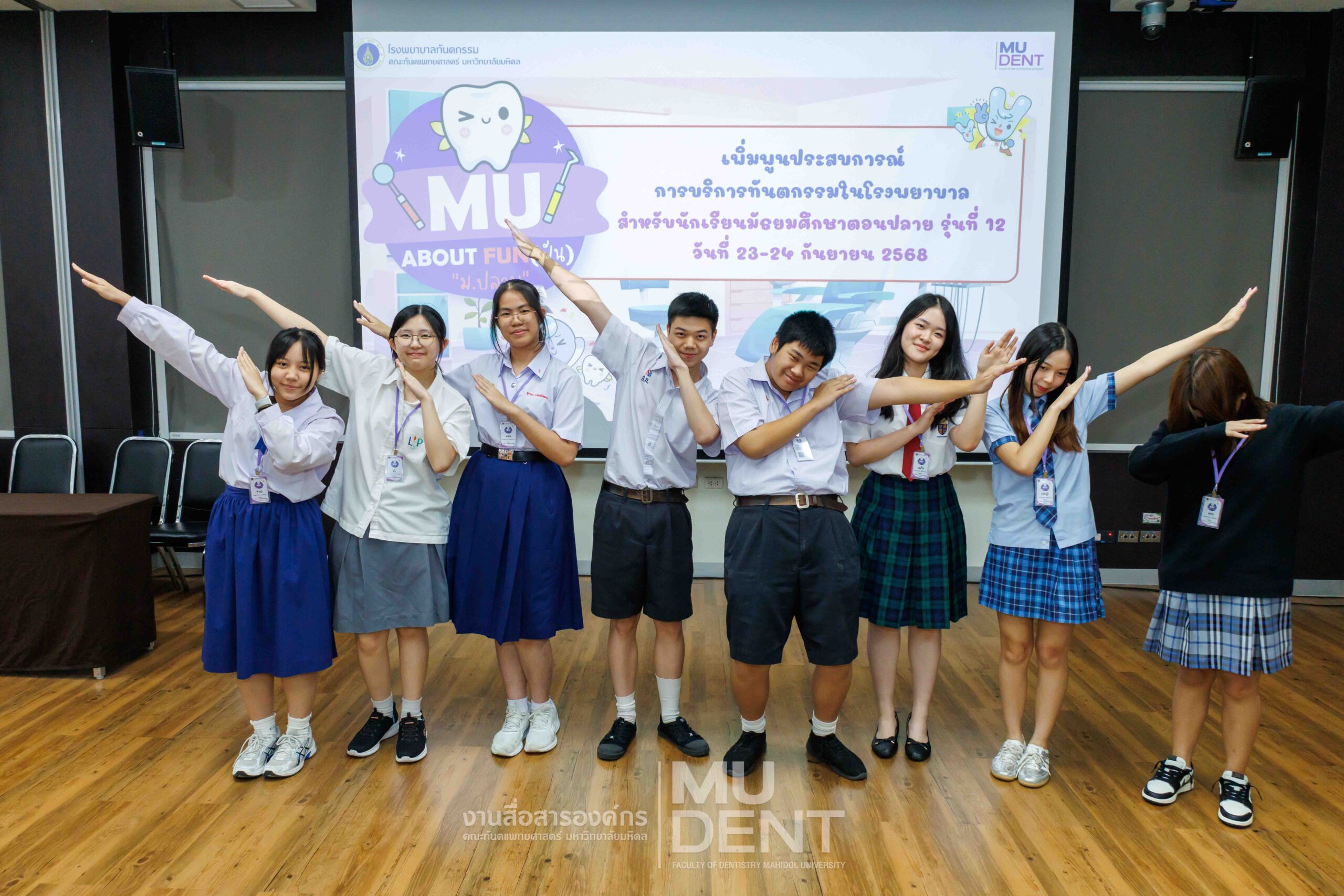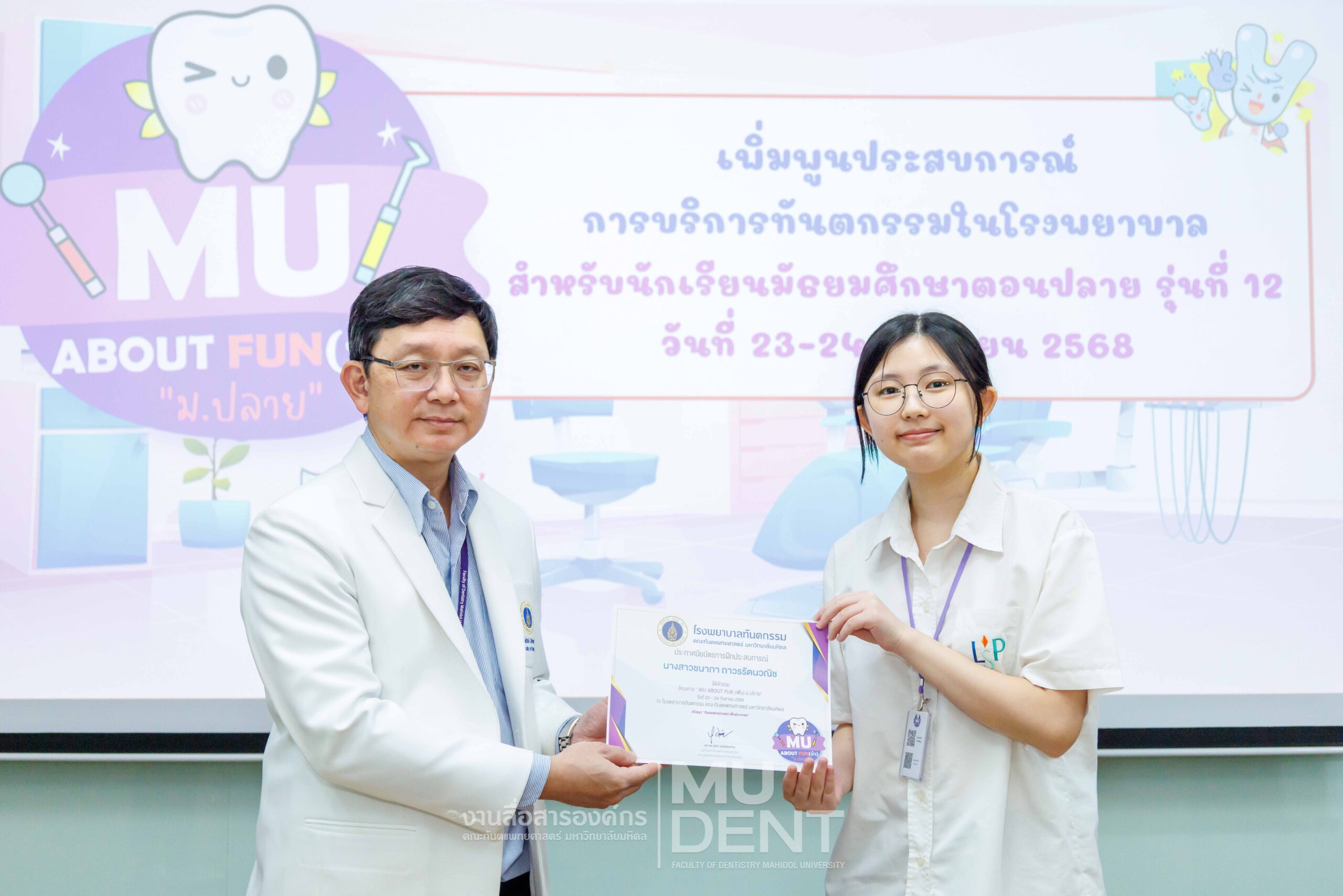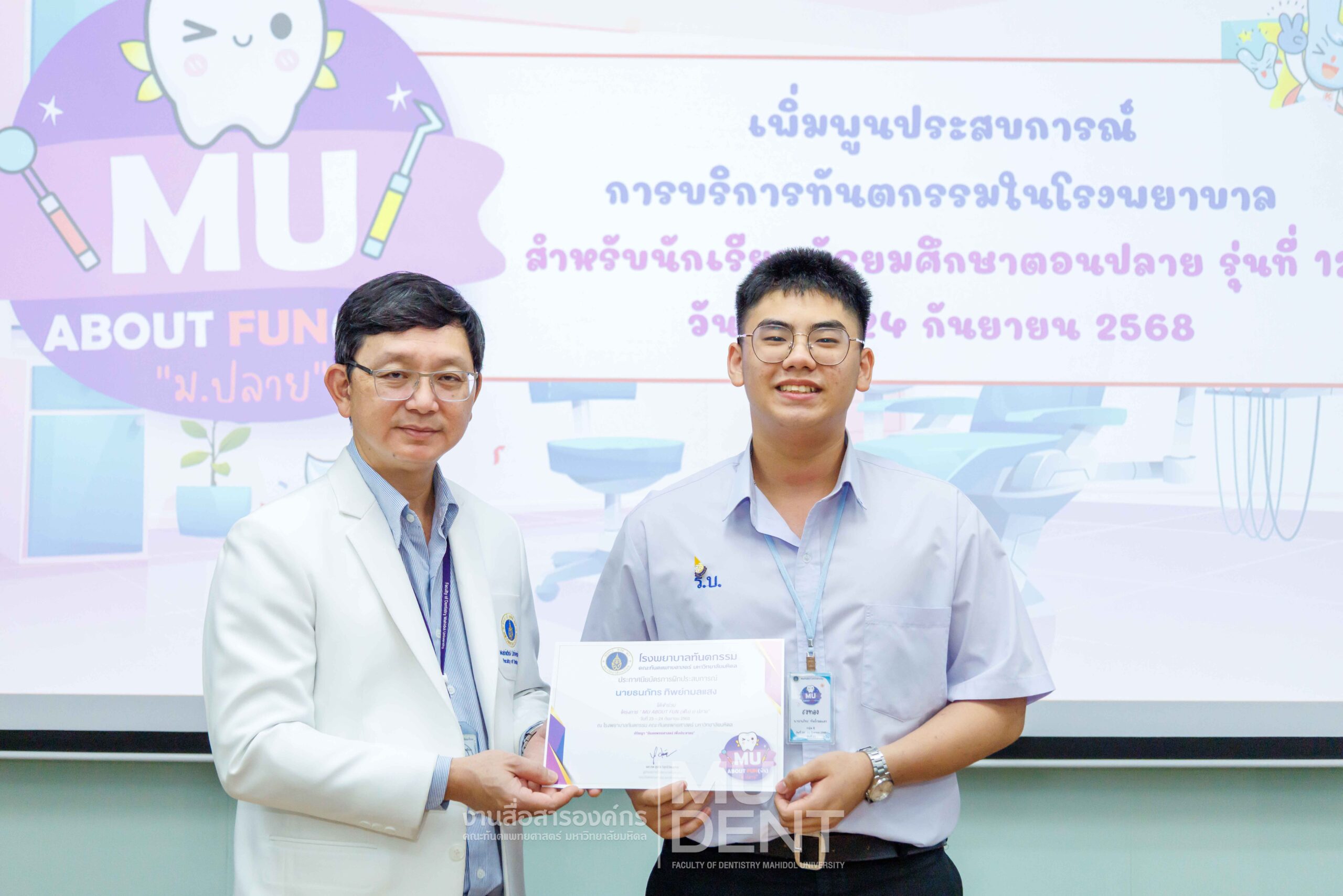 เมื่อวันที่ 23 กันยายน 2568 ผู้ช่วยศาสตราจารย์ ทันตแพทย์สุรกิจ วิสุทธิวัฒนากร ผู้อำนวยการโรงพยาบาลทันตกรรม คณะทันตแพทยศาสตร์ มหาวิทยาลัยมหิดล ให้เกียรติเป็นประธานในพิธีเปิดโครงการ “MU ABOUT FUN (ฟัน)” สำหรับนักเรียนมัธยมศึกษาตอนปลาย รุ่นที่ 12 ปีงบประมาณ 2568 โดยมีหัวหน้าคลินิก หัวหน้าศูนย์ หัวหน้าหน่วย เข้าร่วมเป็นเกียรติ ณ ห้องประชุม 304 -305 ชั้น 3 อาคารเฉลิมพระเกียรติ 50 พรรษา ซึ่งโครงการดังกล่าว มีนักเรียนมัธยมศึกษาตอนปลายเข้าร่วมโครงการฯ จำนวน 50 ราย จัดขึ้นระหว่างวันที่ 23 – 24 กันยายน 2568 เป็นการแบ่งกลุ่มนักเรียนที่เข้าร่วมโครงการฯ ให้เข้ารับการฝึกปฏิบัติตามฐานกิจกรรม ภายในคลินิกทันตกรรม ของโรงพยาบาลทันตกรรม คณะทันตแพทยศาสตร์ มหาวิทยาลัยมหิดล จำนวน 6 ฐาน ได้แก่ คลินิกศัลยกรรมช่องปากและใบหน้าขากรรไกร คลินิกรังสีวิทยาช่องปากและใบหน้าขากรรไกร คลินิกประดิษฐ์ใบหน้าขากรรไกร คลินิกทันตกรรมจัดฟัน คลินิกวิทยาเอ็นโดดอนต์ และศูนย์ส่งเสริมและพัฒนาคุณภาพชีวิตผู้สูงอายุ โดยเมื่อวันที่ 24 กันยายน 2568 ผู้ช่วยศาสตราจารย์ ทันตแพทย์สุรกิจ วิสุทธิวัฒนากร ผู้อำนวยการโรงพยาบาลทันตกรรม คณะทันตแพทยศาสตร์ มหาวิทยาลัยมหิดล ให้เกียรติเป็นประธานในพิธีปิด และมอบประกาศนียบัตรแก่นักเรียนที่เข้าร่วมโครงการฯ ณ ห้องประชุม 304 – 305 ชั้น 3 อาคารเฉลิมพระเกียรติ 50 พรรษา คณะทันตแพทยศาสตร์ มหาวิทยาลัยมหิดล