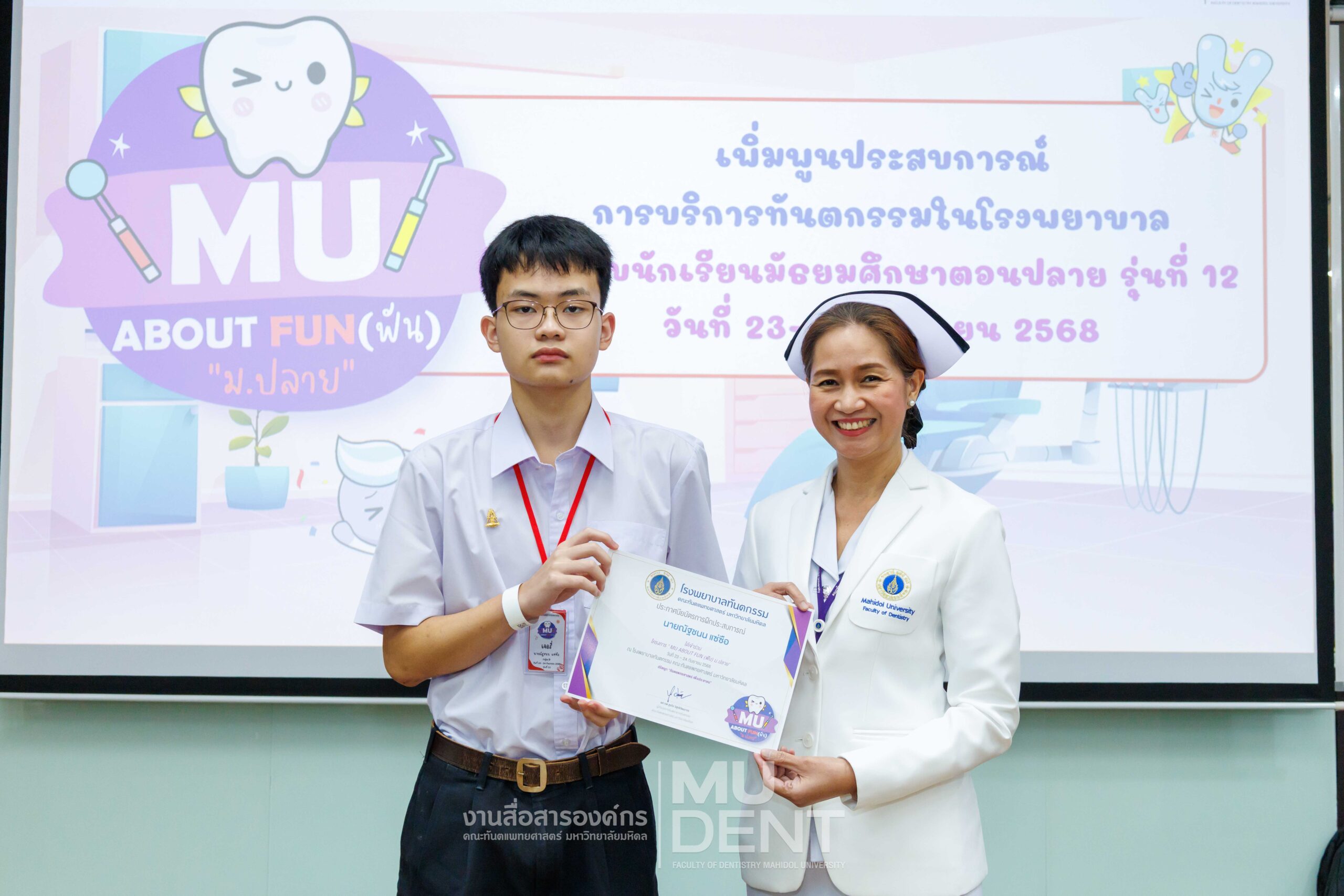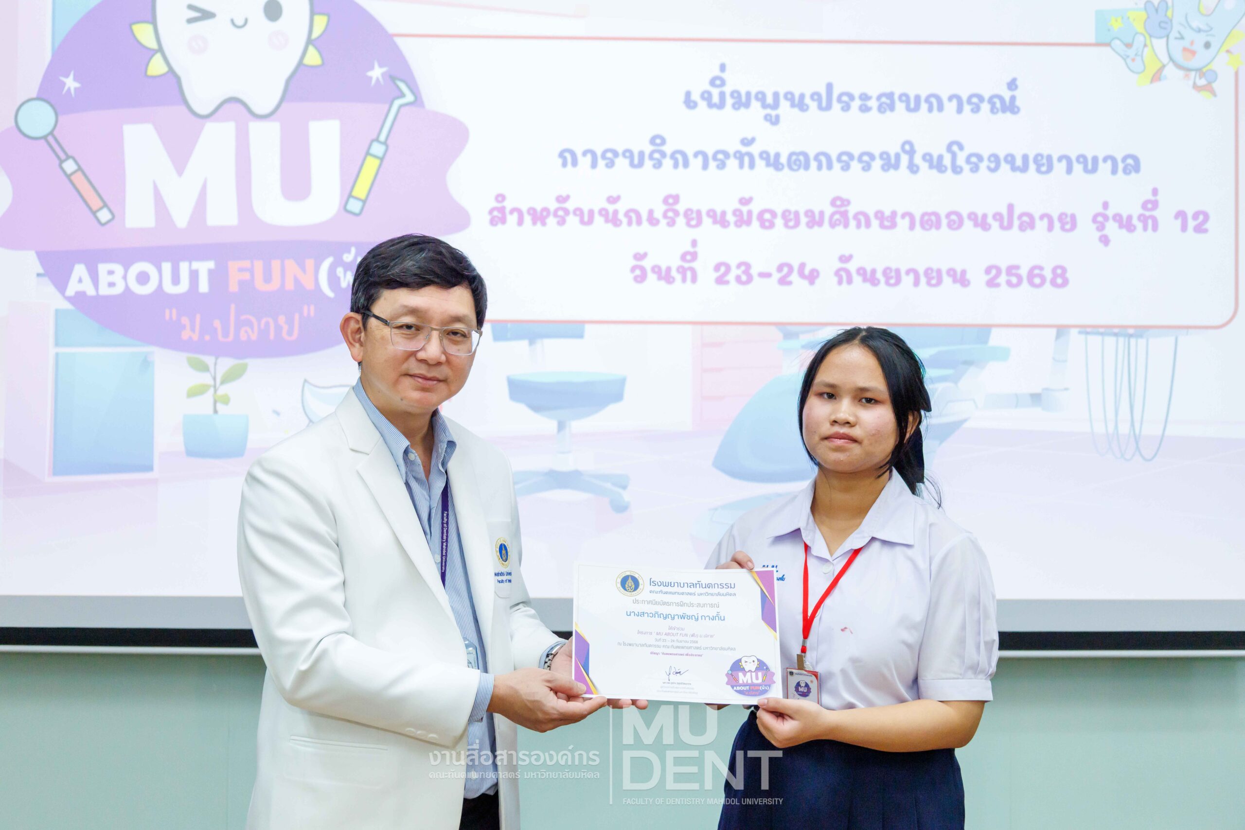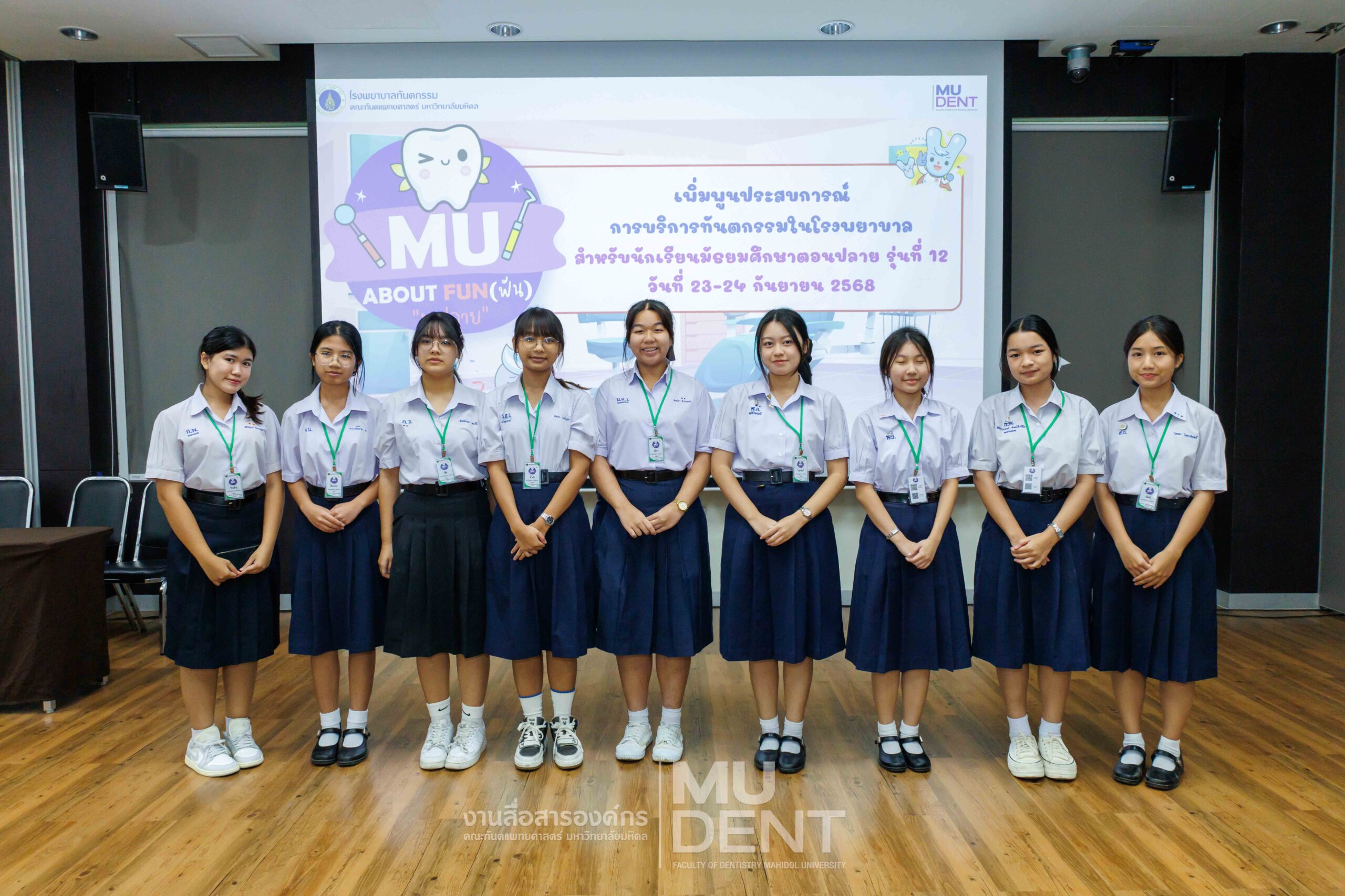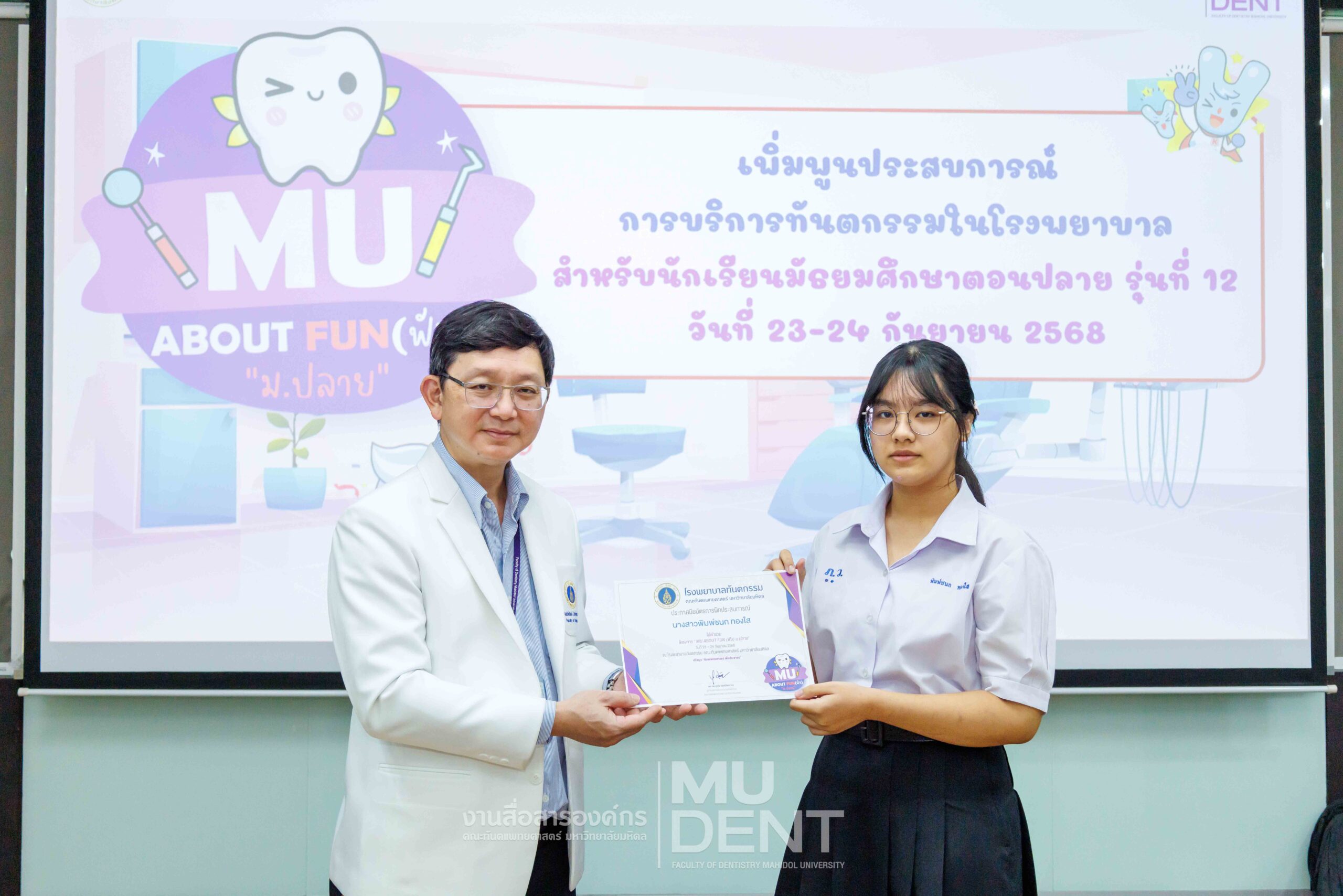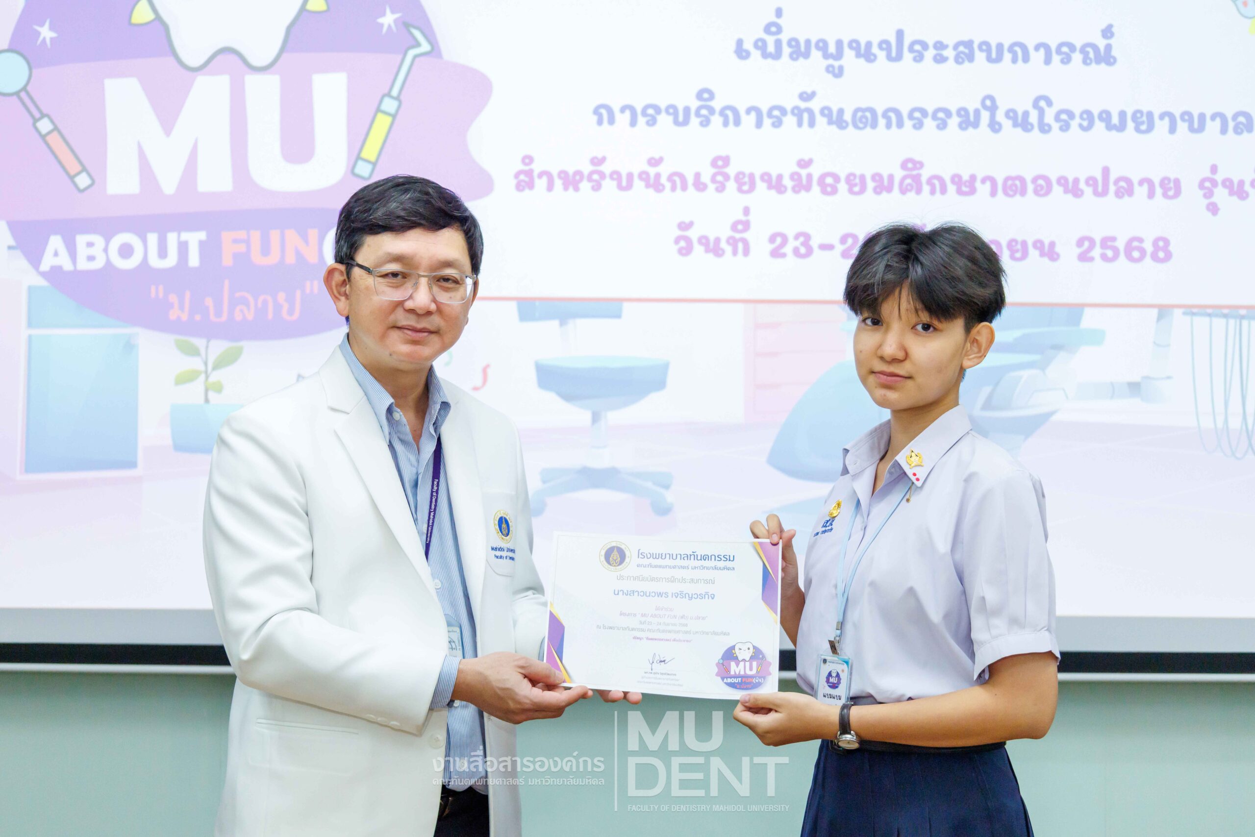 เมื่อวันที่ 23 กันยายน 2568 ผู้ช่วยศาสตราจารย์ ทันตแพทย์สุรกิจ วิสุทธิวัฒนากร ผู้อำนวยการโรงพยาบาลทันตกรรม คณะทันตแพทยศาสตร์ มหาวิทยาลัยมหิดล ให้เกียรติเป็นประธานในพิธีเปิดโครงการ “MU ABOUT FUN (ฟัน)” สำหรับนักเรียนมัธยมศึกษาตอนปลาย รุ่นที่ 12 ปีงบประมาณ 2568 โดยมีหัวหน้าคลินิก หัวหน้าศูนย์ หัวหน้าหน่วย เข้าร่วมเป็นเกียรติ ณ ห้องประชุม 304 -305 ชั้น 3 อาคารเฉลิมพระเกียรติ 50 พรรษา ซึ่งโครงการดังกล่าว มีนักเรียนมัธยมศึกษาตอนปลายเข้าร่วมโครงการฯ จำนวน 50 ราย จัดขึ้นระหว่างวันที่ 23 – 24 กันยายน 2568 เป็นการแบ่งกลุ่มนักเรียนที่เข้าร่วมโครงการฯ ให้เข้ารับการฝึกปฏิบัติตามฐานกิจกรรม ภายในคลินิกทันตกรรม ของโรงพยาบาลทันตกรรม คณะทันตแพทยศาสตร์ มหาวิทยาลัยมหิดล จำนวน 6 ฐาน ได้แก่ คลินิกศัลยกรรมช่องปากและใบหน้าขากรรไกร คลินิกรังสีวิทยาช่องปากและใบหน้าขากรรไกร คลินิกประดิษฐ์ใบหน้าขากรรไกร คลินิกทันตกรรมจัดฟัน คลินิกวิทยาเอ็นโดดอนต์ และศูนย์ส่งเสริมและพัฒนาคุณภาพชีวิตผู้สูงอายุ โดยเมื่อวันที่ 24 กันยายน 2568 ผู้ช่วยศาสตราจารย์ ทันตแพทย์สุรกิจ วิสุทธิวัฒนากร ผู้อำนวยการโรงพยาบาลทันตกรรม คณะทันตแพทยศาสตร์ มหาวิทยาลัยมหิดล ให้เกียรติเป็นประธานในพิธีปิด และมอบประกาศนียบัตรแก่นักเรียนที่เข้าร่วมโครงการฯ ณ ห้องประชุม 304 – 305 ชั้น 3 อาคารเฉลิมพระเกียรติ 50 พรรษา คณะทันตแพทยศาสตร์ มหาวิทยาลัยมหิดล
