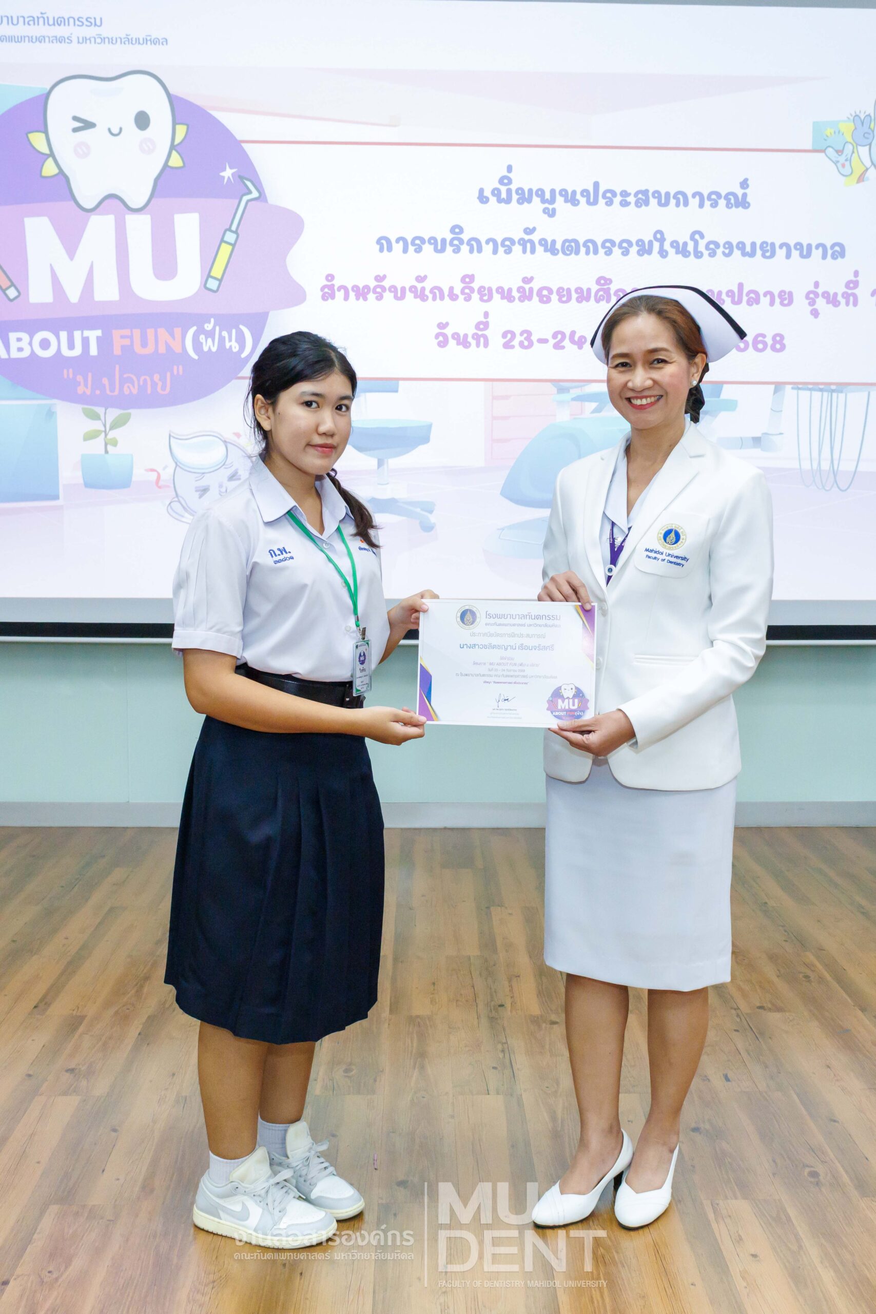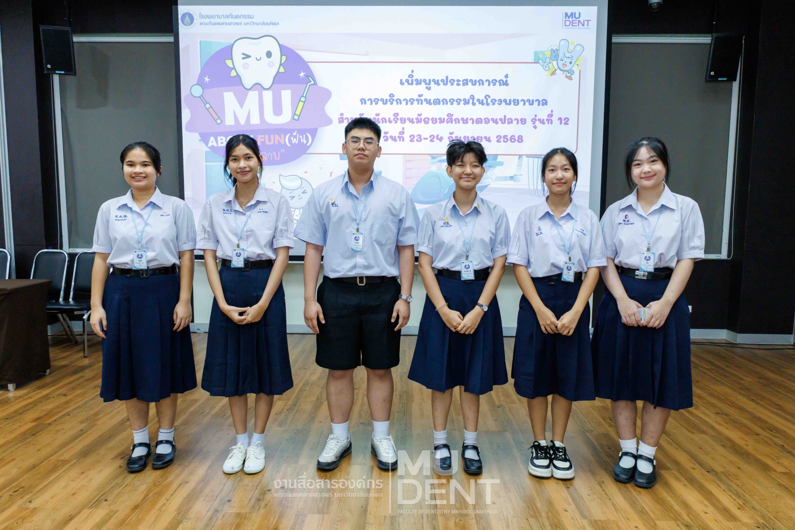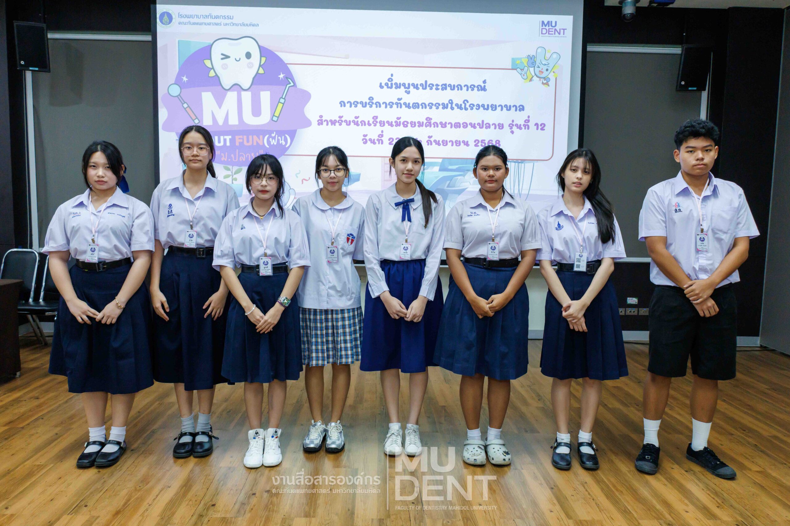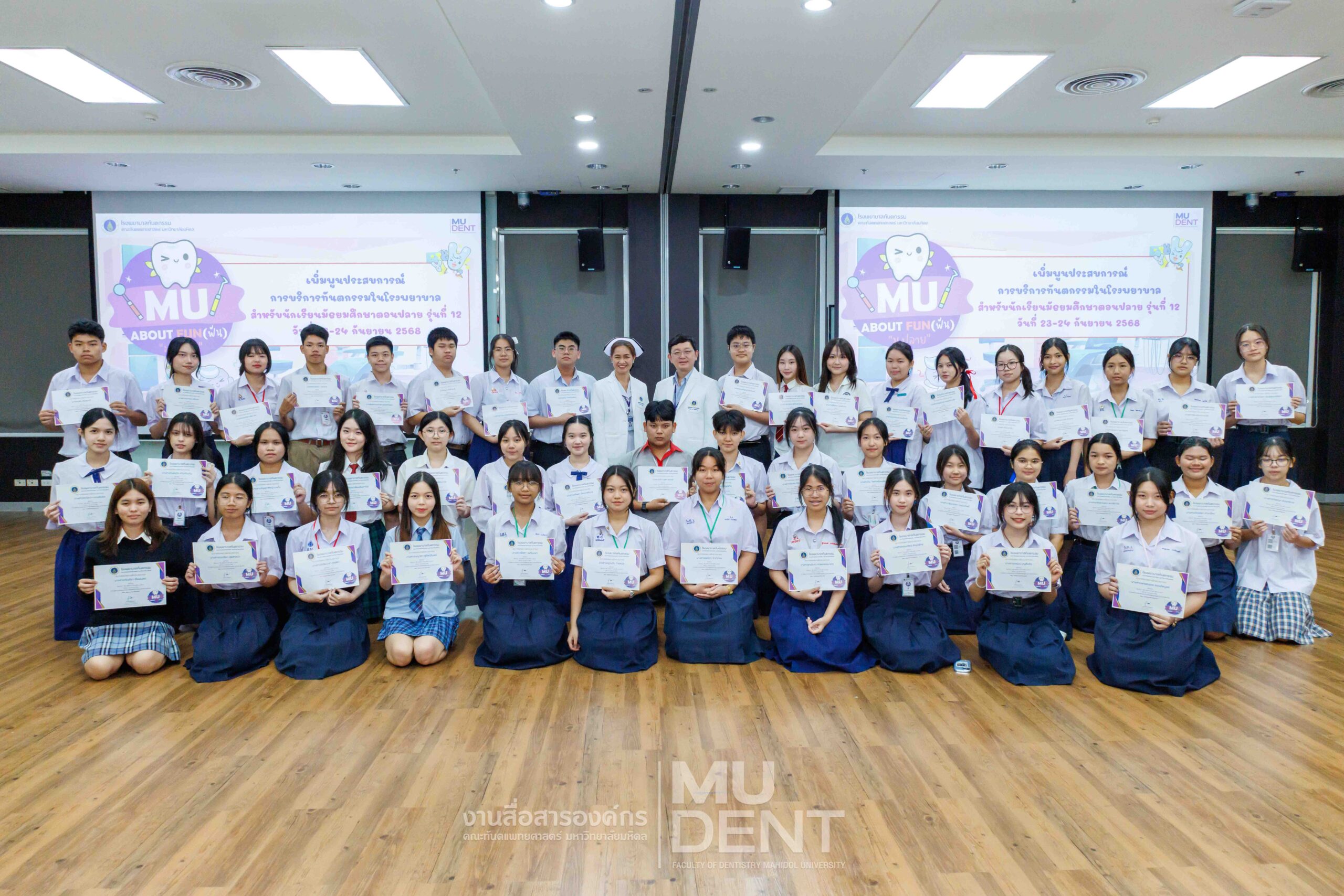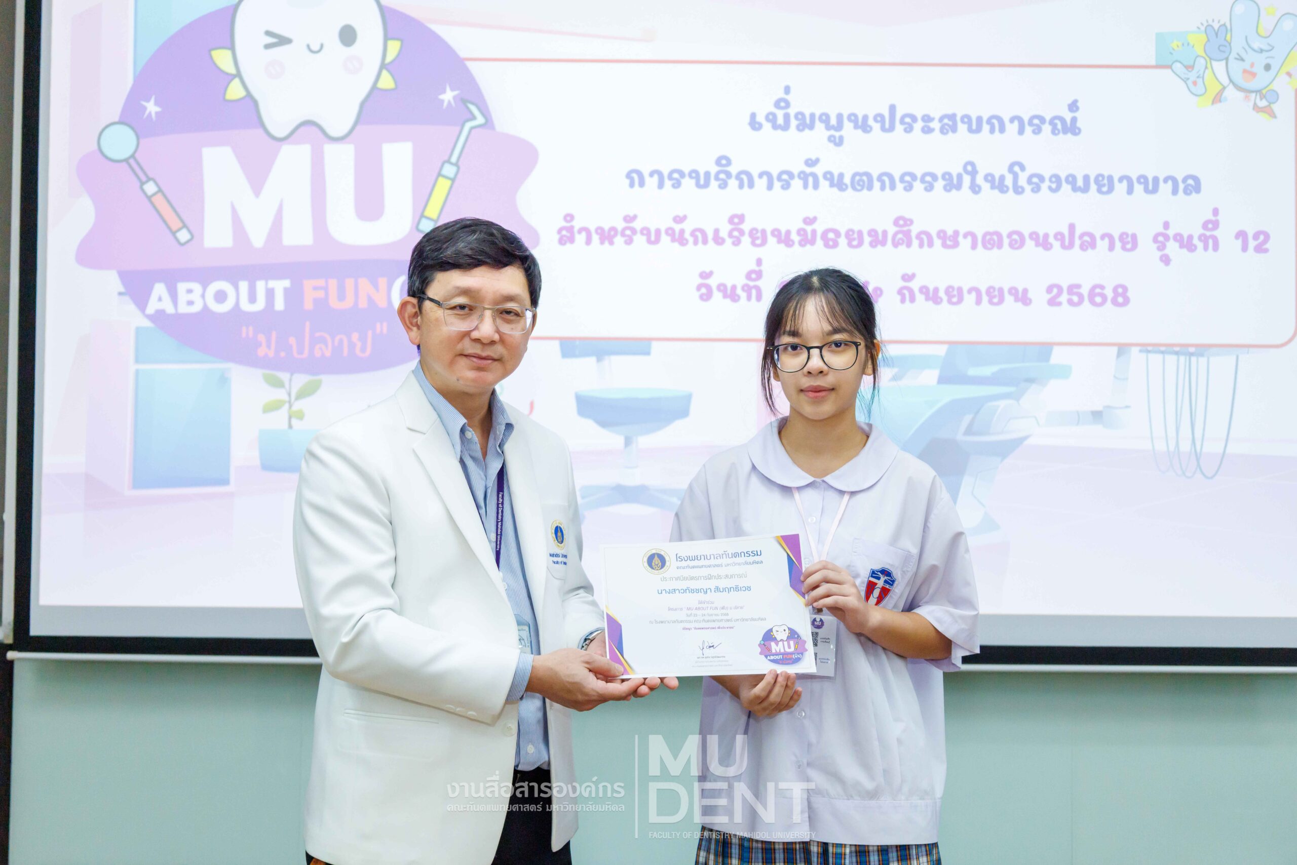 เมื่อวันที่ 23 กันยายน 2568 ผู้ช่วยศาสตราจารย์ ทันตแพทย์สุรกิจ วิสุทธิวัฒนากร ผู้อำนวยการโรงพยาบาลทันตกรรม คณะทันตแพทยศาสตร์ มหาวิทยาลัยมหิดล ให้เกียรติเป็นประธานในพิธีเปิดโครงการ “MU ABOUT FUN (ฟัน)” สำหรับนักเรียนมัธยมศึกษาตอนปลาย รุ่นที่ 12 ปีงบประมาณ 2568 โดยมีหัวหน้าคลินิก หัวหน้าศูนย์ หัวหน้าหน่วย เข้าร่วมเป็นเกียรติ ณ ห้องประชุม 304 -305 ชั้น 3 อาคารเฉลิมพระเกียรติ 50 พรรษา ซึ่งโครงการดังกล่าว มีนักเรียนมัธยมศึกษาตอนปลายเข้าร่วมโครงการฯ จำนวน 50 ราย จัดขึ้นระหว่างวันที่ 23 – 24 กันยายน 2568 เป็นการแบ่งกลุ่มนักเรียนที่เข้าร่วมโครงการฯ ให้เข้ารับการฝึกปฏิบัติตามฐานกิจกรรม ภายในคลินิกทันตกรรม ของโรงพยาบาลทันตกรรม คณะทันตแพทยศาสตร์ มหาวิทยาลัยมหิดล จำนวน 6 ฐาน ได้แก่ คลินิกศัลยกรรมช่องปากและใบหน้าขากรรไกร คลินิกรังสีวิทยาช่องปากและใบหน้าขากรรไกร คลินิกประดิษฐ์ใบหน้าขากรรไกร คลินิกทันตกรรมจัดฟัน คลินิกวิทยาเอ็นโดดอนต์ และศูนย์ส่งเสริมและพัฒนาคุณภาพชีวิตผู้สูงอายุ โดยเมื่อวันที่ 24 กันยายน 2568 ผู้ช่วยศาสตราจารย์ ทันตแพทย์สุรกิจ วิสุทธิวัฒนากร ผู้อำนวยการโรงพยาบาลทันตกรรม คณะทันตแพทยศาสตร์ มหาวิทยาลัยมหิดล ให้เกียรติเป็นประธานในพิธีปิด และมอบประกาศนียบัตรแก่นักเรียนที่เข้าร่วมโครงการฯ ณ ห้องประชุม 304 – 305 ชั้น 3 อาคารเฉลิมพระเกียรติ 50 พรรษา คณะทันตแพทยศาสตร์ มหาวิทยาลัยมหิดล