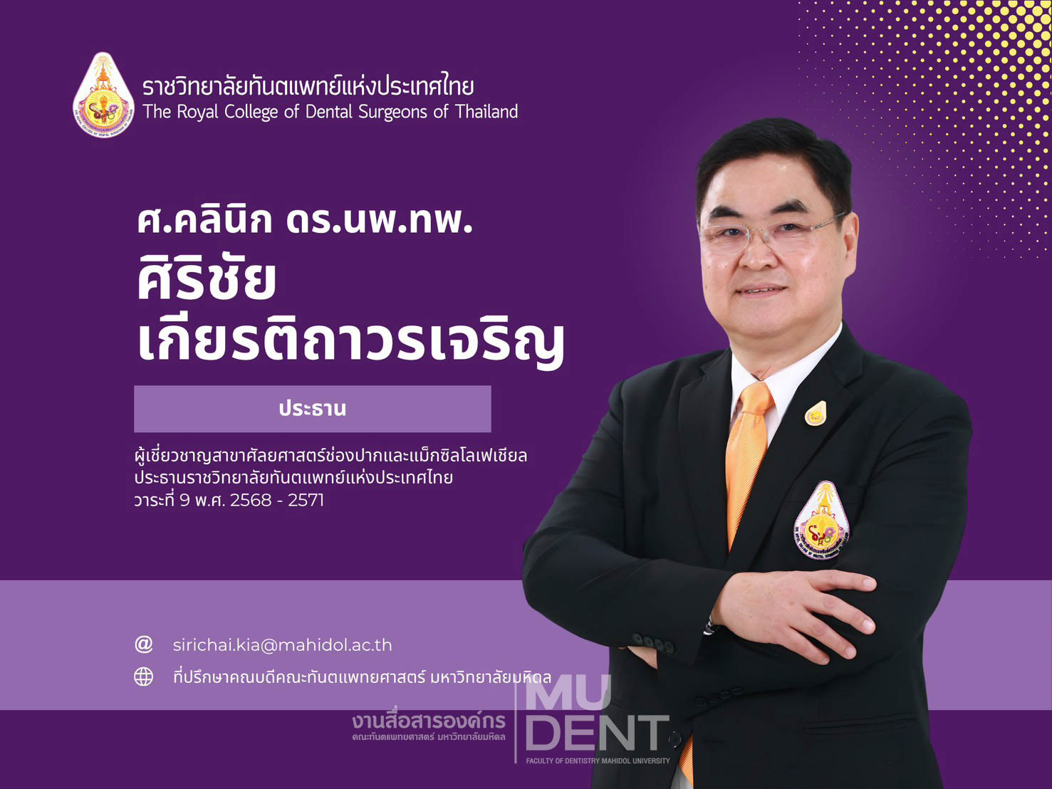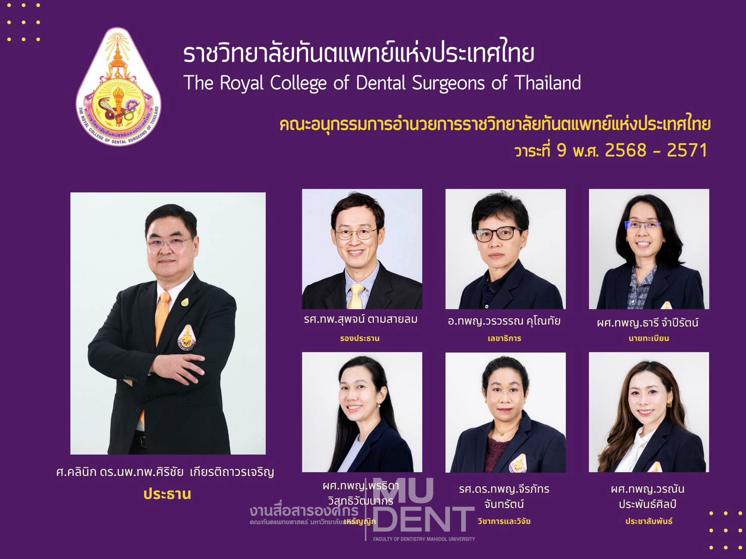 เมื่อวันที่ 19 พฤศจิกายน 2568 ศาสตราจารย์คลินิก ดร. นายแพทย์ ทันตแพทย์ศิริชัย เกียรติถาวรเจริญ ที่ปรึกษาคณบดี และอดีตคณบดีคณะทันตแพทยศาสตร์ มหาวิทยาลัยมหิดล ได้เข้ารับมอบงานในตำแหน่ง ประธานราชวิทยาลัยทันตแพทย์แห่งประเทศไทย วาระที่ 9 (พ.ศ. 2568 – 2571) อย่างเป็นทางการ จาก รองศาสตราจารย์ ดร. ทันตแพทย์ไชยรัตน์ เฉลิมรัตนโรจน์ ประธานราชวิทยาลัยทันตแพทย์แห่งประเทศไทย วาระที่ 8 (พ.ศ. 2565 – 2568) โดยมีคณะอนุกรรมการอำนวยการราชวิทยาลัยฯ ชุดใหม่ เข้ารับมอบภารกิจ และจะเริ่มปฏิบัติหน้าที่อย่างเป็นทางการตั้งแต่วันที่ 26 พฤศจิกายน 2568 เป็นต้นไป
