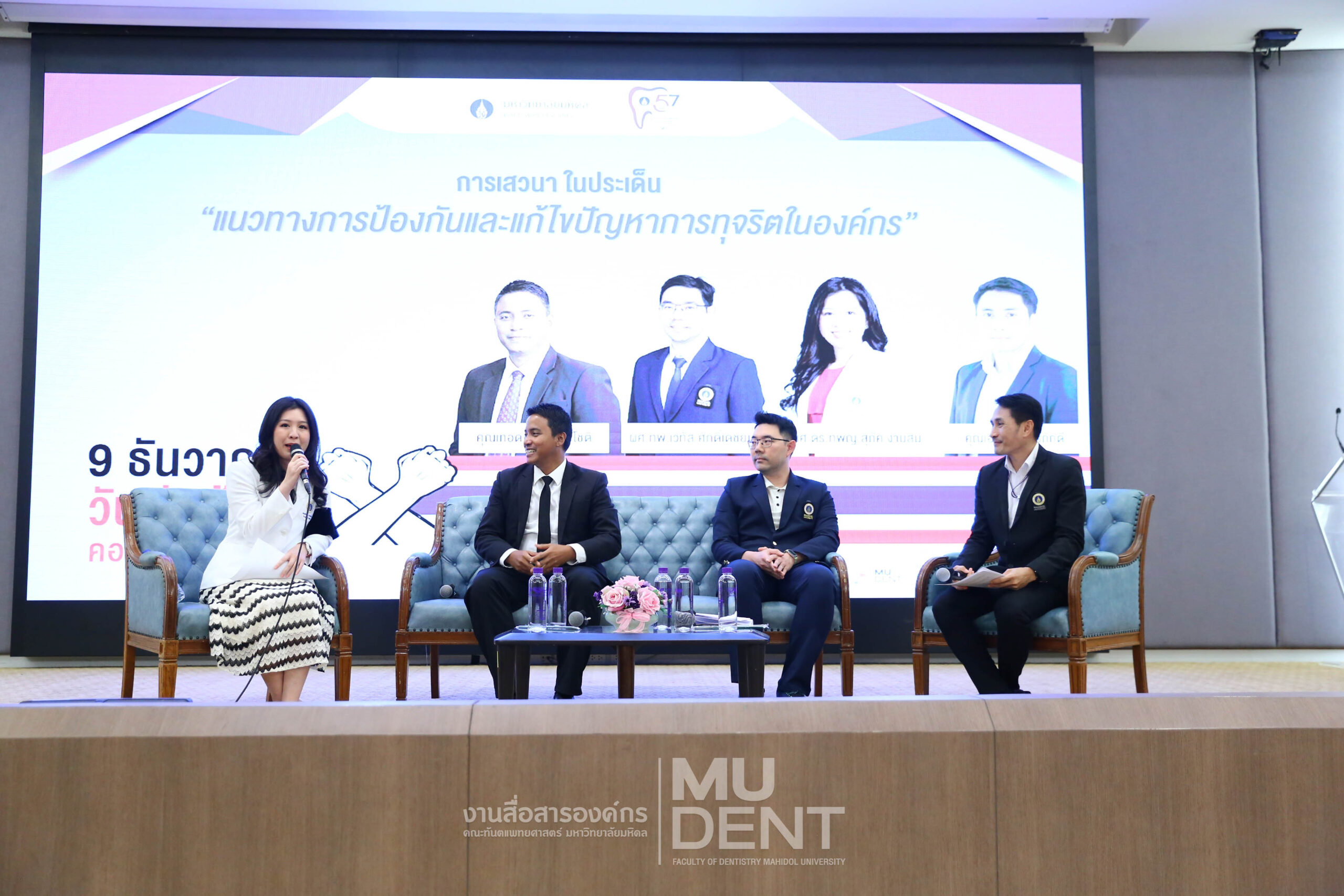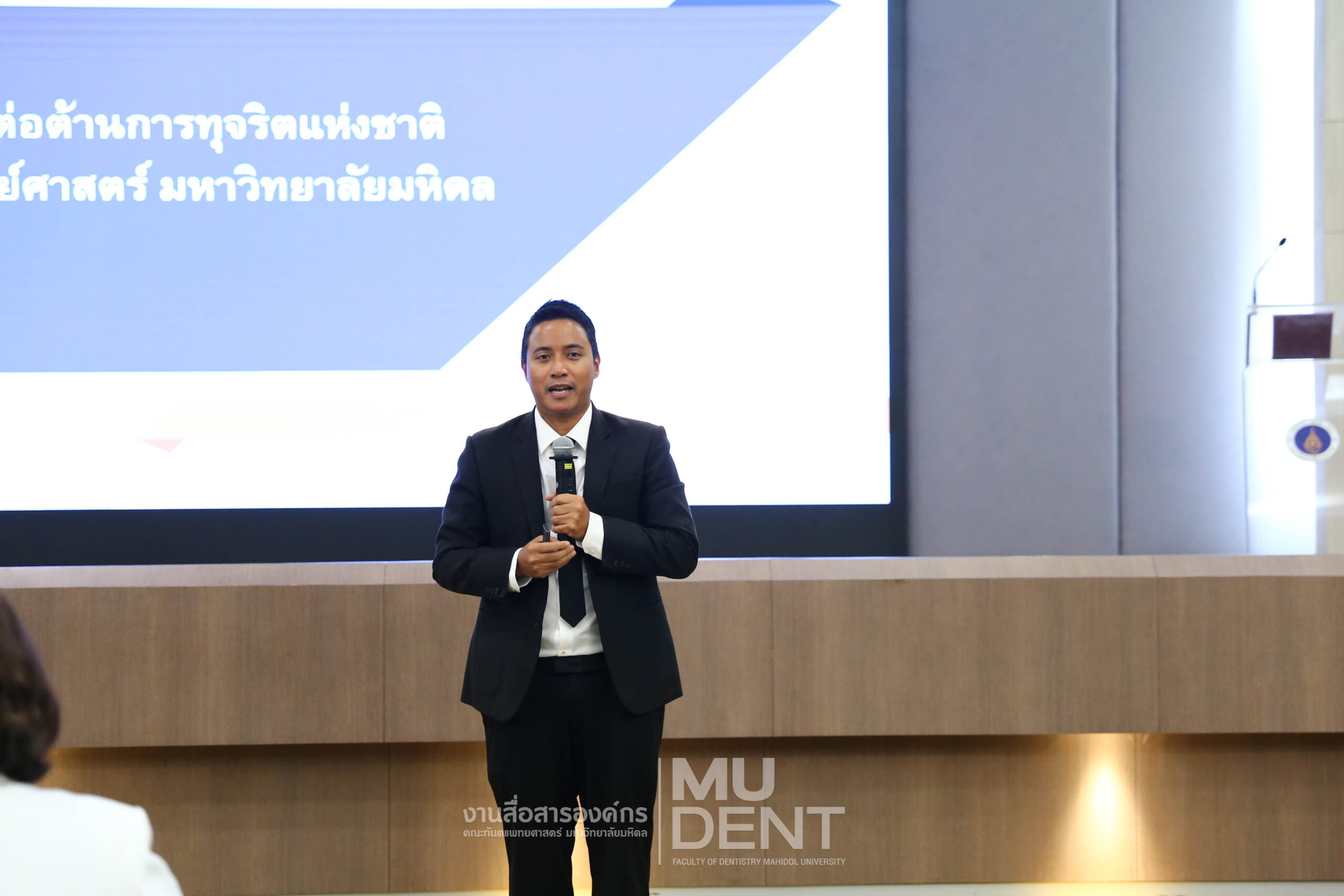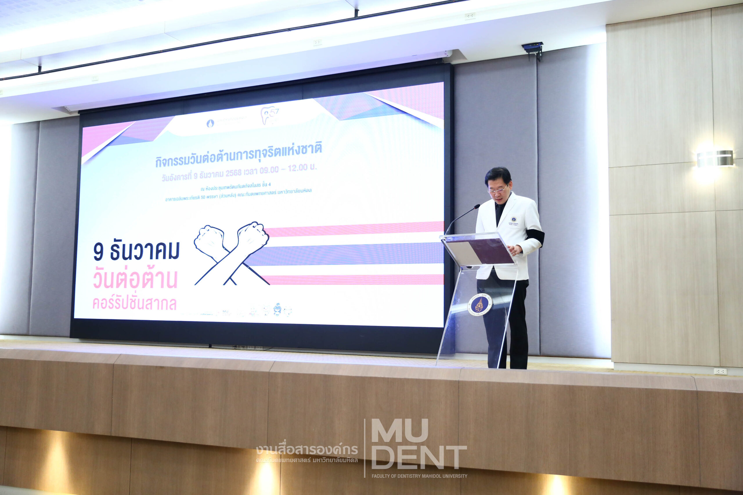 เมื่อวันที่ 9 ธันวาคม 2568 เนื่องในวันต่อต้านคอร์รัปชันสากล คณะทันตแพทยศาสตร์ มหาวิทยาลัยมหิดล จัดโครงการ “กิจกรรมวันต่อต้านการทุจริตแห่งชาติ” เพื่อประกาศเจตจำนงสุจริตของผู้บริหาร คณาจารย์ และบุคลากรในการยึดมั่นความโปร่งใสและต่อต้านการทุจริตทุกรูปแบบ โดยกิจกรรมจัดขึ้นโดยหน่วยกฎหมาย ณ ห้องประชุมเทพรัตนทันตกิจสโมสร ชั้น 4 อาคารเฉลิมพระเกียรติ 50 พรรษา คณะทันตแพทยศาสตร์ มหาวิทยาลัยมหิดล
