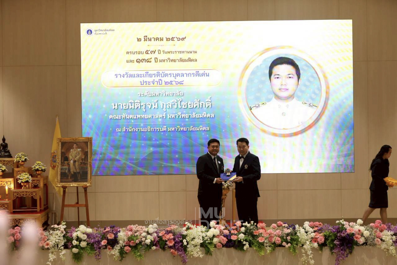 เมื่อวันที่ 2 มีนาคม 2569 รองศาสตราจารย์ ทันตแพทย์บัณฑิต จิรจริยาเวช คณบดีคณะทันตแพทยศาสตร์ มหาวิทยาลัยมหิดล ร่วมแสดงความยินดีแก่ผู้บริหารและบุคลากรของคณะฯ ที่ได้รับ รางวัลมหิดลทยากร รางวัลบุคลากรดีเด่นระดับมหาวิทยาลัยมหิดล และระดับคณะฯ ประจำปี พ.ศ. 2568 และผู้ได้รับรางวัลผู้มีผลงานการประดิษฐ์ที่ได้รับสิทธิบัตร / อนุสิทธิบัตร ในงานครบรอบ 57 ปี วันพระราชทานนาม 138 ปี มหาวิทยาลัยมหิดล ณ หอประชุมมหิดลสิทธาคาร ศาลายา