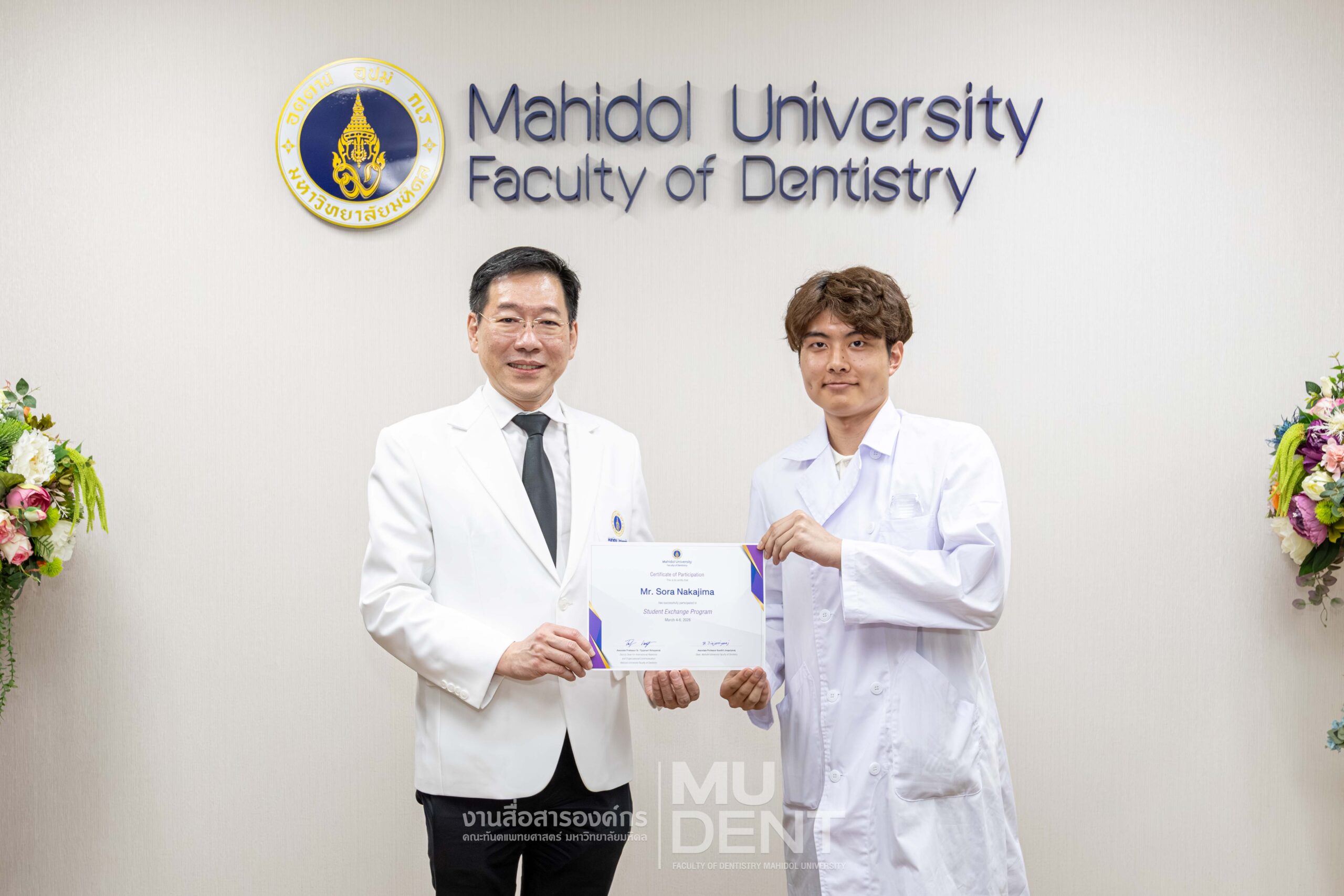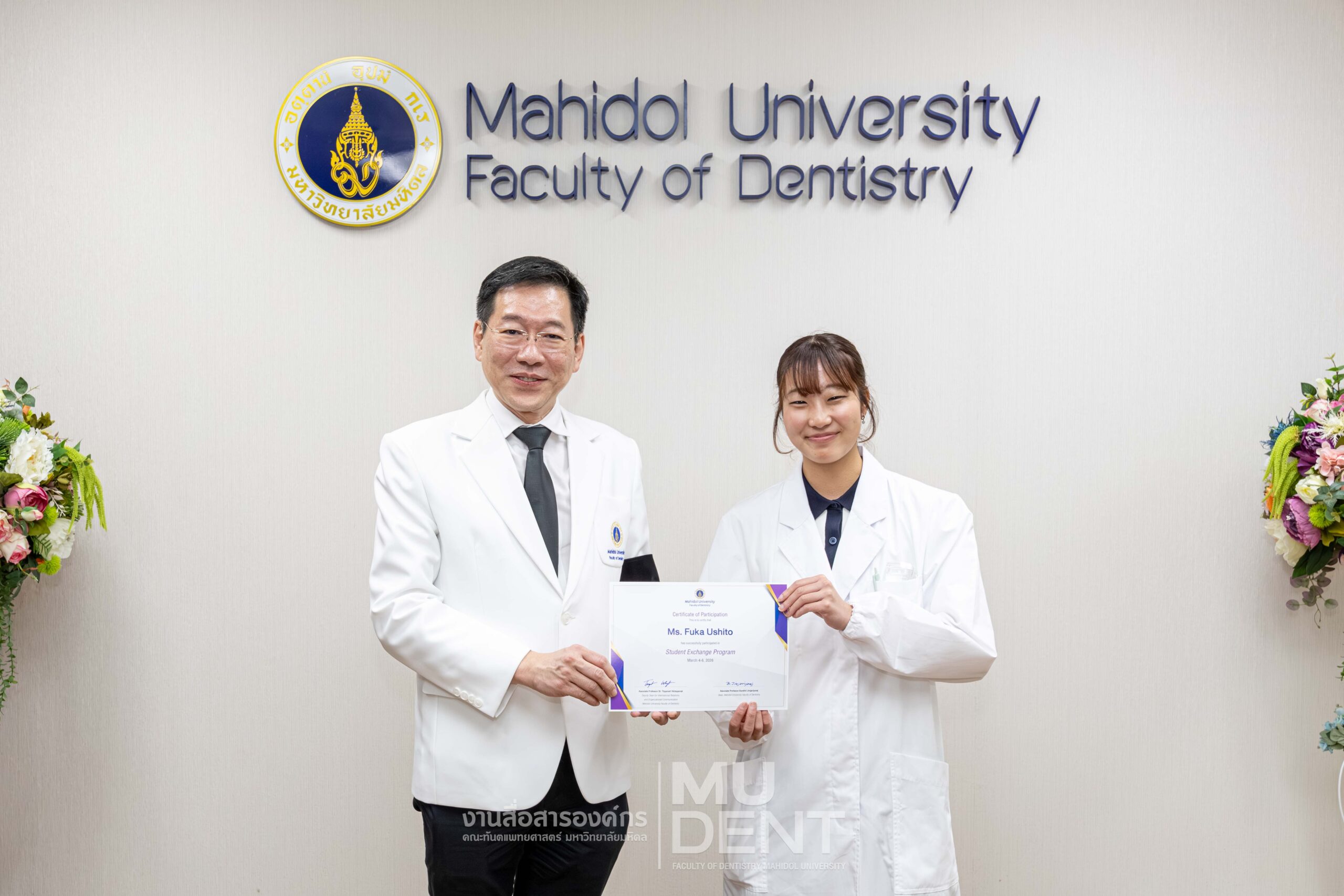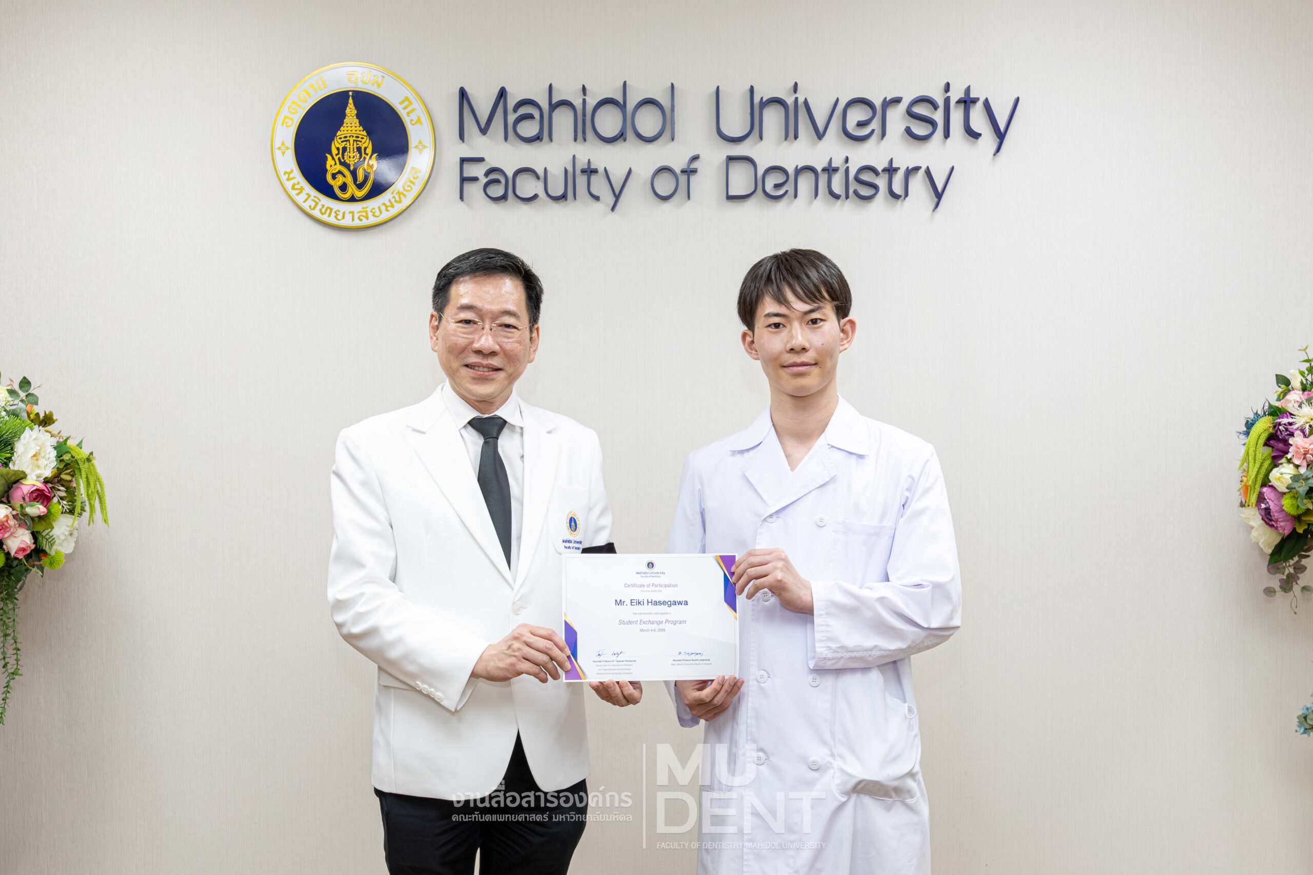 ในโอกาสนี้ รองศาสตราจารย์ ทันตแพทย์บัณฑิต จิรจริยาเวช คณบดี คณะทันตแพทยศาสตร์ มหาวิทยาลัยมหิดล ได้ให้เกียรติมอบใบประกาศนียบัตรแก่นักศึกษา สำหรับการเข้าศึกษาดูงานดังกล่าว ซึ่งเป็นไปตามบันทึกข้อตกลงความร่วมมือทางวิชาการด้านการแลกเปลี่ยนนักศึกษาระหว่างสองสถาบัน อันสะท้อนถึงความสัมพันธ์อันแน่นแฟ้นและการส่งเสริมความเป็นนานาชาติทางการศึกษาด้านทันตแพทยศาสตร์อย่างต่อเนื่อง