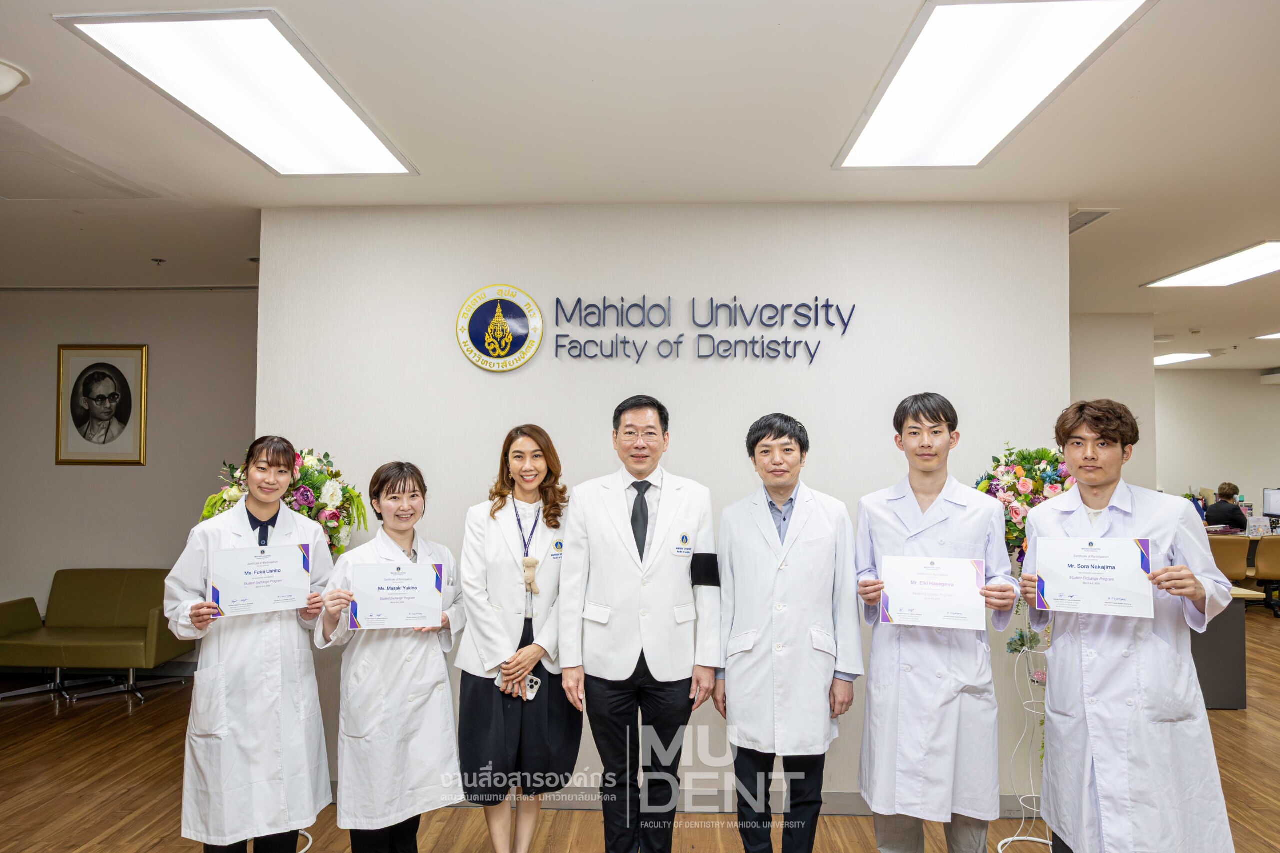 เมื่อวันที่ 4 มีนาคม 2569 คณะทันตแพทยศาสตร์ มหาวิทยาลัยมหิดล ให้การต้อนรับ Ms. Yukino MASAKI (ชั้นปีที่ 3), Mr. Eiki HASEGAWA (ชั้นปีที่ 1), Mr. Sora NAKAJIMA (ชั้นปีที่ 1) และ Ms. Fuka USHITO (ชั้นปีที่ 1) นักศึกษาทันตแพทย์จาก Faculty of Dentistry, Niigata University ประเทศญี่ปุ่น ที่เข้าศึกษาดูงานทางทันตกรรมและร่วมสังเกตการณ์ทางคลินิก ณ โรงพยาบาลทันตกรรม คณะทันตแพทยศาสตร์ มหาวิทยาลัยมหิดล และโรงพยาบาลทันตกรรมมหาจักรีสิรินธร ระหว่างวันที่ 4–6 มีนาคม 2569 โดยมี Dr. Jin MAGARA เป็นอาจารย์ที่ปรึกษาร่วมเดินทางมากับนักศึกษาด้วย