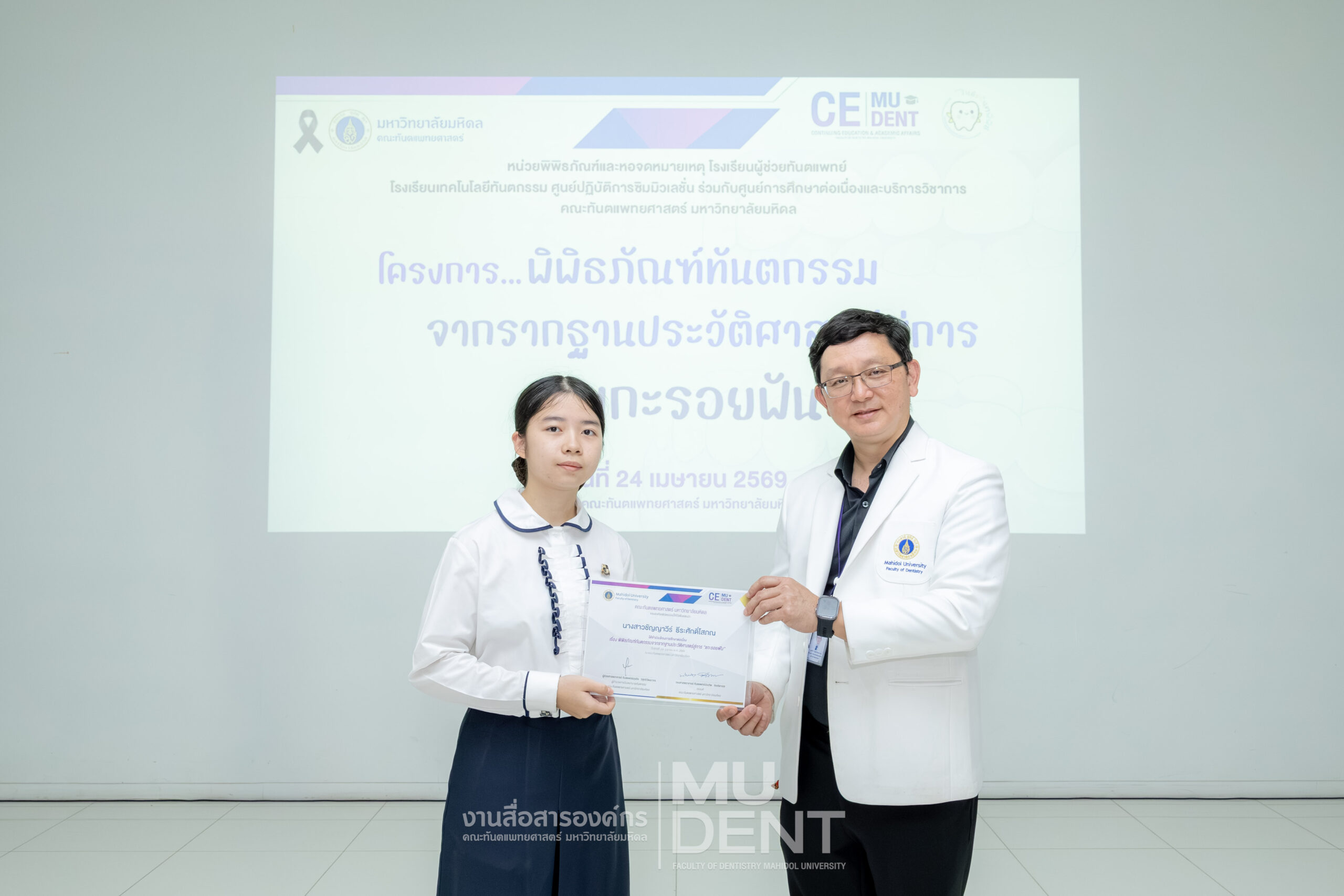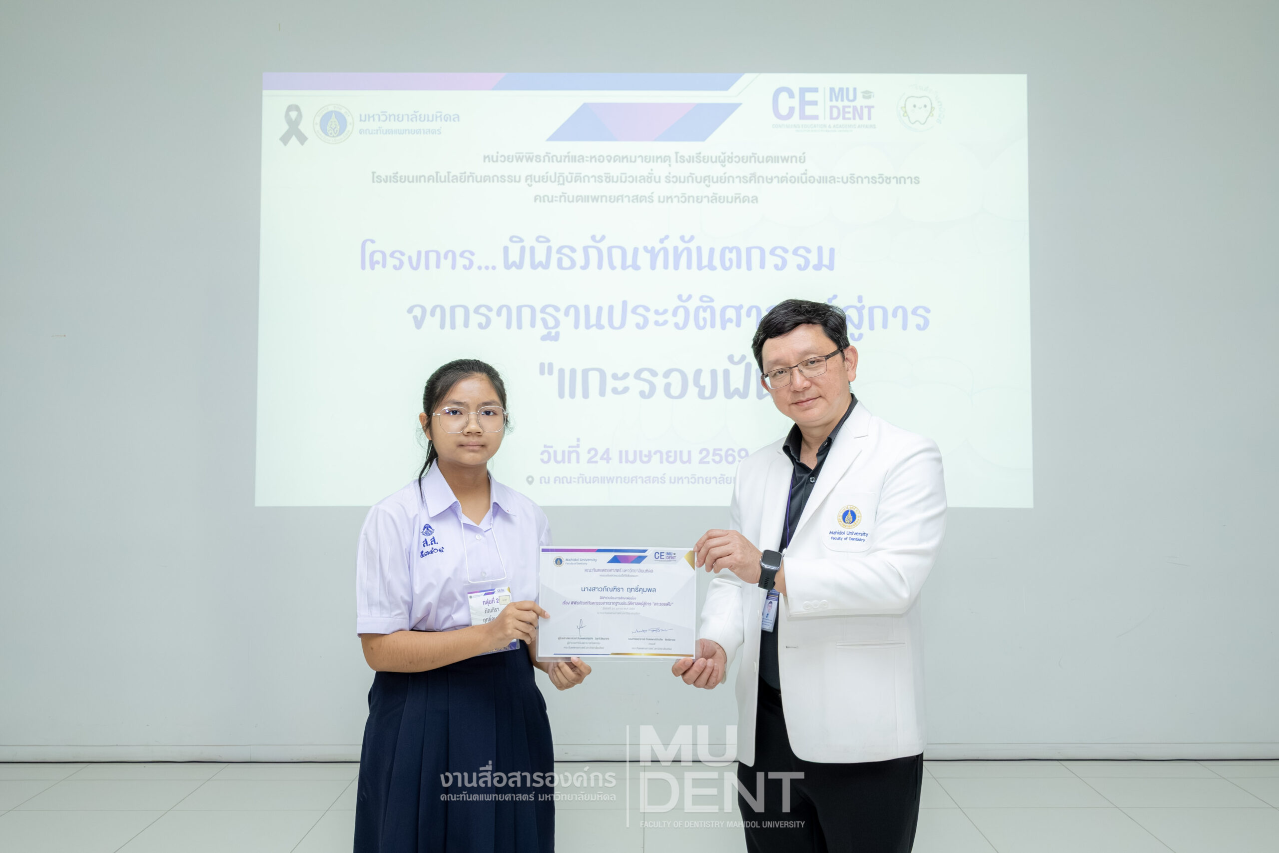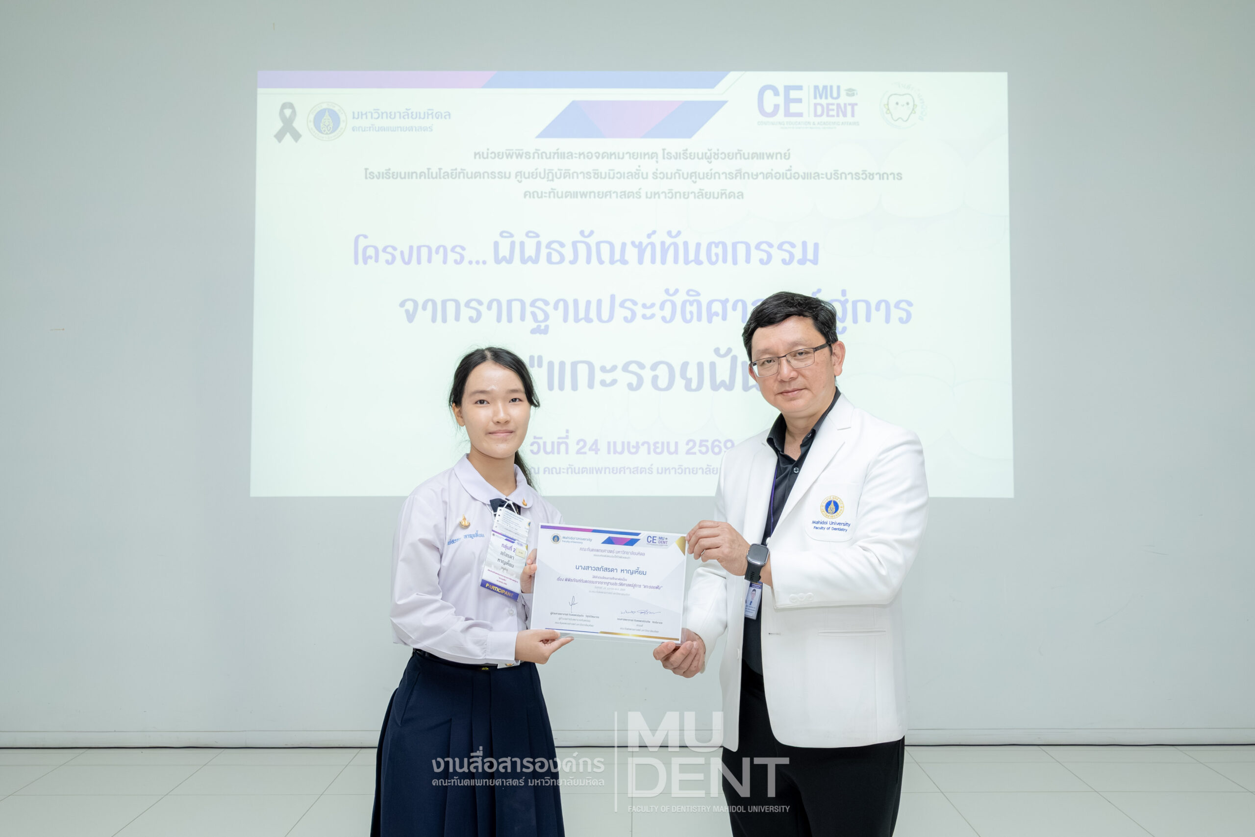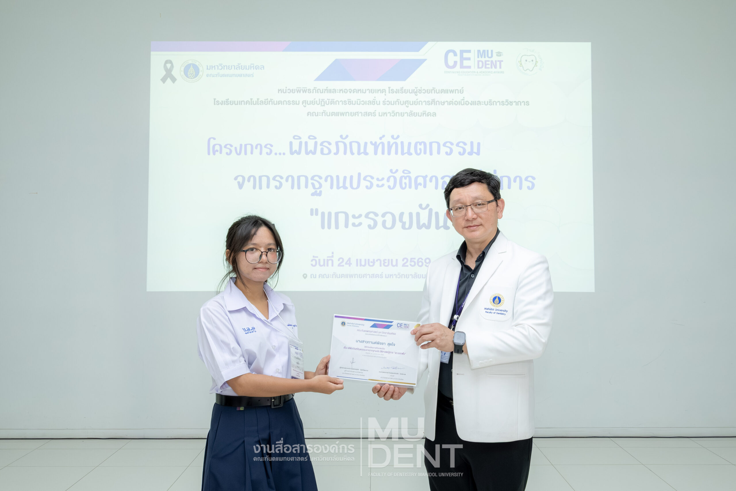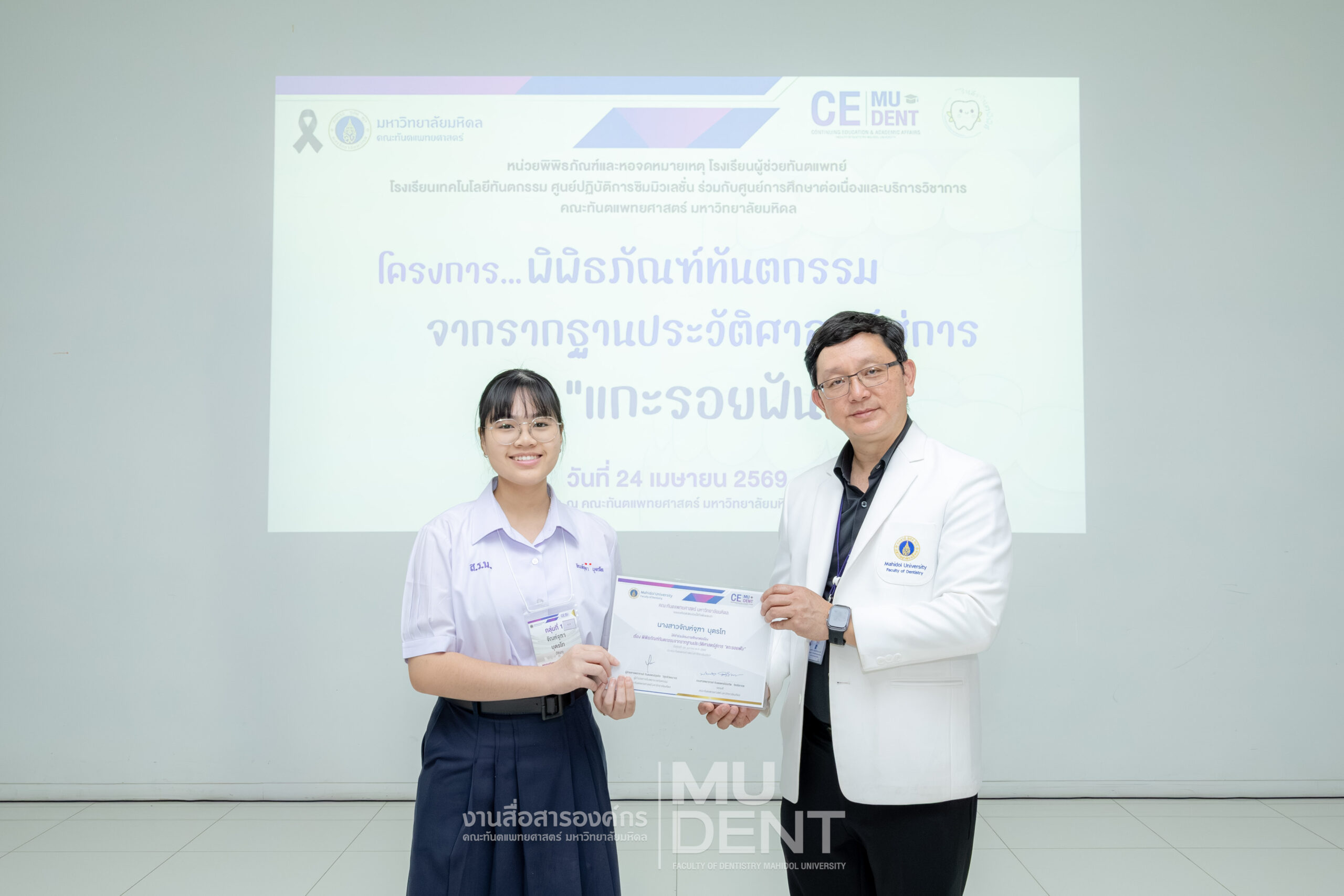 เมื่อวันที่ 24 เมษายน 2569 รองศาสตราจารย์ ทันตแพทย์บัณฑิต จิรจริยาเวช คณบดีคณะทันตแพทยศาสตร์ มหาวิทยาลัยมหิดล ให้เกียรติเป็นประธานในพิธีเปิดโครงการ “พิพิธภัณฑ์ทันตกรรมจากรากฐานประวัติศาสตร์สู่การ ‘แกะรอยฟัน’” สำหรับนักเรียนระดับมัธยมศึกษาตอนปลาย รุ่นที่ 1 ประจำปีงบประมาณ 2569 ณ สิรินธรทันตพิพิธ ชั้น 1 อาคารเฉลิมพระเกียรติ 50 พรรษา คณะทันตแพทยศาสตร์ มหาวิทยาลัยมหิดล