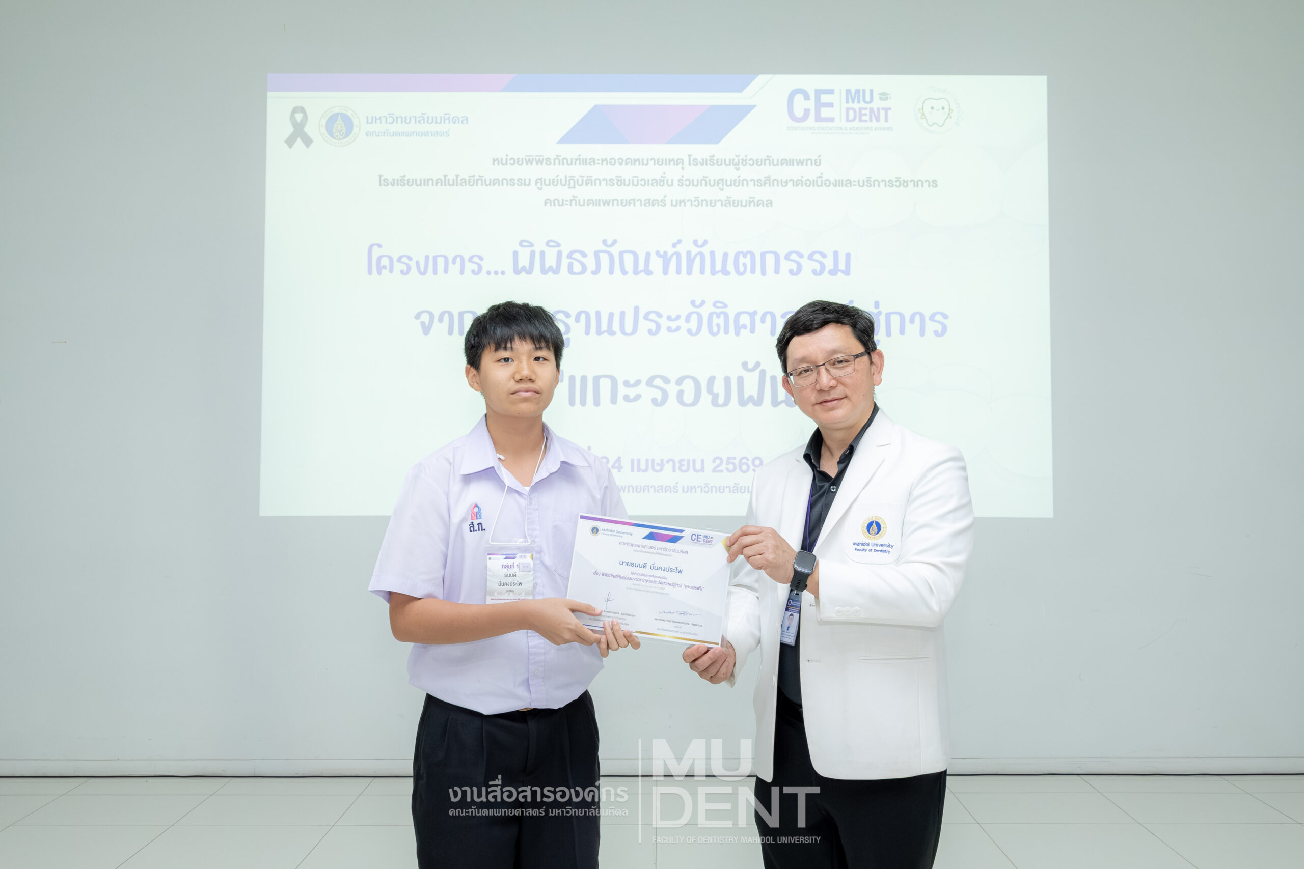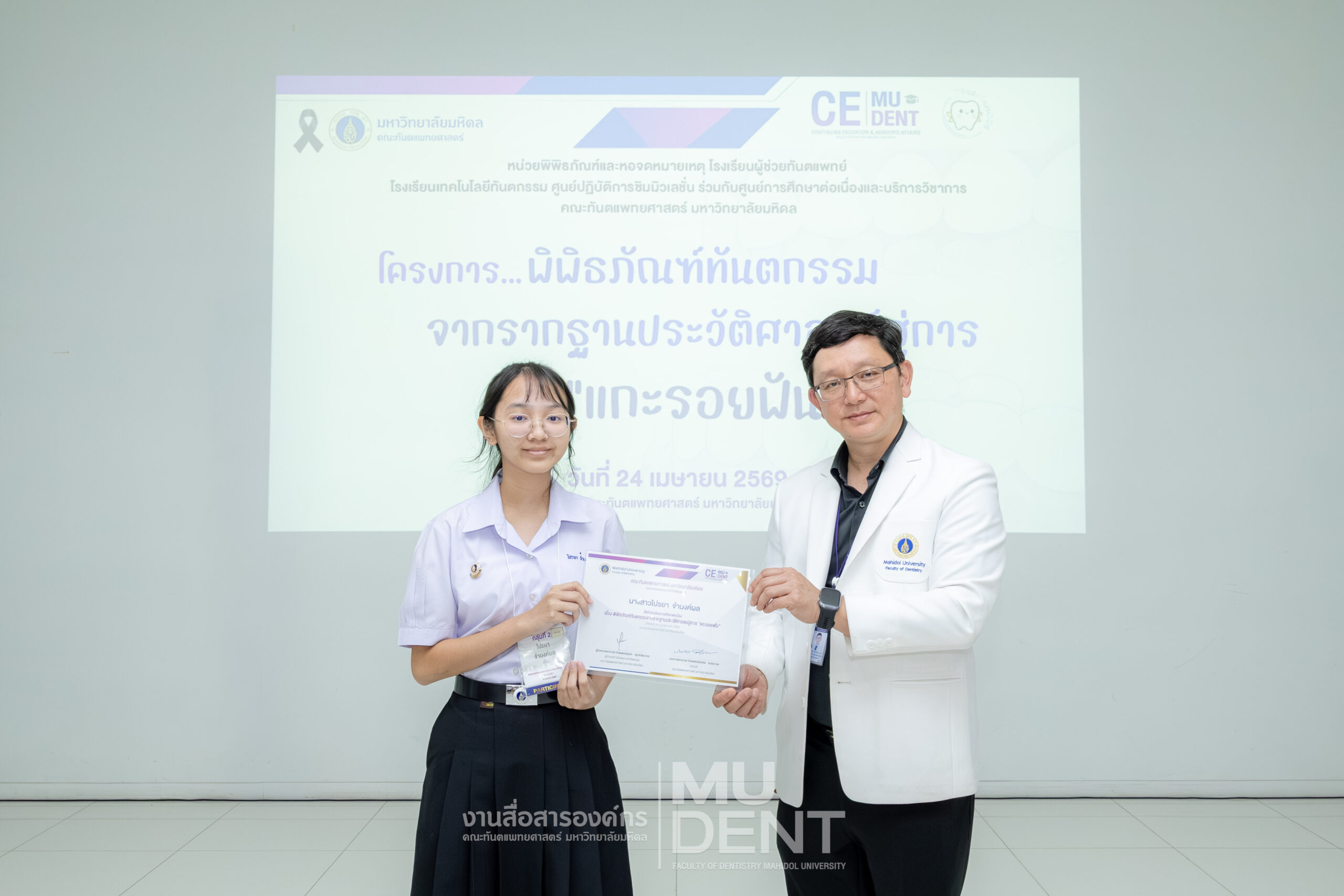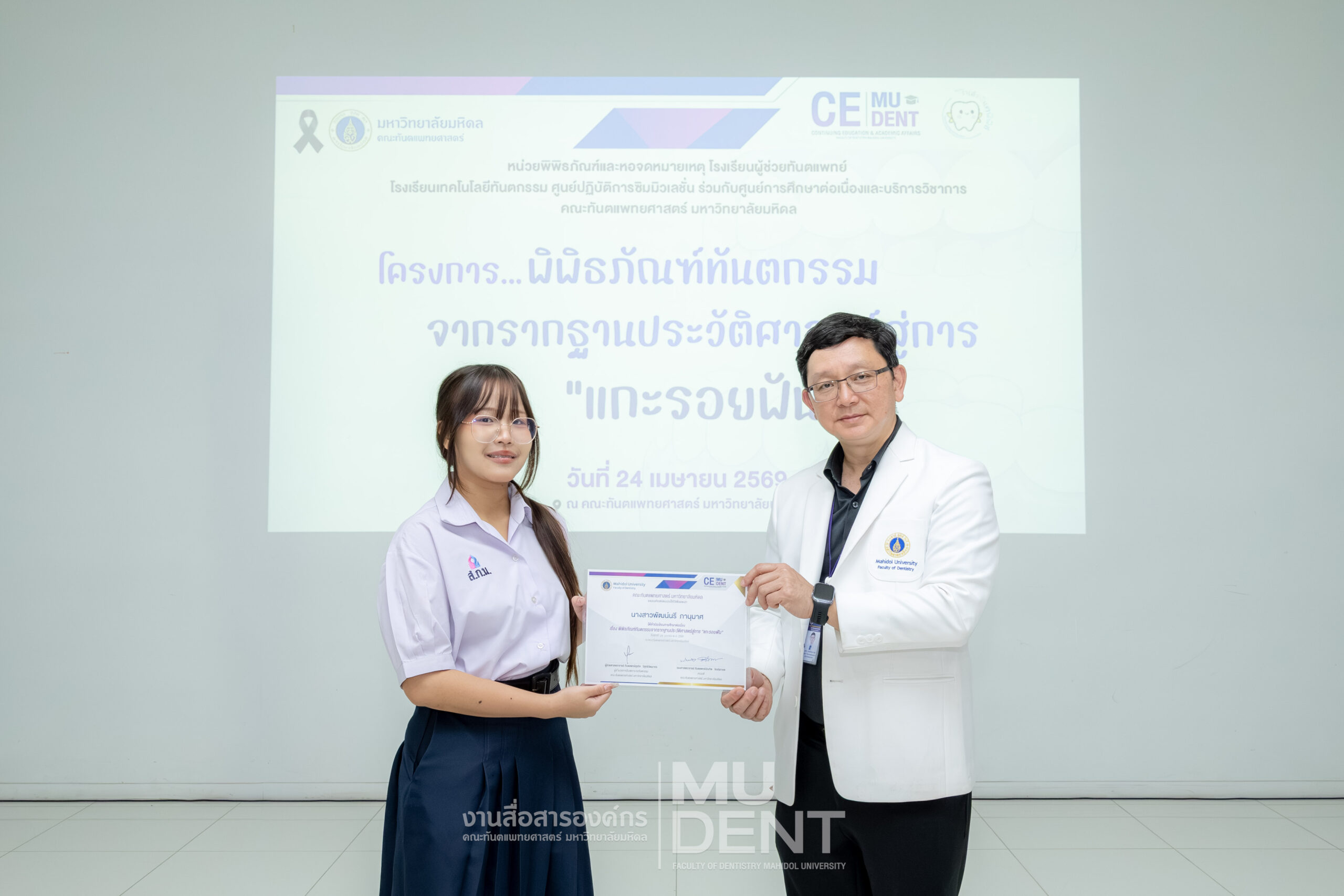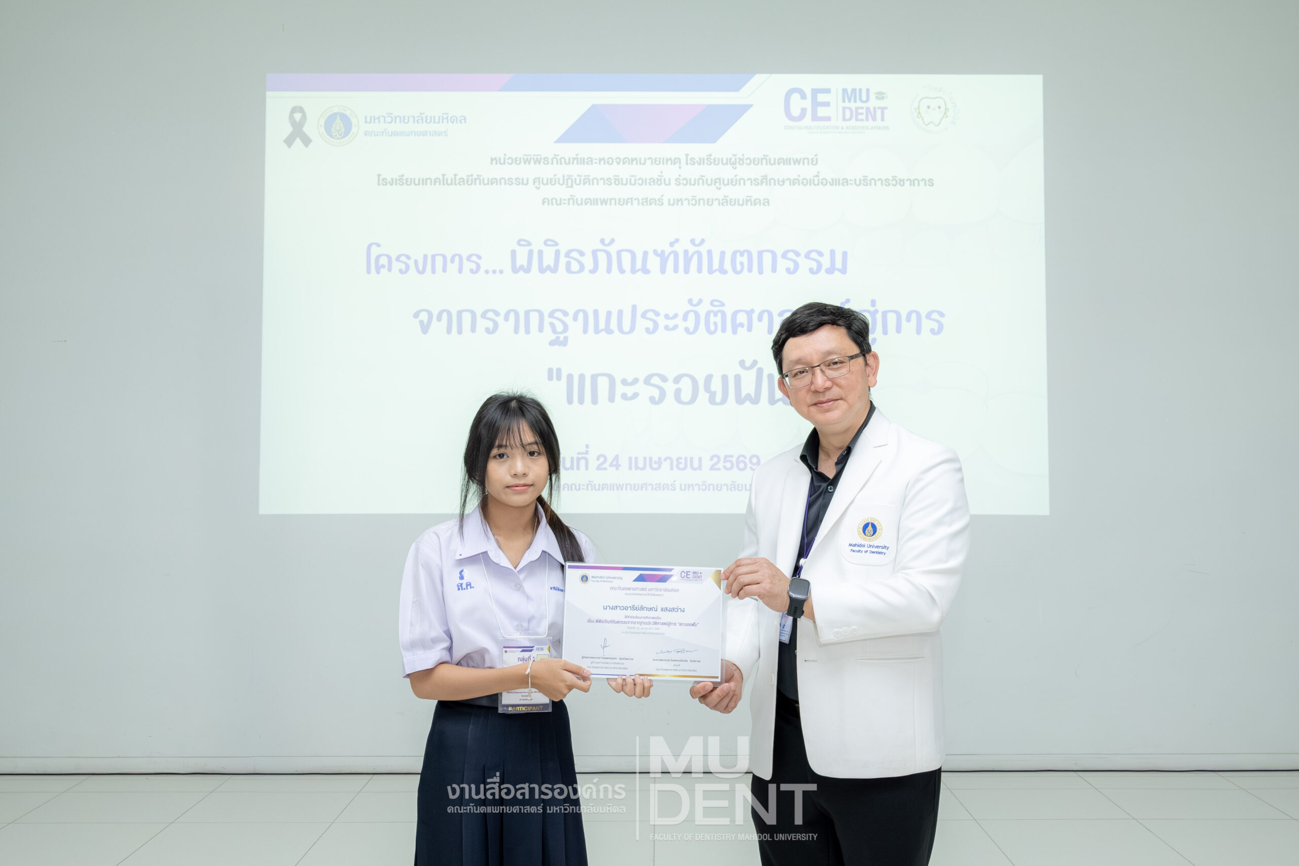 เมื่อวันที่ 24 เมษายน 2569 รองศาสตราจารย์ ทันตแพทย์บัณฑิต จิรจริยาเวช คณบดีคณะทันตแพทยศาสตร์ มหาวิทยาลัยมหิดล ให้เกียรติเป็นประธานในพิธีเปิดโครงการ “พิพิธภัณฑ์ทันตกรรมจากรากฐานประวัติศาสตร์สู่การ ‘แกะรอยฟัน’” สำหรับนักเรียนระดับมัธยมศึกษาตอนปลาย รุ่นที่ 1 ประจำปีงบประมาณ 2569 ณ สิรินธรทันตพิพิธ ชั้น 1 อาคารเฉลิมพระเกียรติ 50 พรรษา คณะทันตแพทยศาสตร์ มหาวิทยาลัยมหิดล