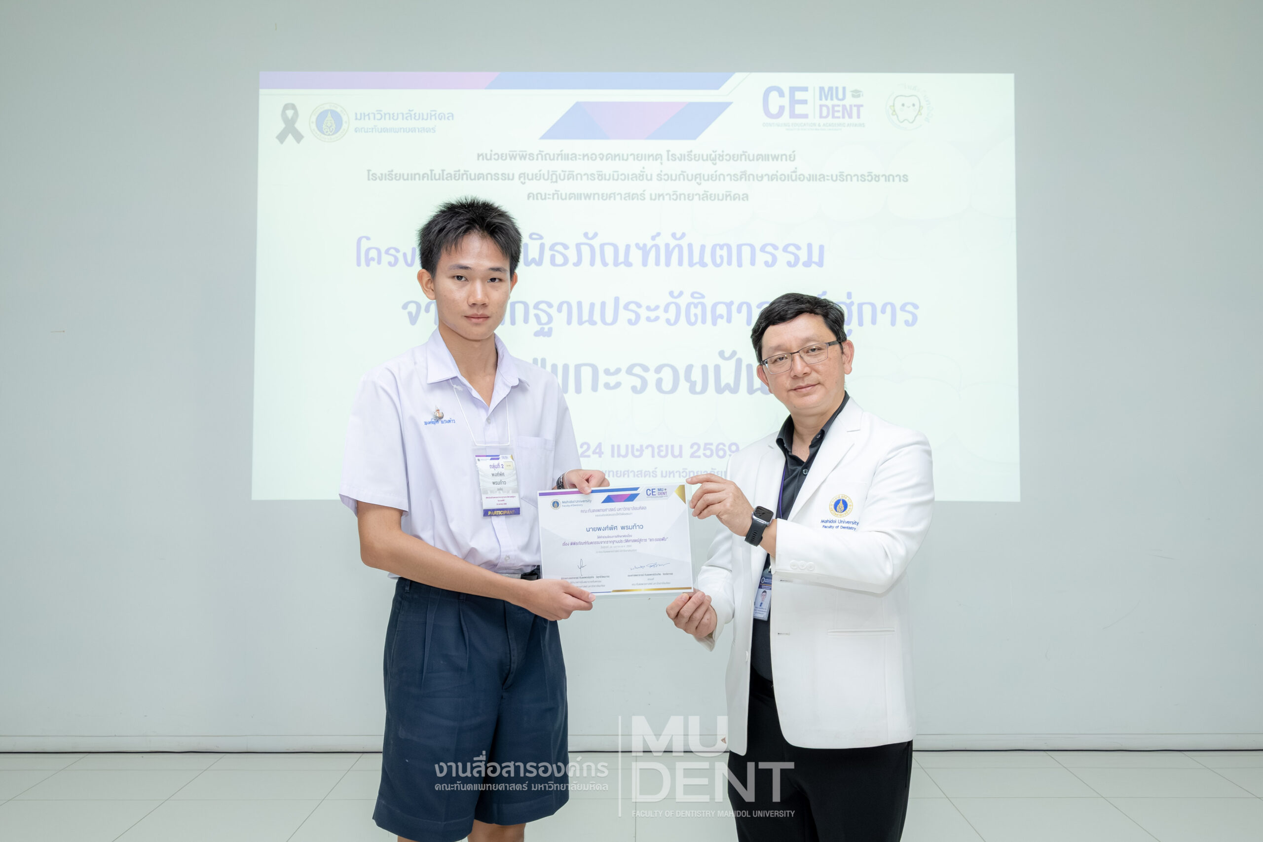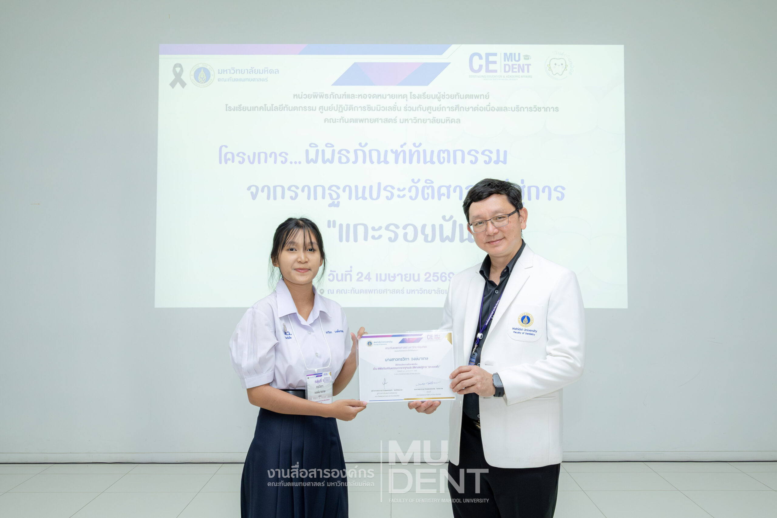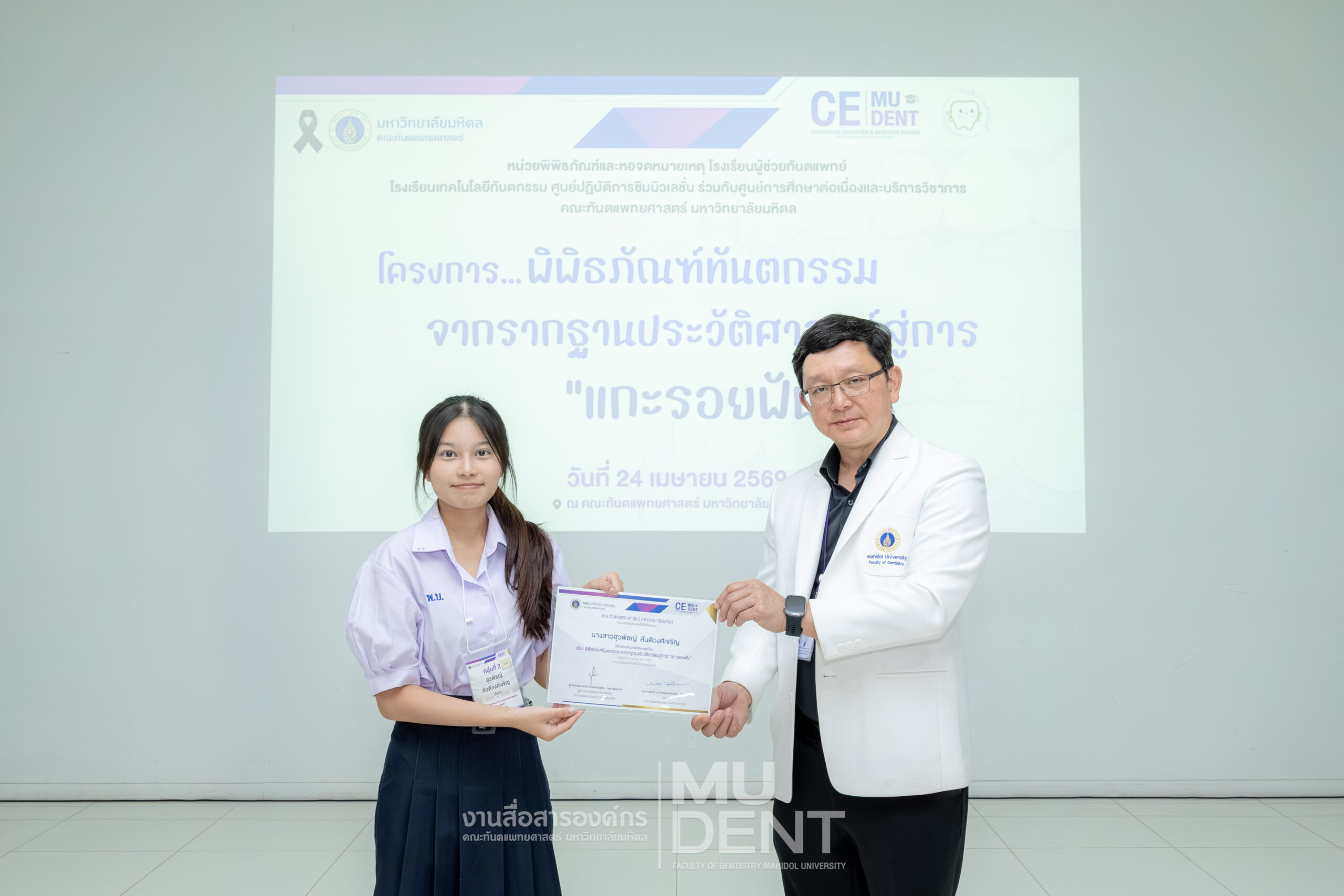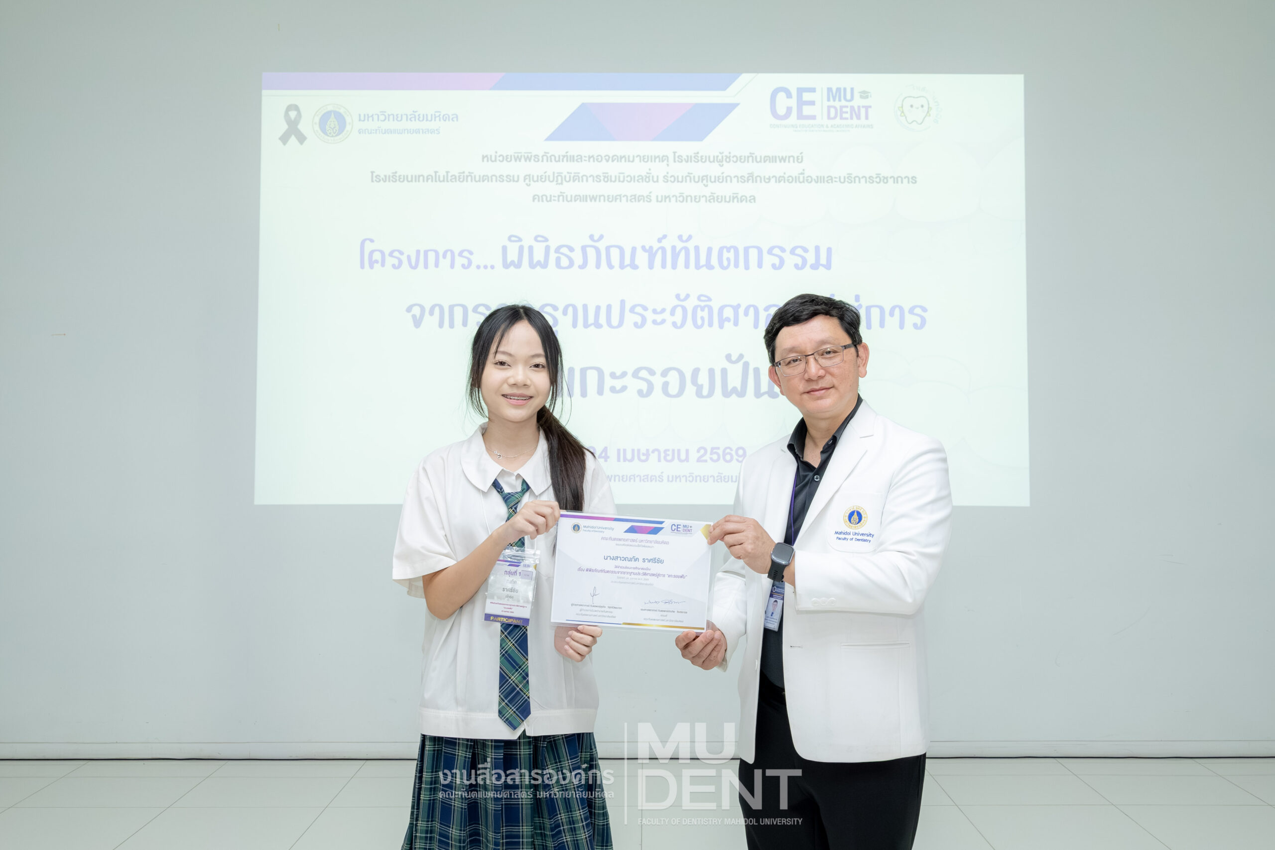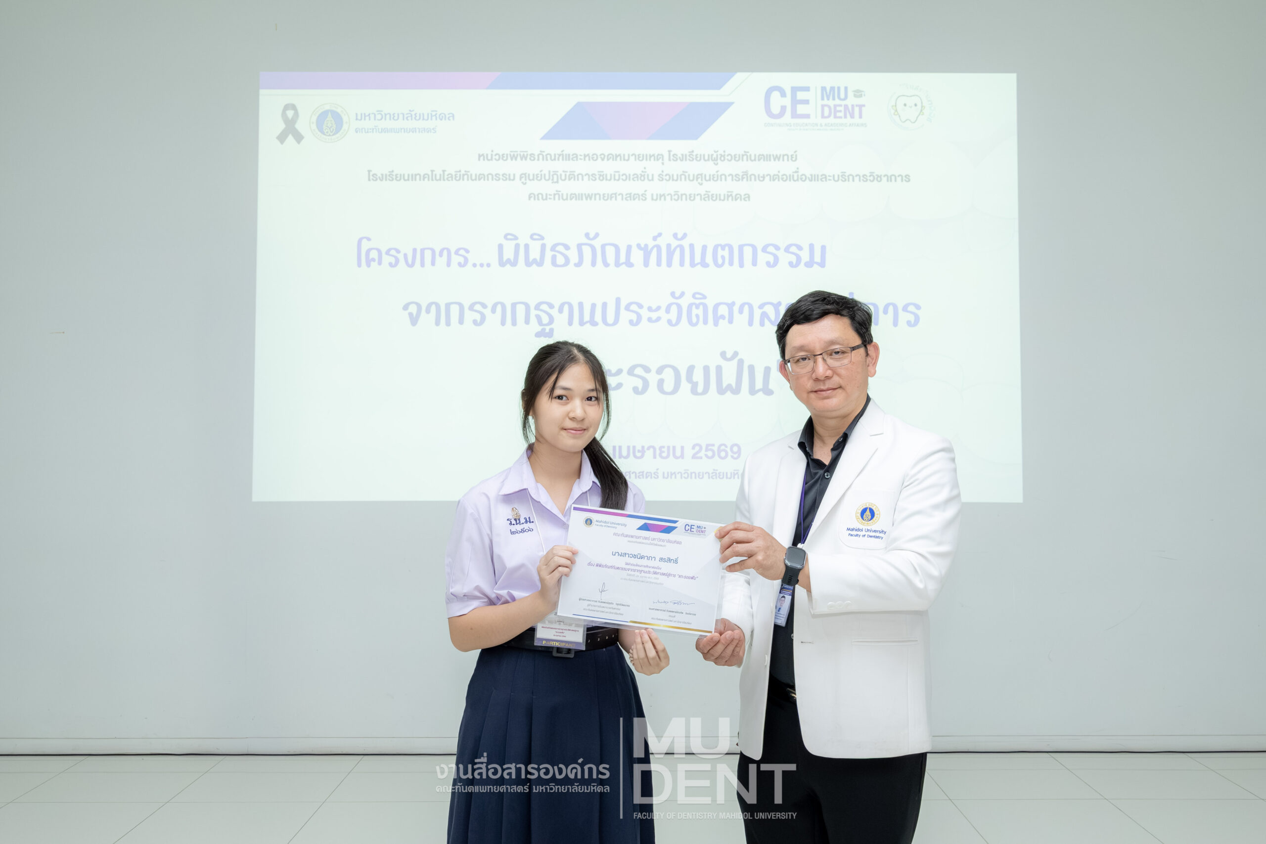 เมื่อวันที่ 24 เมษายน 2569 รองศาสตราจารย์ ทันตแพทย์บัณฑิต จิรจริยาเวช คณบดีคณะทันตแพทยศาสตร์ มหาวิทยาลัยมหิดล ให้เกียรติเป็นประธานในพิธีเปิดโครงการ “พิพิธภัณฑ์ทันตกรรมจากรากฐานประวัติศาสตร์สู่การ ‘แกะรอยฟัน’” สำหรับนักเรียนระดับมัธยมศึกษาตอนปลาย รุ่นที่ 1 ประจำปีงบประมาณ 2569 ณ สิรินธรทันตพิพิธ ชั้น 1 อาคารเฉลิมพระเกียรติ 50 พรรษา คณะทันตแพทยศาสตร์ มหาวิทยาลัยมหิดล