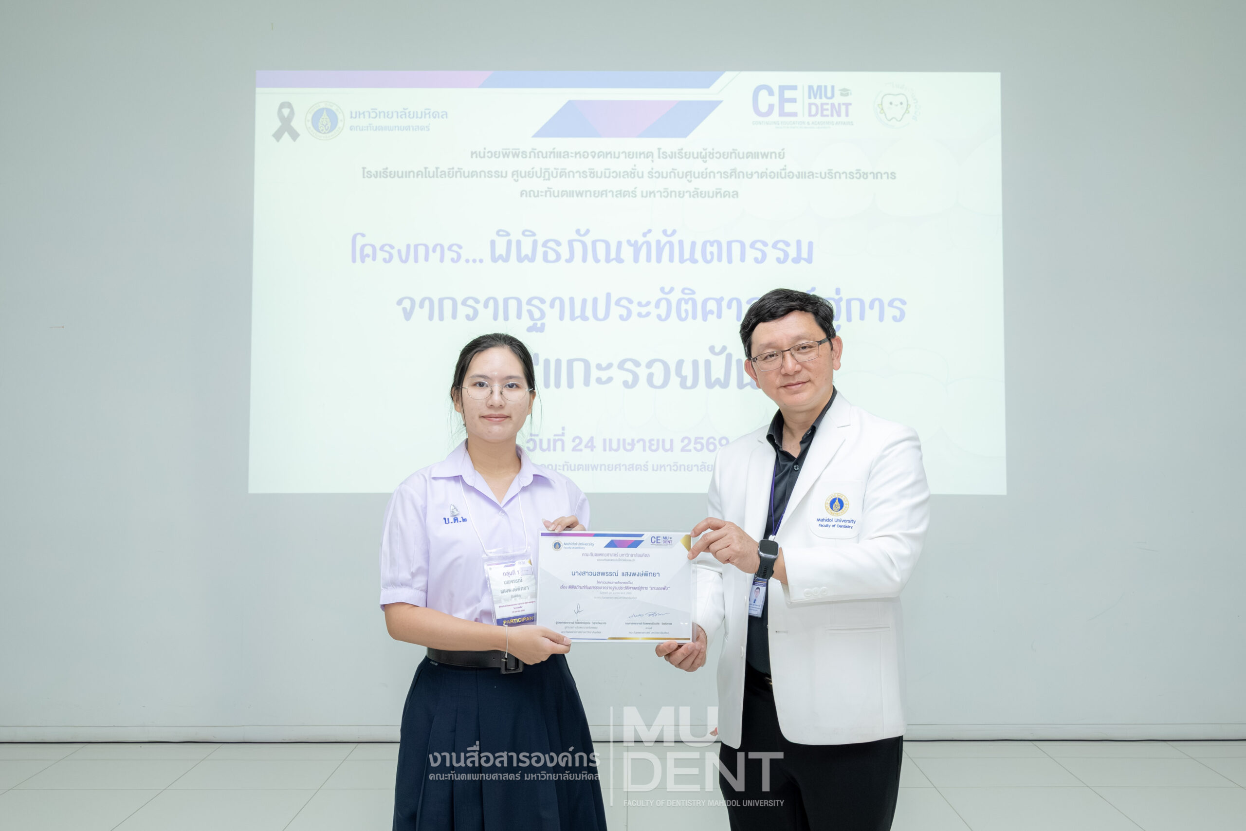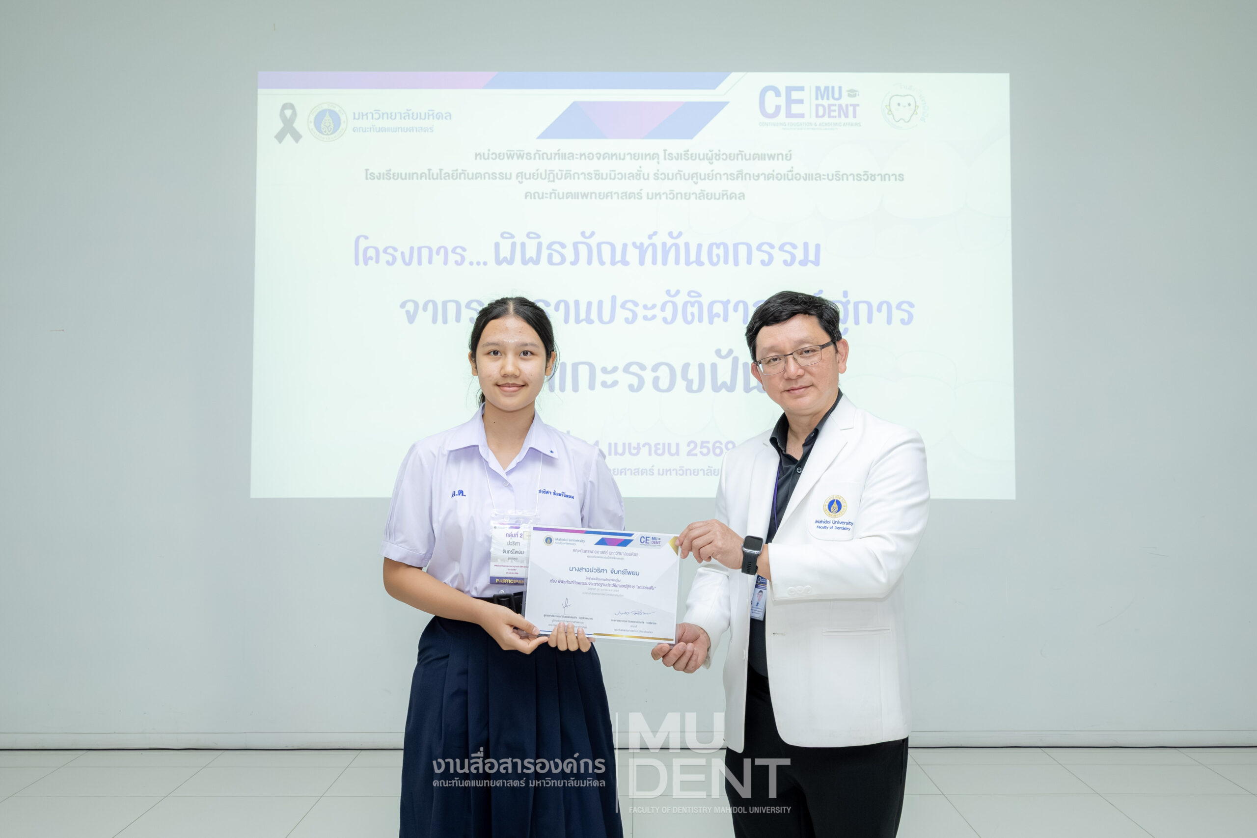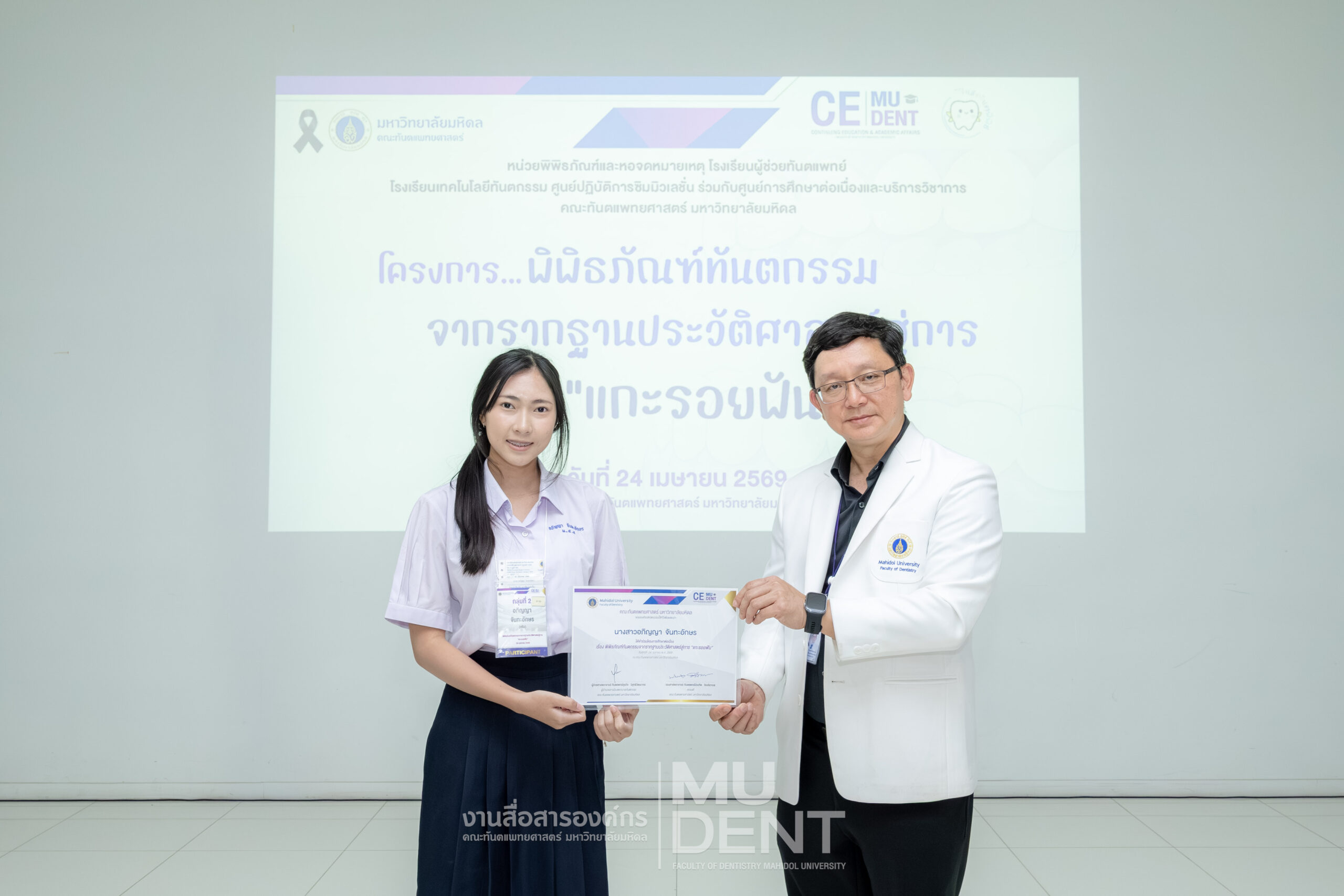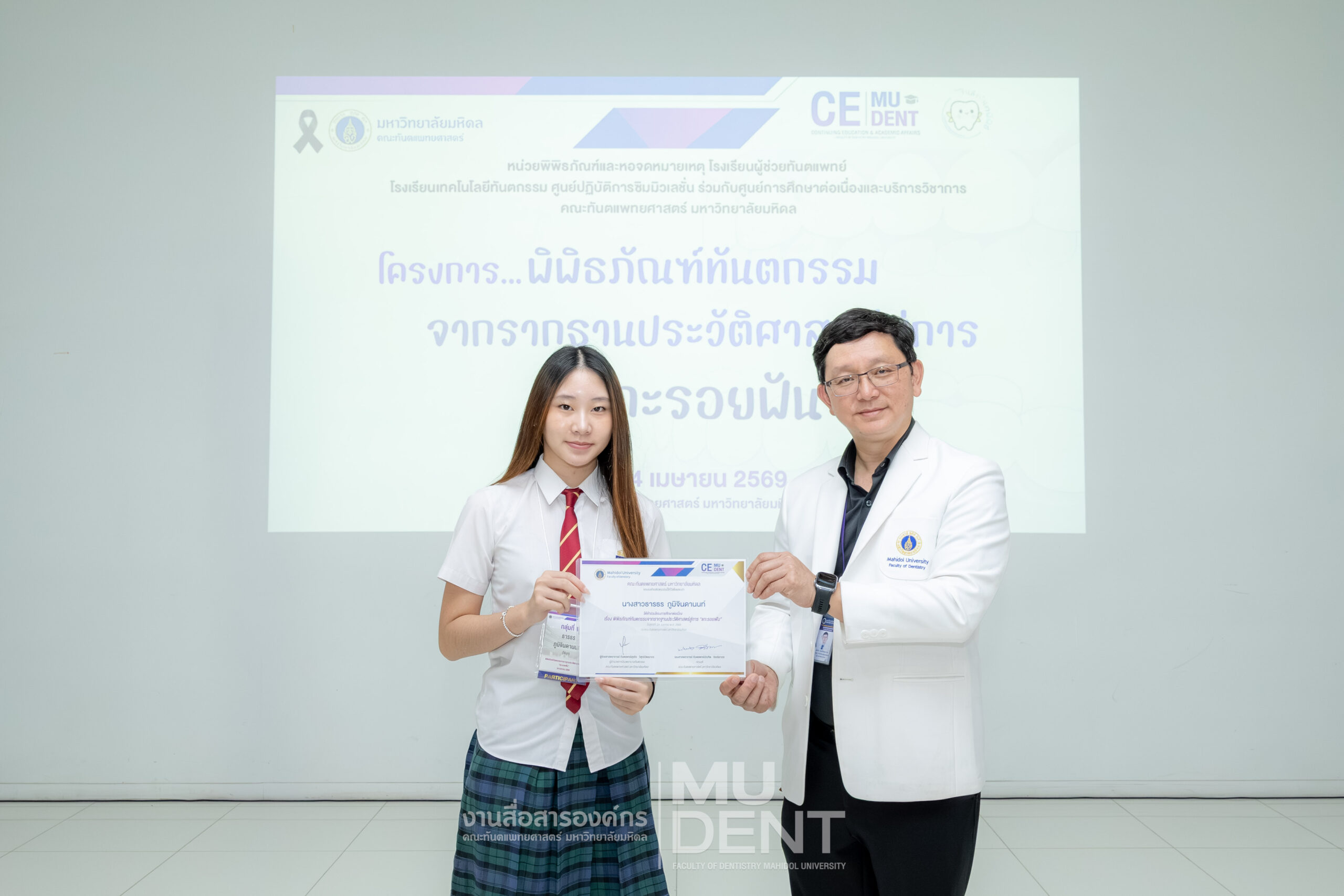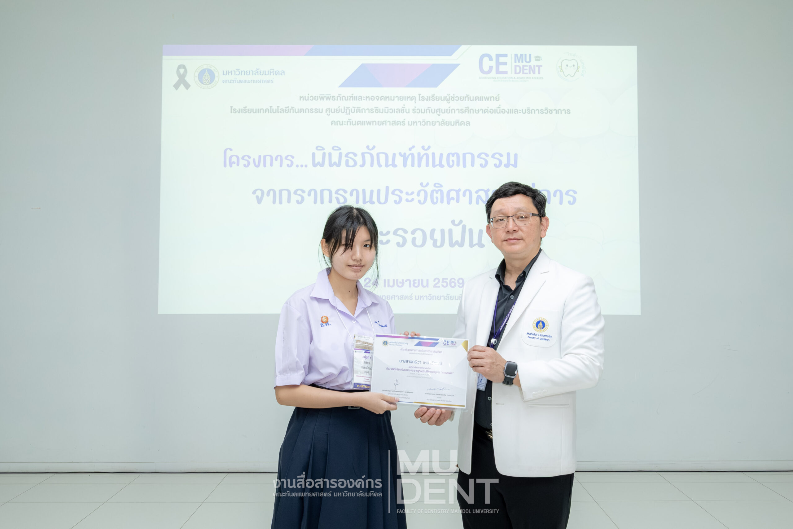 เมื่อวันที่ 24 เมษายน 2569 รองศาสตราจารย์ ทันตแพทย์บัณฑิต จิรจริยาเวช คณบดีคณะทันตแพทยศาสตร์ มหาวิทยาลัยมหิดล ให้เกียรติเป็นประธานในพิธีเปิดโครงการ “พิพิธภัณฑ์ทันตกรรมจากรากฐานประวัติศาสตร์สู่การ ‘แกะรอยฟัน’” สำหรับนักเรียนระดับมัธยมศึกษาตอนปลาย รุ่นที่ 1 ประจำปีงบประมาณ 2569 ณ สิรินธรทันตพิพิธ ชั้น 1 อาคารเฉลิมพระเกียรติ 50 พรรษา คณะทันตแพทยศาสตร์ มหาวิทยาลัยมหิดล
