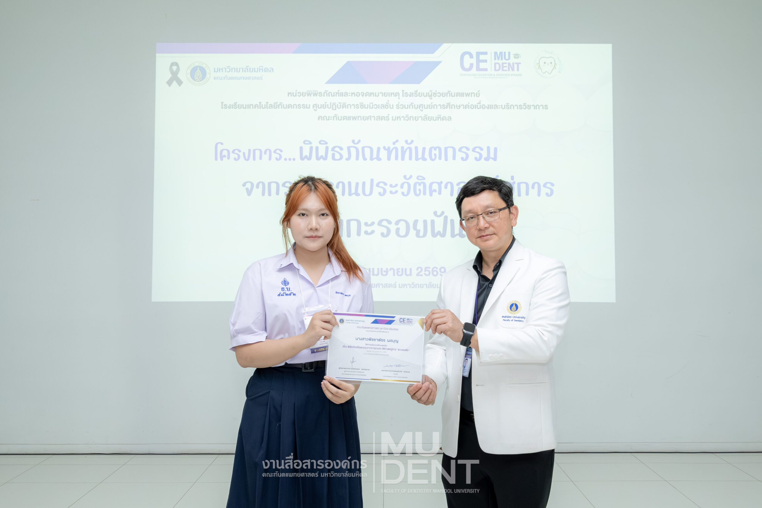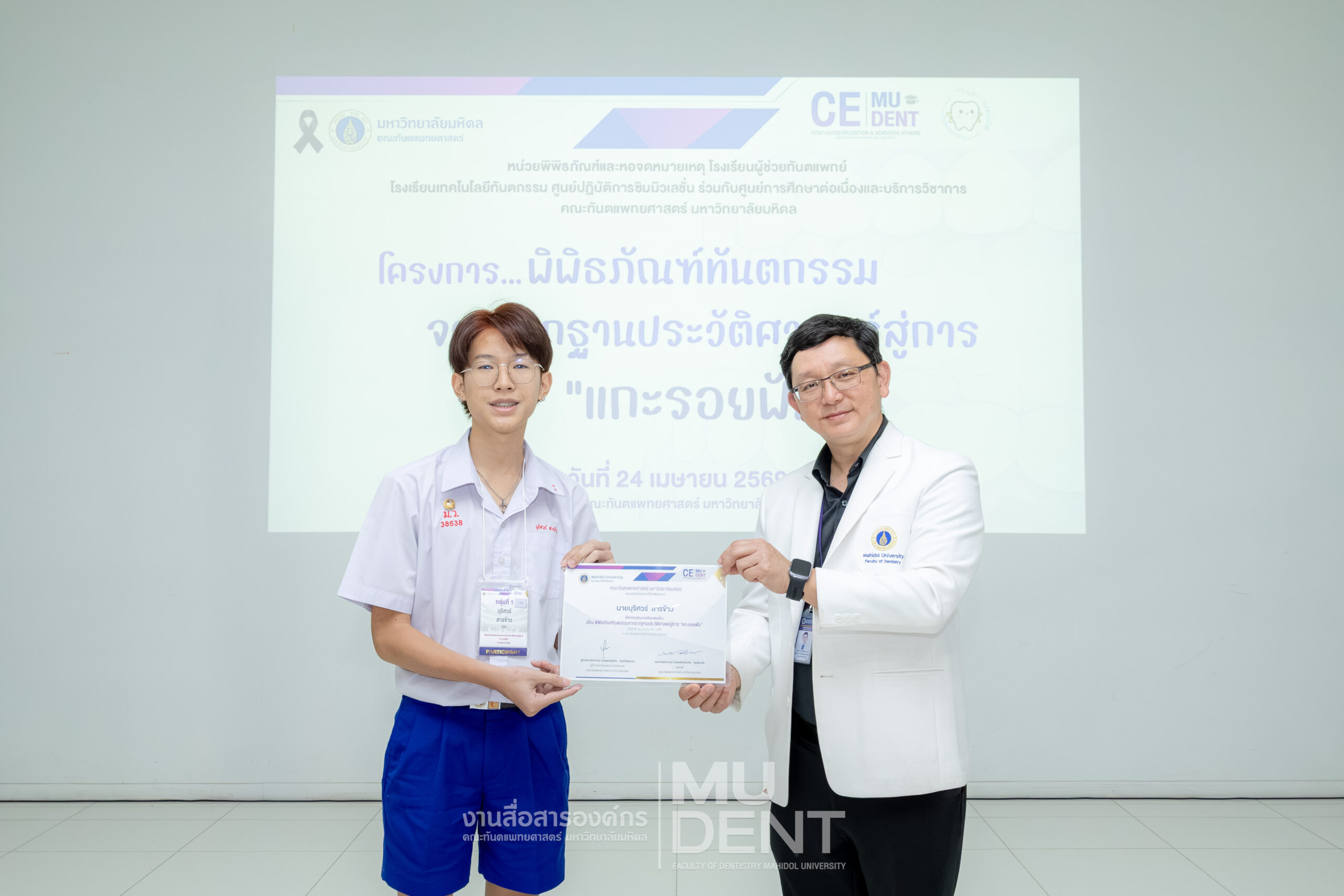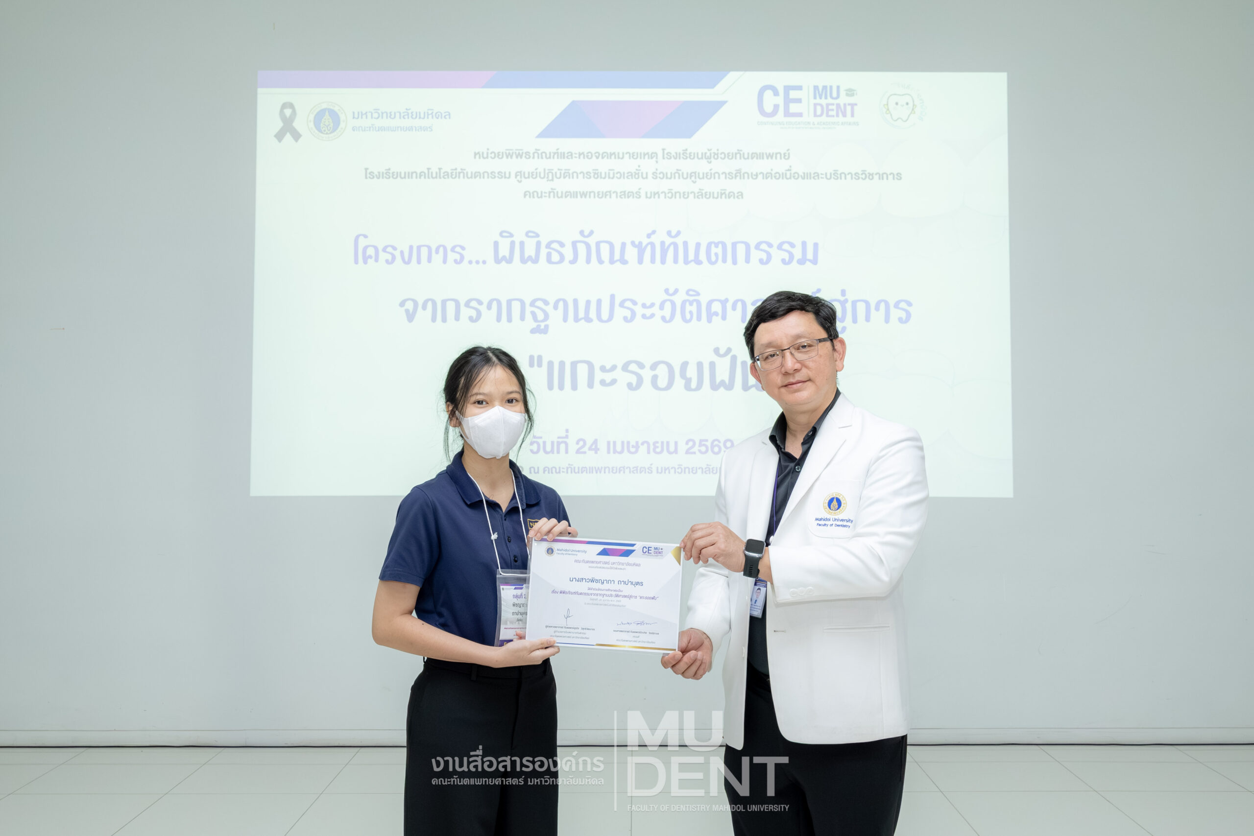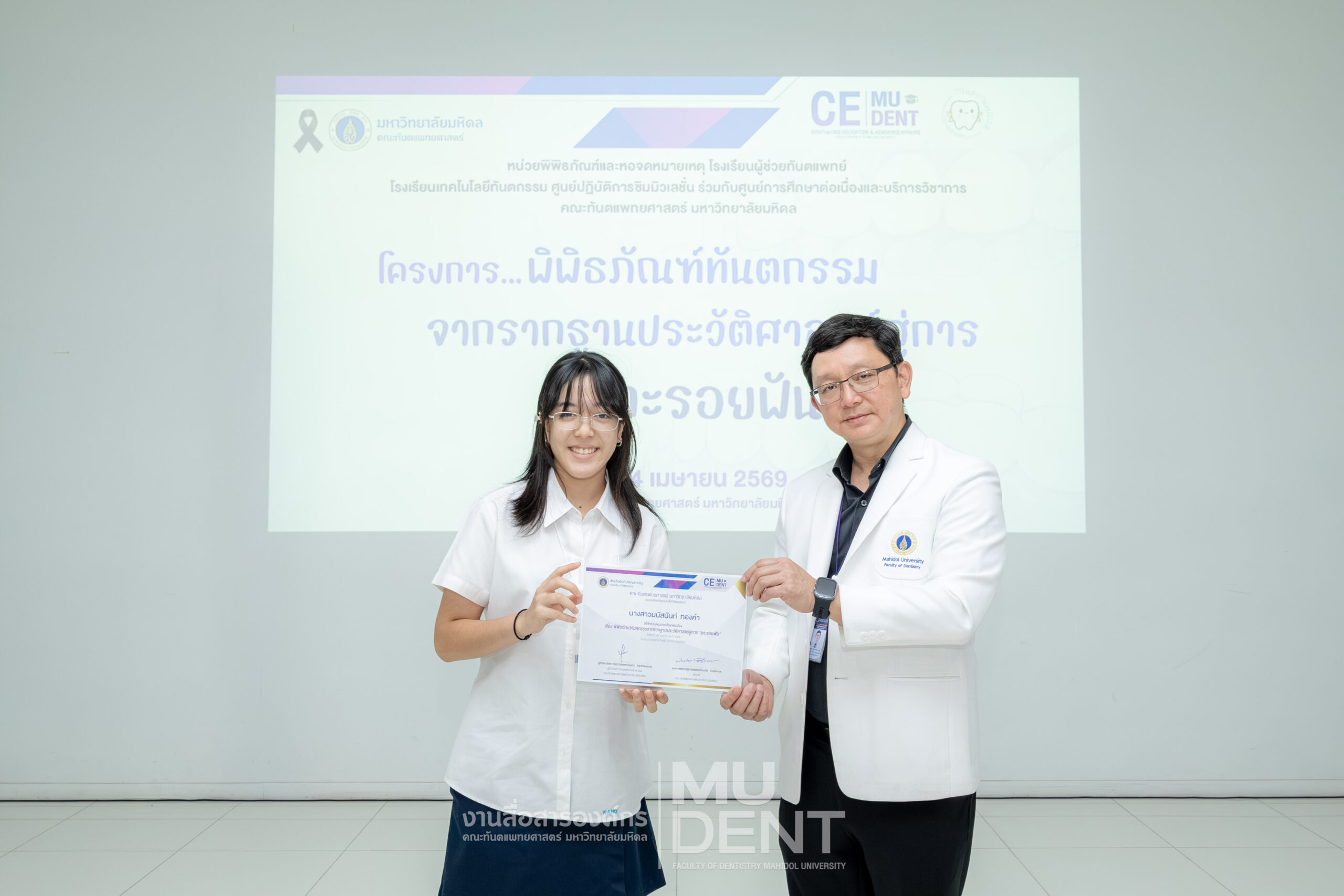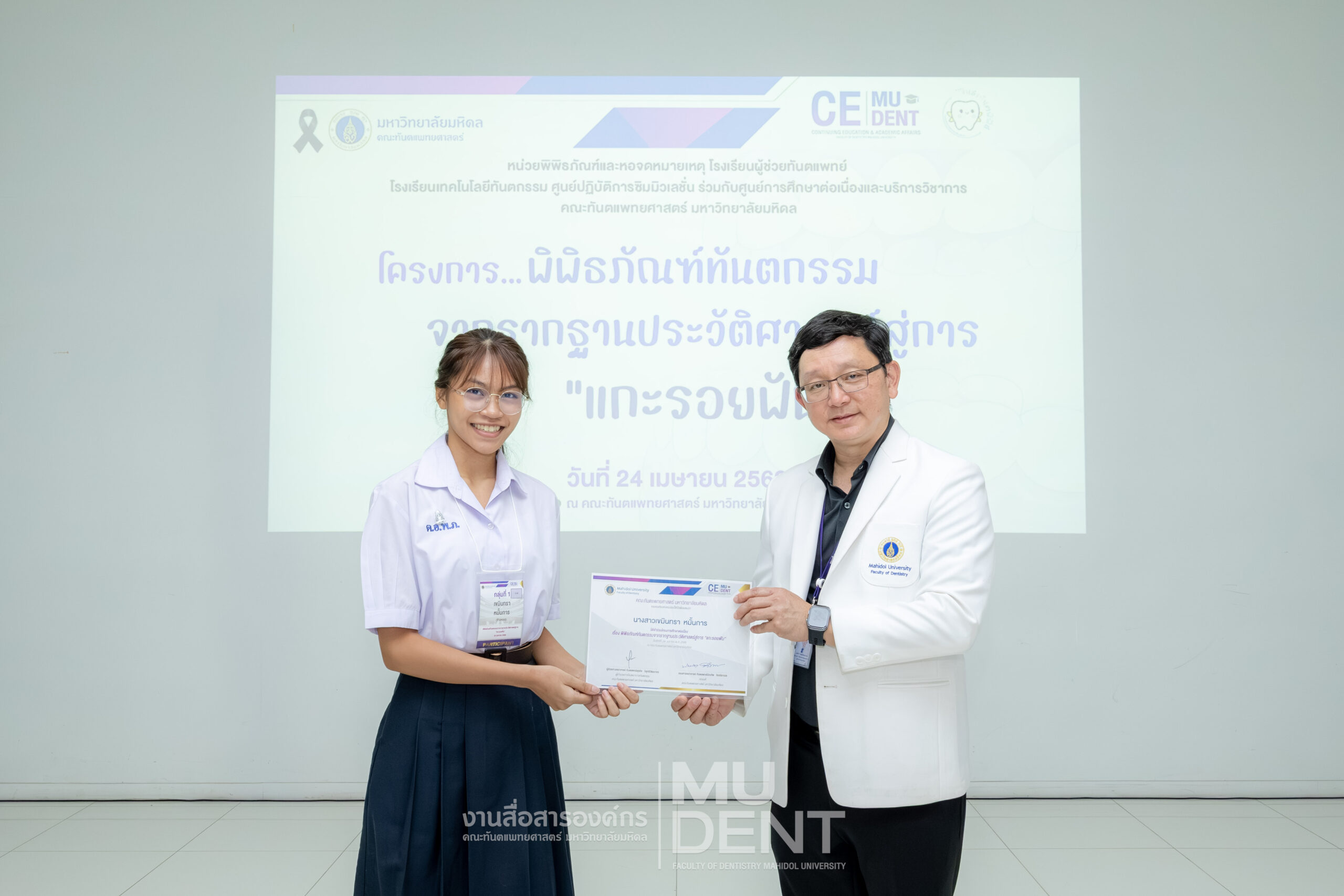 เมื่อวันที่ 24 เมษายน 2569 รองศาสตราจารย์ ทันตแพทย์บัณฑิต จิรจริยาเวช คณบดีคณะทันตแพทยศาสตร์ มหาวิทยาลัยมหิดล ให้เกียรติเป็นประธานในพิธีเปิดโครงการ “พิพิธภัณฑ์ทันตกรรมจากรากฐานประวัติศาสตร์สู่การ ‘แกะรอยฟัน’” สำหรับนักเรียนระดับมัธยมศึกษาตอนปลาย รุ่นที่ 1 ประจำปีงบประมาณ 2569 ณ สิรินธรทันตพิพิธ ชั้น 1 อาคารเฉลิมพระเกียรติ 50 พรรษา คณะทันตแพทยศาสตร์ มหาวิทยาลัยมหิดล