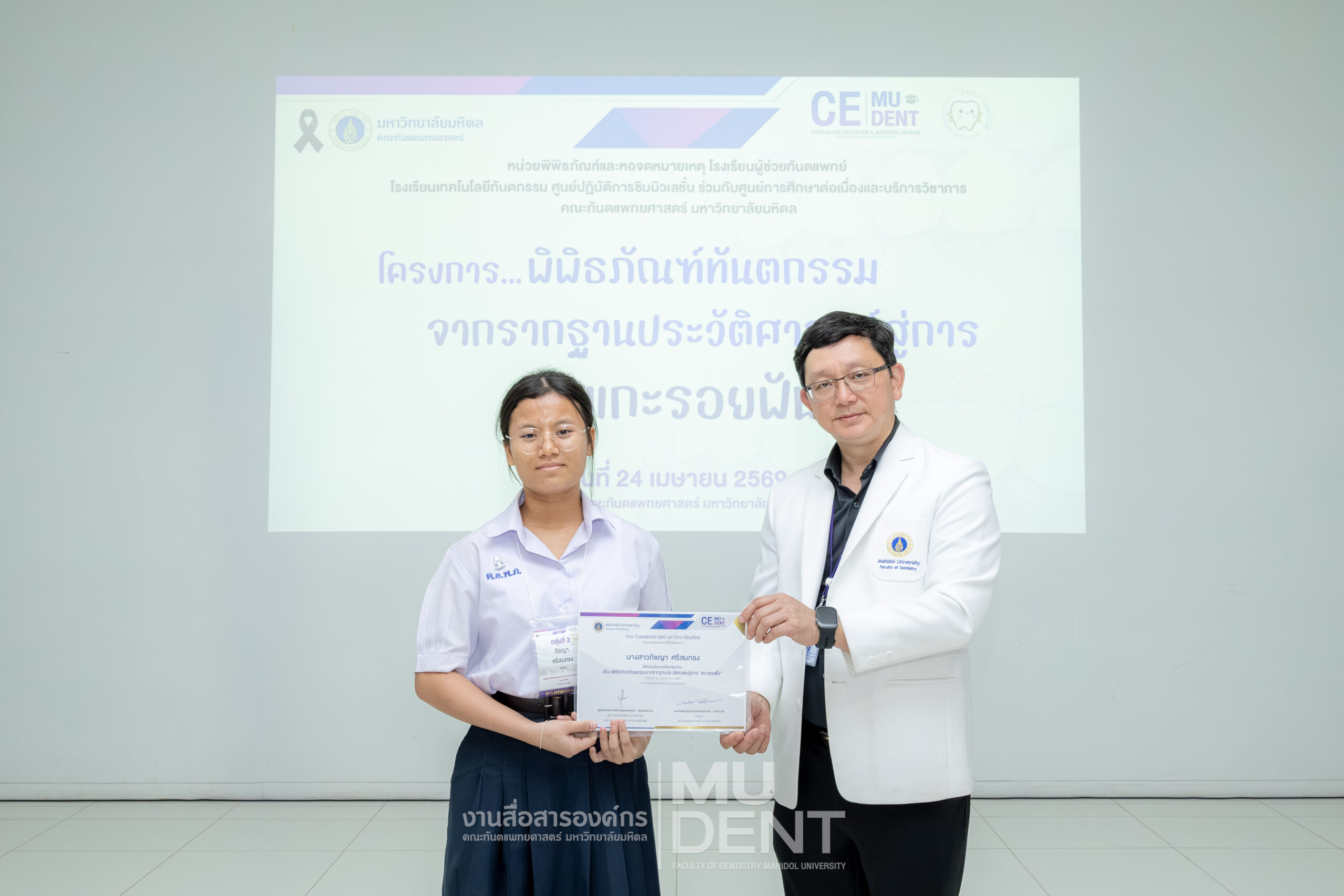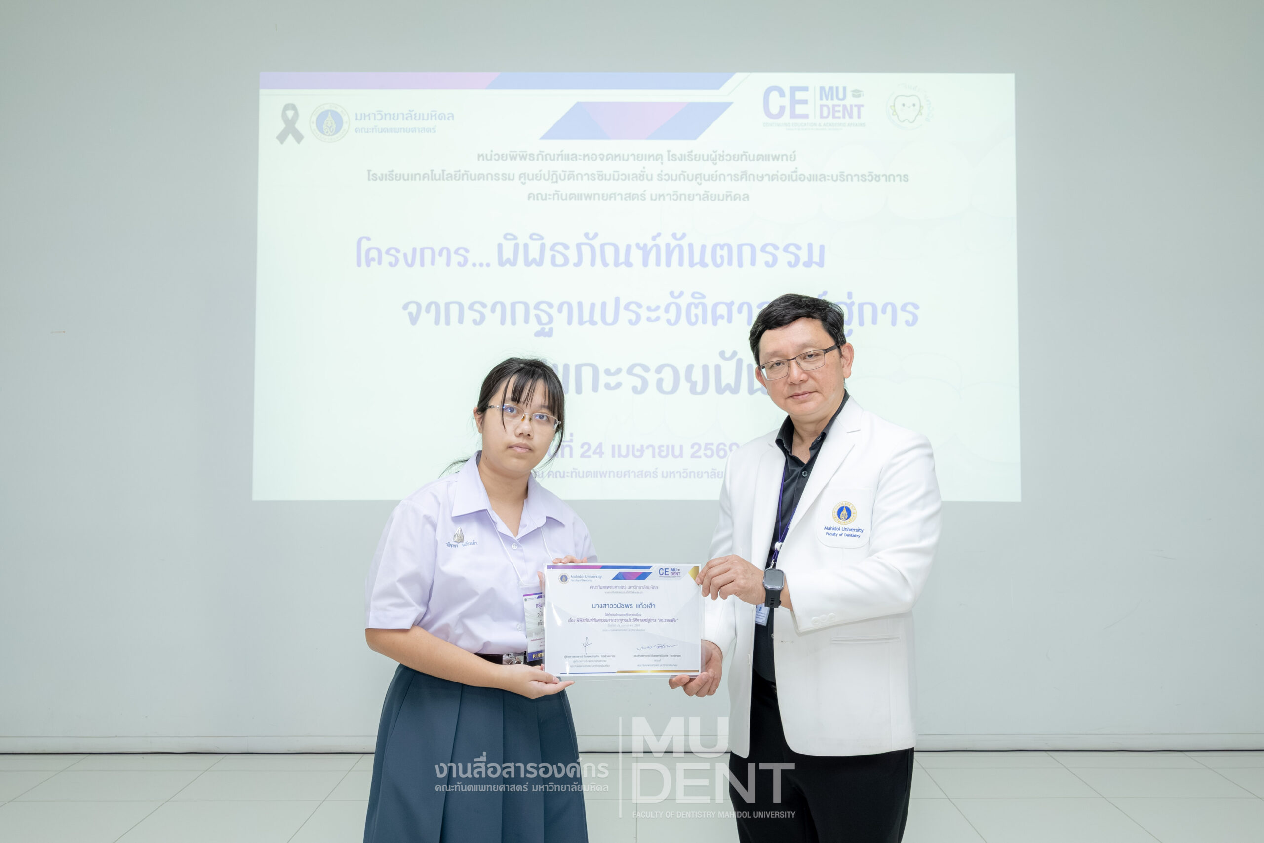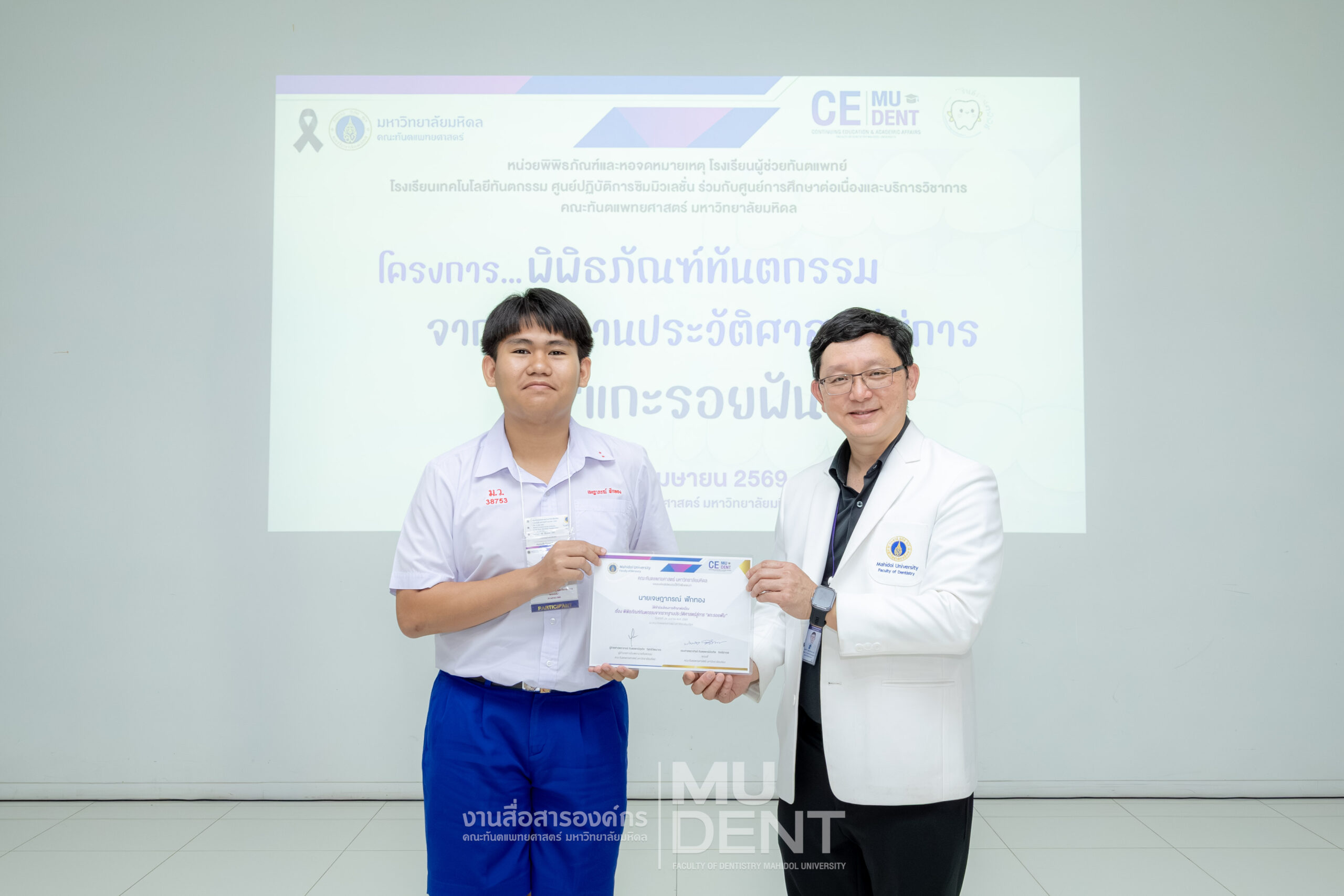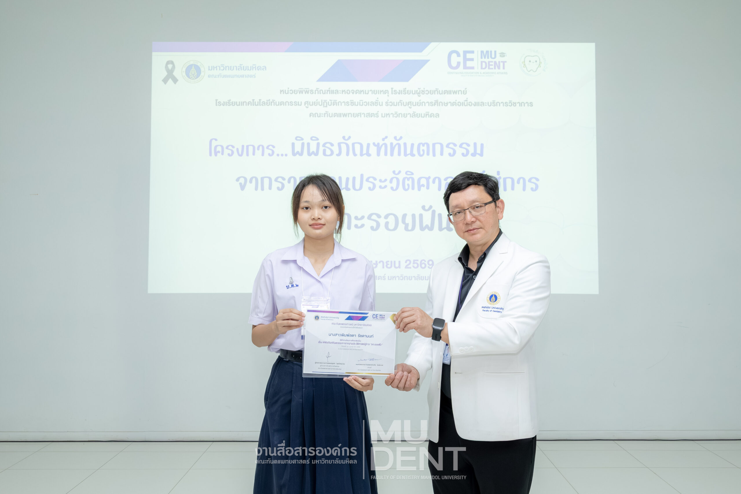 เมื่อวันที่ 24 เมษายน 2569 รองศาสตราจารย์ ทันตแพทย์บัณฑิต จิรจริยาเวช คณบดีคณะทันตแพทยศาสตร์ มหาวิทยาลัยมหิดล ให้เกียรติเป็นประธานในพิธีเปิดโครงการ “พิพิธภัณฑ์ทันตกรรมจากรากฐานประวัติศาสตร์สู่การ ‘แกะรอยฟัน’” สำหรับนักเรียนระดับมัธยมศึกษาตอนปลาย รุ่นที่ 1 ประจำปีงบประมาณ 2569 ณ สิรินธรทันตพิพิธ ชั้น 1 อาคารเฉลิมพระเกียรติ 50 พรรษา คณะทันตแพทยศาสตร์ มหาวิทยาลัยมหิดล