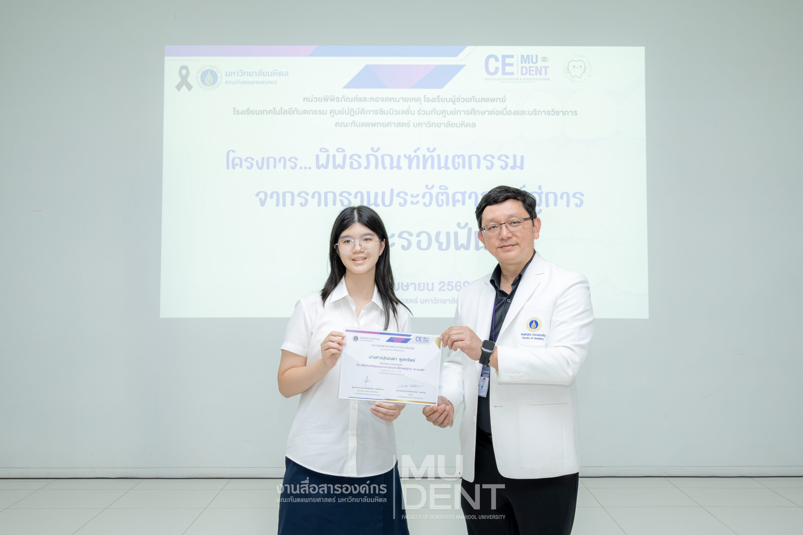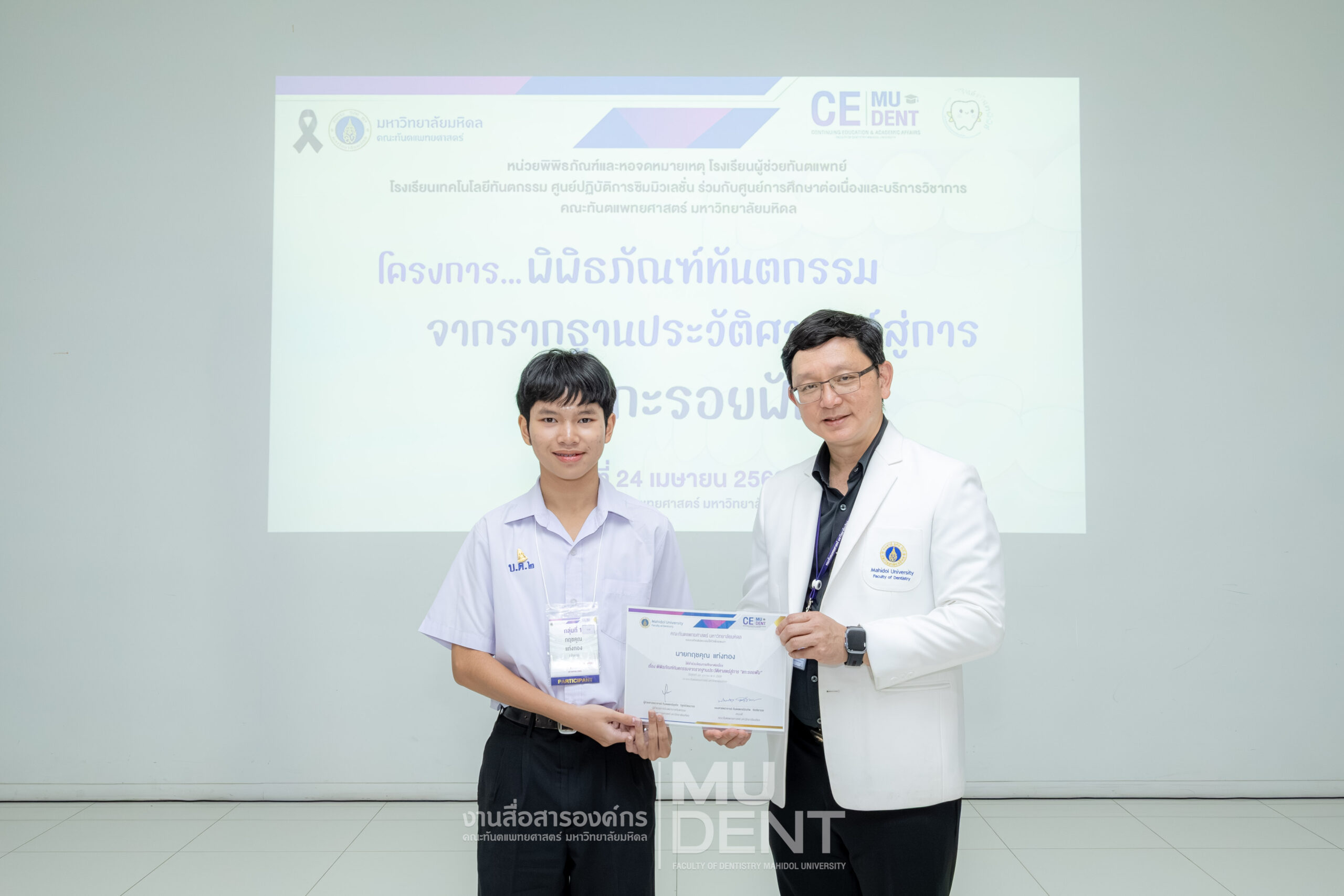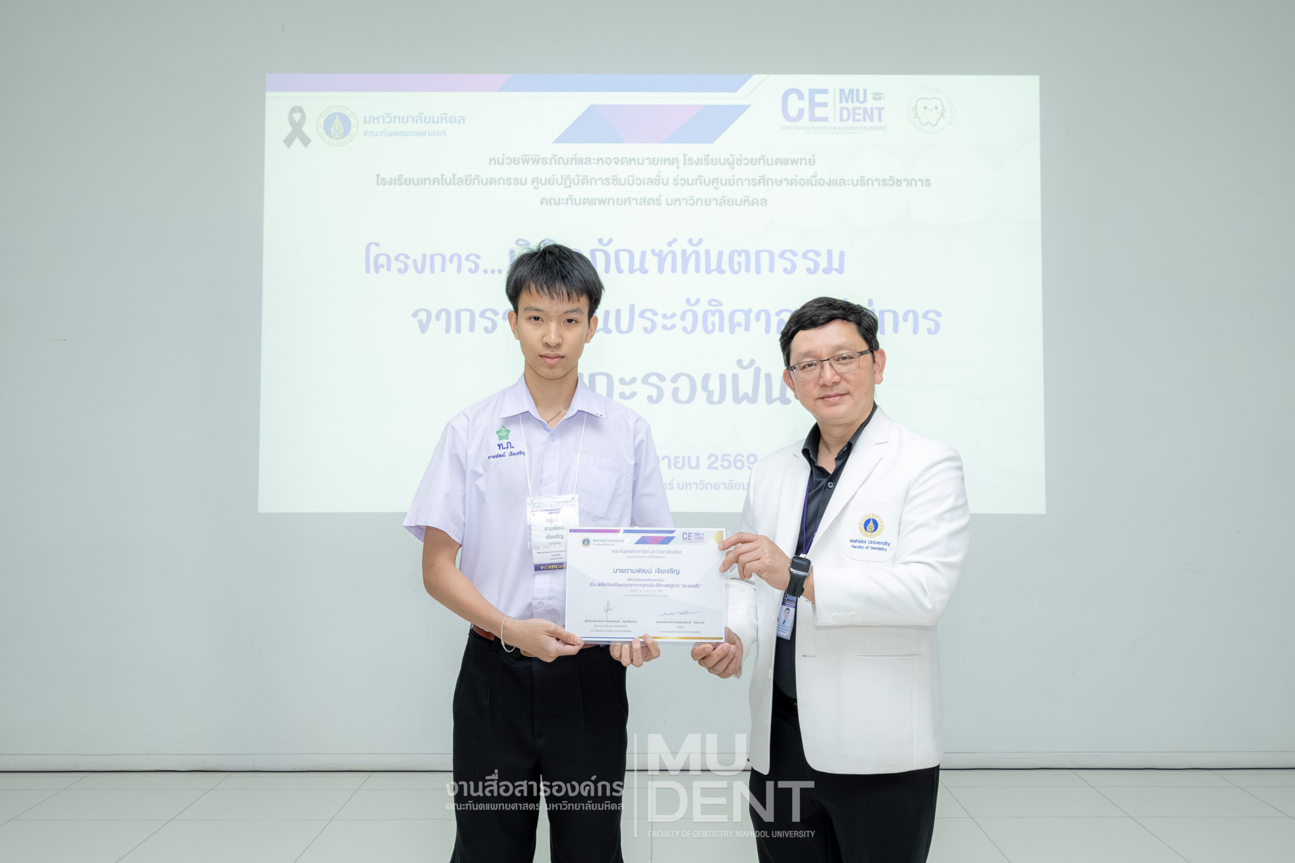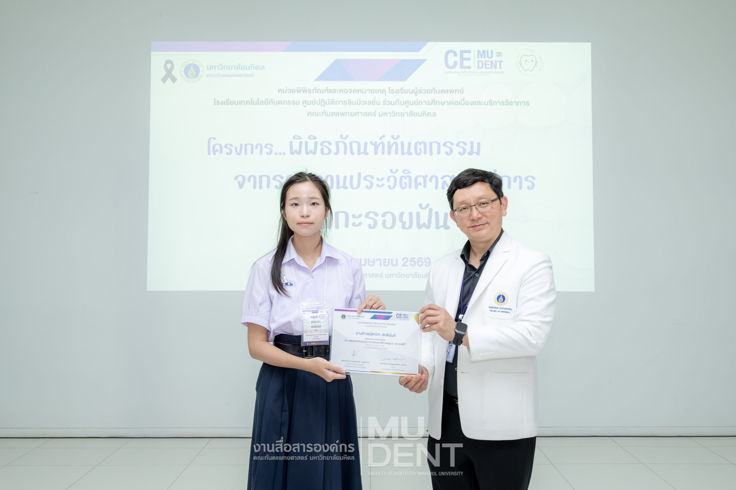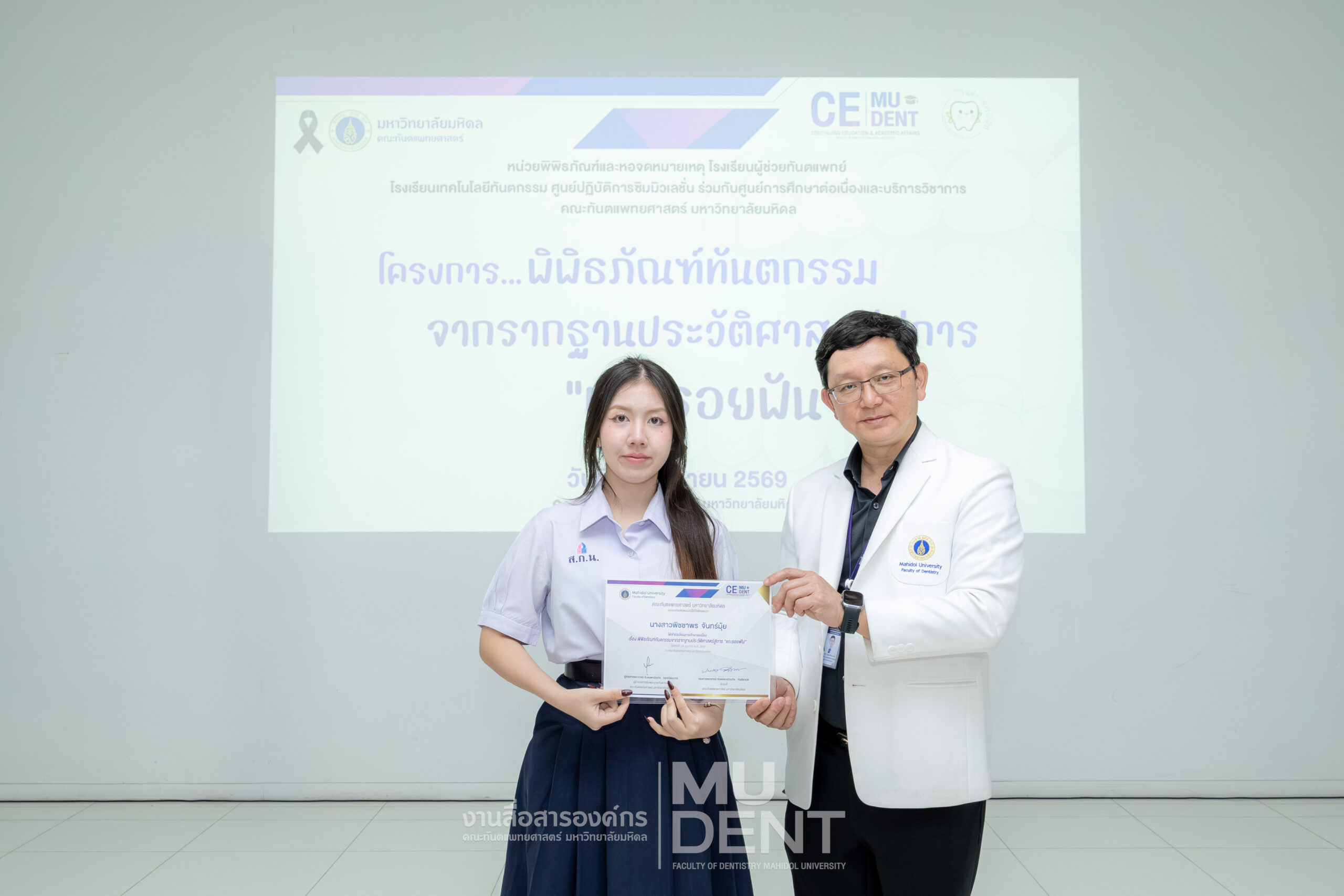 เมื่อวันที่ 24 เมษายน 2569 รองศาสตราจารย์ ทันตแพทย์บัณฑิต จิรจริยาเวช คณบดีคณะทันตแพทยศาสตร์ มหาวิทยาลัยมหิดล ให้เกียรติเป็นประธานในพิธีเปิดโครงการ “พิพิธภัณฑ์ทันตกรรมจากรากฐานประวัติศาสตร์สู่การ ‘แกะรอยฟัน’” สำหรับนักเรียนระดับมัธยมศึกษาตอนปลาย รุ่นที่ 1 ประจำปีงบประมาณ 2569 ณ สิรินธรทันตพิพิธ ชั้น 1 อาคารเฉลิมพระเกียรติ 50 พรรษา คณะทันตแพทยศาสตร์ มหาวิทยาลัยมหิดล