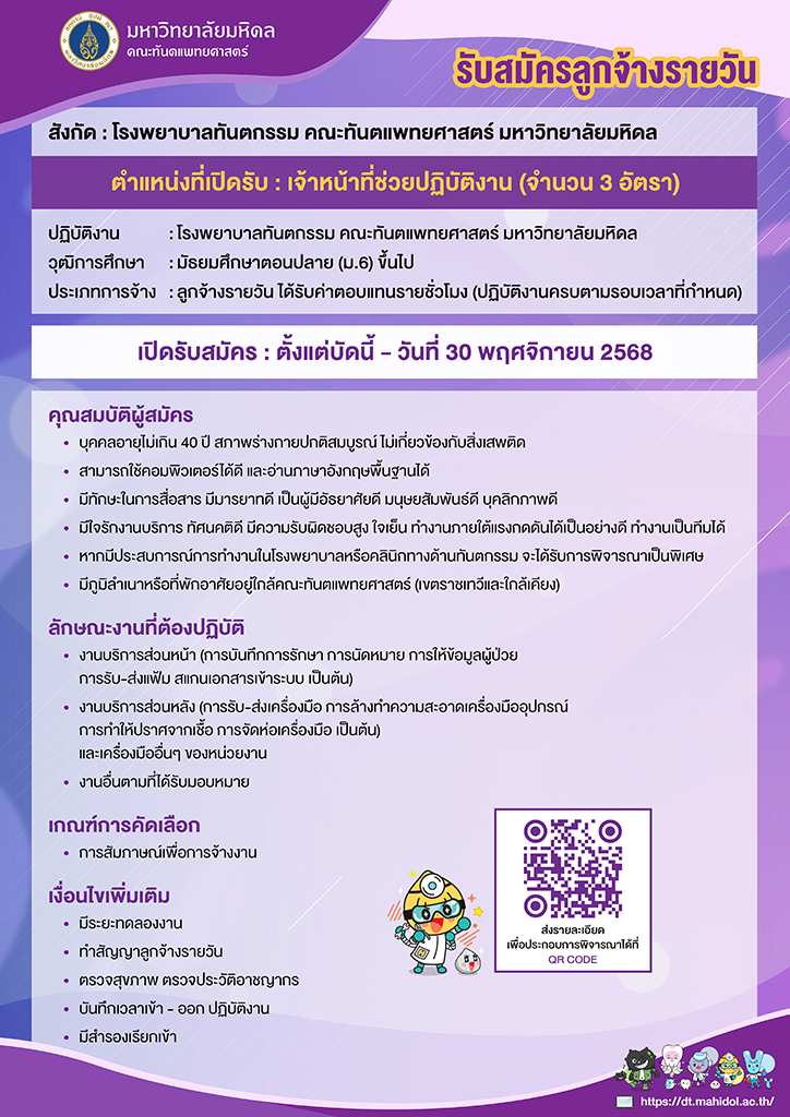รับสมัครลูกจ้างรายวัน เจ้าหน้าที่ช่วยปฏิบัติงาน (จำนวน 6 อัตรา) ปฏิบัติงาน : โรงพยาบาลทันตกรรม คณะทันตแพทยศาสตร์ มหาวิทยาลัยมหิดล สังกัด : โรงพยาบาลทันตกรรม คณะทันตแพทยศาสตร์ มหาวิทยาลัยมหิดล