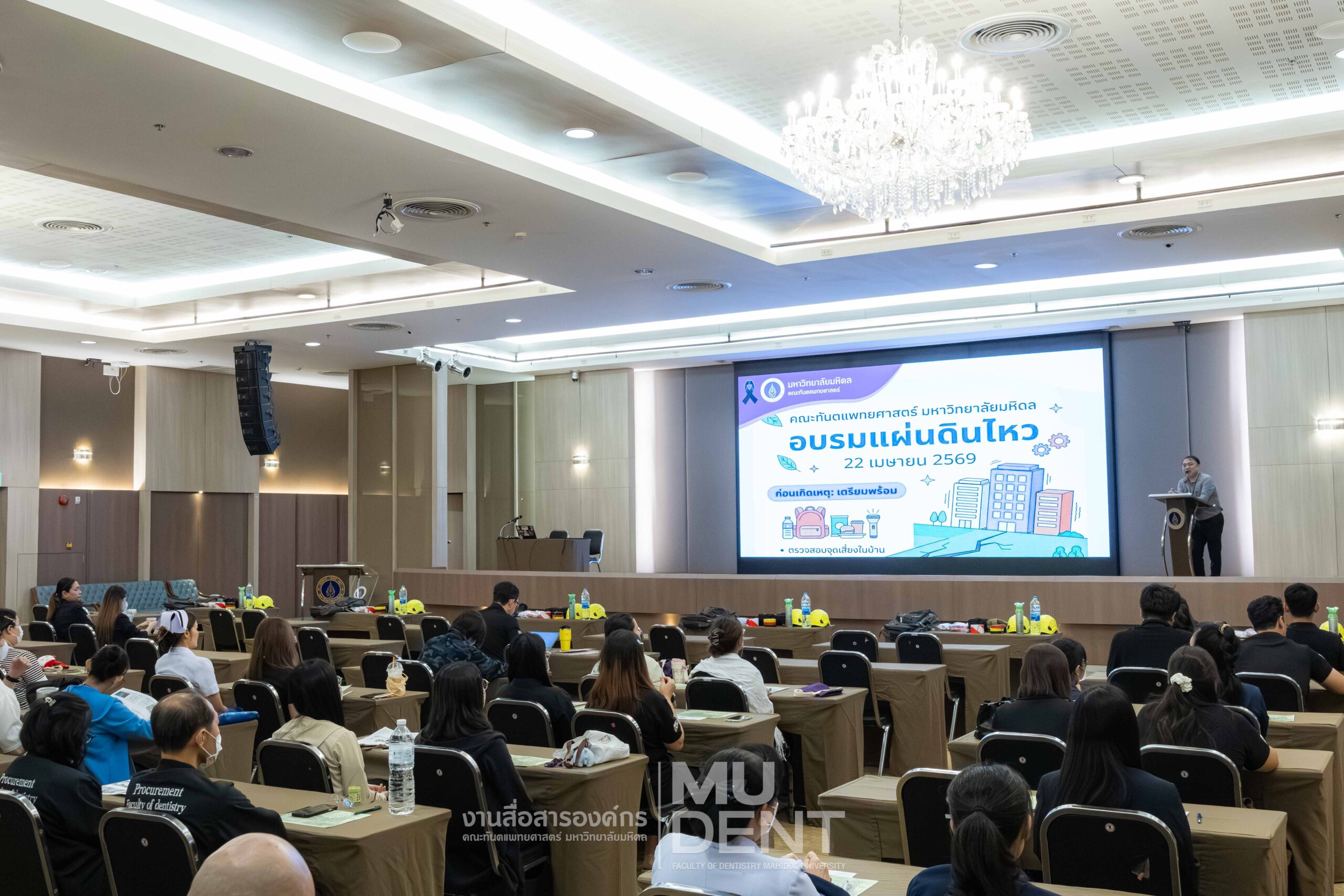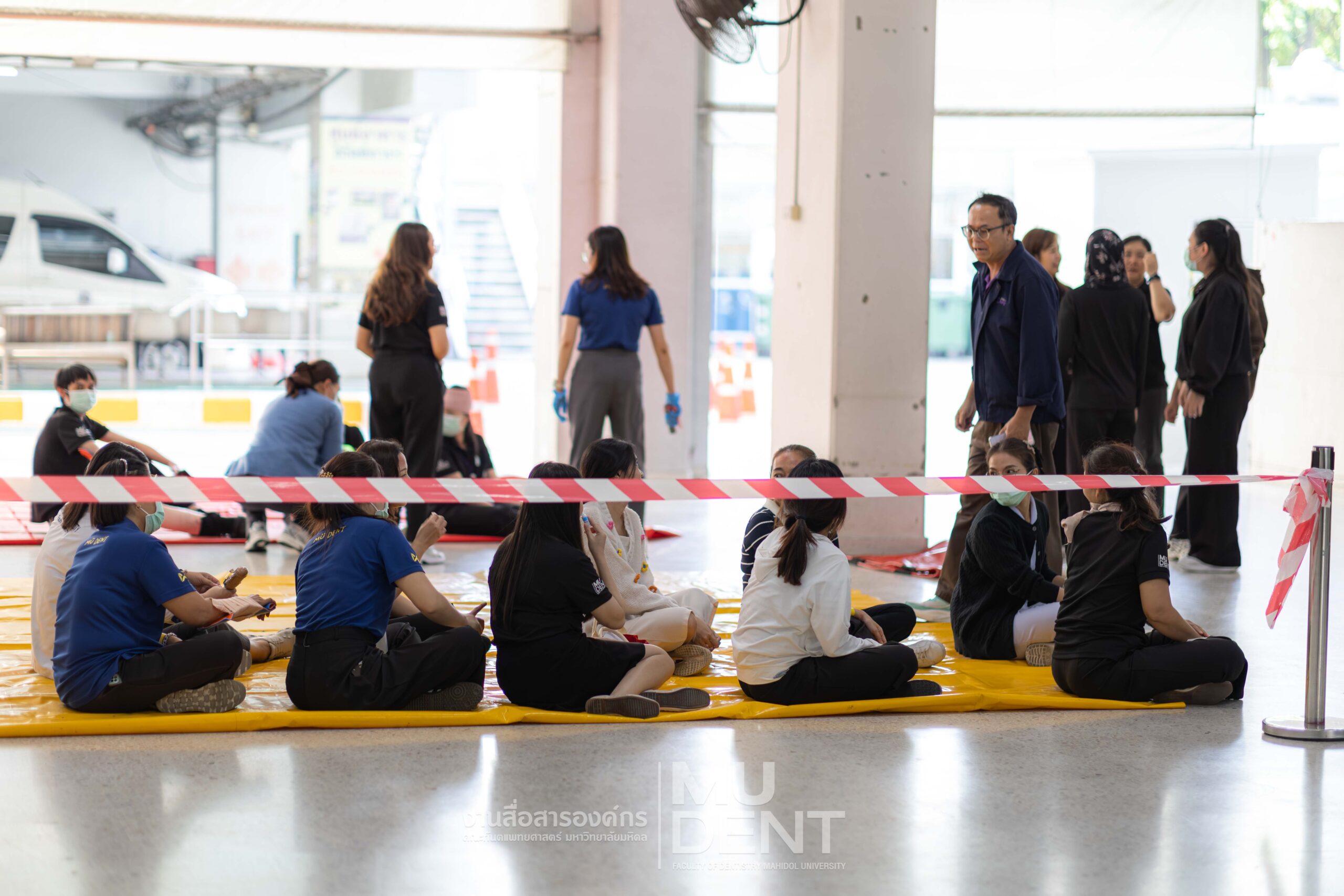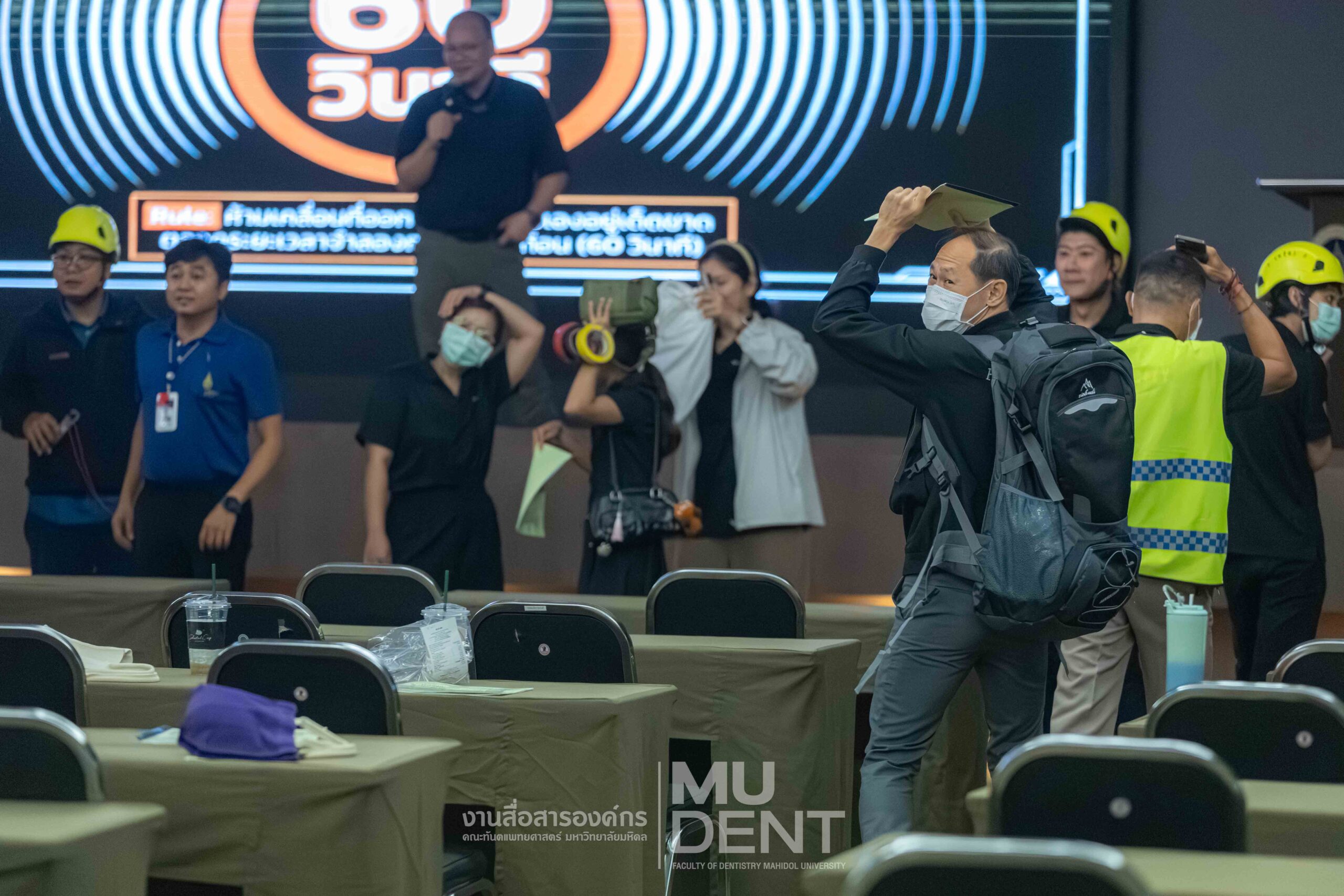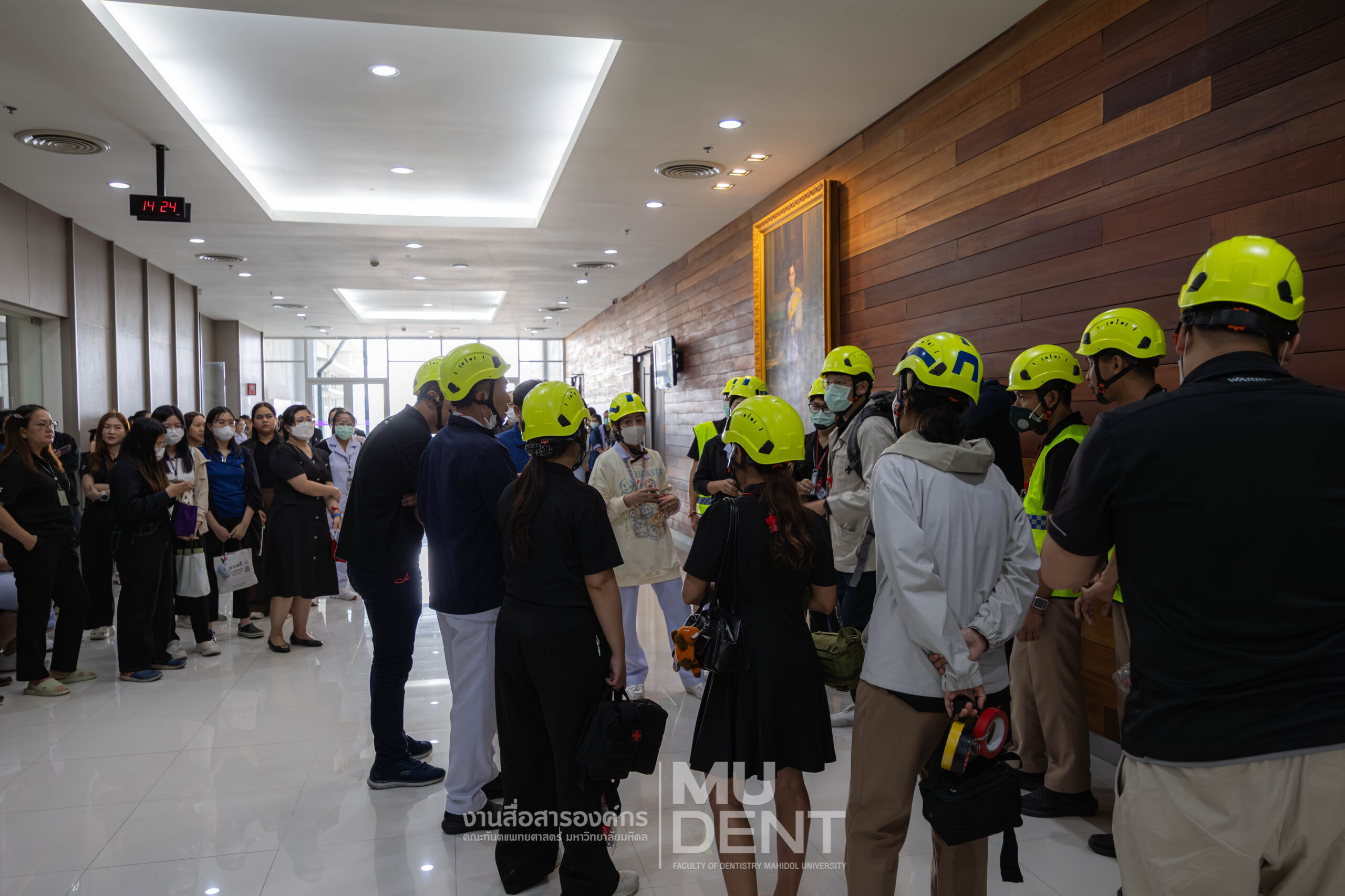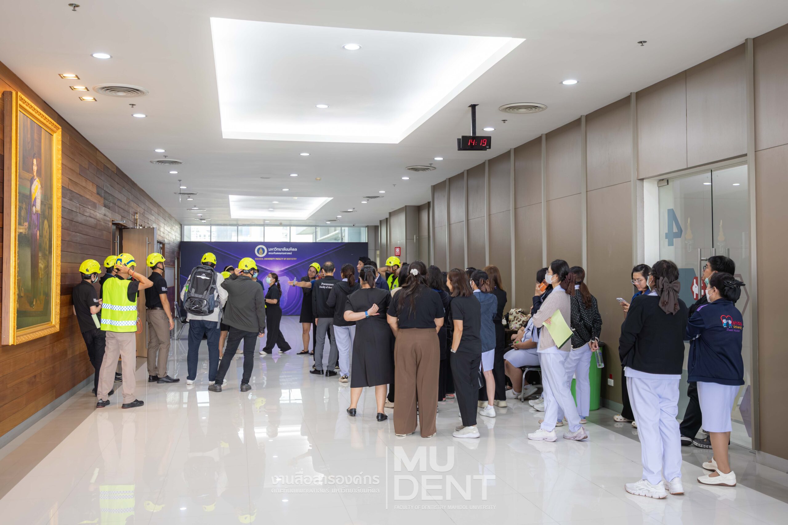 On April 22, 2026, Faculty of Dentistry, Mahidol University (DTMU), organized a practical workshop titled “Earthquake Emergency Drill 2026” at the Debaratana Auditorium, 4th Floor, 50th Anniversary of H.R.H. Princess Maha Chakri Sirindhorn Building. Associate Professor Dr. Pisol Senawongse, Deputy Dean for Research, Facilities and Environment, presided over the opening ceremony.