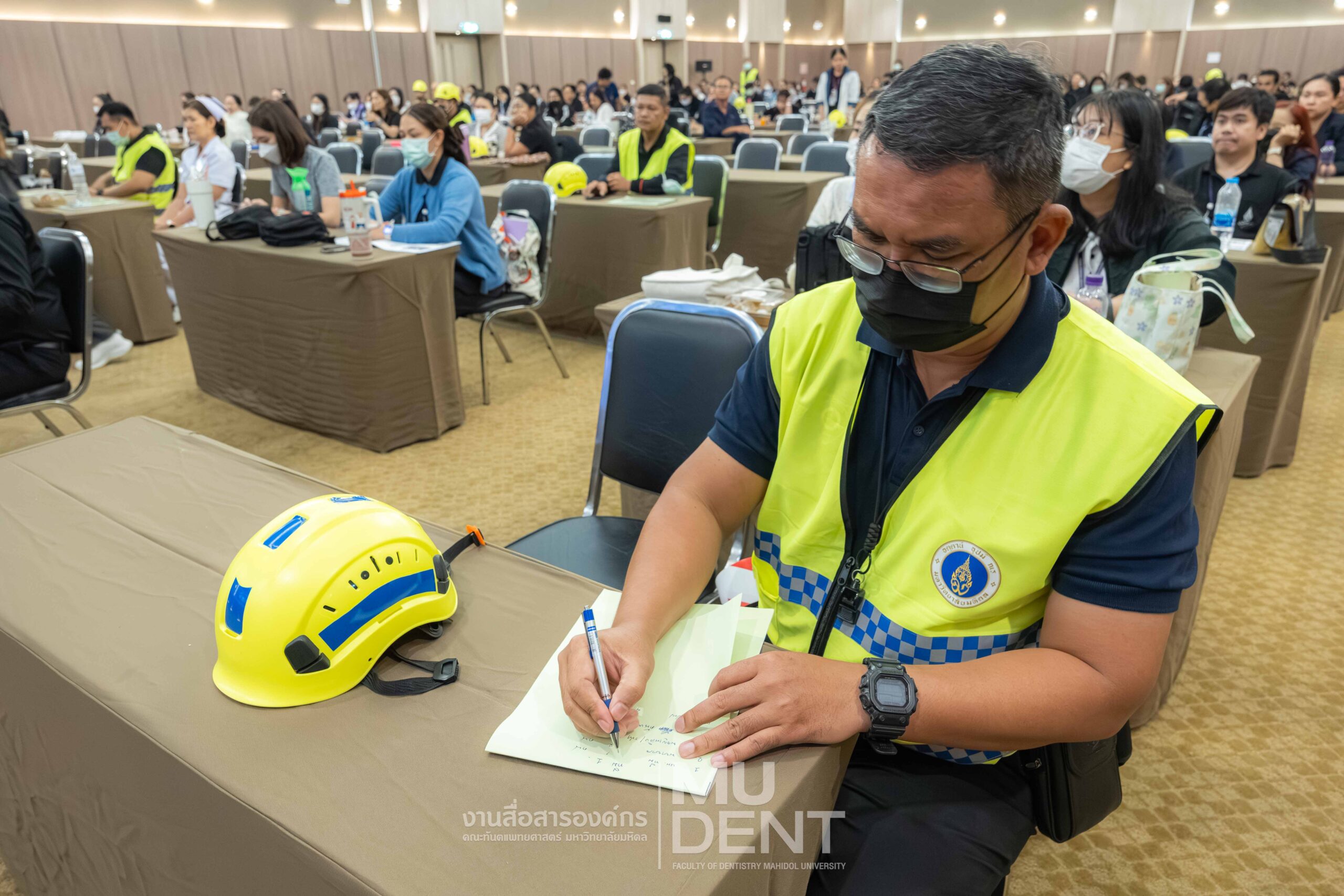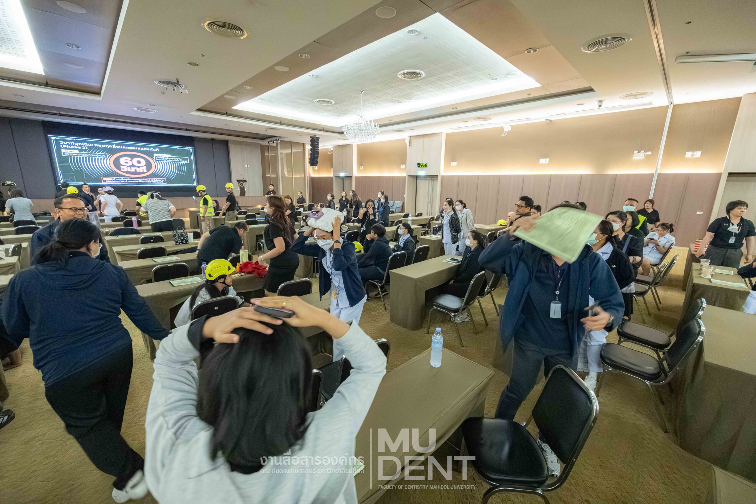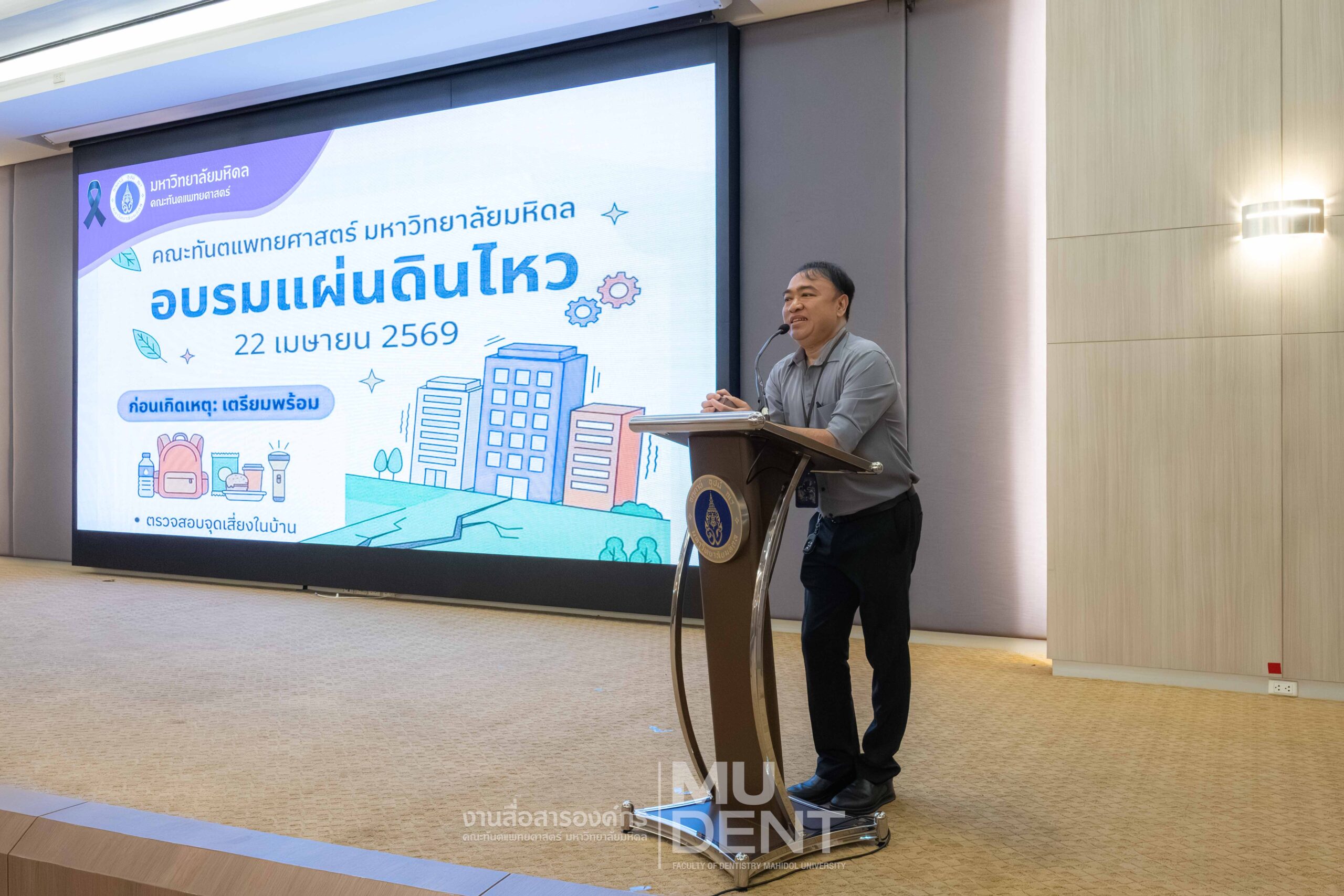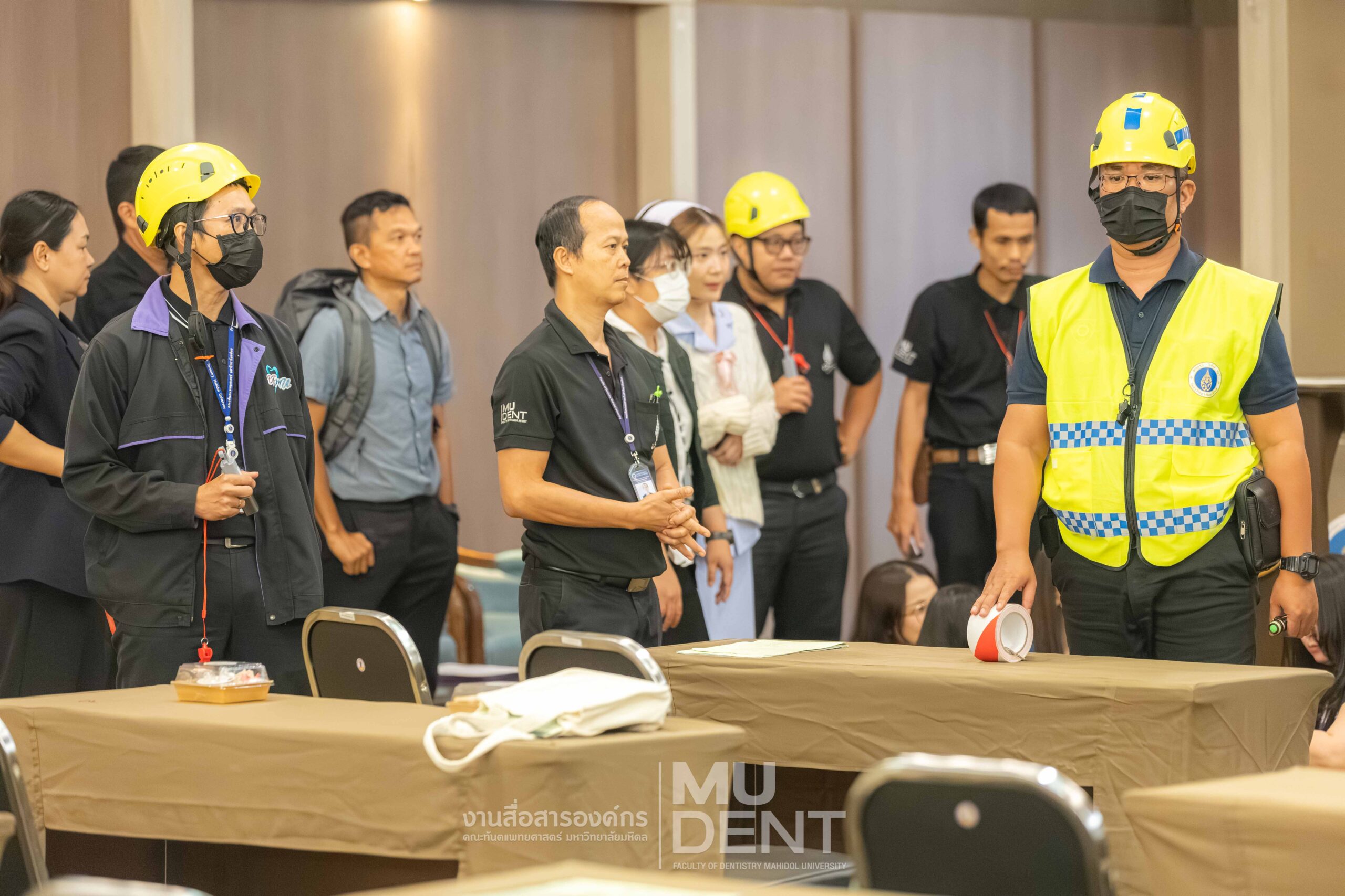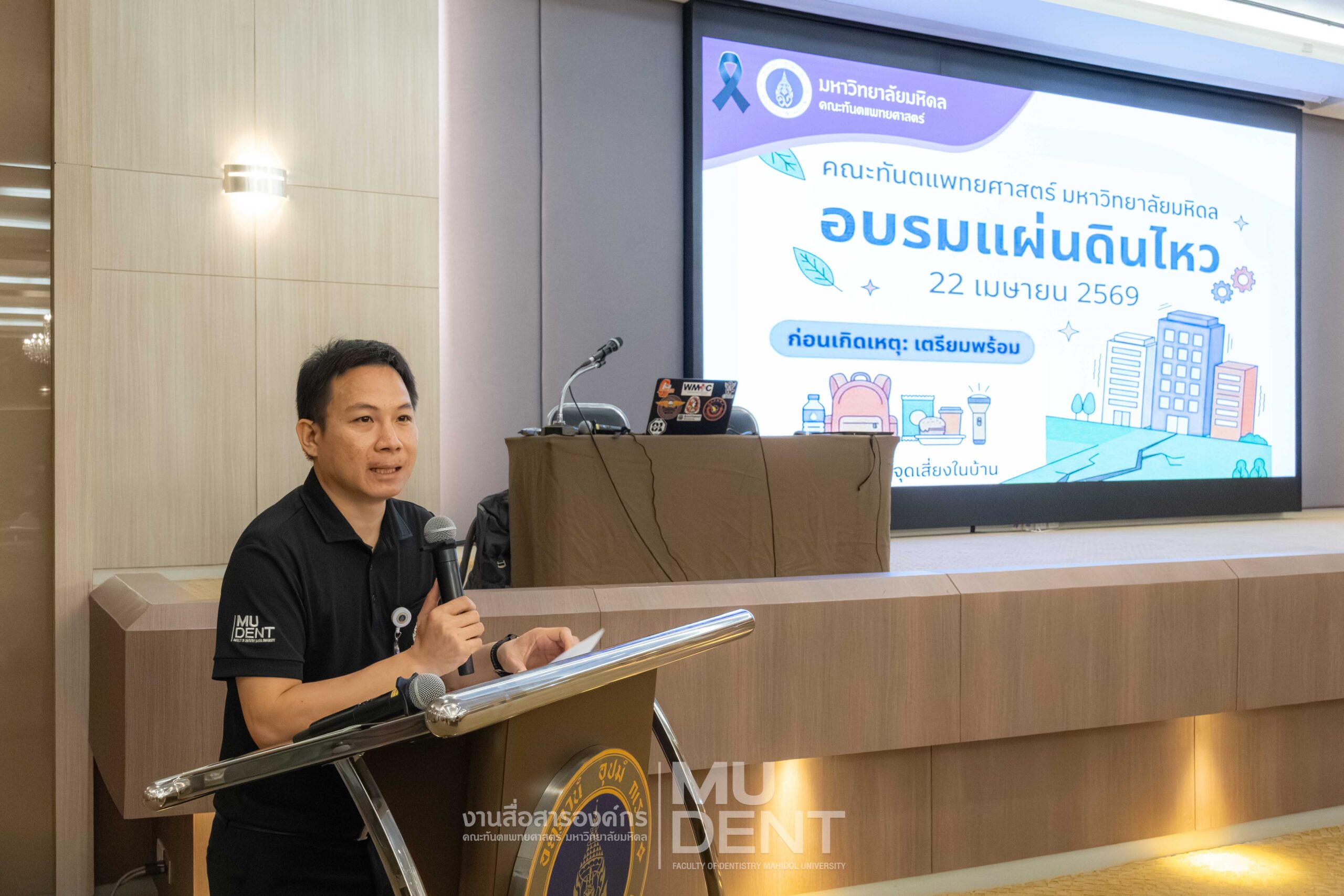 On April 22, 2026, Faculty of Dentistry, Mahidol University (DTMU), organized a practical workshop titled “Earthquake Emergency Drill 2026” at the Debaratana Auditorium, 4th Floor, 50th Anniversary of H.R.H. Princess Maha Chakri Sirindhorn Building. Associate Professor Dr. Pisol Senawongse, Deputy Dean for Research, Facilities and Environment, presided over the opening ceremony.