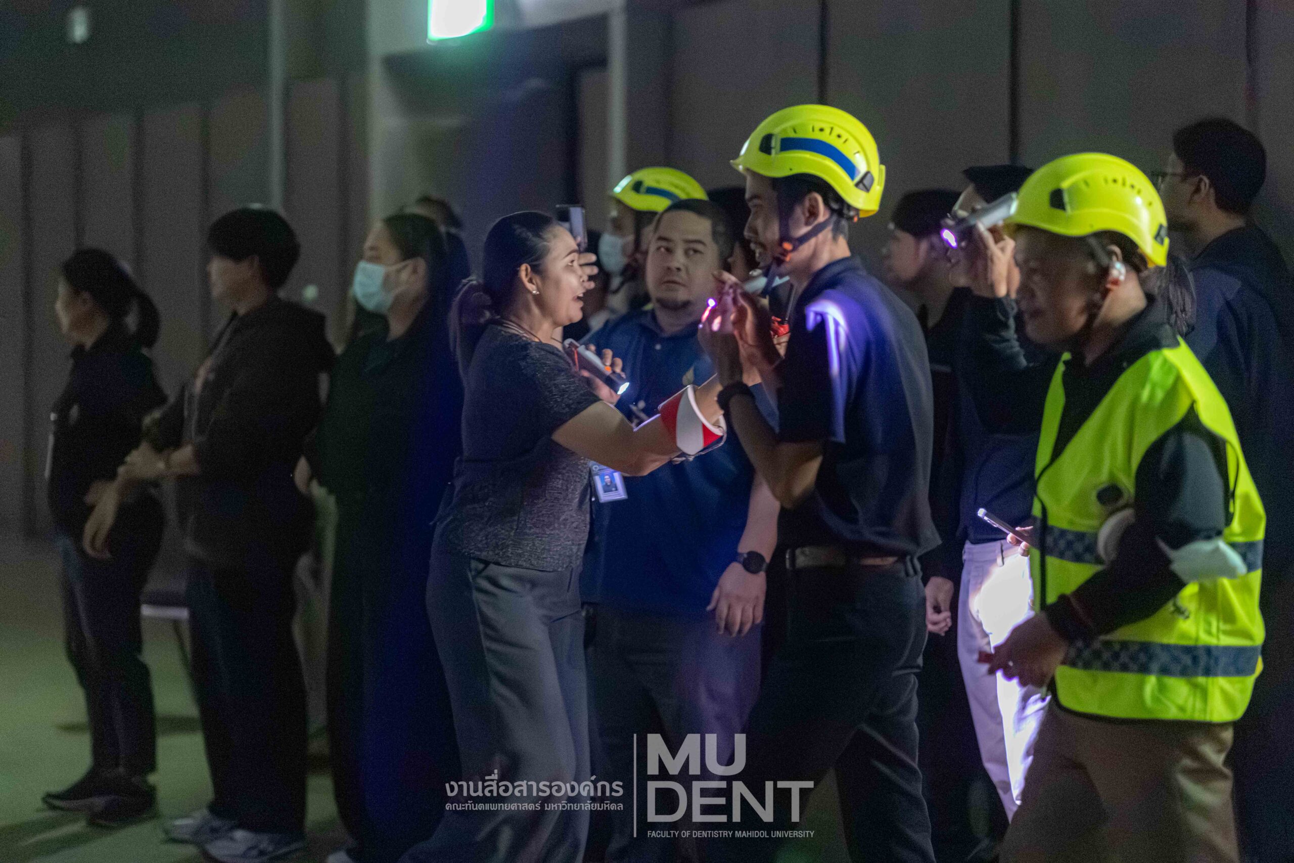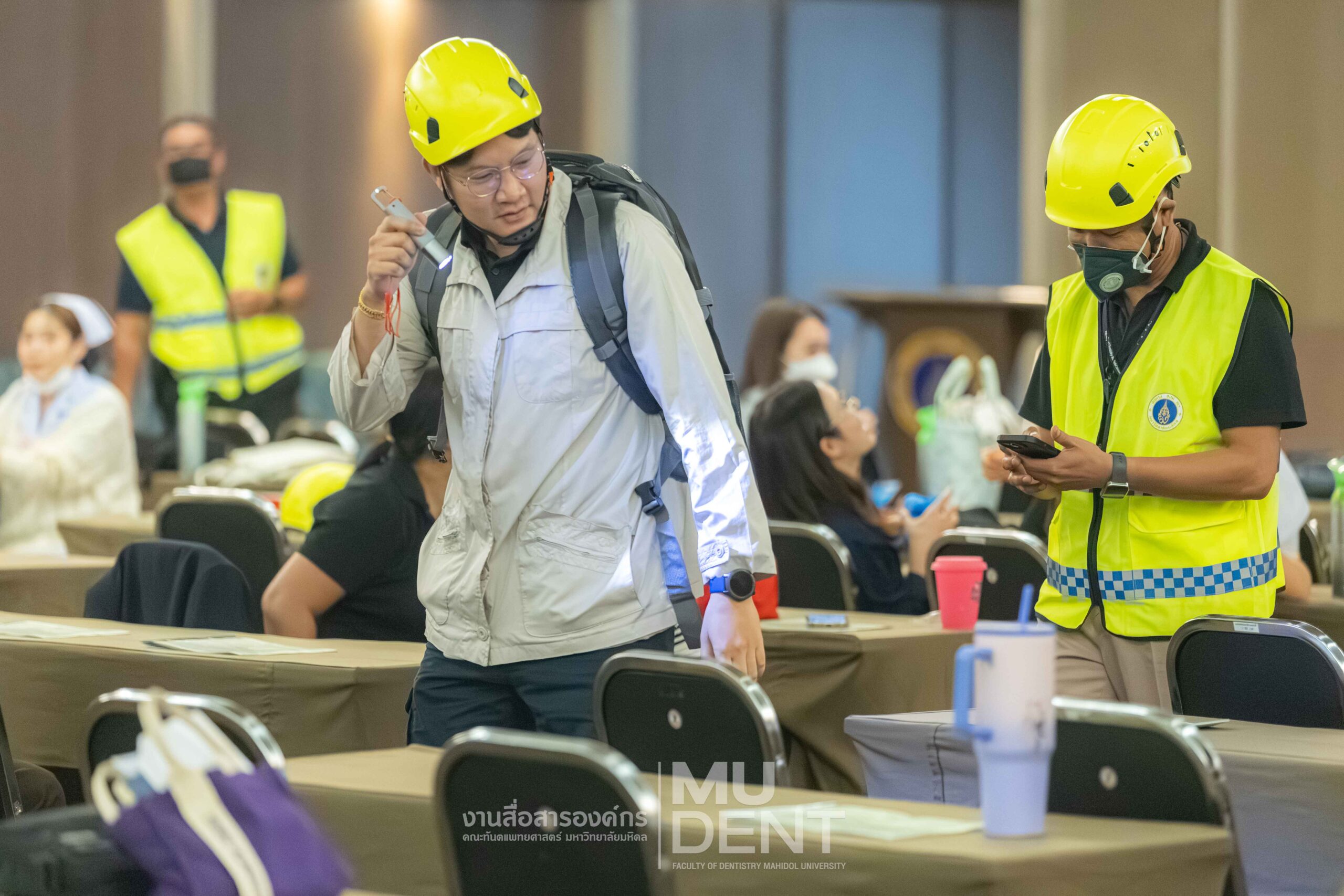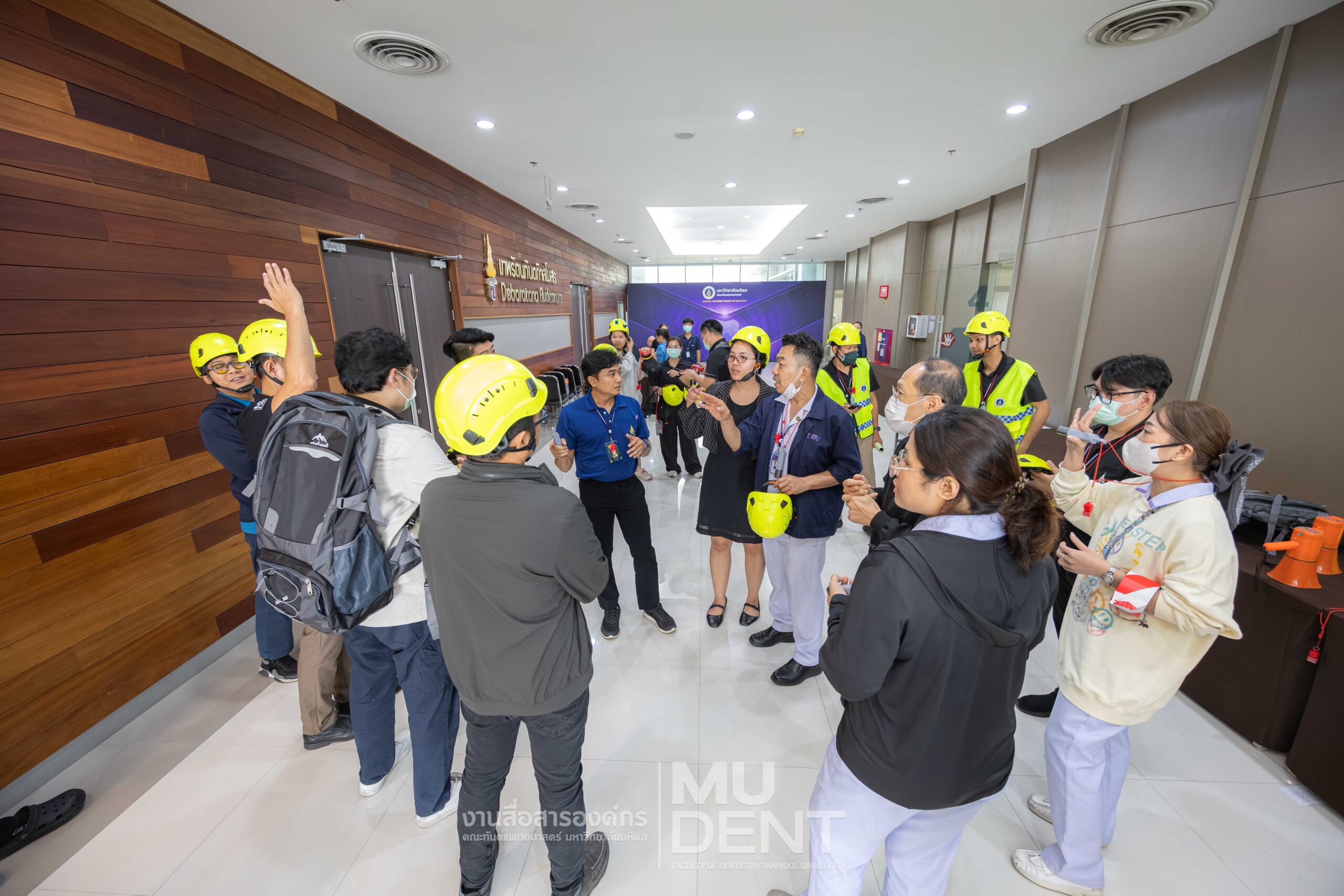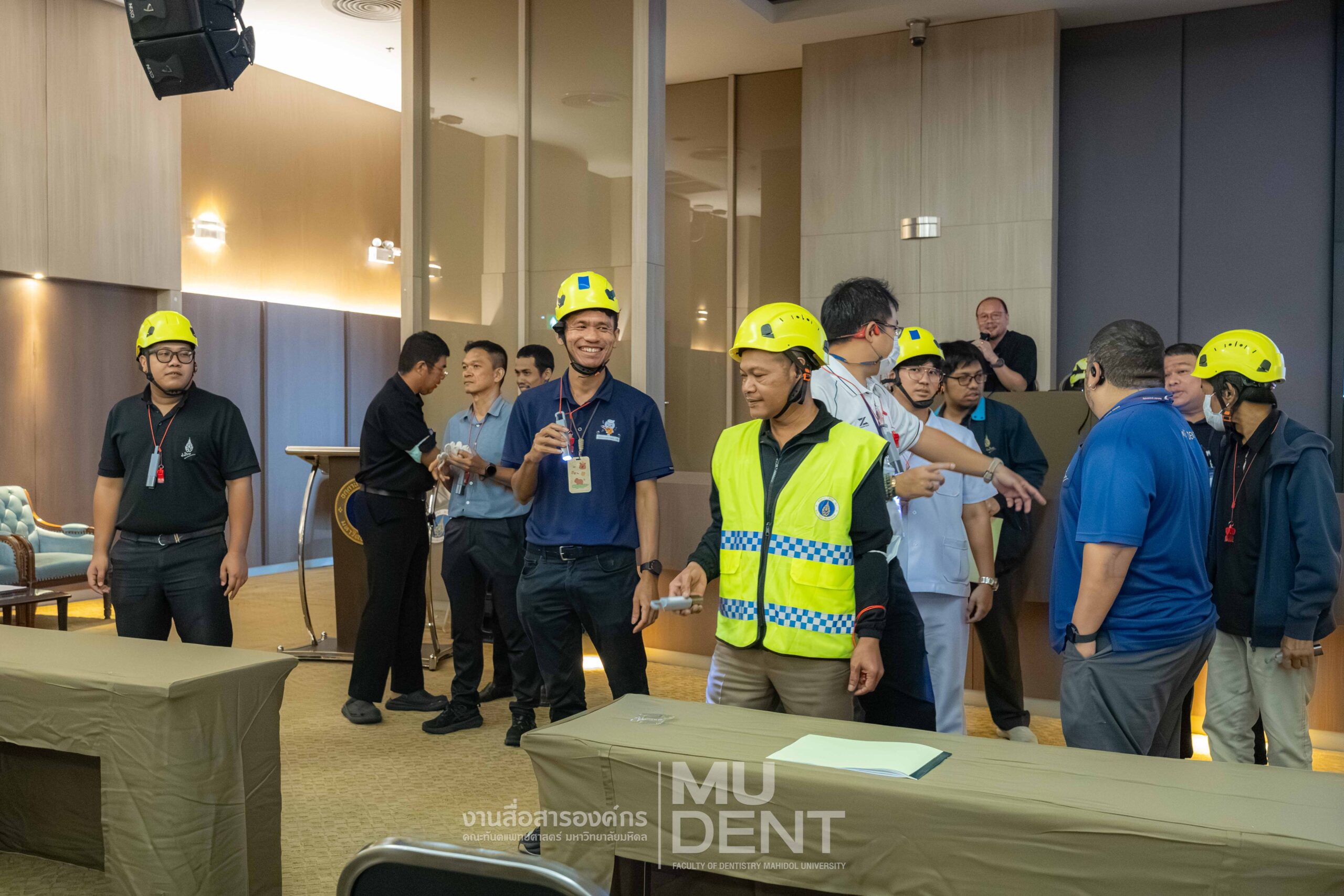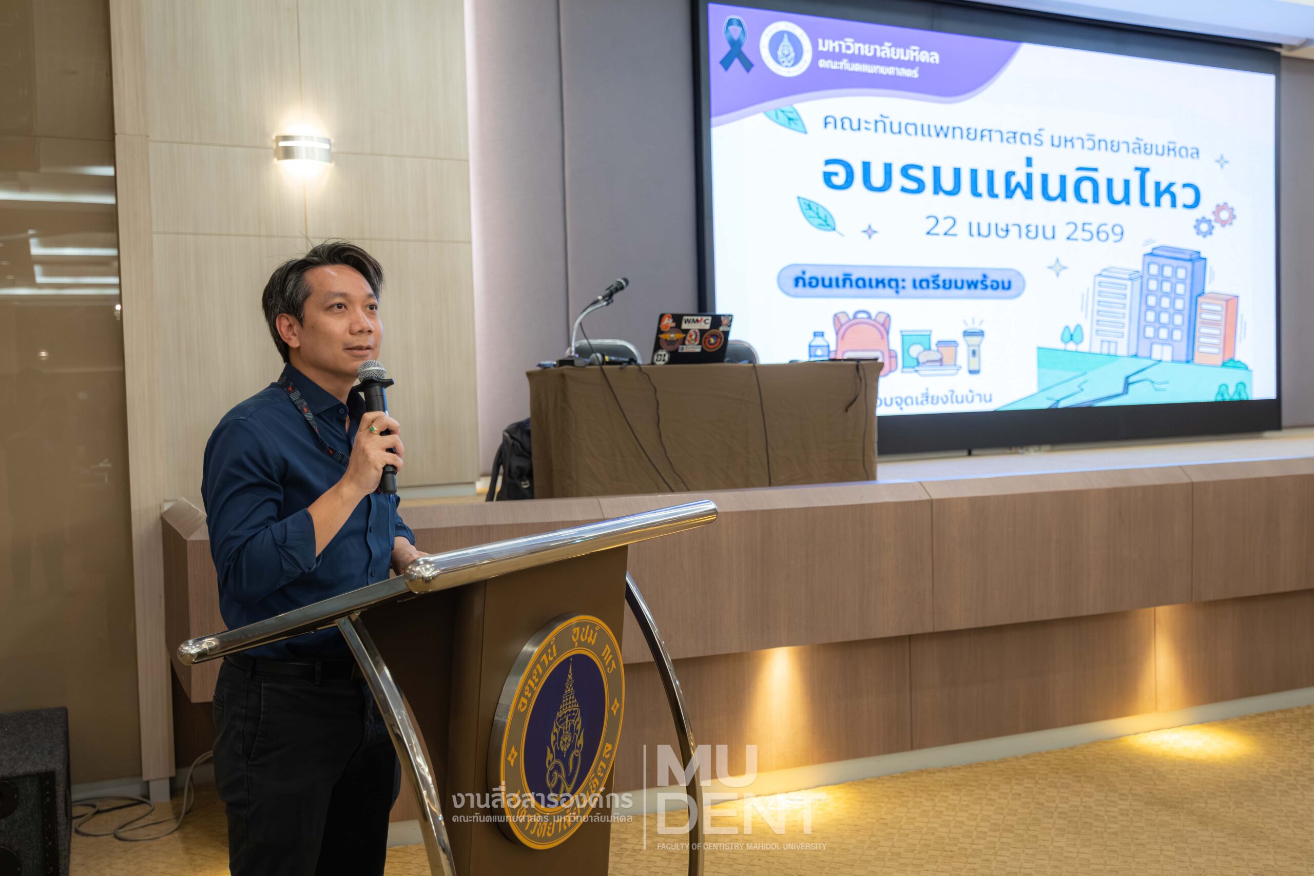 On April 22, 2026, Faculty of Dentistry, Mahidol University (DTMU), organized a practical workshop titled “Earthquake Emergency Drill 2026” at the Debaratana Auditorium, 4th Floor, 50th Anniversary of H.R.H. Princess Maha Chakri Sirindhorn Building. Associate Professor Dr. Pisol Senawongse, Deputy Dean for Research, Facilities and Environment, presided over the opening ceremony.