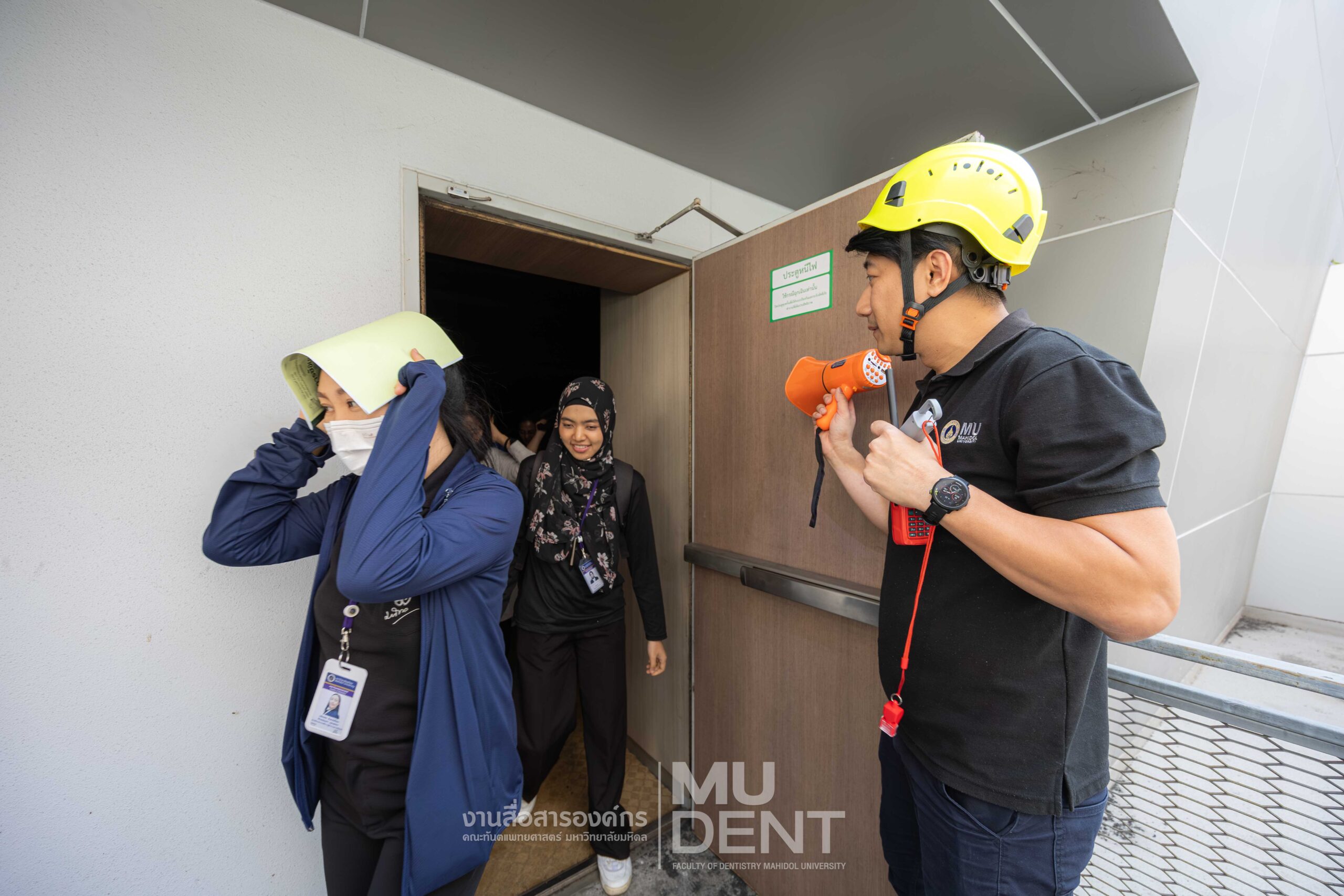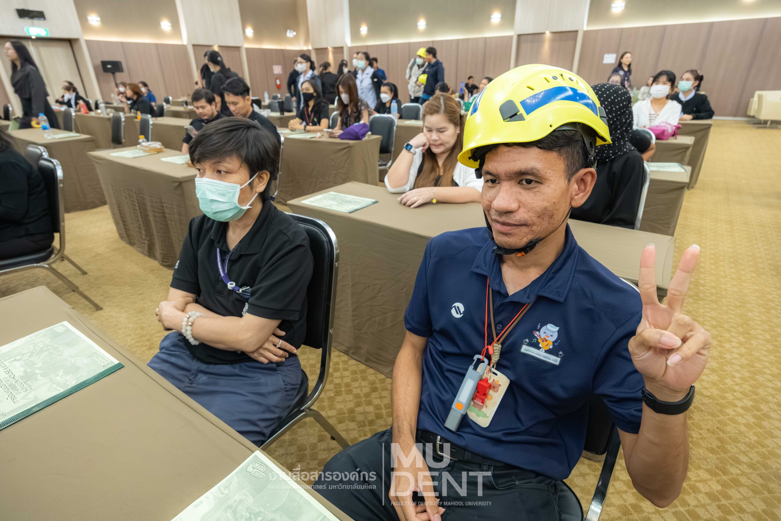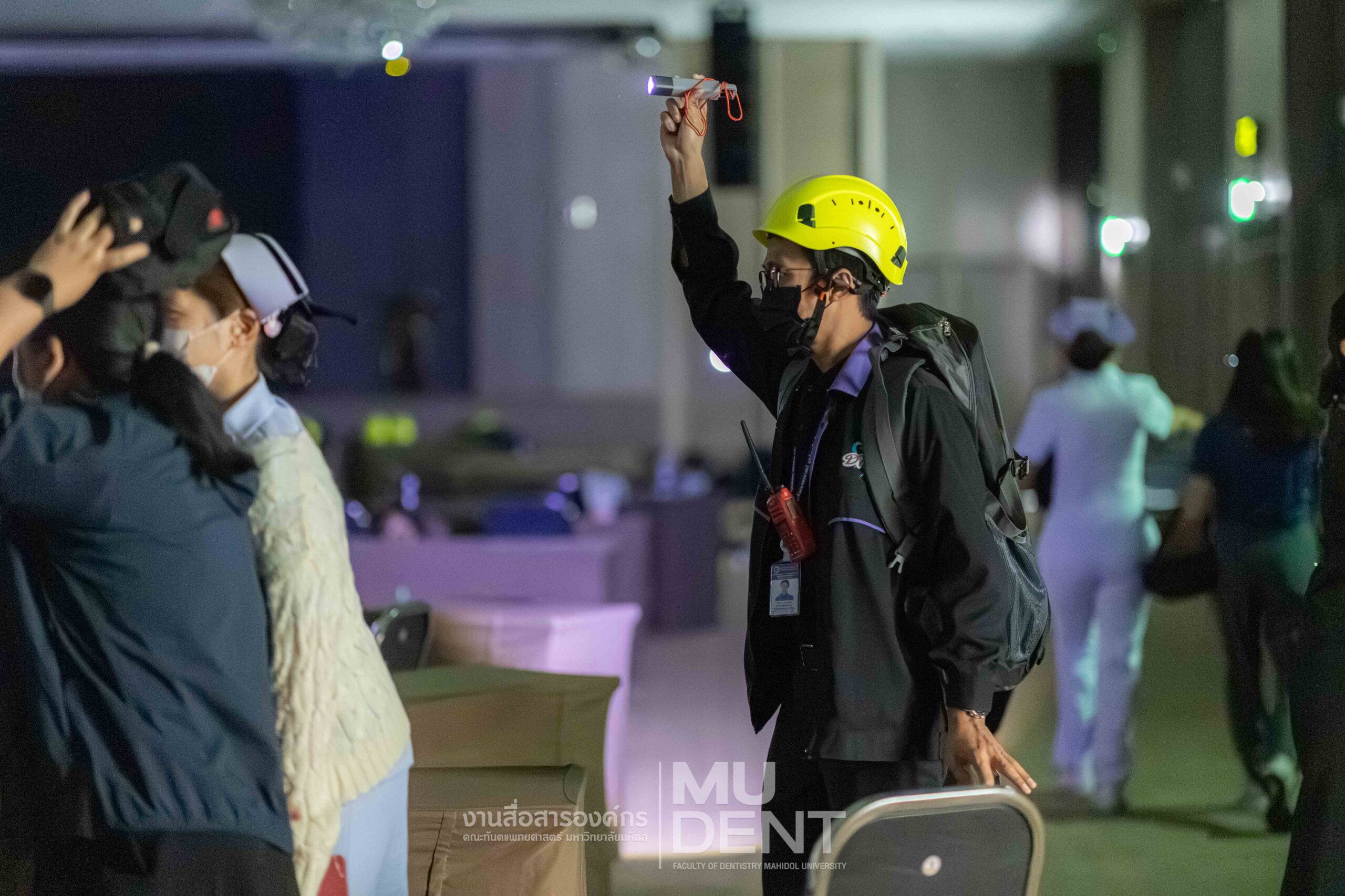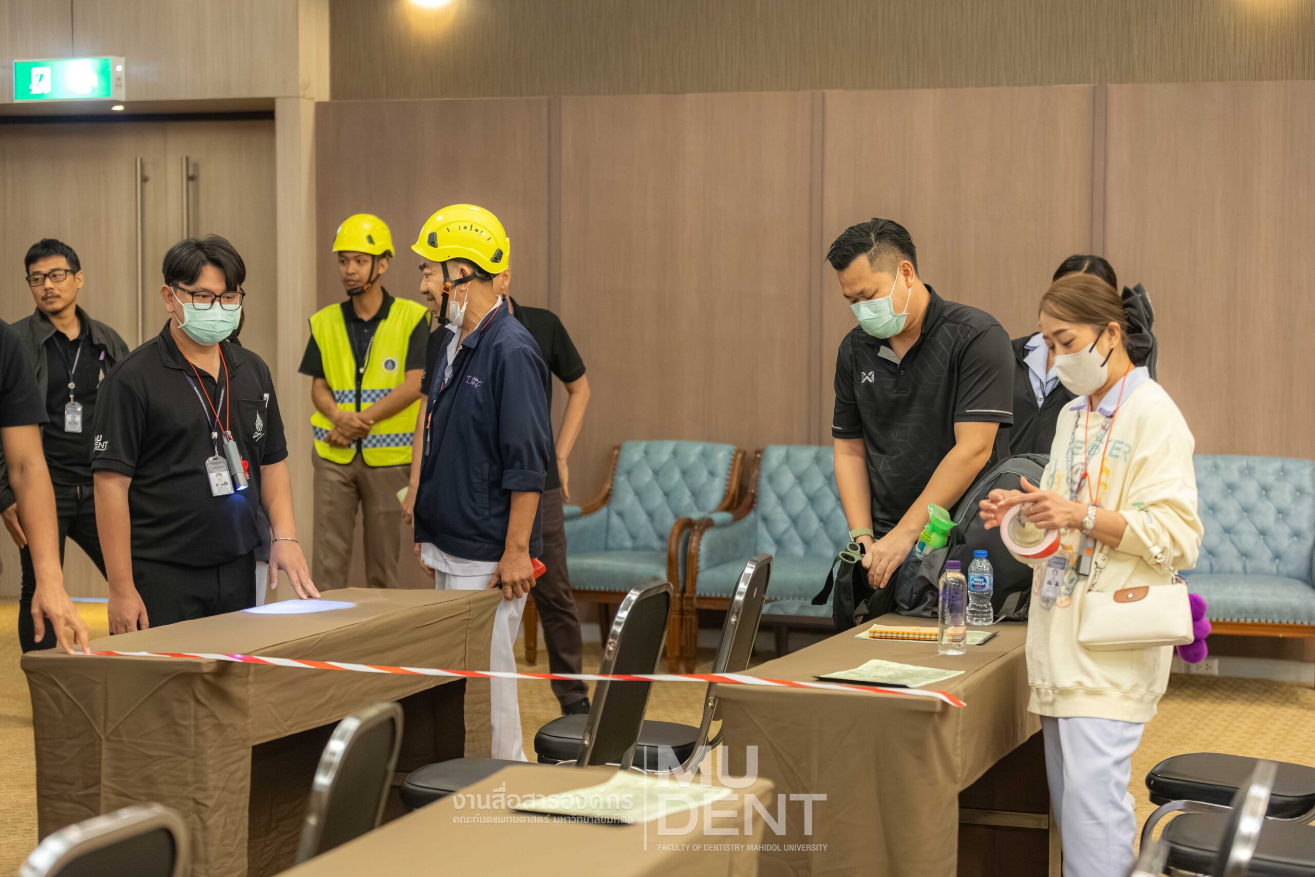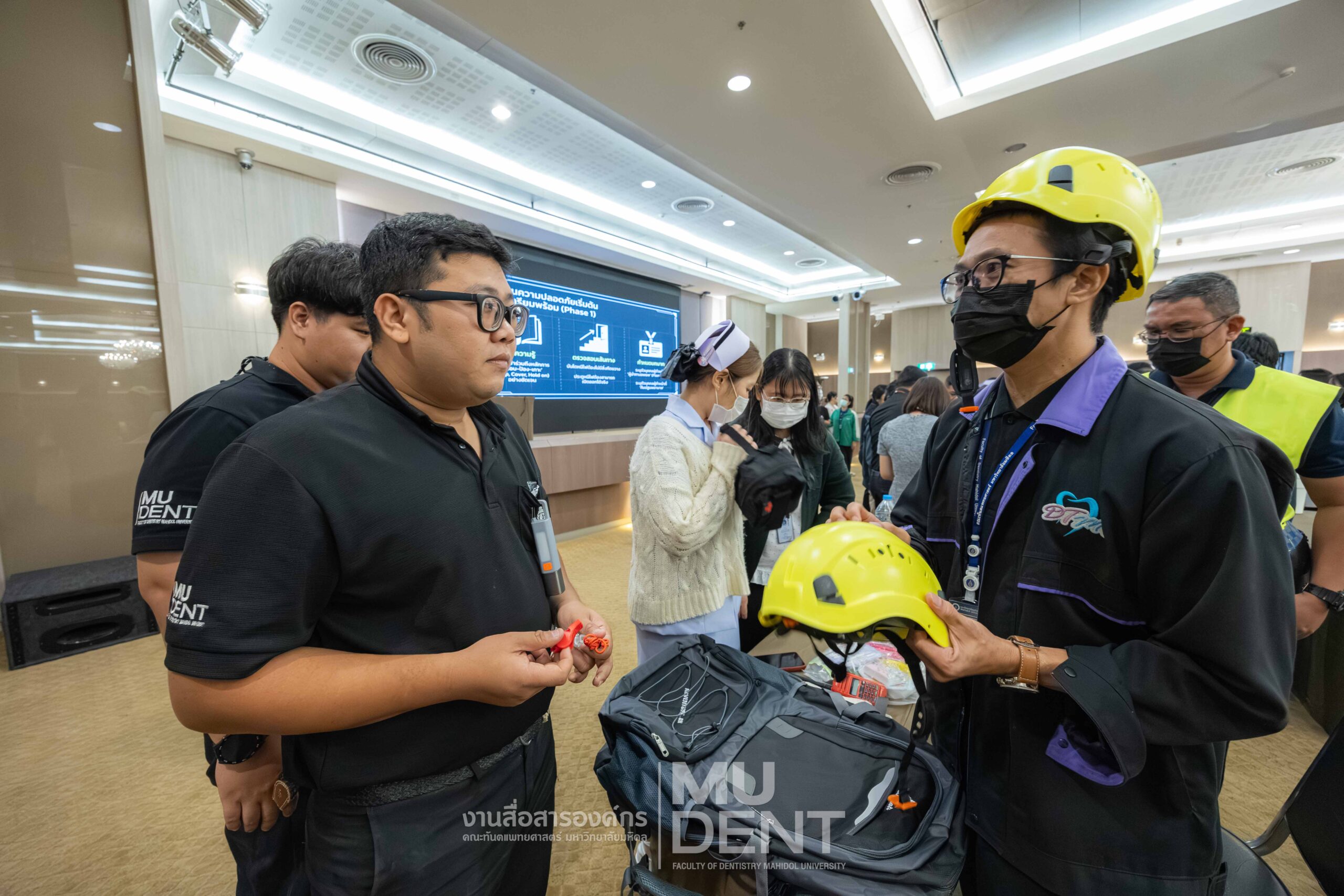 On April 22, 2026, Faculty of Dentistry, Mahidol University (DTMU), organized a practical workshop titled “Earthquake Emergency Drill 2026” at the Debaratana Auditorium, 4th Floor, 50th Anniversary of H.R.H. Princess Maha Chakri Sirindhorn Building. Associate Professor Dr. Pisol Senawongse, Deputy Dean for Research, Facilities and Environment, presided over the opening ceremony.