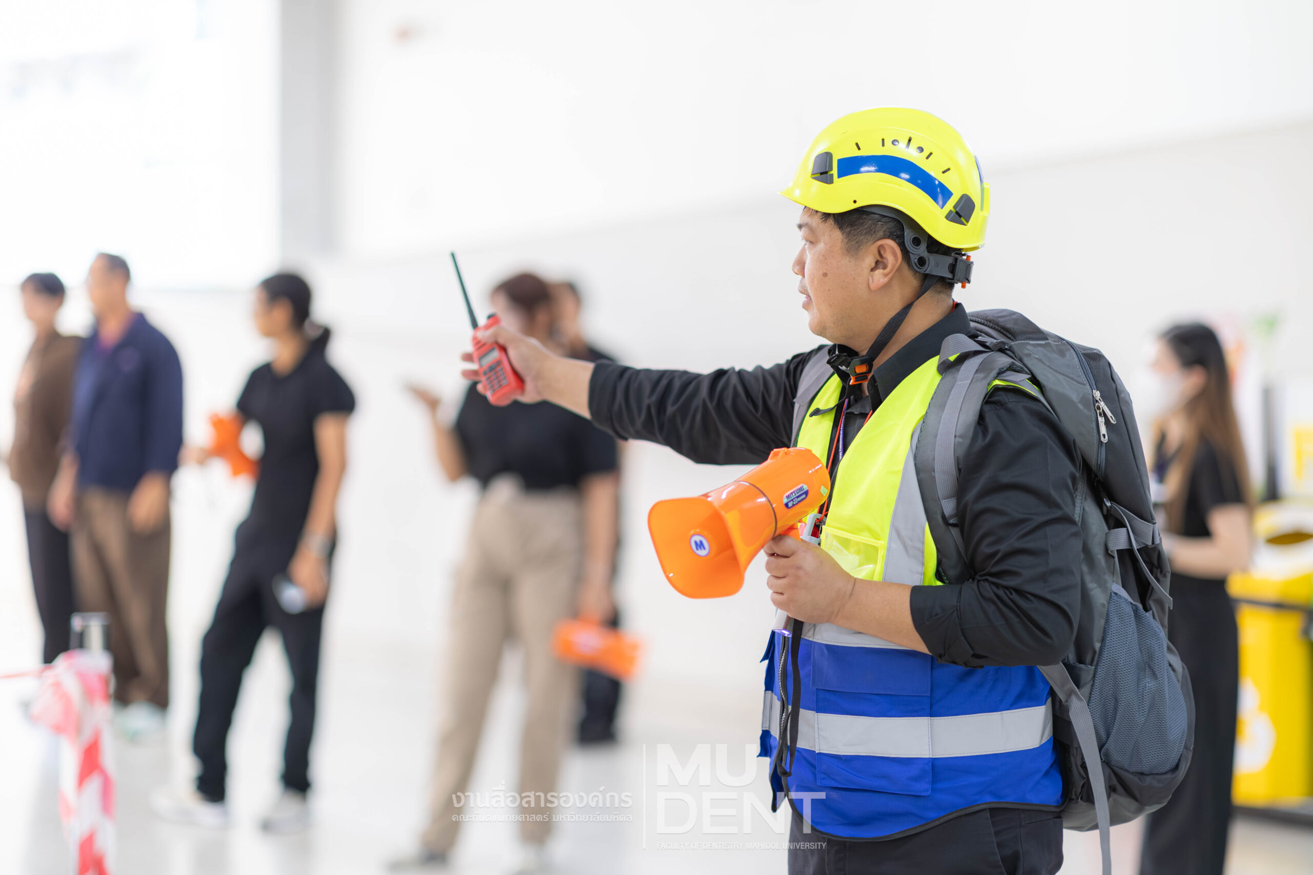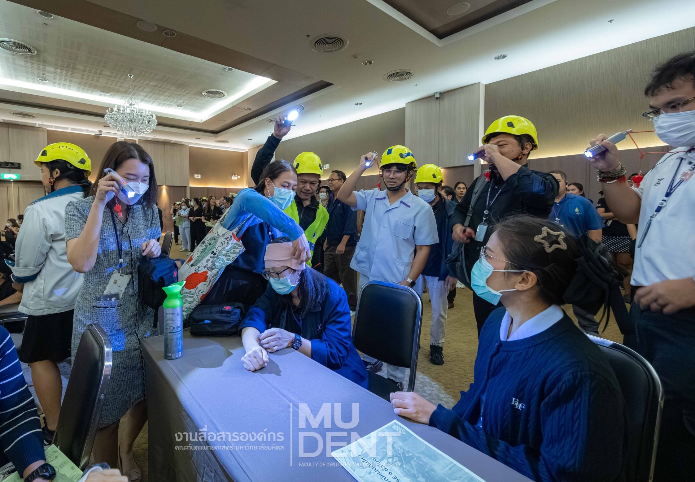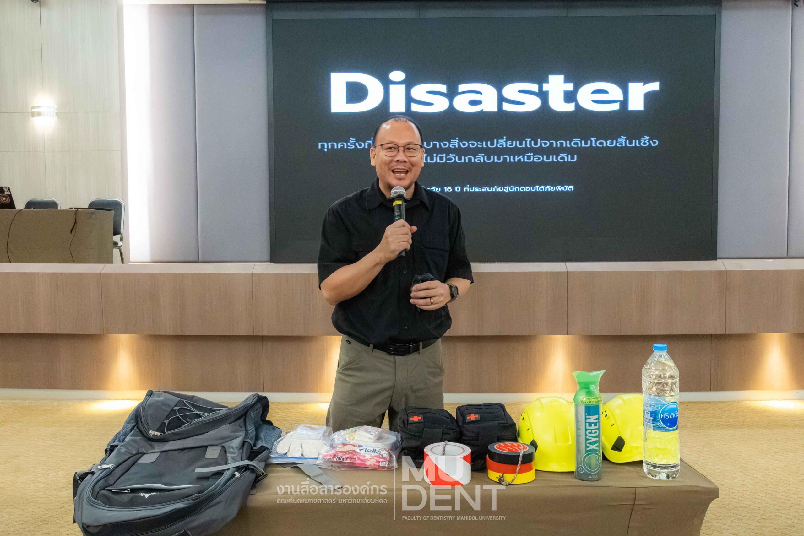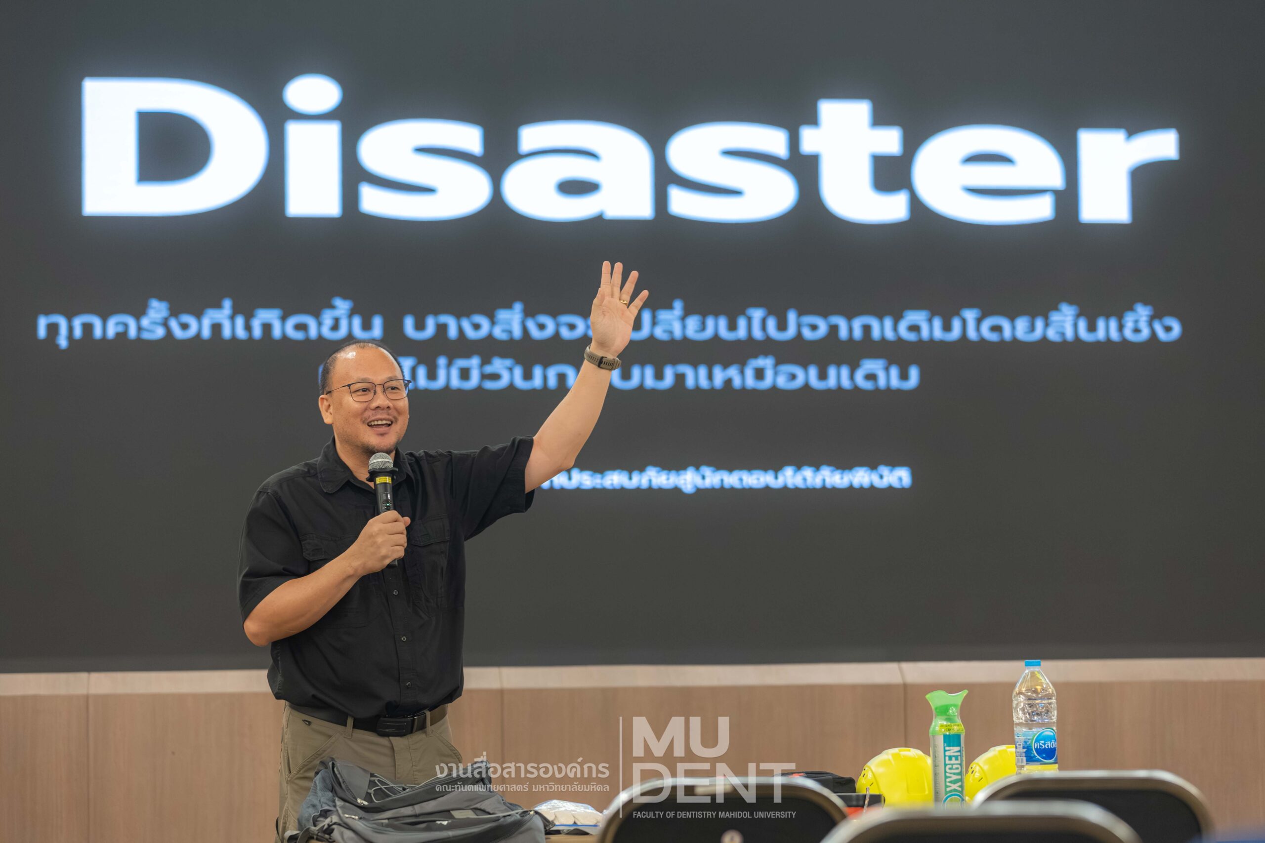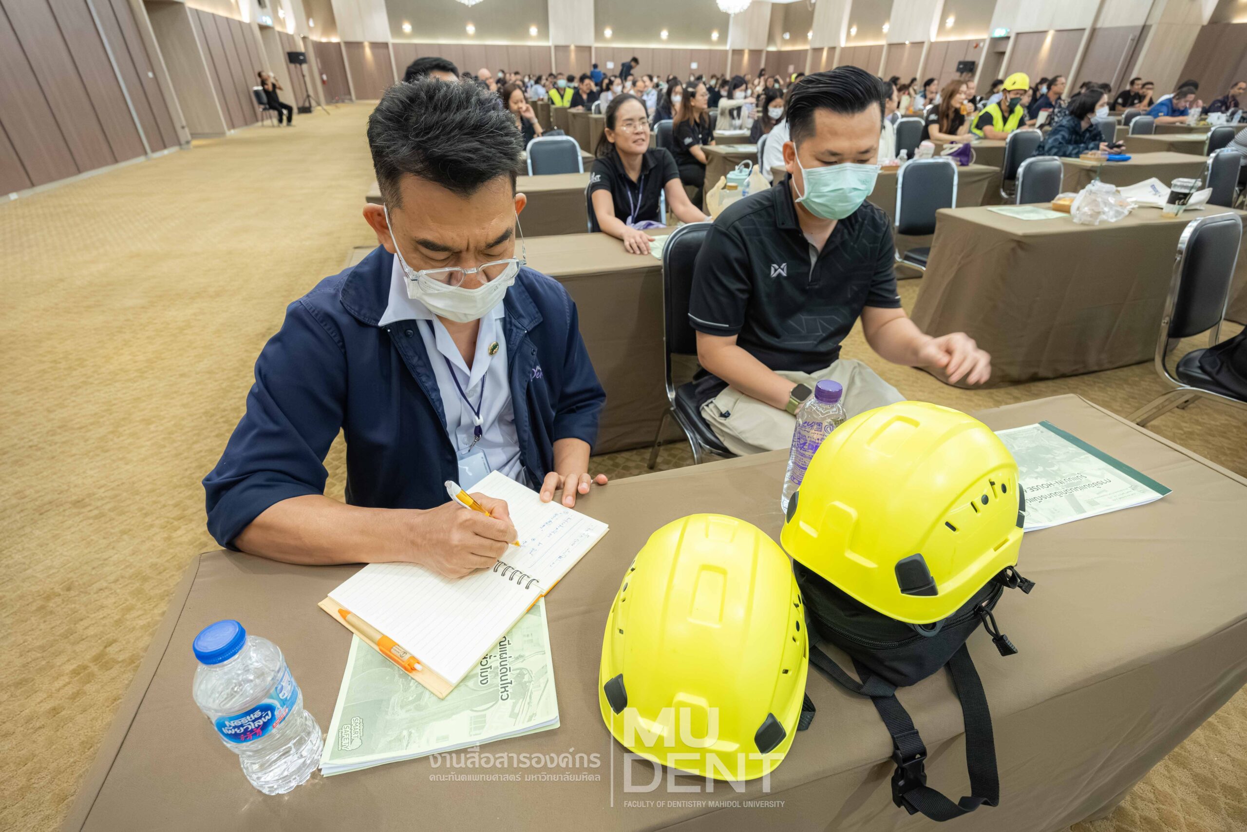 On April 22, 2026, Faculty of Dentistry, Mahidol University (DTMU), organized a practical workshop titled “Earthquake Emergency Drill 2026” at the Debaratana Auditorium, 4th Floor, 50th Anniversary of H.R.H. Princess Maha Chakri Sirindhorn Building. Associate Professor Dr. Pisol Senawongse, Deputy Dean for Research, Facilities and Environment, presided over the opening ceremony.