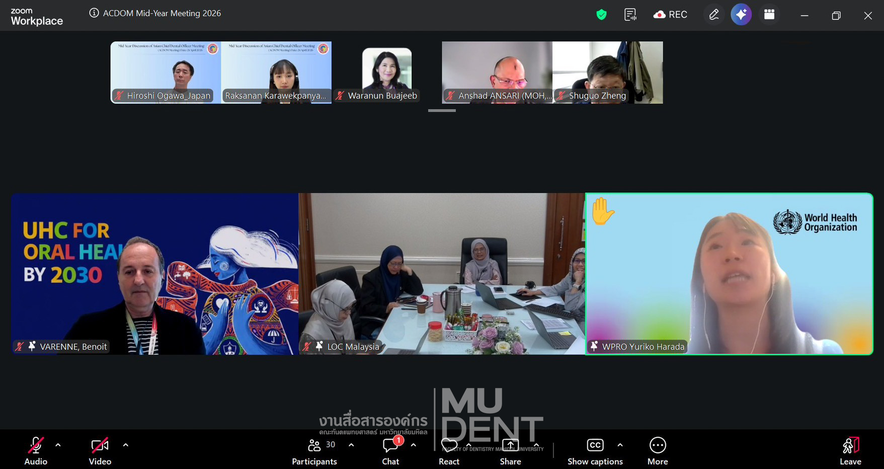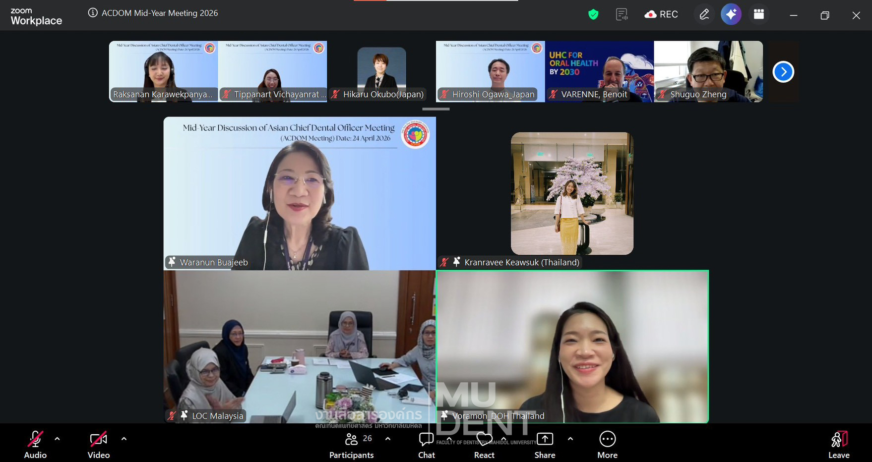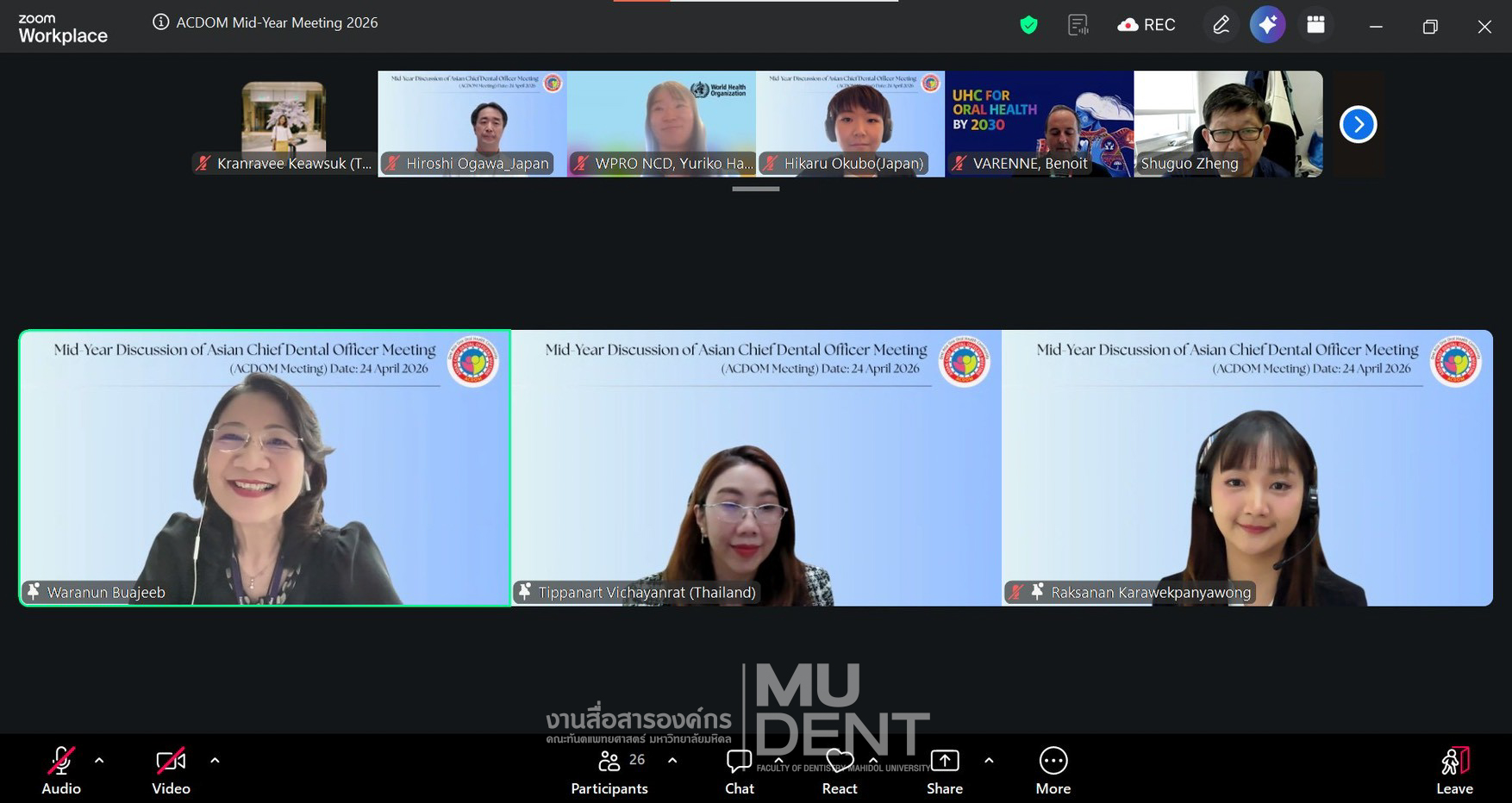 On April 24, 2026, Faculty of Dentistry, Mahidol University (DTMU), co-organized “Mid-Year Discussion of Asian Chief Dental Officers Meeting 2026” via Zoom. The delegation was led by Professor Dr. Waranun Buajeeb, Dean’s Advisor and Director of the WHO Collaborating Centre for Oral Health Education and Research at Faculty of Dentistry, Mahidol University, along with Associate Professor Dr. Tippanart Vichayanrat, Deputy Dean for International Relations and Organizational Communication and Lecturer Dr. Raksanan Karawekpanyawong from the Department of Community Dentistry, both of whom serve as WHO CC Committee Members and Co-Secretariats of ACDOM.