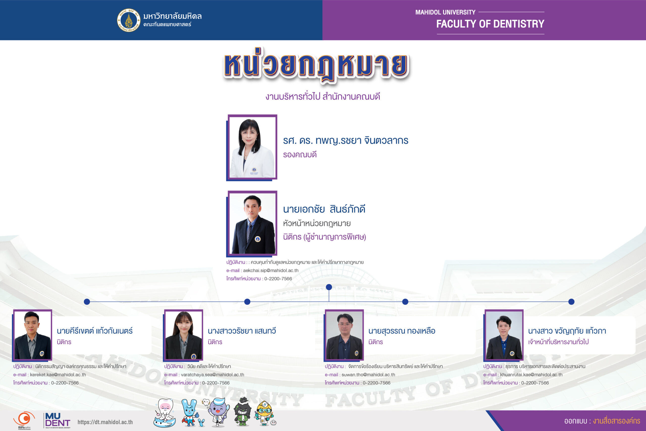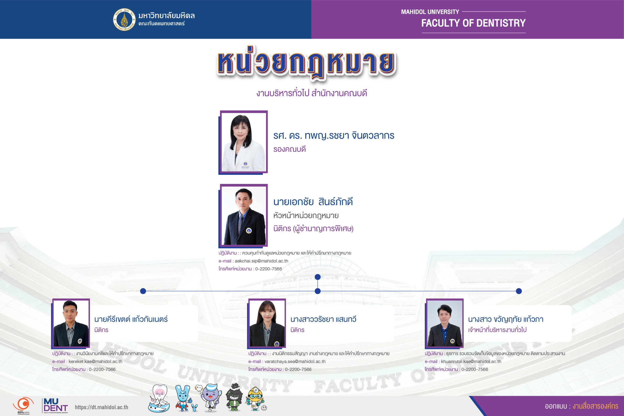 ด้วยมหาวิทยาลัยมหิดลได้ออกนอกระบบเป็นมหาวิทยาลัยในกำกับของรัฐโดยผลของกฎหมายตามพระราชบัญญัติมหาวิทยาลัยมหิดล พ.ศ.๒๕๕๐ มีการบริหารจัดการงานภายในมหาวิทยาลัย ๒ ระบบ คือ ระบบราชการเดิมสำหรับกลุ่มข้าราชการที่ยังไม่ออกนอกระบบและระบบในกำกับของรัฐสำหรับกลุ่มข้าราชการที่ปรับเปลี่ยนสถานภาพเป็นพนักงานมหาวิทยาลัย ภายใต้การบริหารจัดการงาน ๒ ระบบ ก่อให้เกิดปัญหาข้อยุ่งยากในการบริหารงานบุคคล เนื่องจากบุคลากรส่วนหนึ่งเป็นข้าราชการพลเรือนในสถาบันอุดมศึกษาซึ่งต้องใช้กฎหมายว่าด้วยการบริหารงานบุคคลตามระเบียบของทางราชการ แต่บุคลากรอีกส่วนหนึ่งซึ่งเป็นพนักงานมหาวิทยาลัยต้องใช้กฎหมายว่าด้วยการบริหารงานบุคคลตามข้อบังคับและประกาศที่ออกโดยอาศัยอำนาจของสภามหาวิทยาลัย และด้วยพันธกิจของมหาวิทยาลัยและส่วนงานที่จะต้องกำหนดกฎหมาย ข้อบังคับและประกาศ เพื่อรองรับระบบกำกับของรัฐสำหรับข้าราชการที่ปรับเปลี่ยนสถานภาพเป็นพนักงานมหาวิทยาลัยในกำกับของรัฐ คณบดีจึงเล็งเห็นความสำคัญที่คณะทันตแพทยศาสตร์ จำเป็นต้องมีหน่วยกฎหมายเพื่อปฏิบัติหน้าที่ในการสนับสนุนงานด้านกฎหมายของคณะ รวมถึงดูแล แก้ปัญหา และเสนอแนะแนวทางเกี่ยวกับการปรับปรุง เปลี่ยนแปลงกฎหมายภายในคณะ ตลอดจนให้คำปรึกษาทางกฎหมายแก่ผู้บริหารและผู้ปฏิบัติงานของคณะ ซึ่งงานด้านกฎหมายจะมีนิติกรเป็นผู้ดูแลรับผิดชอบ จึงได้มีบัญชาให้จัดตั้งหน่วยกฎหมายและกำหนดให้อยู่ในโครงสร้างของ คณะทันตแพทยศาสตร์ สังกัดงานบริหารทั่วไป สำนักงานคณบดีและให้การปฏิบัติงานของนิติกรอยู่ในกำกับดูแลของคณบดีโดยตรง ซึ่งคณะกรรมการประจำคณะทันตแพทยศาสตร์ ได้มีมติเห็นชอบตามที่เสนอในการประชุมครั้งที่ ๑๑/๒๕๕๓ เมื่อวันที่ ๔ พฤศจิกายน ๒๕๕๓ จนกระทั่งเปลี่ยนวาระการดำรงตำแหน่งของผู้บริหารจึงมีนโยบายกำหนดให้หน่วยกฎหมายอยู่ภายใต้การกำกับดูแลของรองคณบดีฝ่ายทรัพยากรบุคคล ตั้งแต่ปีงบประมาณ ๒๕๖๓ เป็นต้นมาจนถึงปัจจุบัน