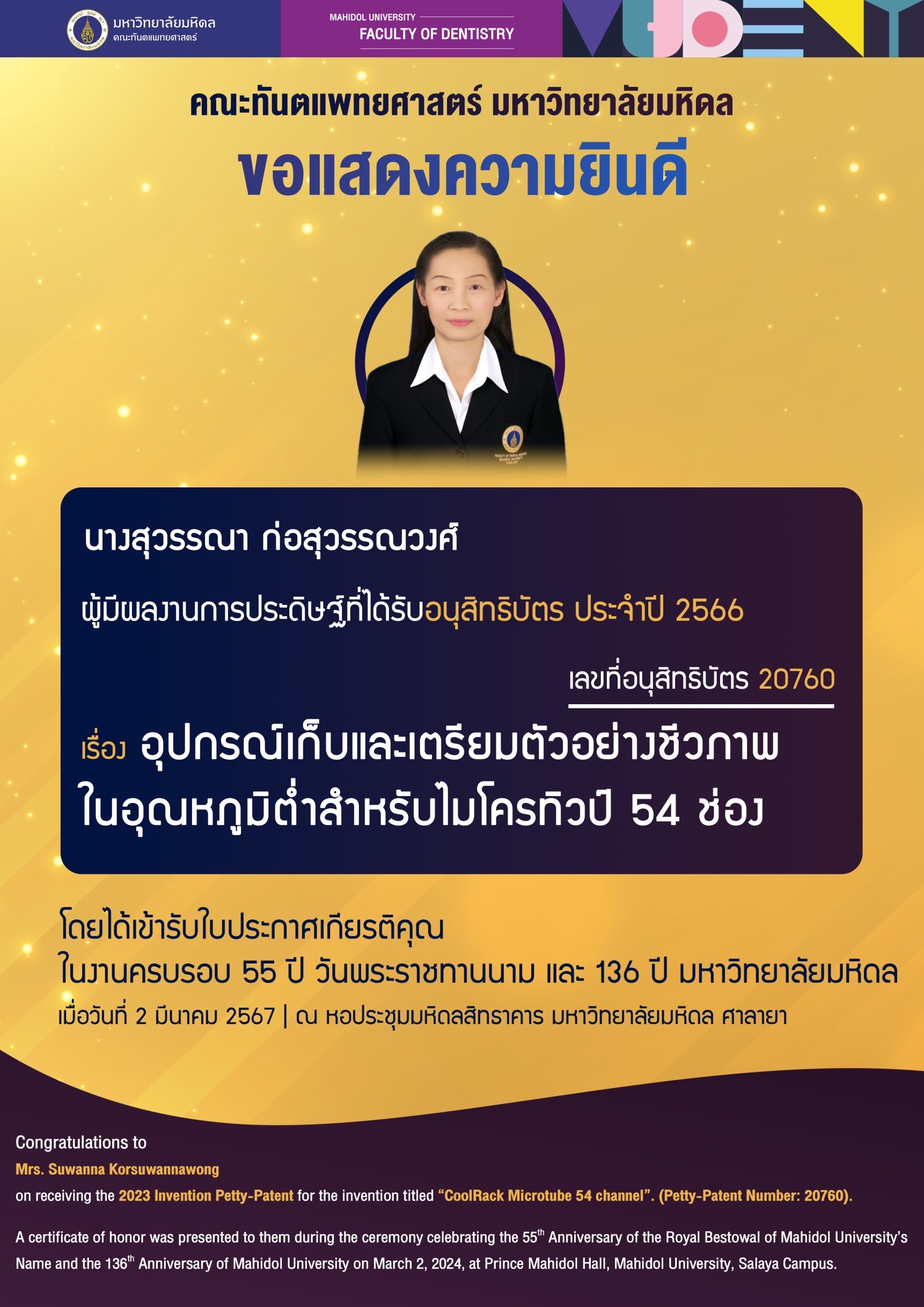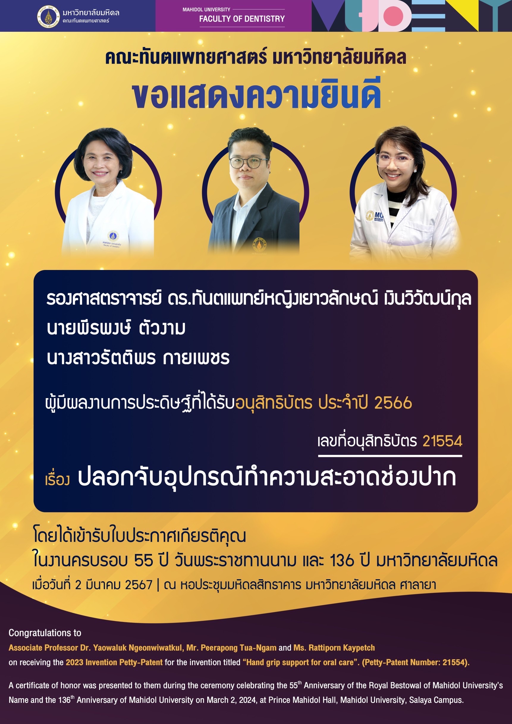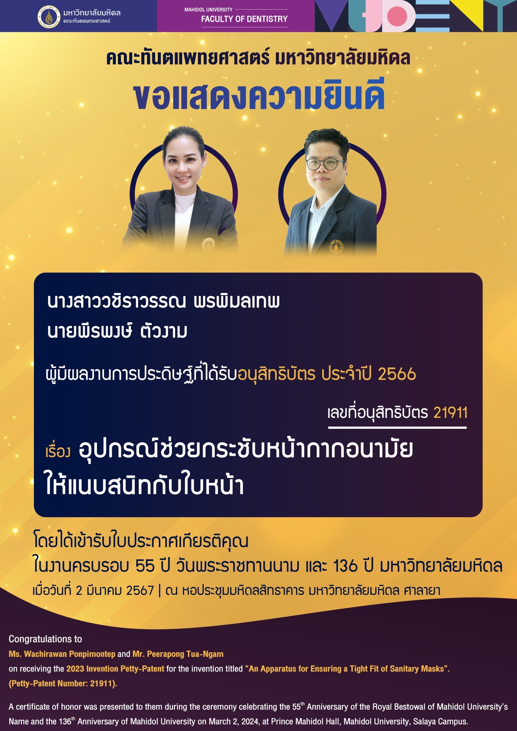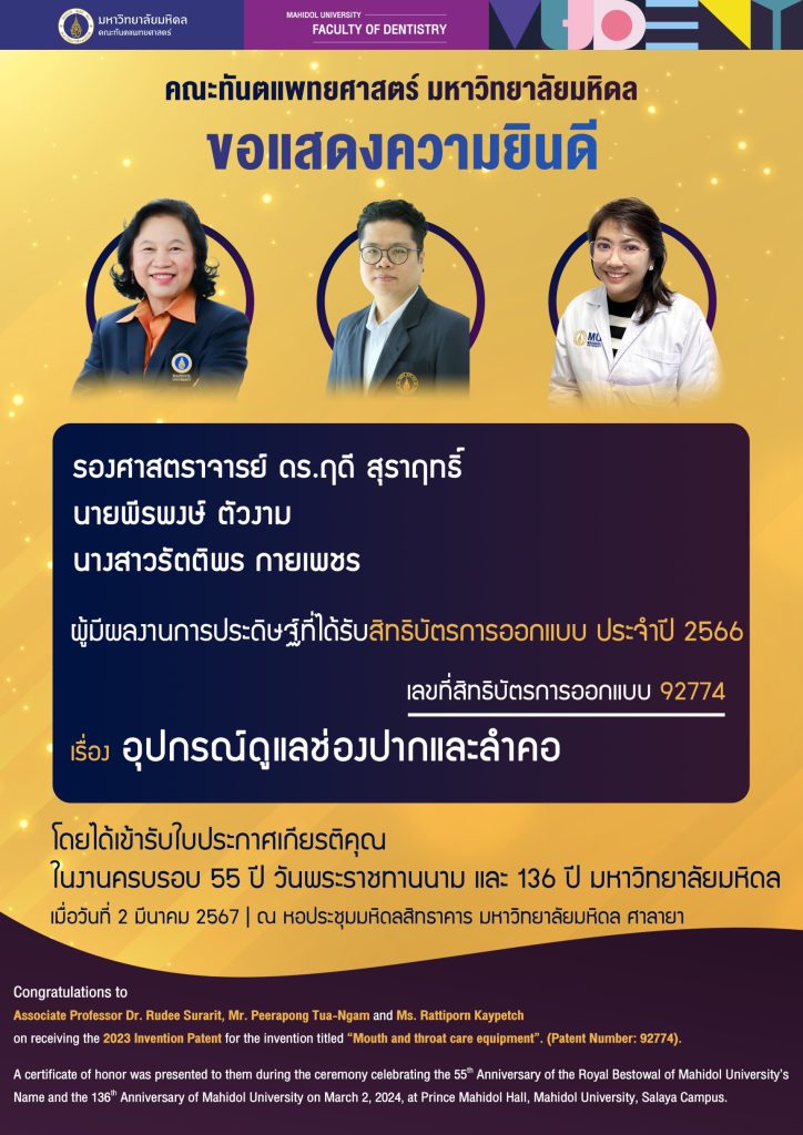 คณะทันตแพทยศาสตร์ มหาวิทยาลัยมหิดล ขอร่วมแสดงความยินดีกับบุคลากร ผู้ได้รับประกาศเกียรติคุณ ผลงานการประดิษฐ์คิดค้นที่ได้รับหนังสือ รับรองการจดทะเบียนสิทธิบัตร/อนุสิทธิบัตร จากกรมทรัพย์สินทางปัญญา ประจำปี 2566 ในงานครบรอบ 55 ปีวันพระราชทานนาม และ 136 ปี มหาวิทยาลัยมหิดล เมื่อวันที่ 2 มีนาคม 2567