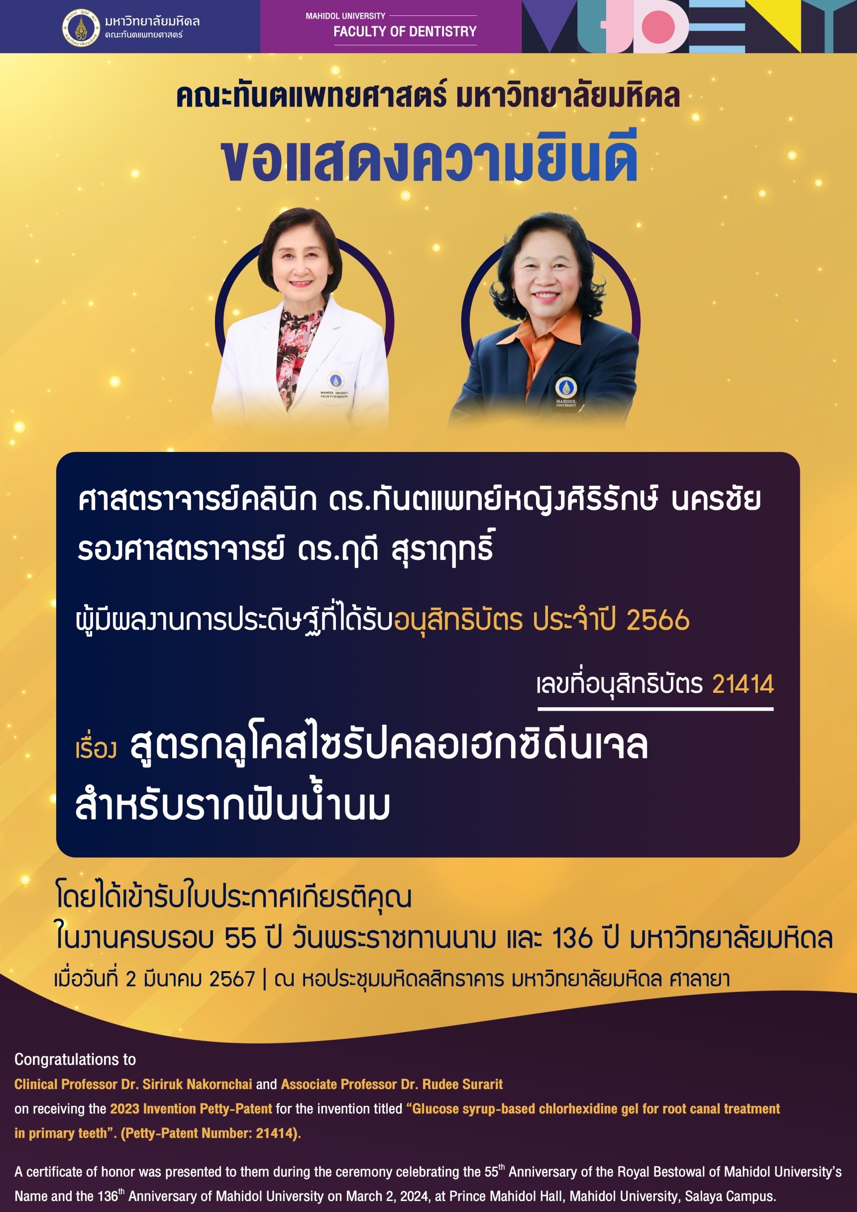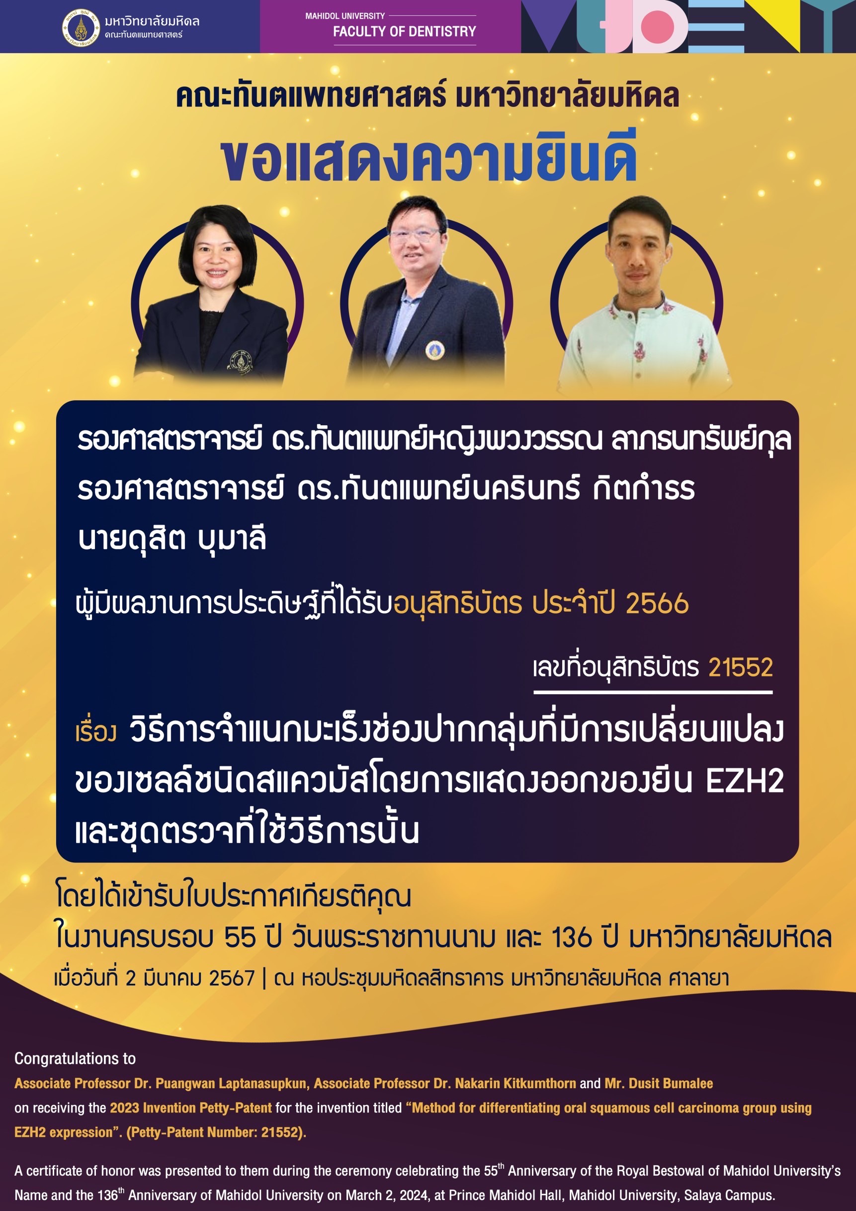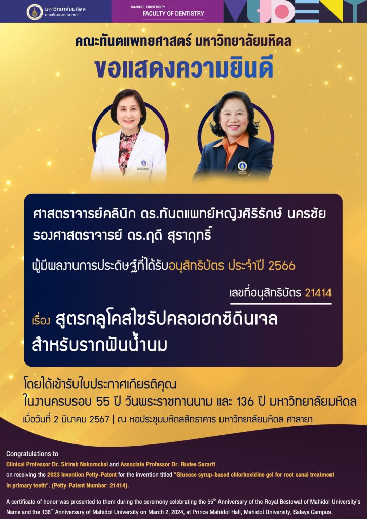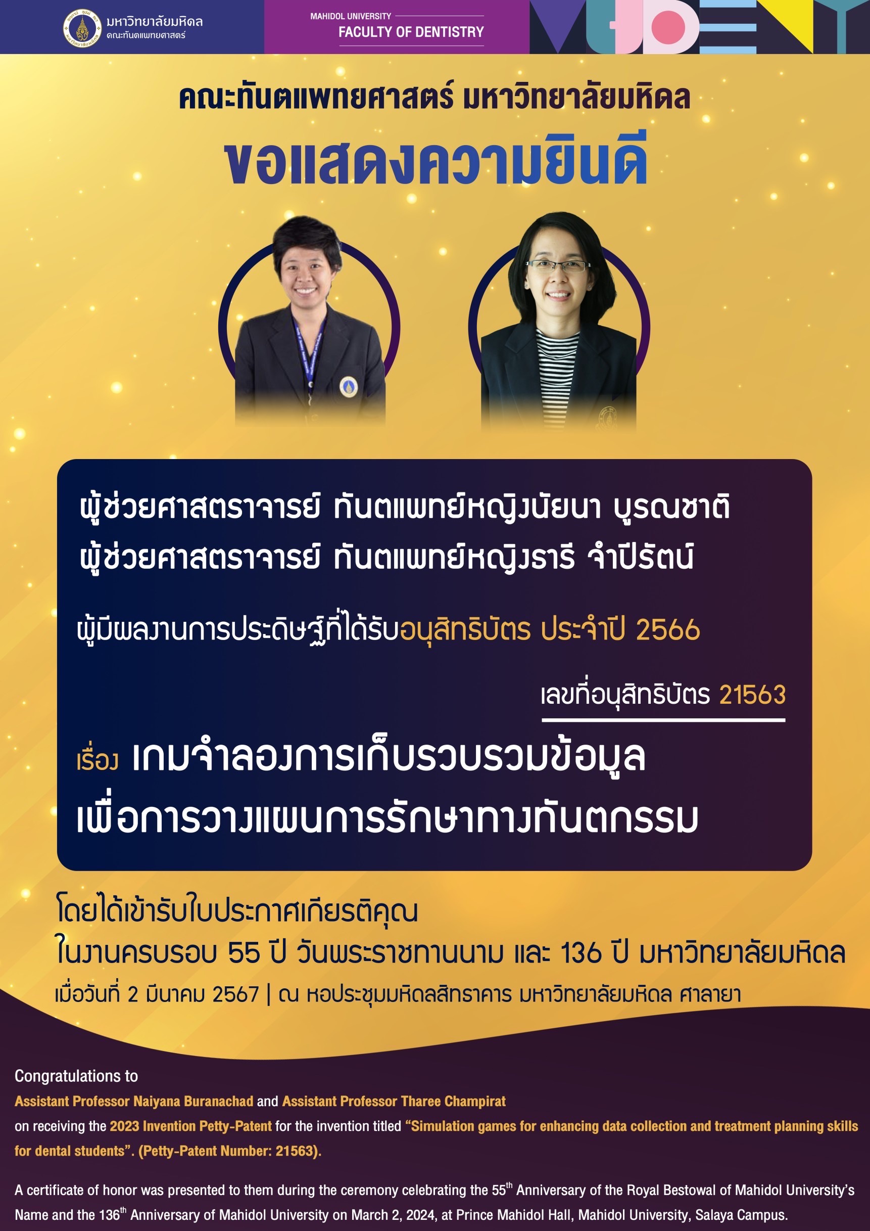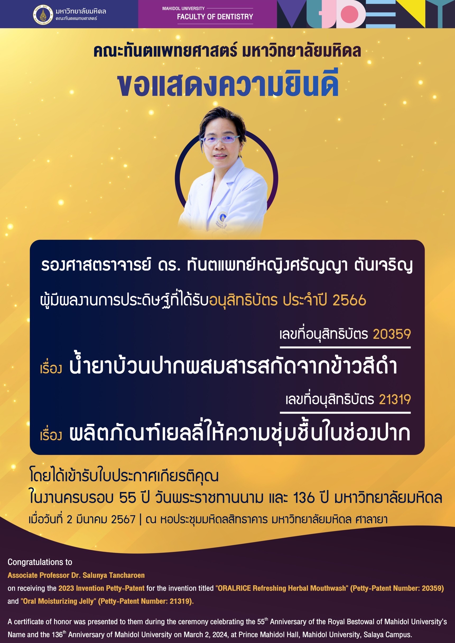 คณะทันตแพทยศาสตร์ มหาวิทยาลัยมหิดล ขอร่วมแสดงความยินดีกับบุคลากร ผู้ได้รับประกาศเกียรติคุณ ผลงานการประดิษฐ์คิดค้นที่ได้รับหนังสือ รับรองการจดทะเบียนสิทธิบัตร/อนุสิทธิบัตร จากกรมทรัพย์สินทางปัญญา ประจำปี 2566 ในงานครบรอบ 55 ปีวันพระราชทานนาม และ 136 ปี มหาวิทยาลัยมหิดล เมื่อวันที่ 2 มีนาคม 2567
