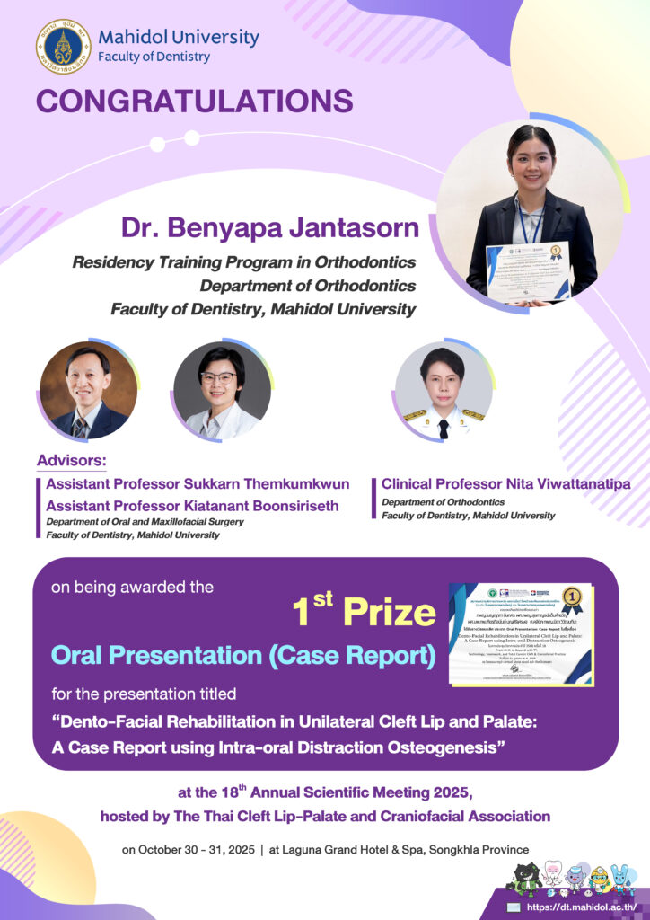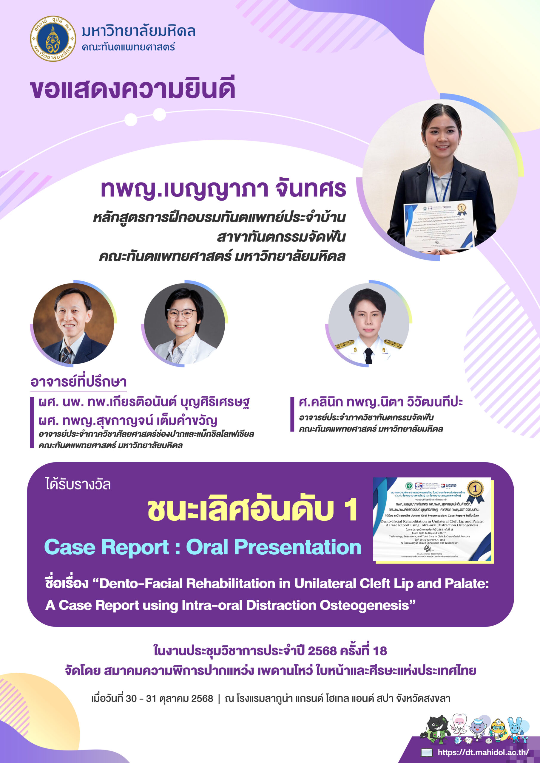 ขอแสดงความยินดี ทันตแพทย์หญิงเบญญาภา จันทศร ได้รับรางวัล ชนะเลิศอันดับ 1 Case Report : Oral Presentation