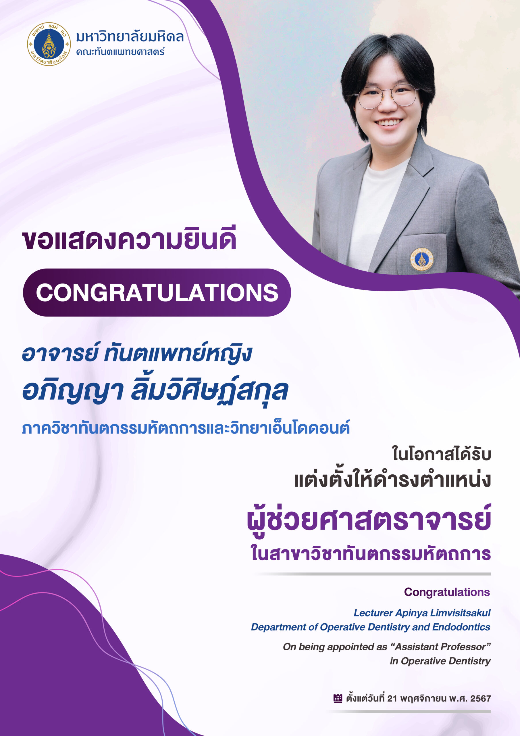 ขอแสดงความยินดี อาจารย์ ทันตแพทย์หญิง อภิญญา ลิ้มวิศิษฏ์สกุล ภาควิชาทันตกรรมหัตถการและวิทยาเอ็นโดดอนต์ ในโอกาสได้รับแต่งตั้งให้ดำรงตำแหน่ง ผู้ช่วยศาสตราจารย์ ในสาขาวิชาทันตกรรมหัตถการ