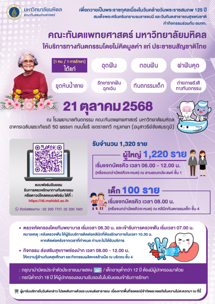 คณะทันตแพทยศาสตร์ มหาวิทยาลัยมหิดล ให้บริการทางทันตกรรมโดยไม่คิดมูลค่า แก่ประชาชนสัญชาติไทย 🦷 [1 คน / 1 การรักษา) ได้แก่ อุดฟัน ถอนฟัน ผ่าฟันคุด ขูดหินน้ำลาย รักษารากฟันฉุกเฉิน ทันตกรรมเด็ก ถ่ายภาพรังสีทางทันตกรรม