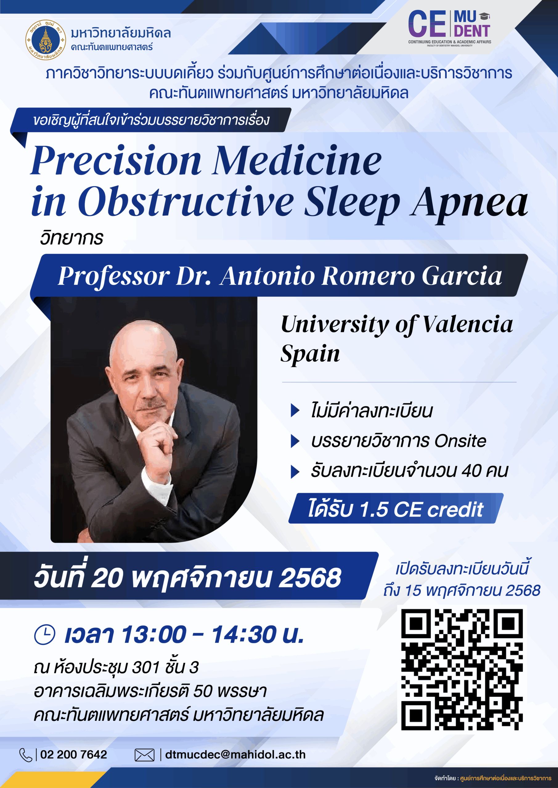 ภาควิชาวิทยาระบบบดเคี้ยว ร่วมกับศูนย์การศึกษาต่อเนื่องและบริการวิชาการ ขอเชิญผู้ที่สนใจเข้าร่วมบรรยายวิชาการเรื่อง Precision Medicine in Obstructive Sleep Apnea