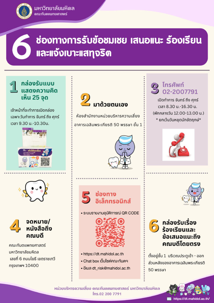 หน่วยบริหารความเสี่ยง คณะทันตแพทยศาสตร์ มหาวิทยาลัยมหิดล โทร. 02 200 7791