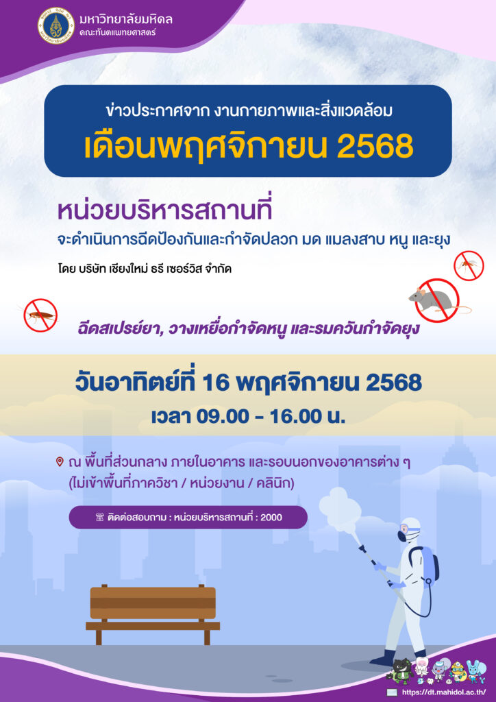 กำหนดการเข้าให้บริการ ฉีดป้องกันและกำจัดปลวก มด แมลงสาบ หนู และยุง ประจำเดือน พฤศจิกายน 2568
