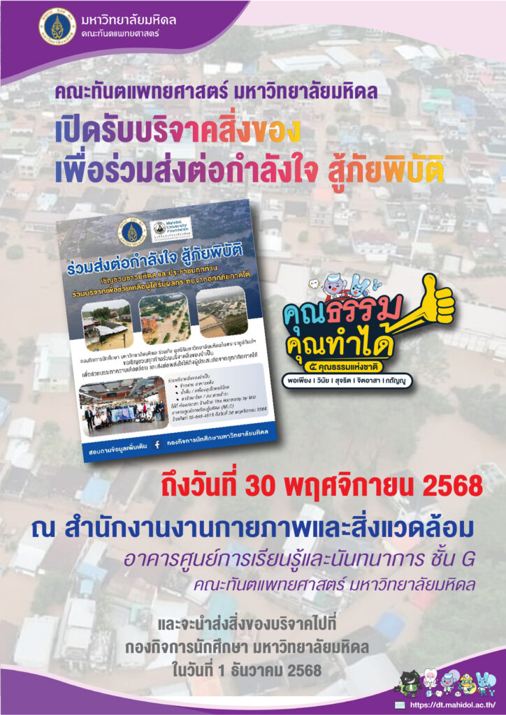 คณะทันตแพทยศาสตร์ มหาวิทยาลัยมหิดล เปิดรับบริจาคสิ่งของ เพื่อร่วมส่งต่อกำลังใจ สู้ภัยพิบัติ ถึงวันที่ 30 พฤศจิกายน 2568 ณ สำนักงาน งานกายภาพและสิ่งแวดล้อม อาคารศูนย์การเรียนรู้และนันทนาการ ชั้น G คณะทันตแพทยศาสตร์ มหาวิทยาลัยมหิดล และจะนำส่งสิ่งของบริจาคไปที่ กองกิจการนักศึกษา มหาวิทยาลัยมหิดล ในวันที่ 1 ธันวาคม 2568
