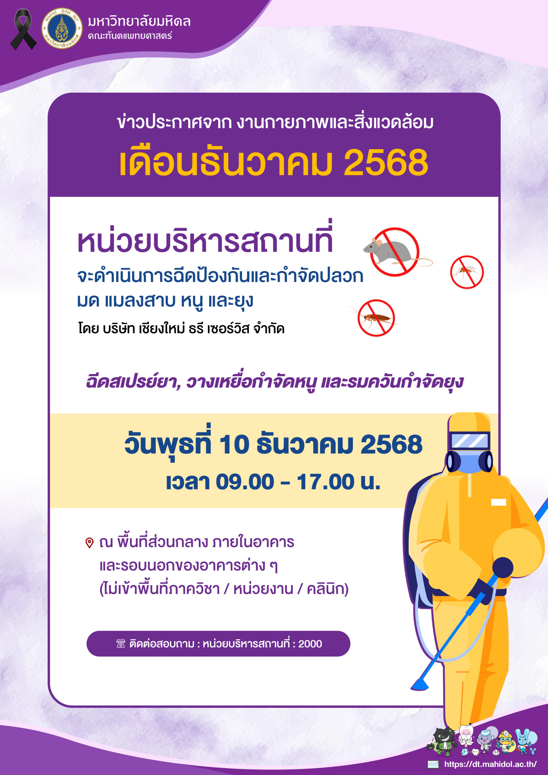กำหนดการเข้าให้บริการ ฉีดป้องกันและกำจัดปลวก มด แมลงสาบ หนู และยุง ประจำเดือน ธันวาคม 2568