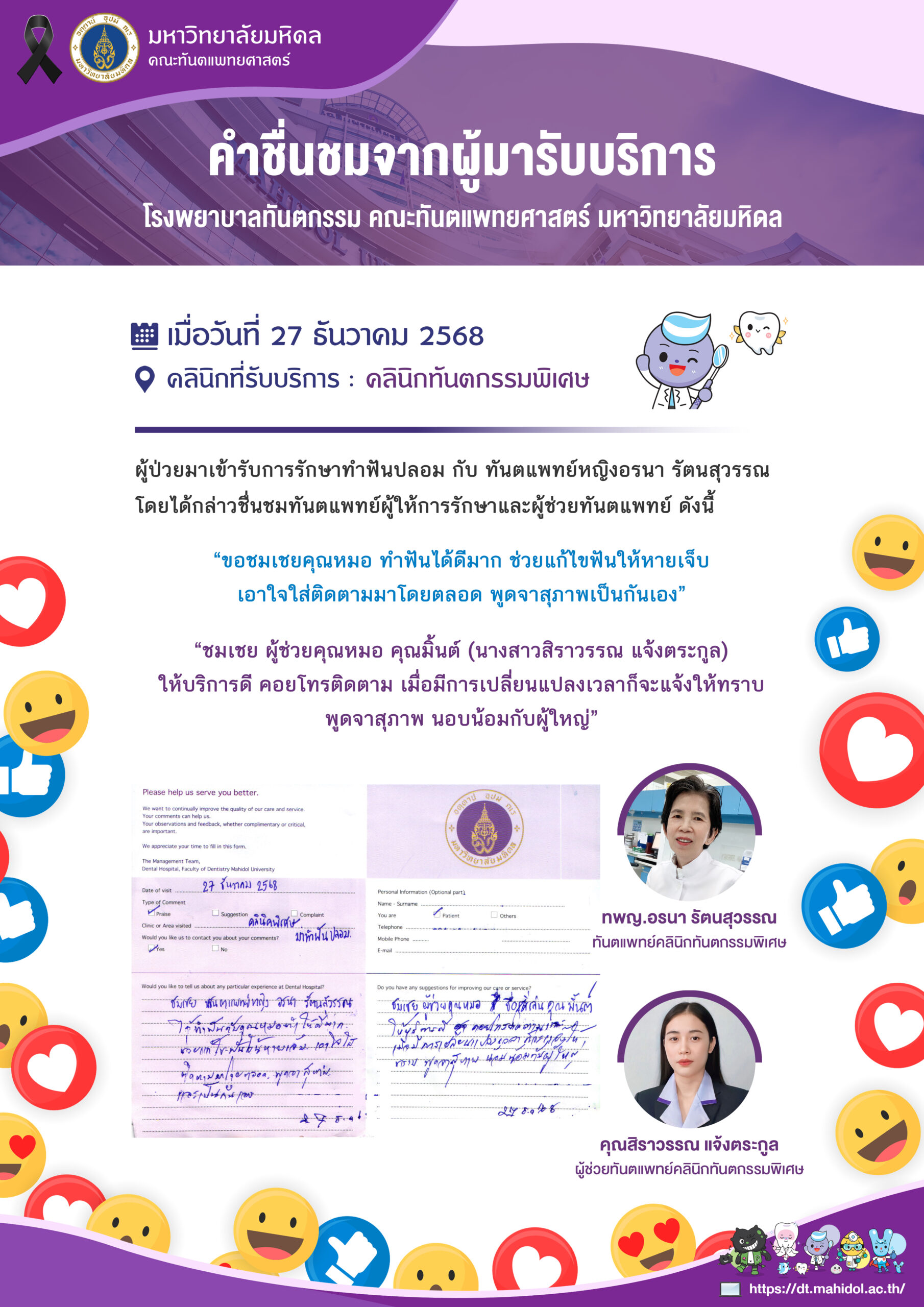 คำชื่นชมจากผู้มารับบริการ เมื่อวันที่ 27 ธันวาคม 2568 ขอชื่นชม ทันตแพทย์หญิงอรนา รัตนสุวรรณ และคุณสิราวรรณ แจ้งตระกูล คลินิกทันตกรรมพิเศษ โรงพยาบาลทันตกรรม คณะทันตแพทยศาสตร์ มหาวิทยาลัยมหิดล