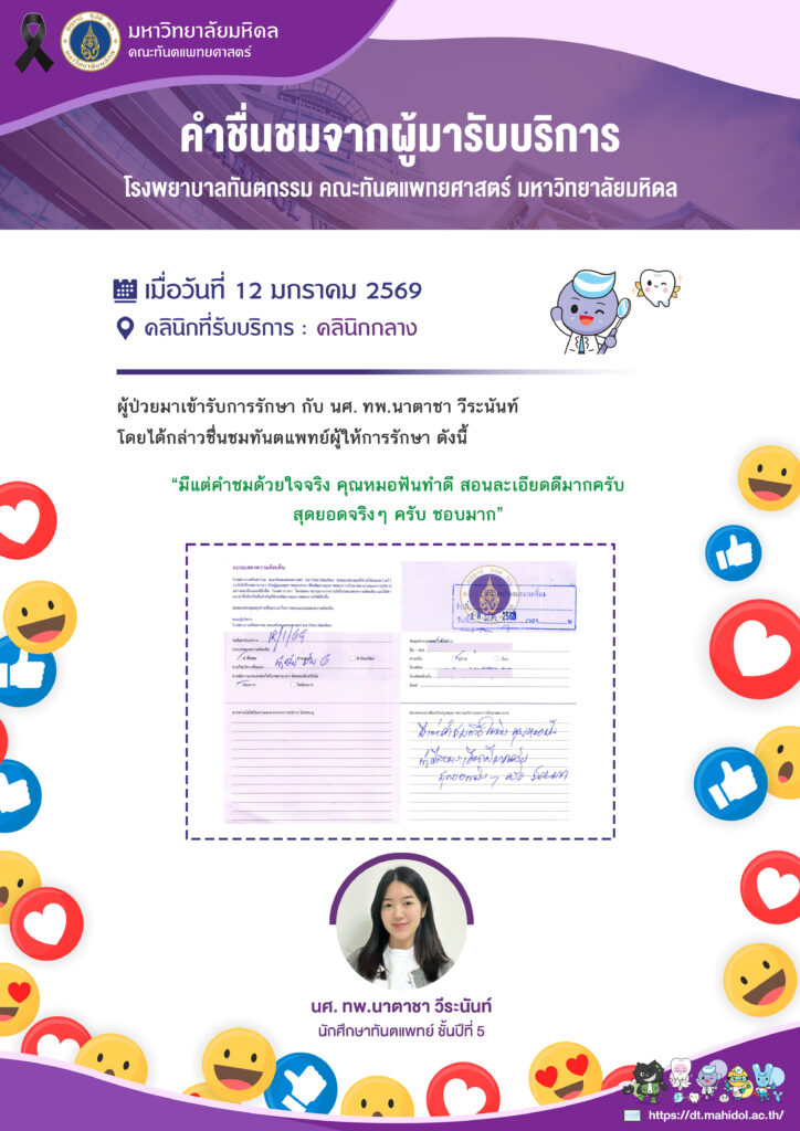 คำชื่นชมจากผู้มารับบริการ เมื่อวันที่ 12 มกราคม 2569 ขอชื่นชม นศ. ทพ.นาตาชา วีระนันท์ นักศึกษาทันตแพทย์ ชั้นปีที่ 5 คลินิกกลาง โรงพยาบาลทันตกรรม คณะทันตแพทยศาสตร์ มหาวิทยาลัยมหิดล