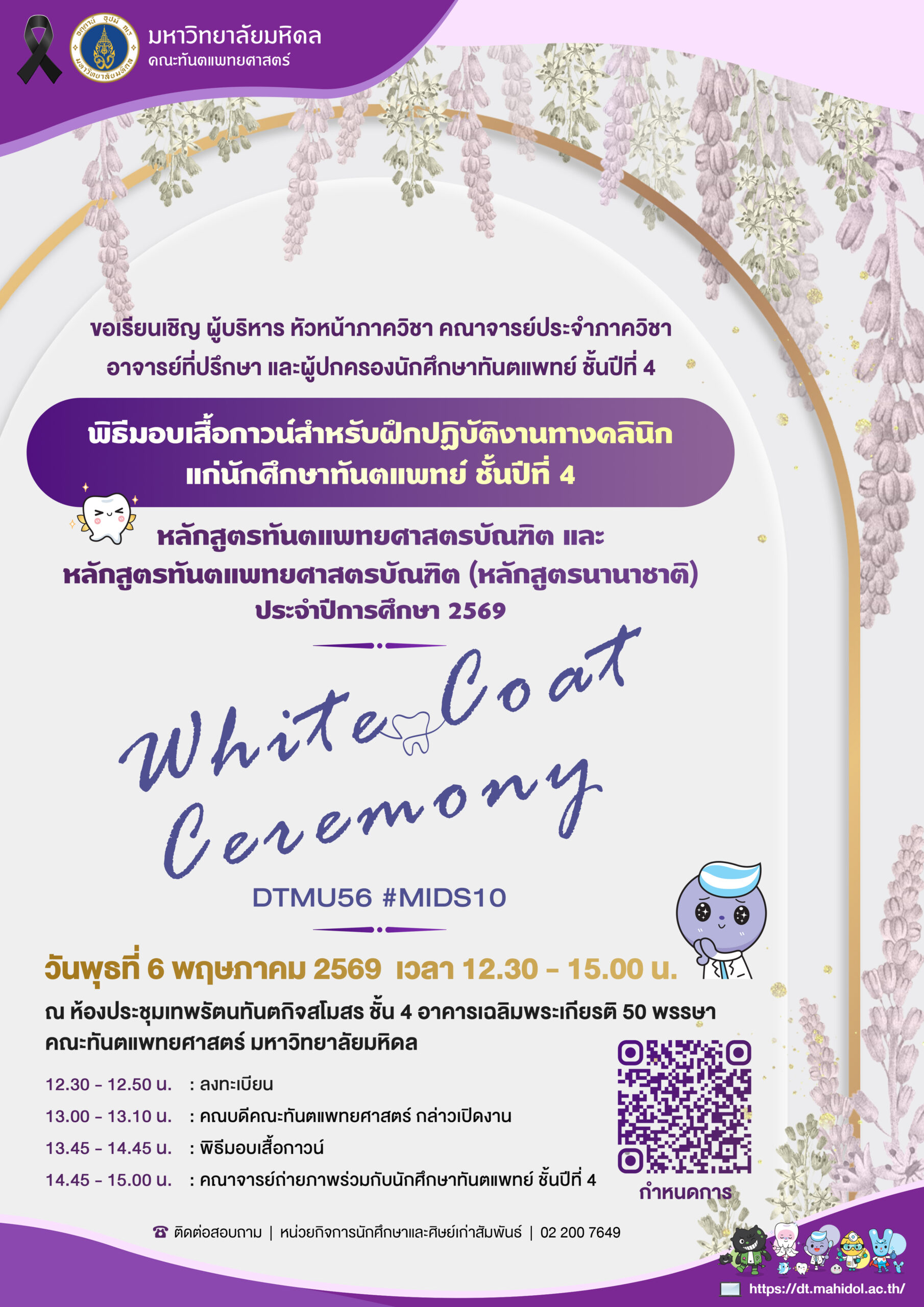 ขอเรียนเชิญ ผู้บริหาร หัวหน้าภาควิชา คณาจารย์ประจำภาควิชา อาจารย์ที่ปรึกษา และผู้ปกครองนักศึกษาทันตแพทย์ ชั้นปีที่ 4 พิธีมอบเสื้อกาวน์สำหรับฝึกปฏิบัติงานทางคลินิก แก่นักศึกษาทันตแพทย์ ชั้นปีที่ 4
